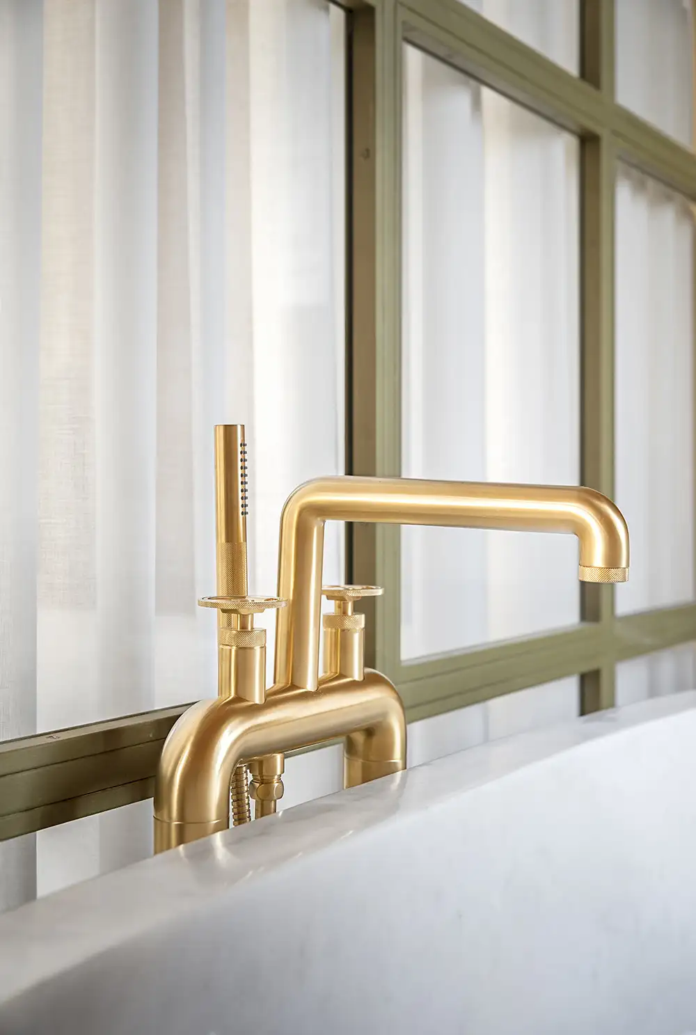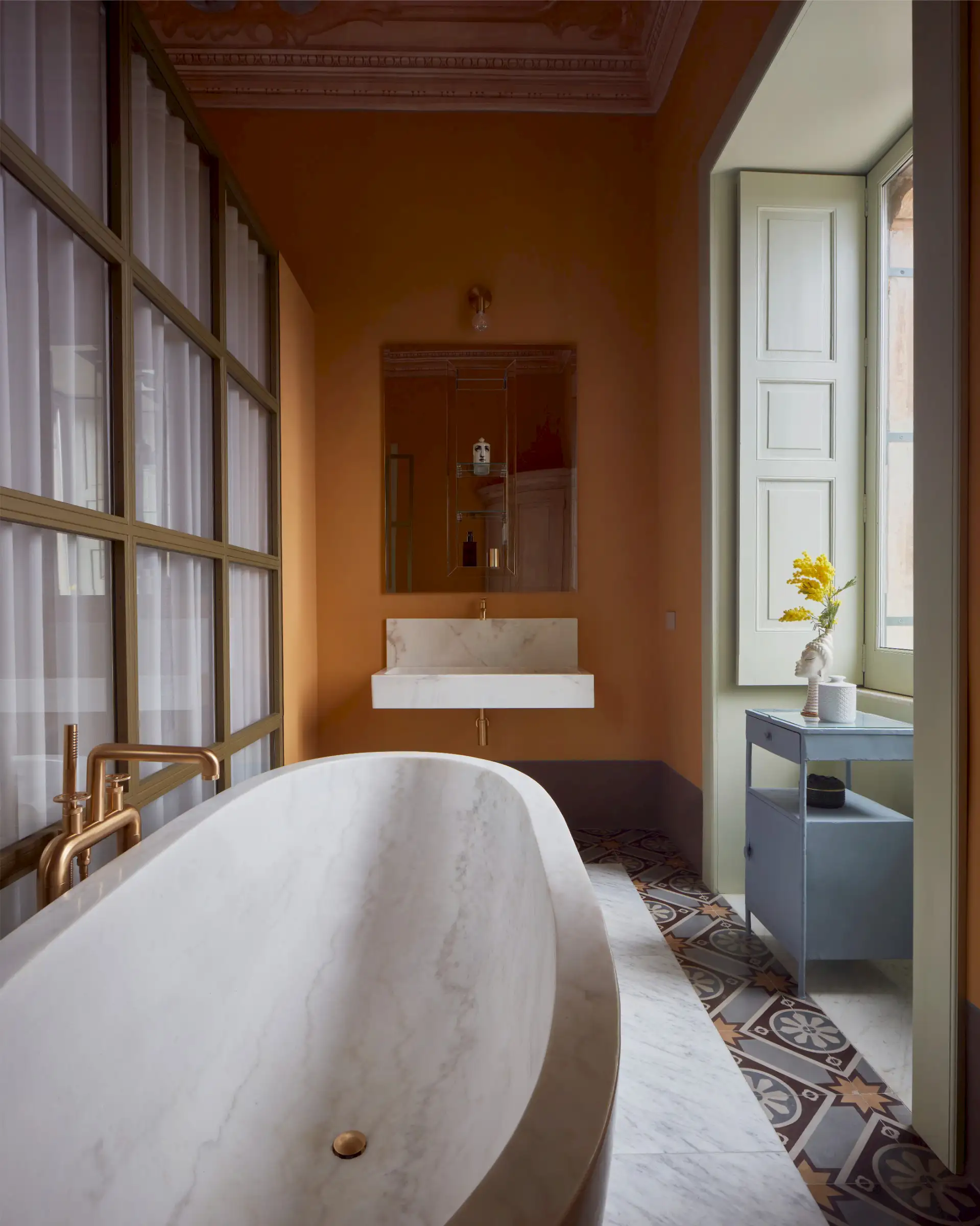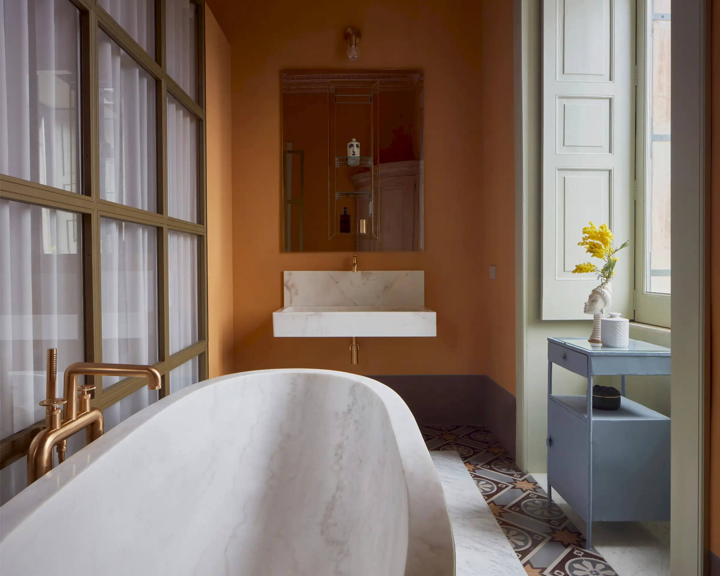 The floor tiles continue into the en-suite bathroom, where decoration and restraint are again mixed to perfection, with the beautiful lines of the carved marble bath and double basin taking centre stage.
