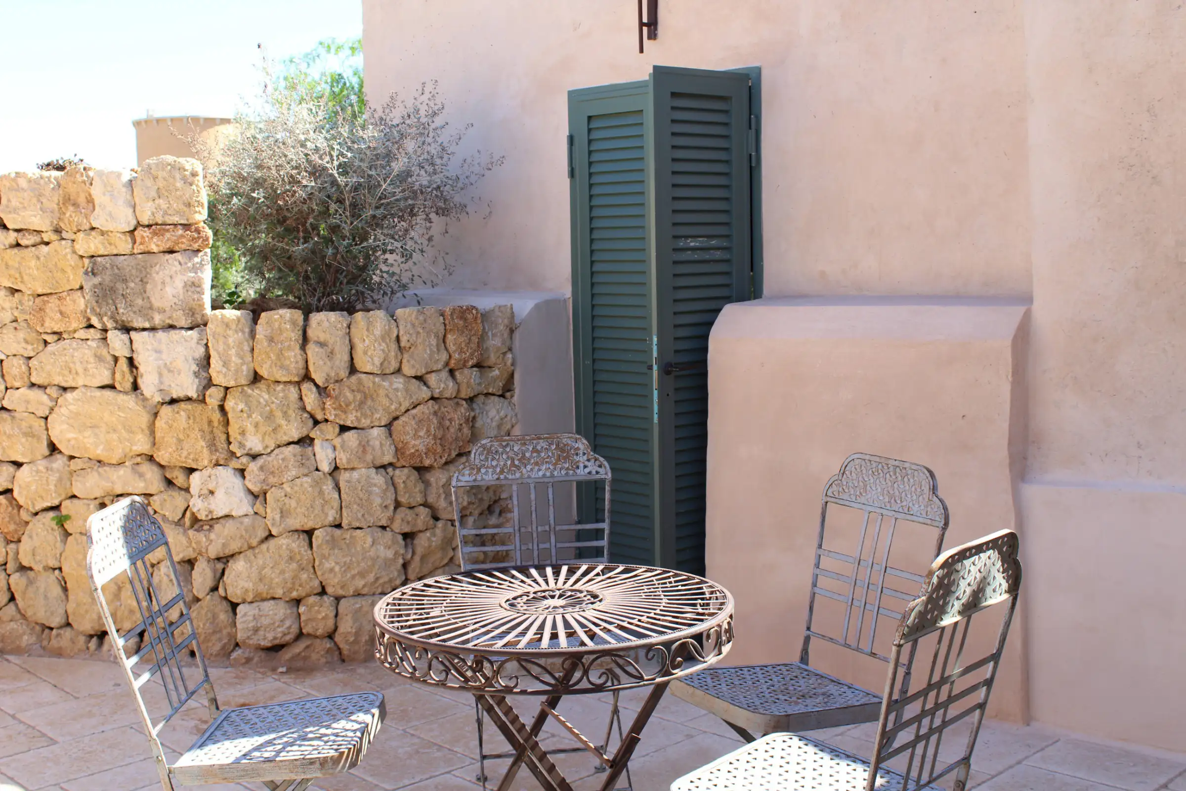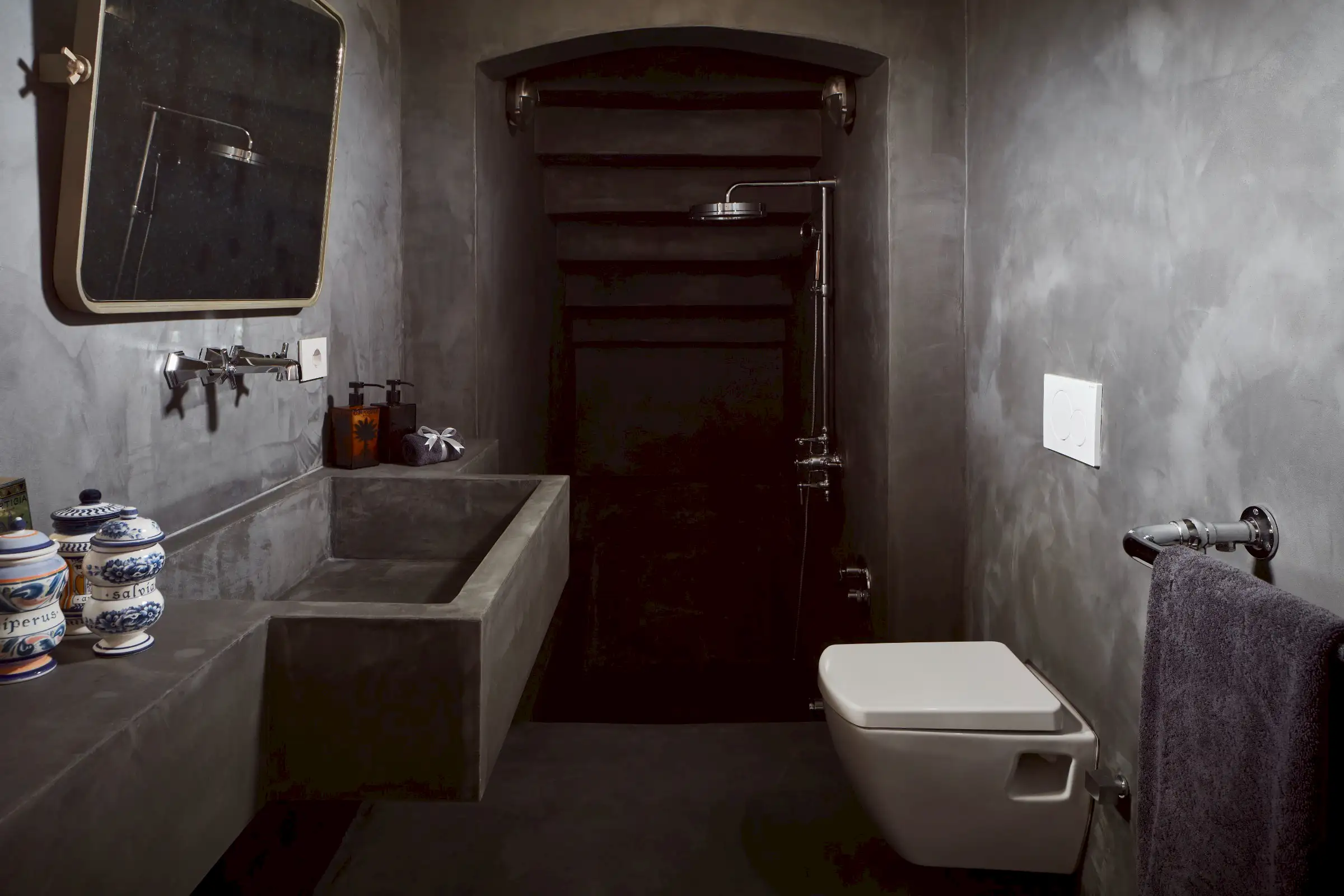 In this beautiful split-level suite, the bedroom is upstairs and has exposed stone walls and a king-size polished cement bed. Meanwhile, the en-suite bathroom has a sunken bath and a powerful rainfall shower. On the lower level there is a vanity station, a large, original open fireplace and a luxury sofa bed for one guest. The suite’s walled garden is a magical spot with a hand-carved sandstone bath for two, a rainfall shower, a large parasol and a BBQ for private dinners al fresco.