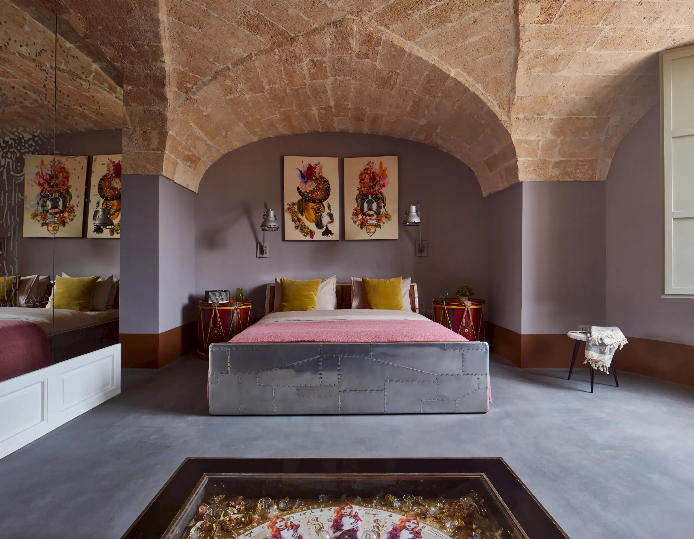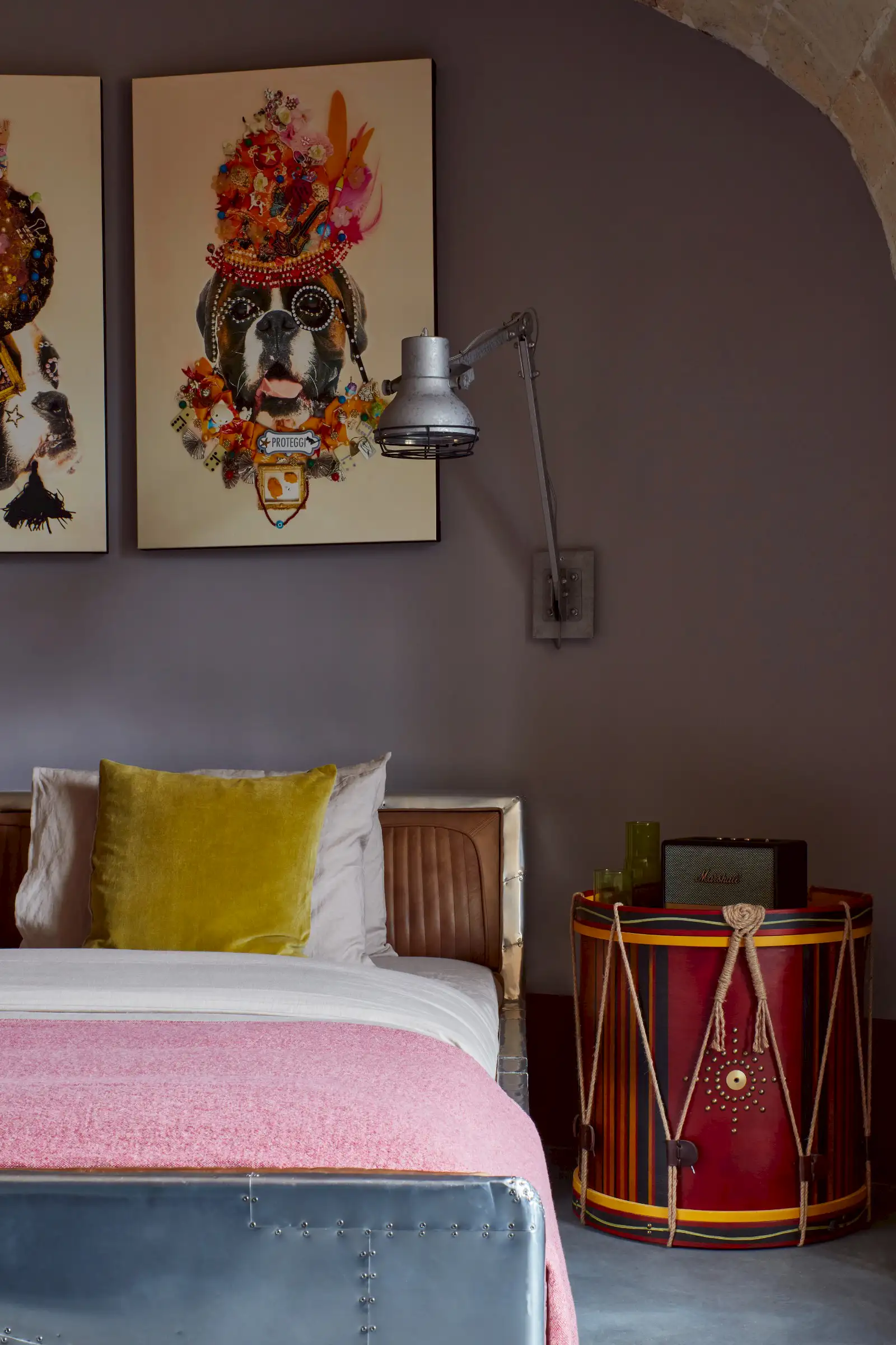 Accessed from its own private garden with an ancient well and BBQ facilities, where guests can dine in private al fresco, the Tower Park Suite has a super-king-size Timothy Oulton Aviator bed under an impressive exposed stone star-vault ceiling. Big scarlet and gold drums have been repurposed as bedside tables, there’s a one-of-a-kind coffee table and The Fiddlers artwork on the wall, both by Adored & Adorned, and for cooler nights, there’s an antique wood-burning stove. The en-suite bathroom has a sunken bath and a powerful rainfall shower that is hidden behind an original Sixties illuminated tree-of-life mirrored screen.