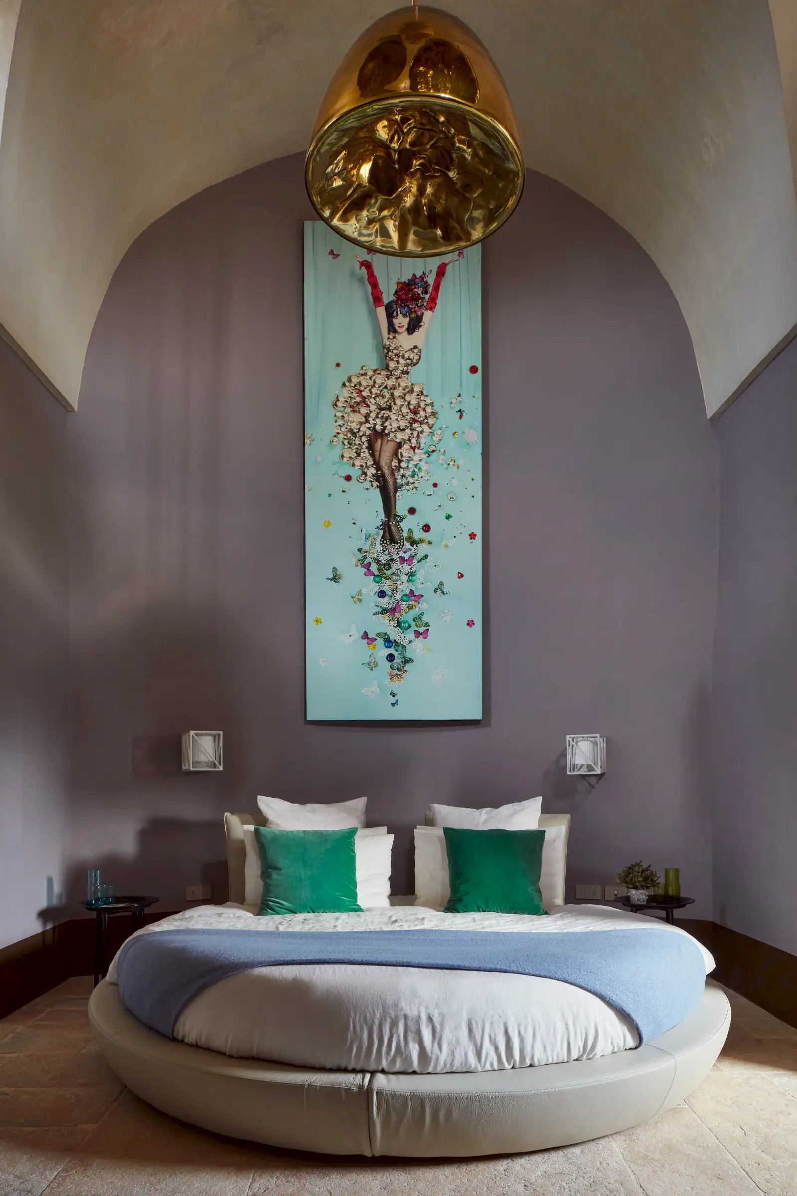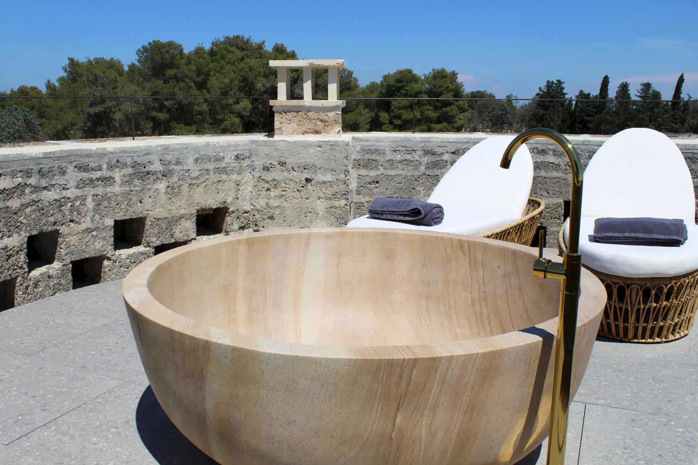 This premium suite boasts a magnificent triple-height, star-vaulted ceiling lit by a bespoke oversized Murano glass volcano chandelier that hangs over the magnificent supersized round bed. There is a large corner fireplace, an elegant mirrored dressing table and a cosy lounge area with views out of the Tower’s original big round window onto the beautiful private parkland. The en-suite has a powerful rainfall shower, while an original stone staircase leads up to an exclusive roof terrace where there is a two-person, hand-carved, round sandstone al fresco bath and sunbeds, from which you can enjoy panoramic views of the Puglian landscape.