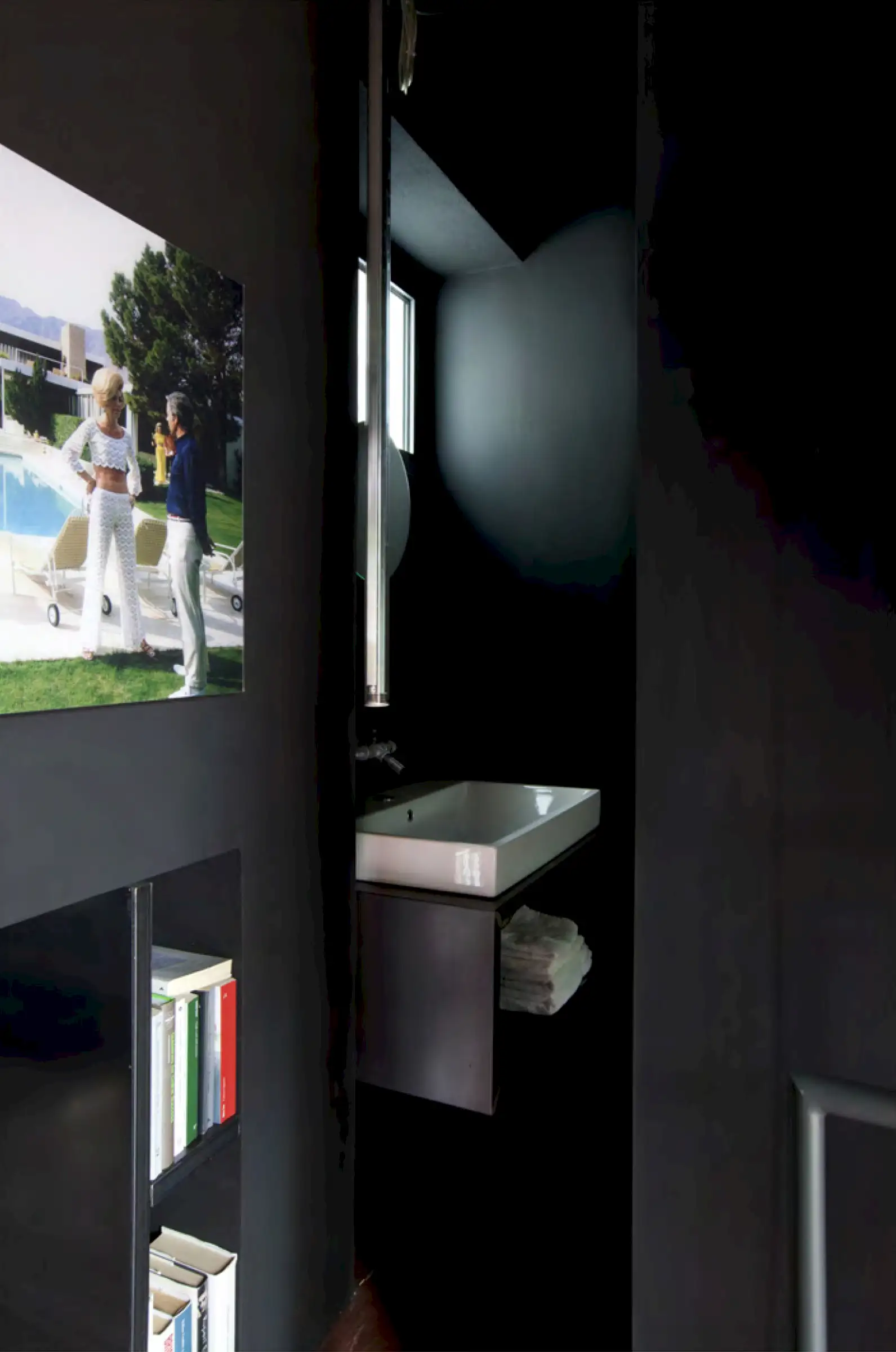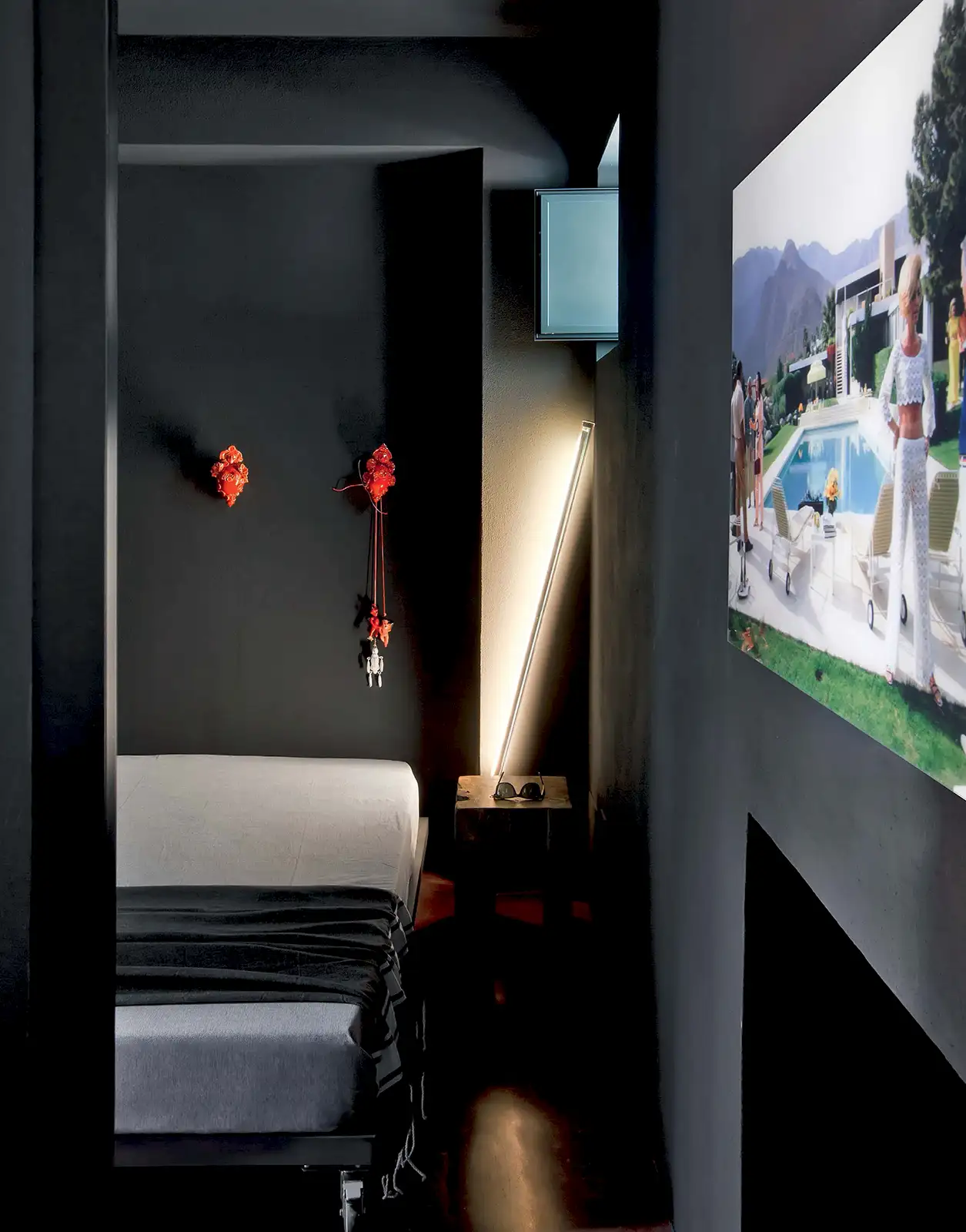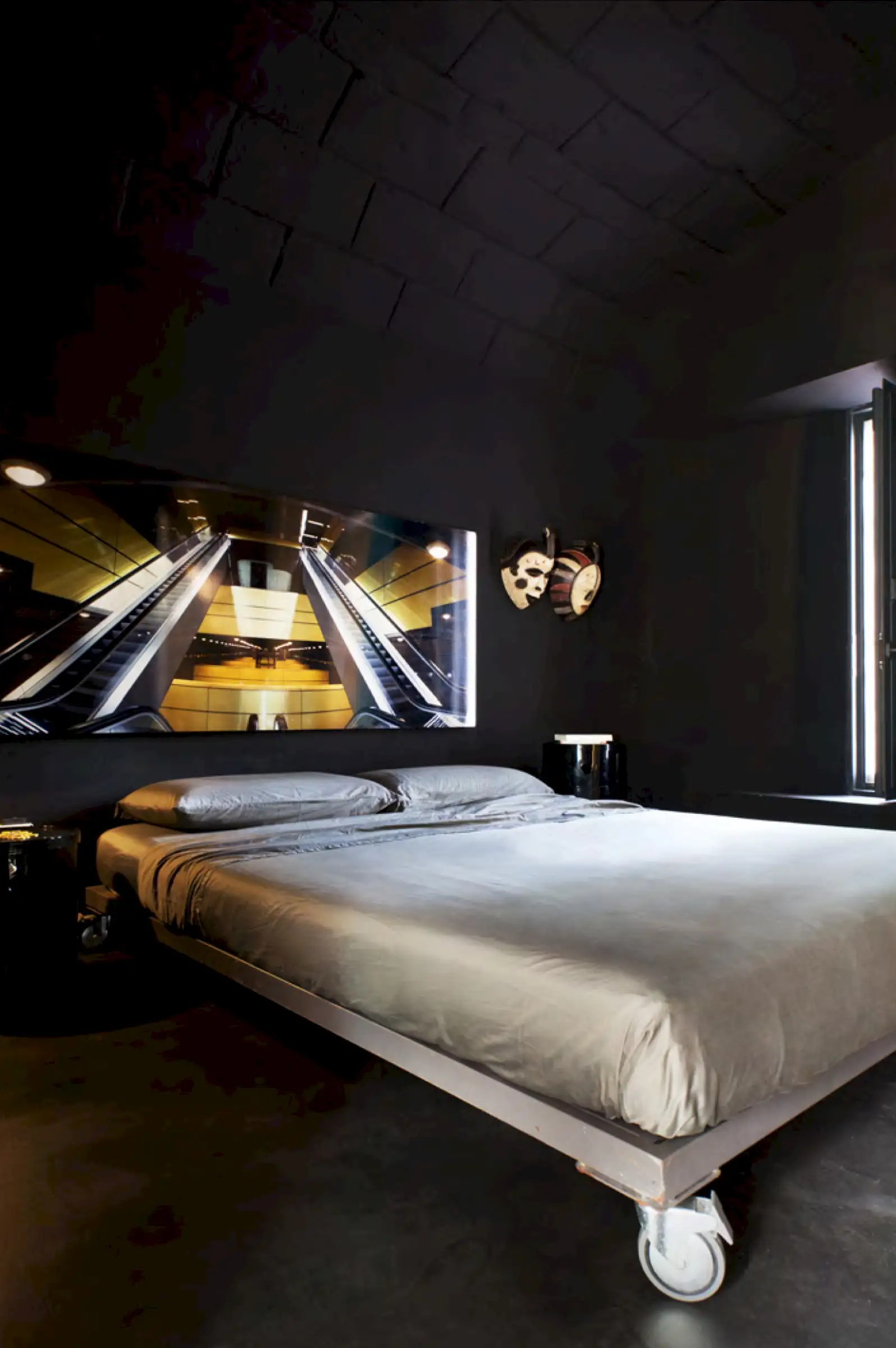 Six guests are accommodated in three bedrooms, all of which are painted entirely in black. There is no indoor living room but these interesting design choices show authentic style and work wonderfully for art-minded people.