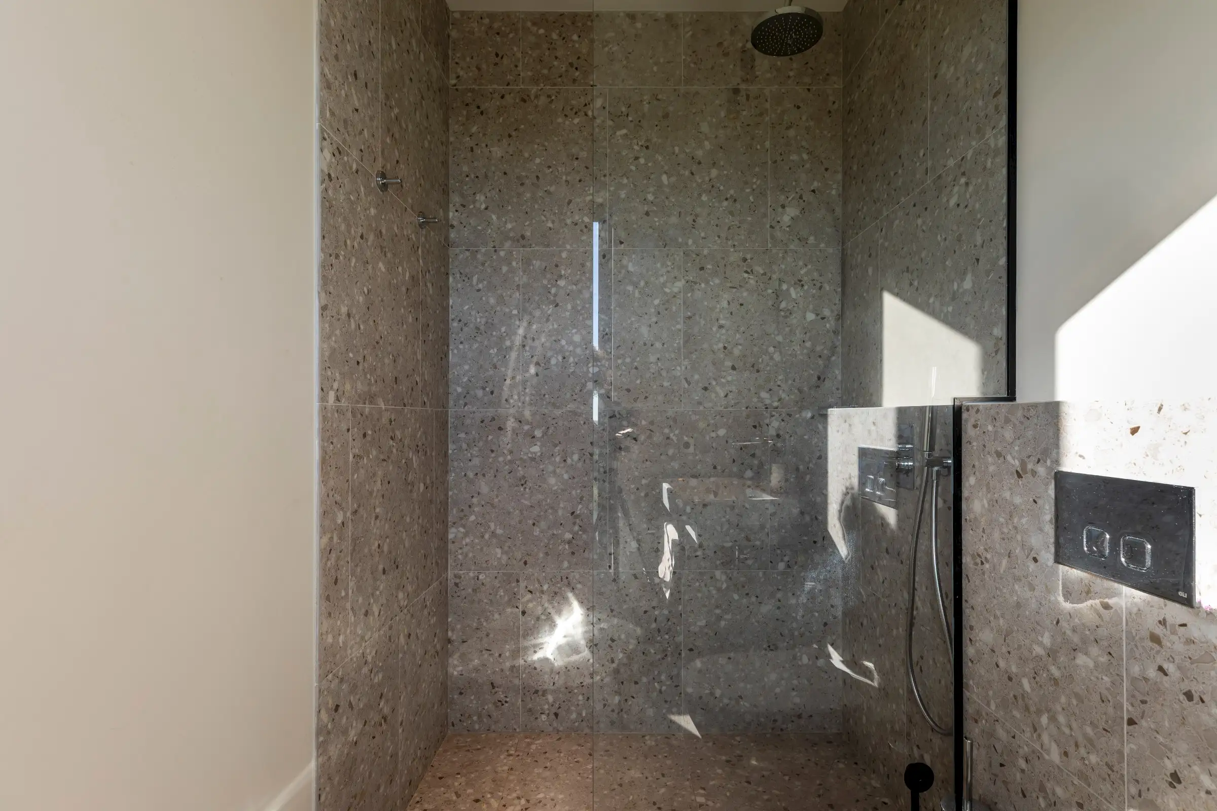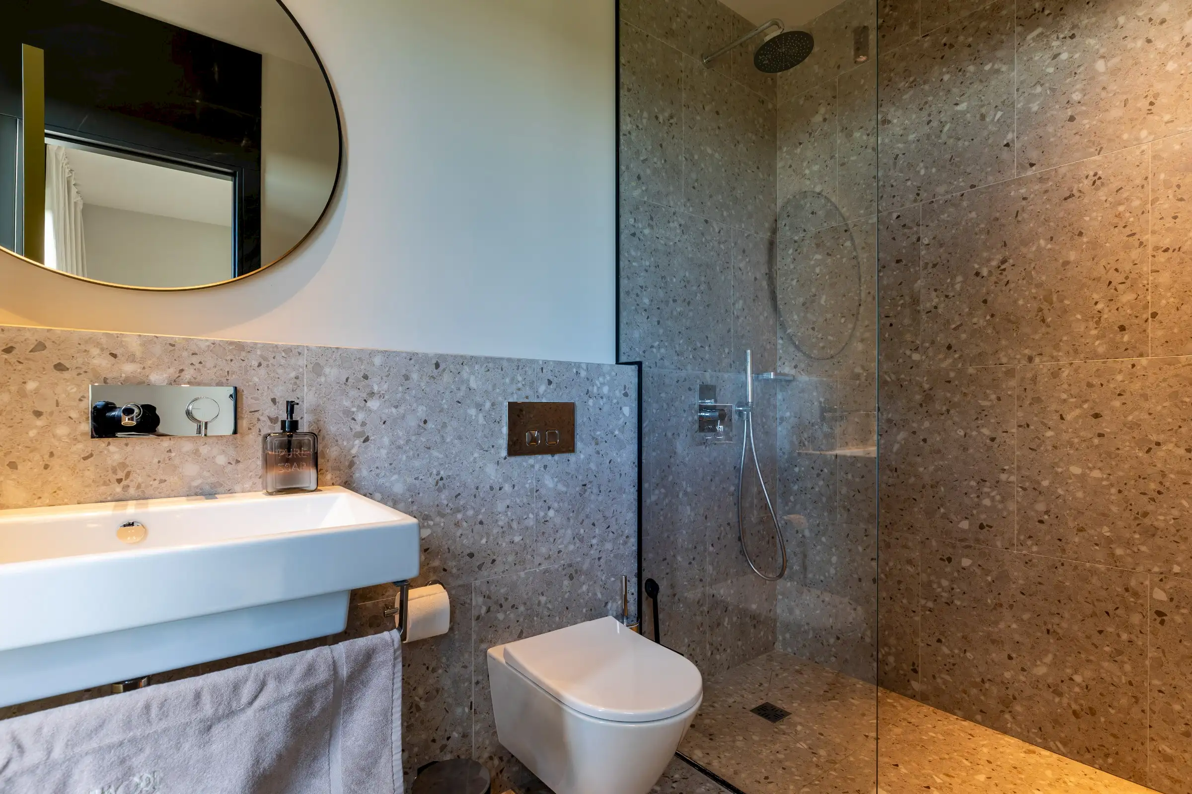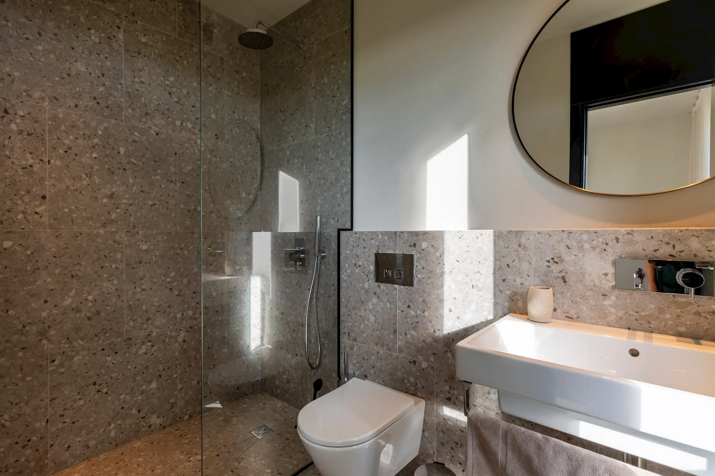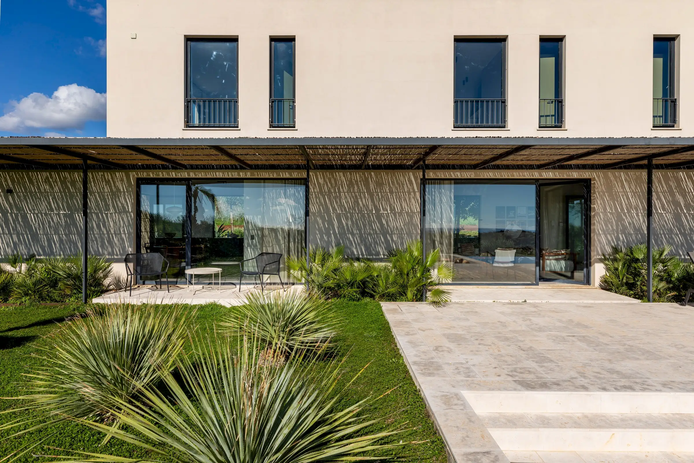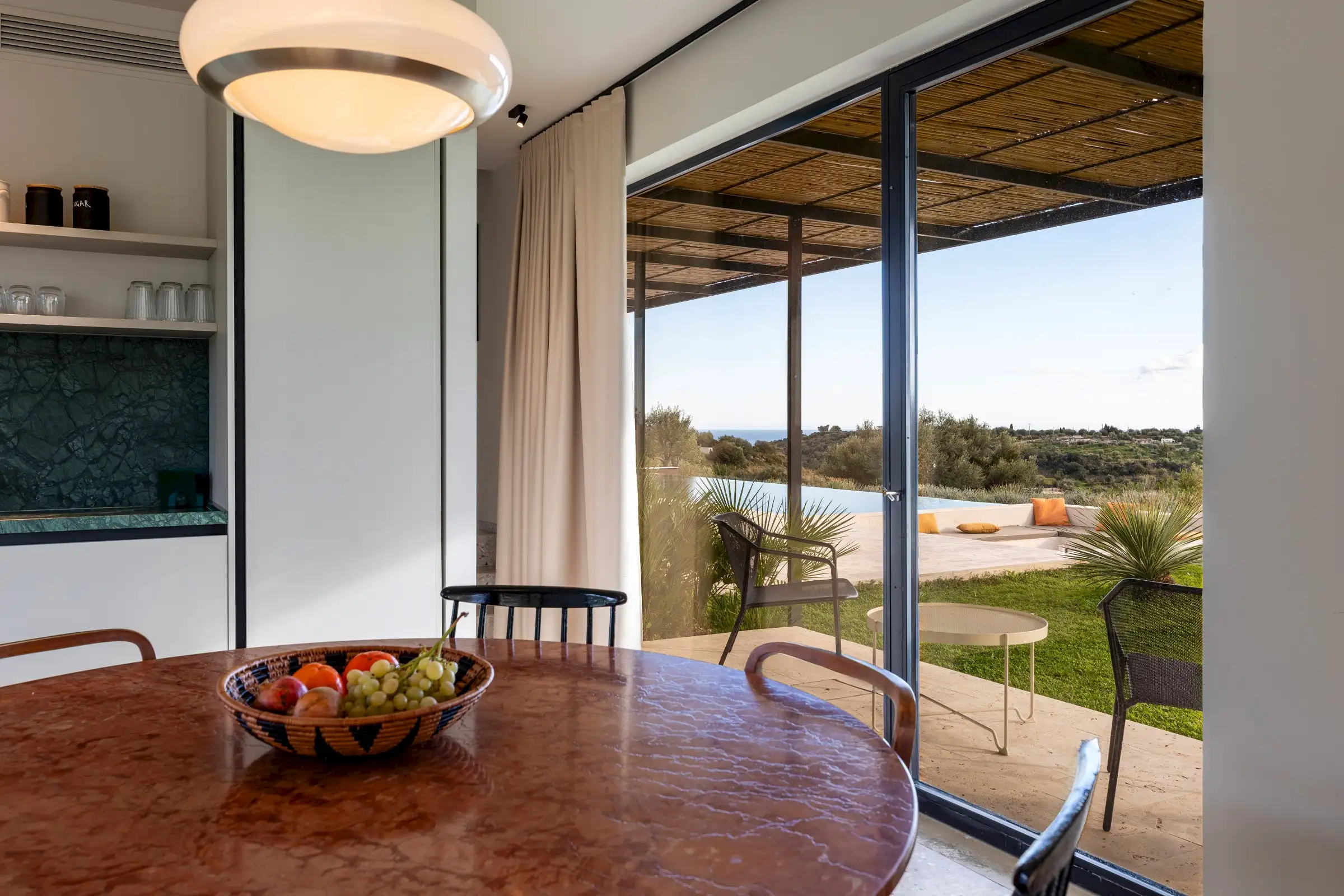 The living space and the kitchen occupy the length of the ground floor and include local materials such as marble and terrazzo. Flooded with natural light from the floor to ceiling glass on either side of the building, the design of the outside spaces is equally well executed as those inside, with the two merging subtly.