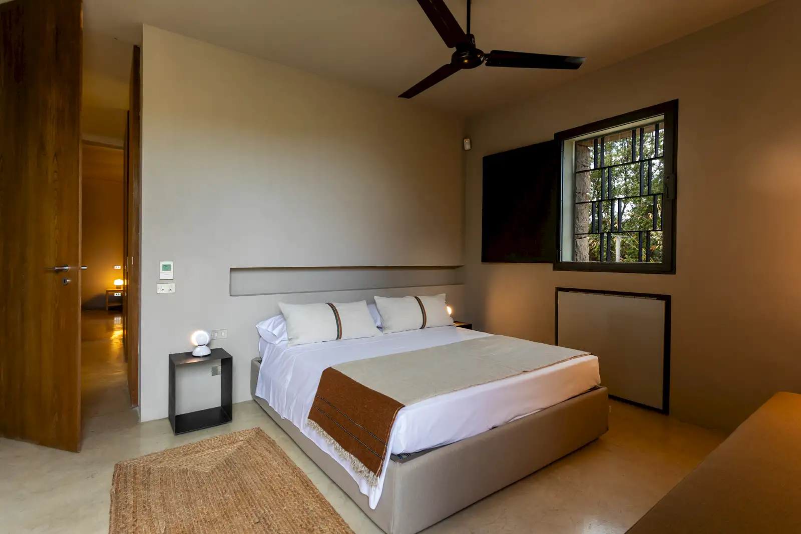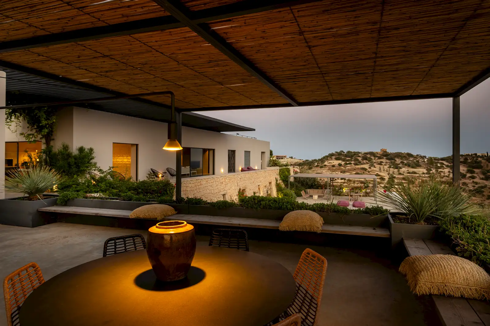 The palatial size of Aura means that its ten guests can easily find some privacy as well as enjoying its multiple outdoor dining spaces, lounge areas and pool. Local stone and smooth white stucco are layered like a two-tier cake, with glass doors as the filling and a metal pergola with its playful shadow pattern, as the decoration on top.