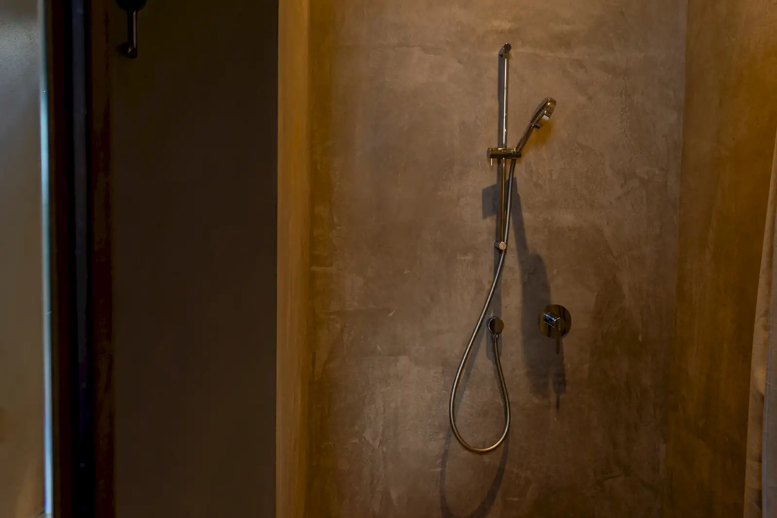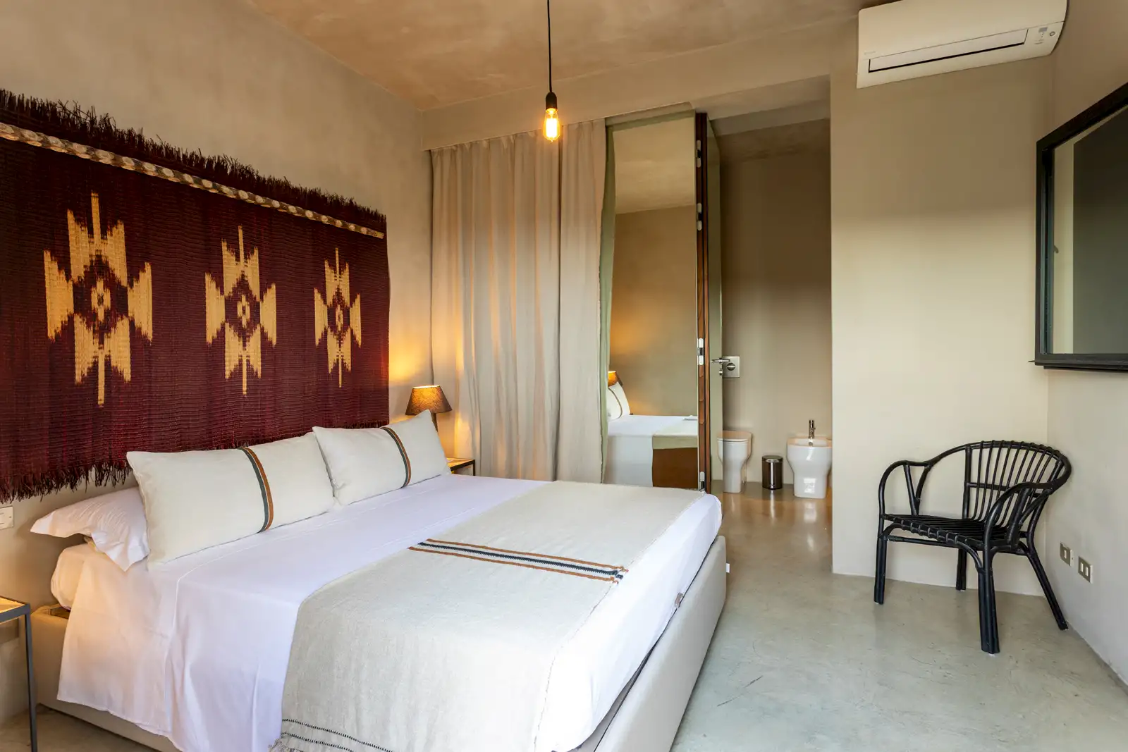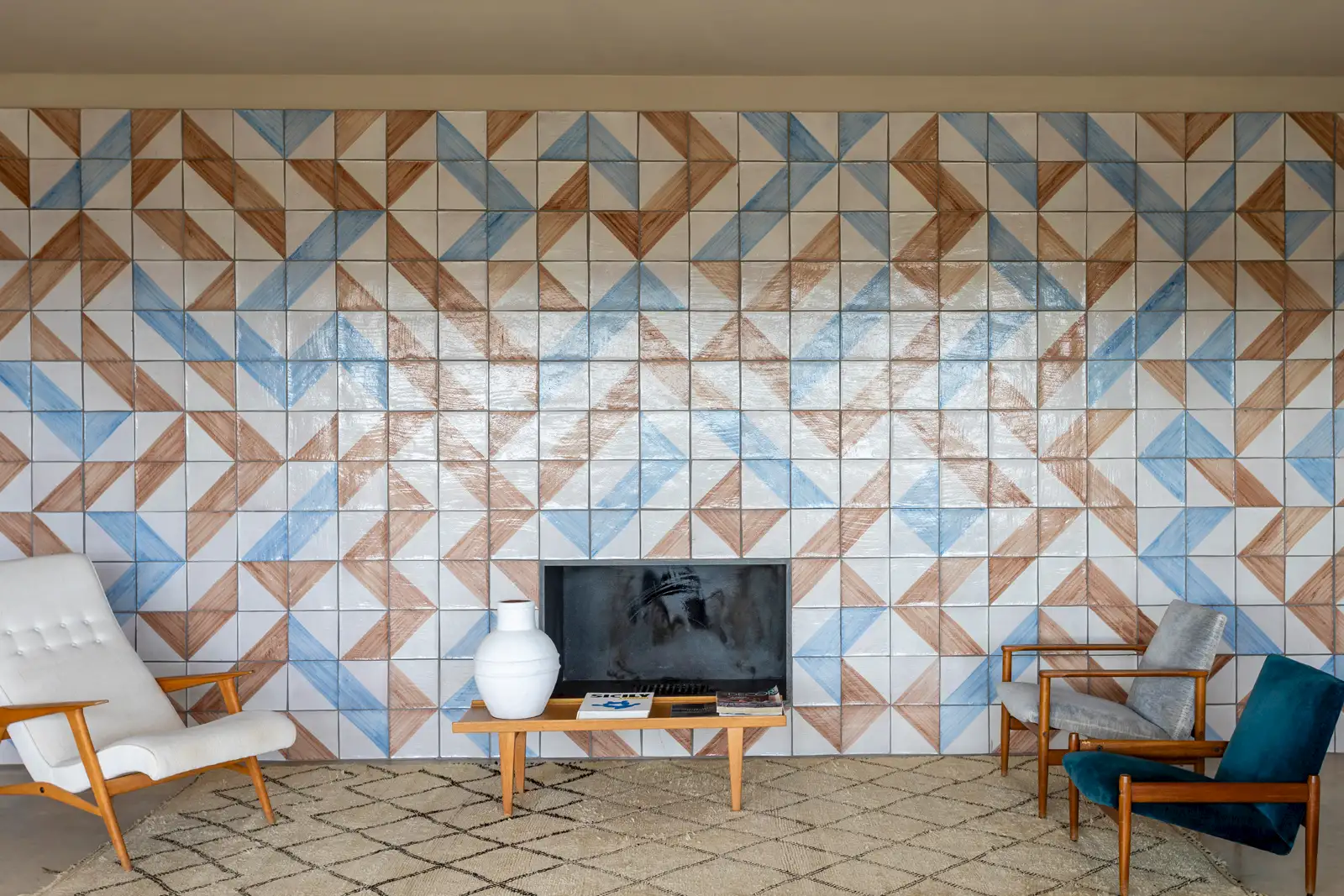 The villa’s simple lines and neutral tones were designed by Gordon Guillaumier to showcase the dramatic setting. Luxe local materials include marble and chestnut, while colourful Sicilian tiles form an artwork of their own along the fireplace wall of the sitting room.