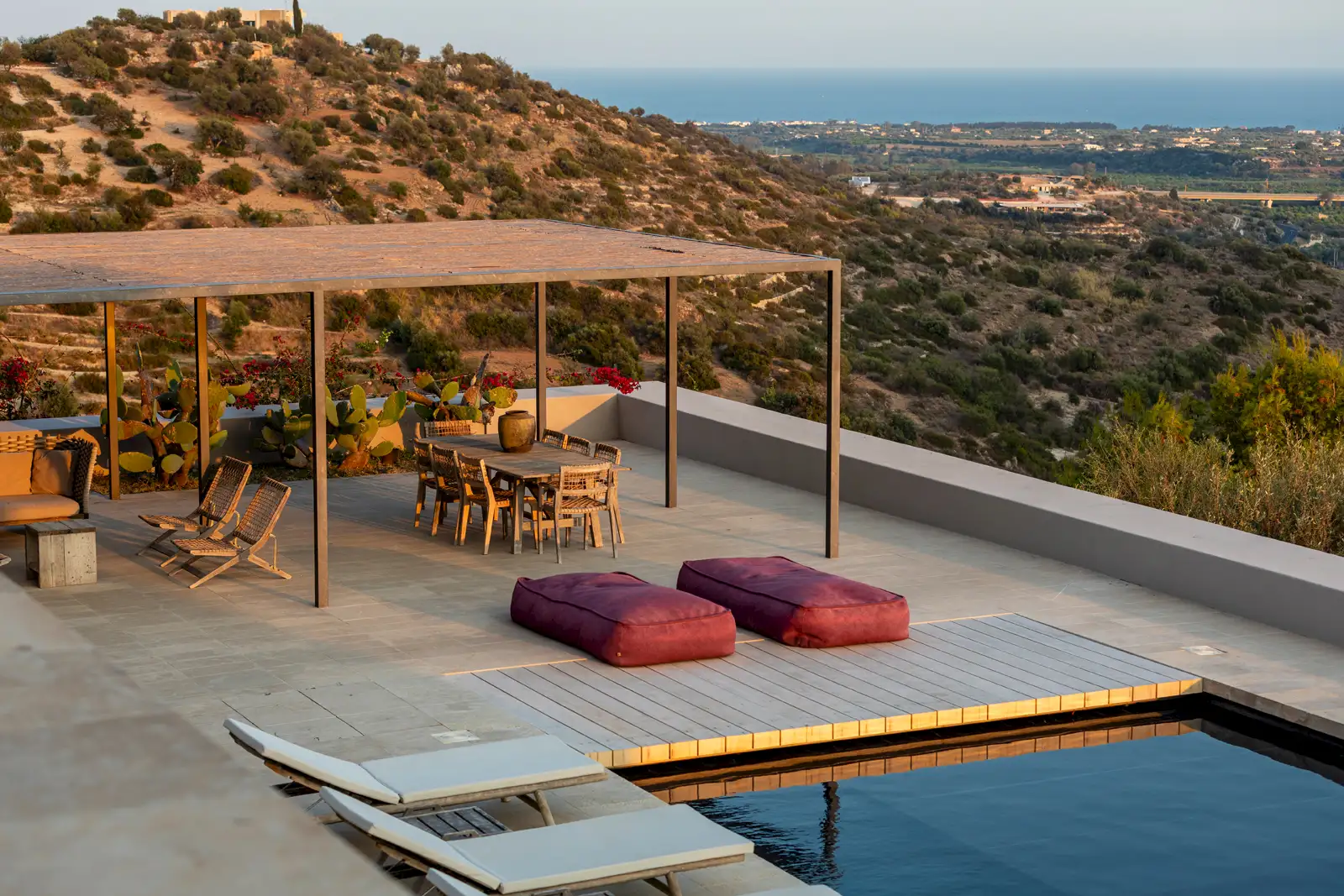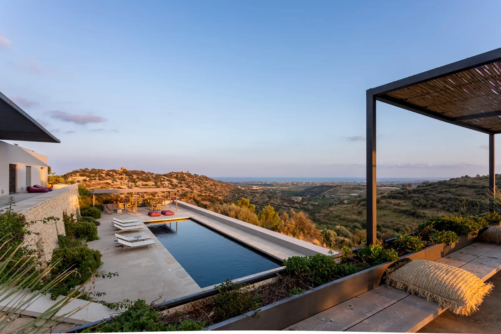 Aura is an exceptional modernist villa in a commanding position just five minutes by car from the pretty baroque town of Noto. Within easy reach of the beaches of the Vendicari nature reserve and of the archaeological sites at Syracuse and beyond, it could not be better placed for absorbing the rich history, culture and swim spots of Sicily’s south east corner.