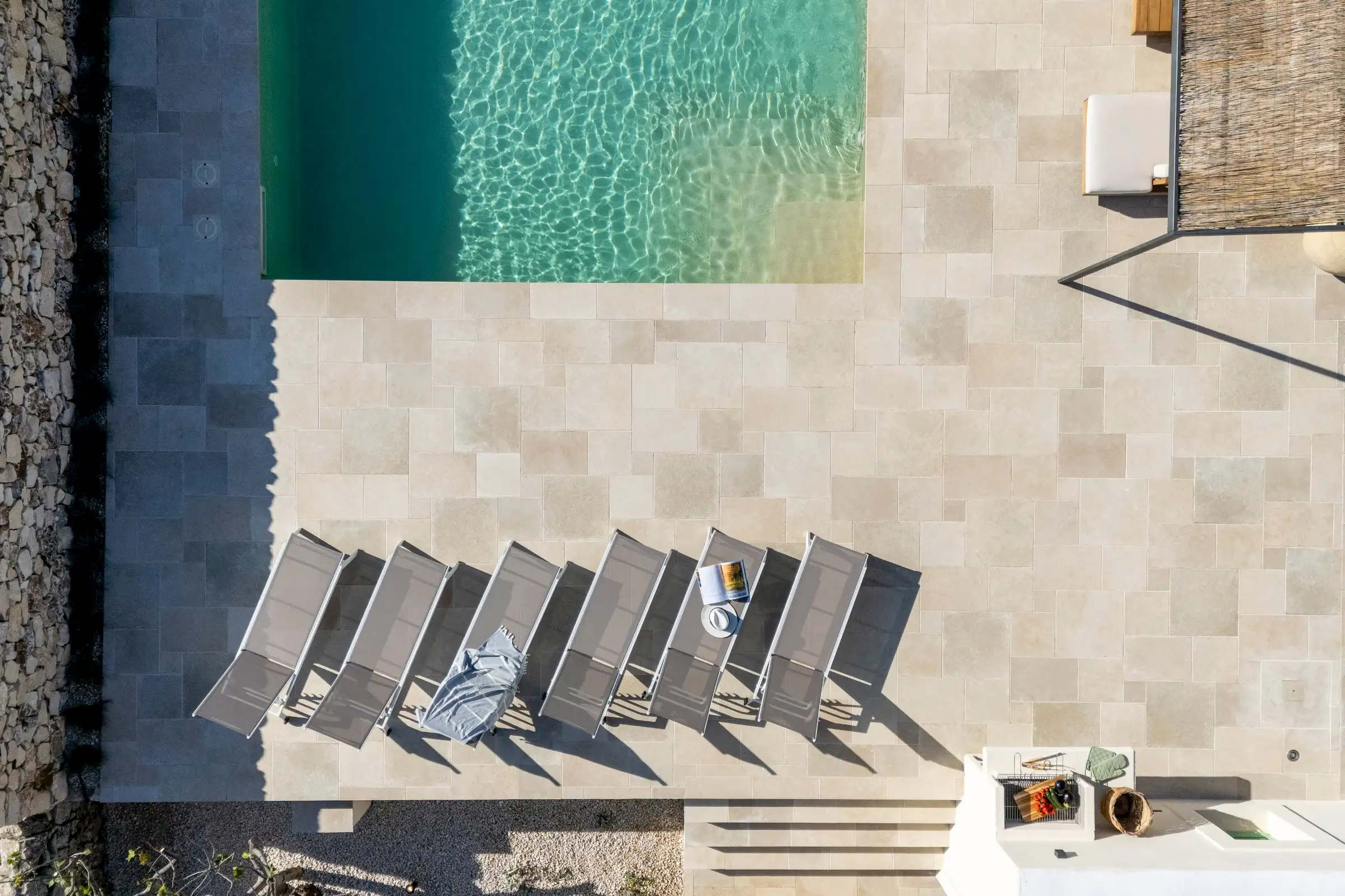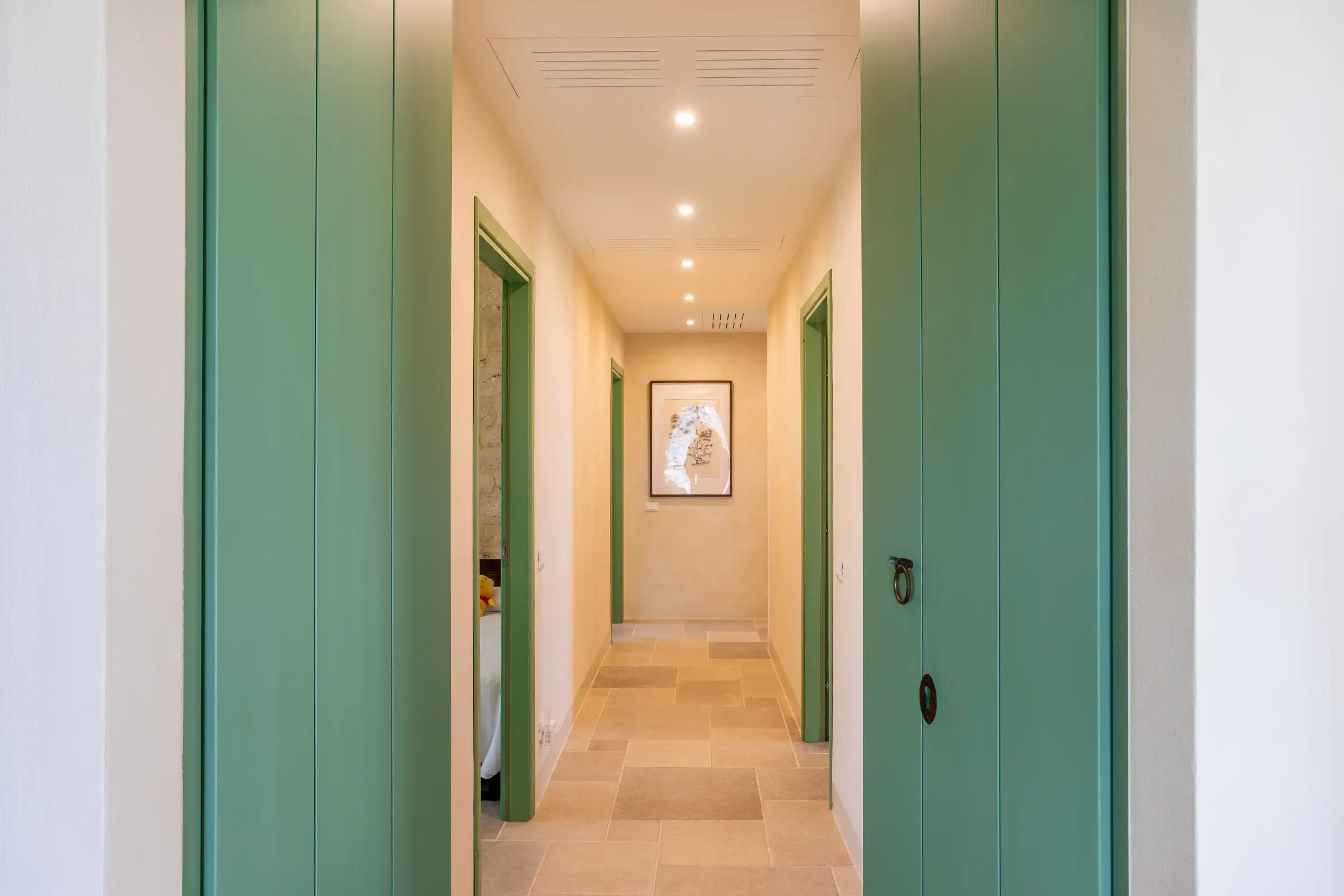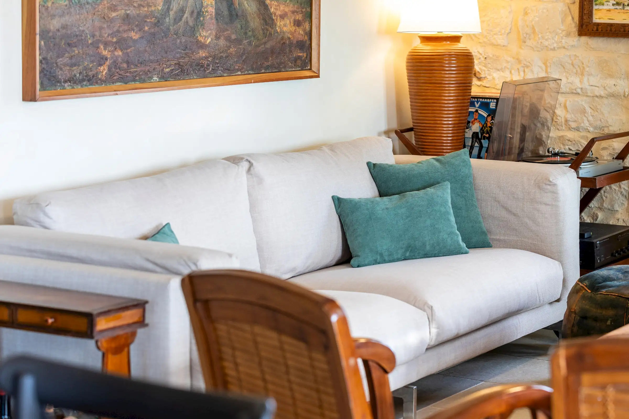 Formerly an agricultural building, many of the original architectural details have been incorporated into the villa’s contemporary interior design. There are five air-conditioned bedrooms and four bathrooms. The living room, dining room and kitchen are open-plan and take up the entire width of the building.