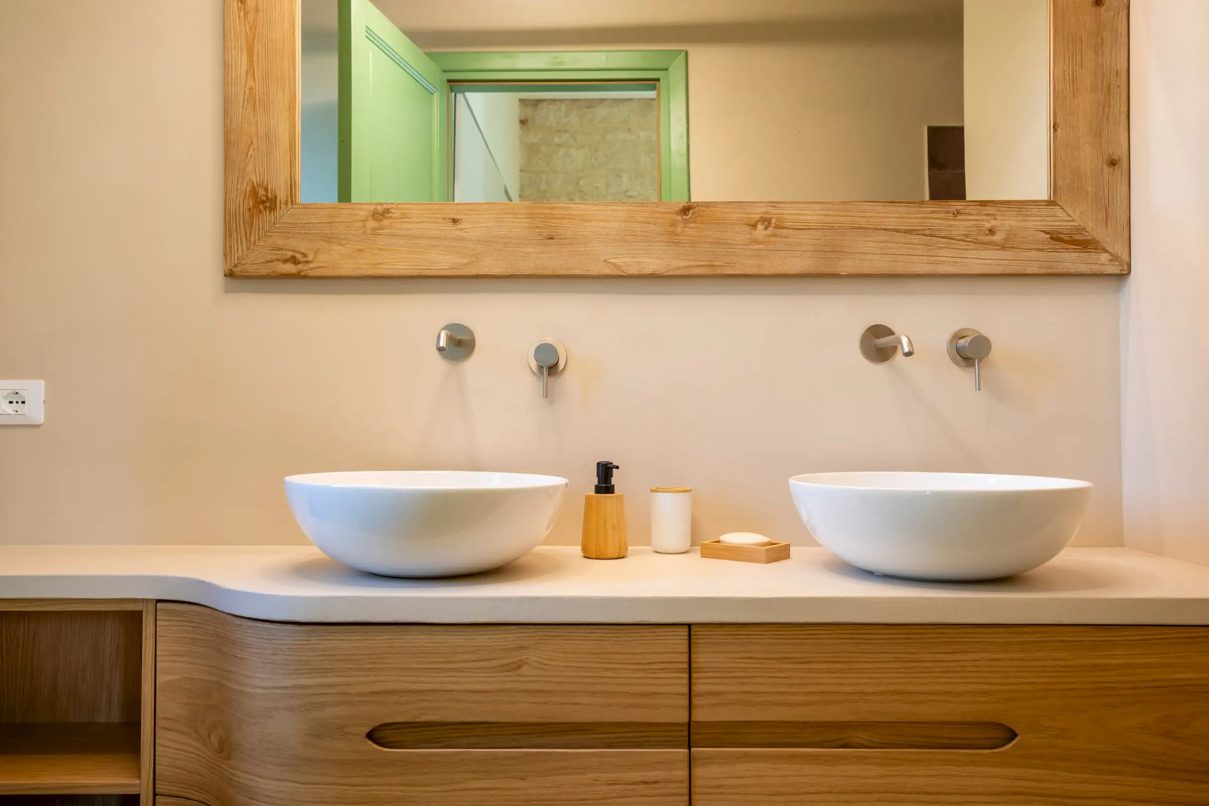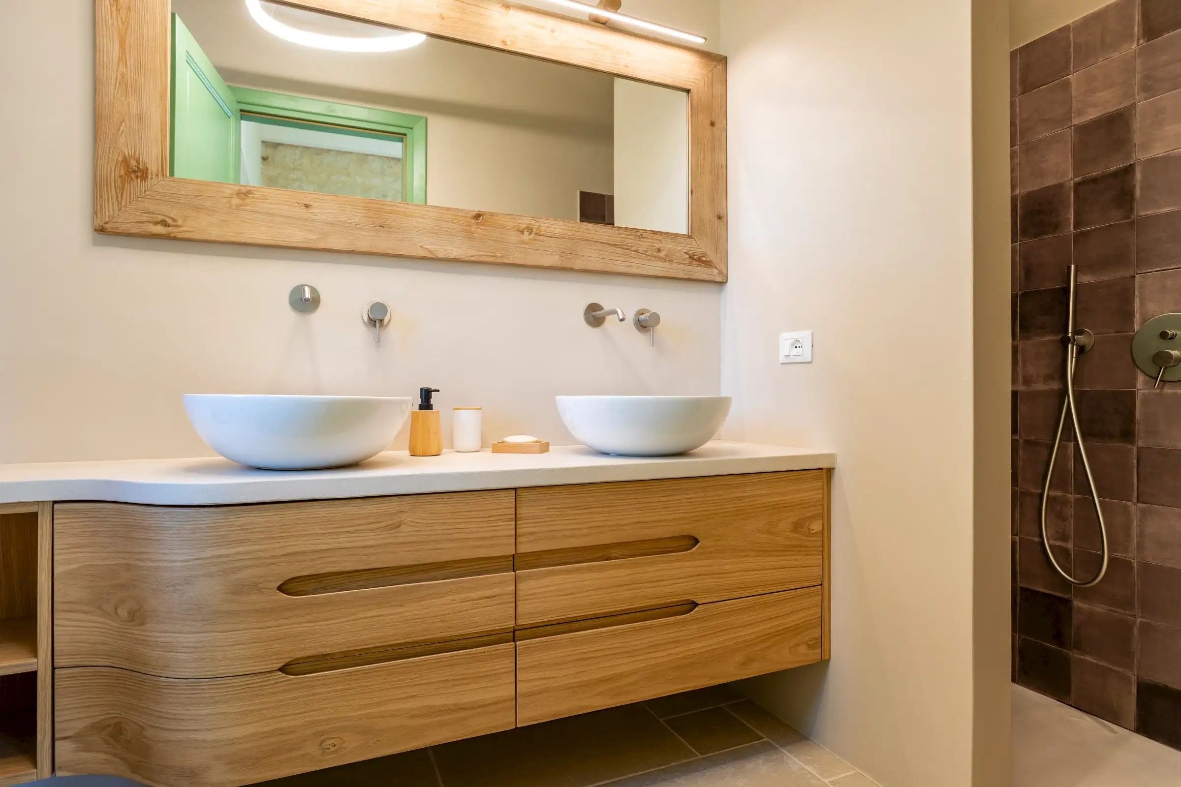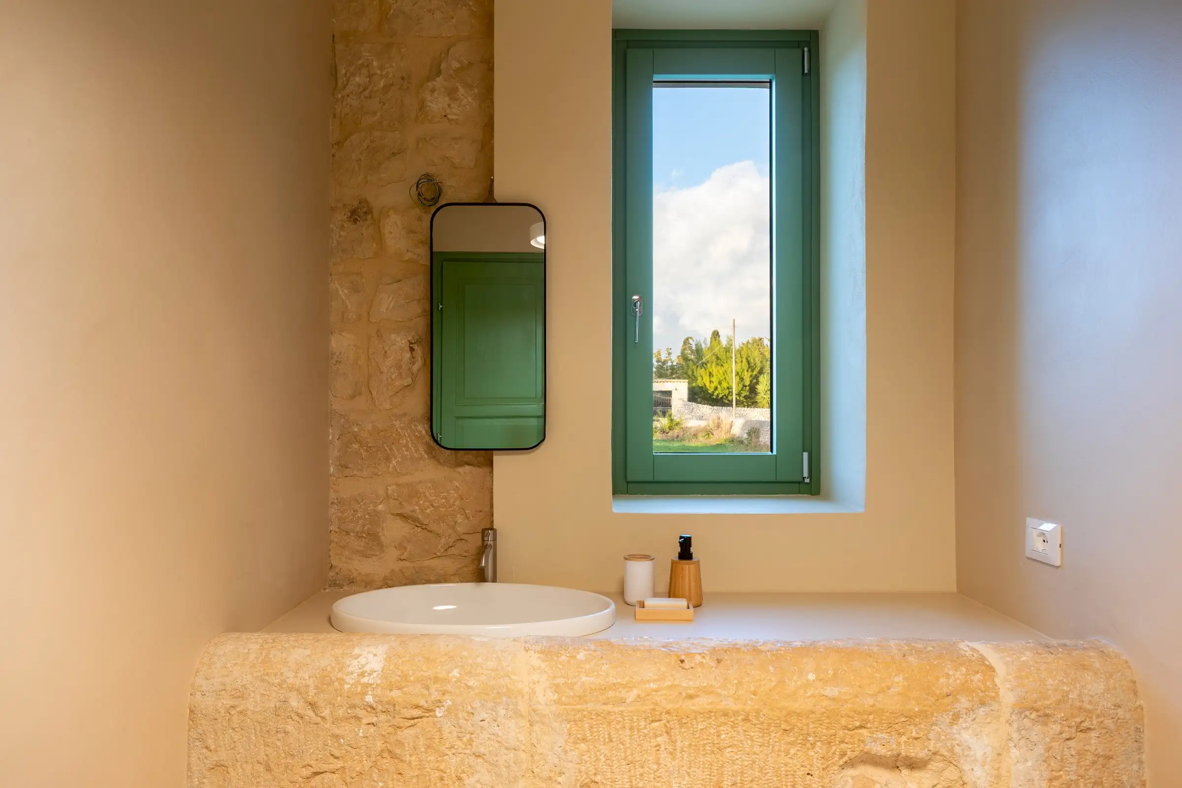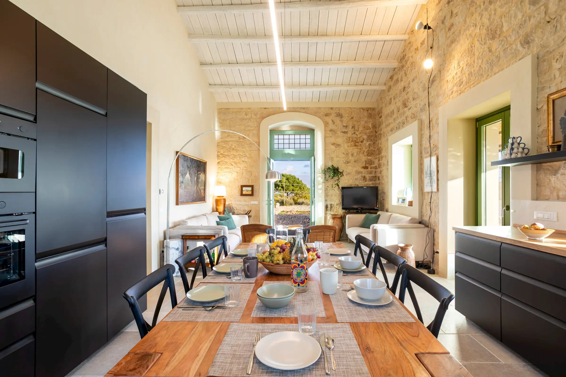 Formerly an agricultural building, many of the original architectural details have been incorporated into the villa’s contemporary interior design. There are five air-conditioned bedrooms and four bathrooms. The living room, dining room and kitchen are open-plan and take up the entire width of the building.