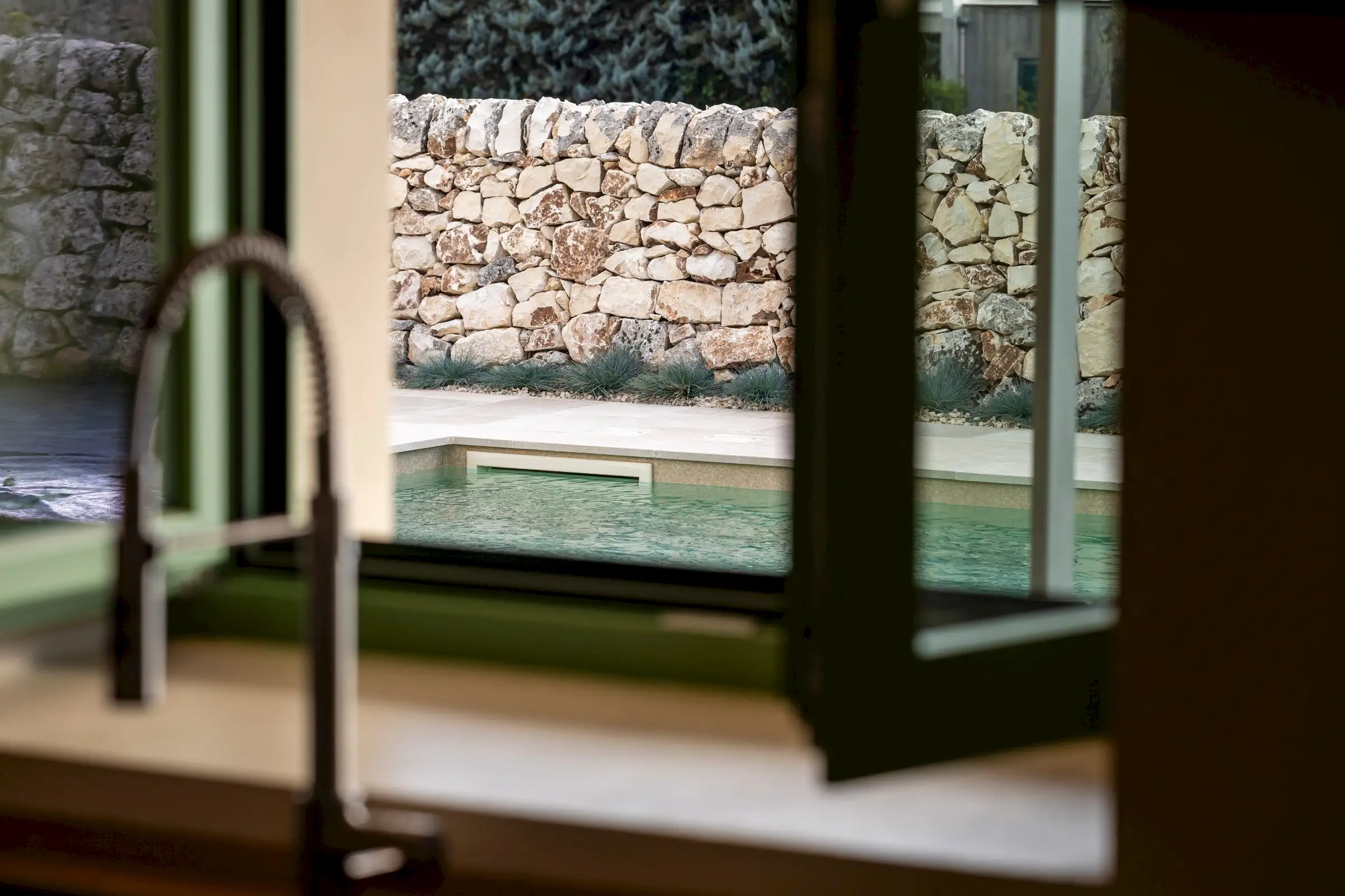 Windows and doors are painted a jolly green. Step outside and there is a shaded terrace with a dining table and comfy seating area and, just in front, the fabulous pool contained within the walled garden.