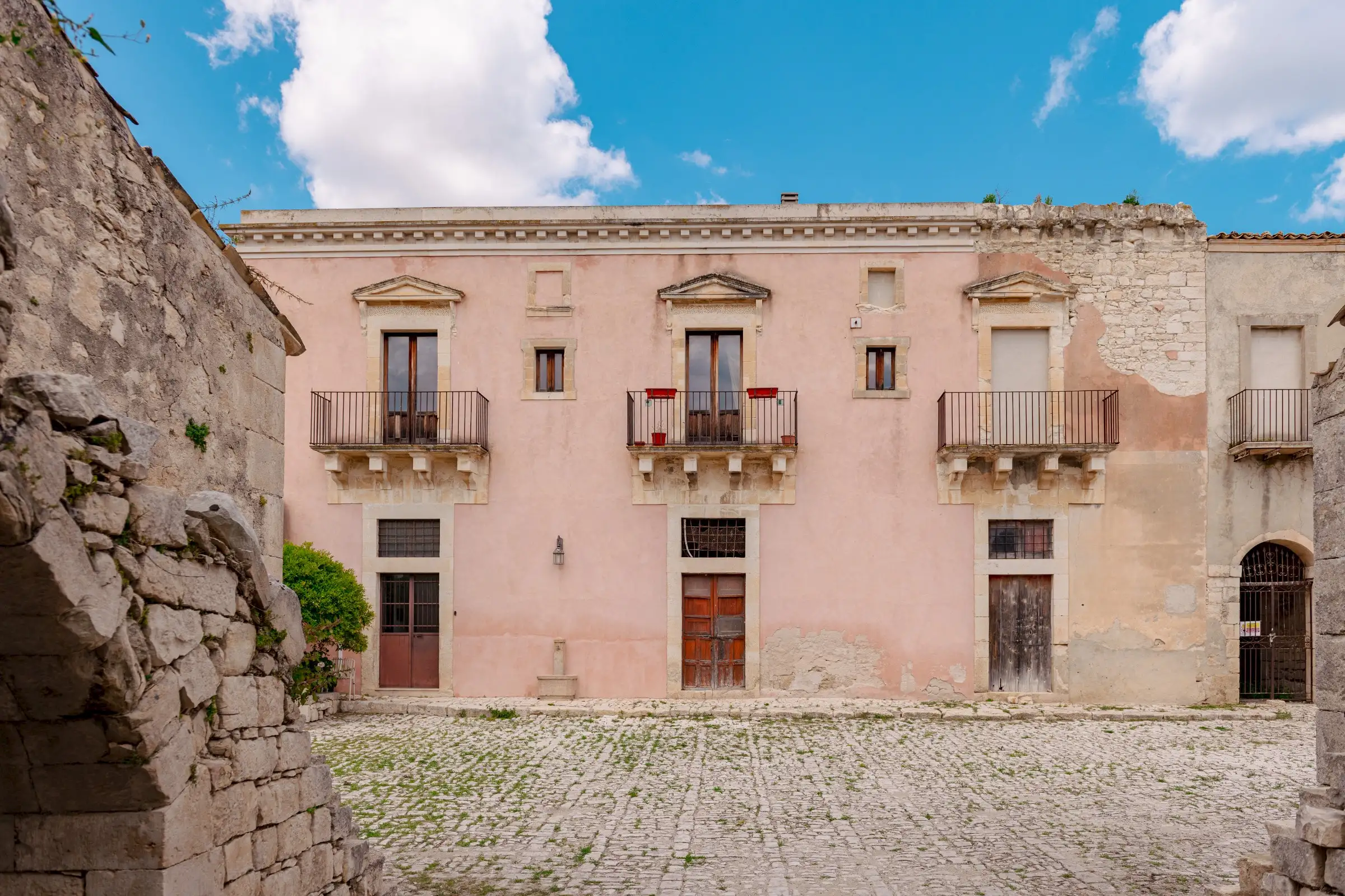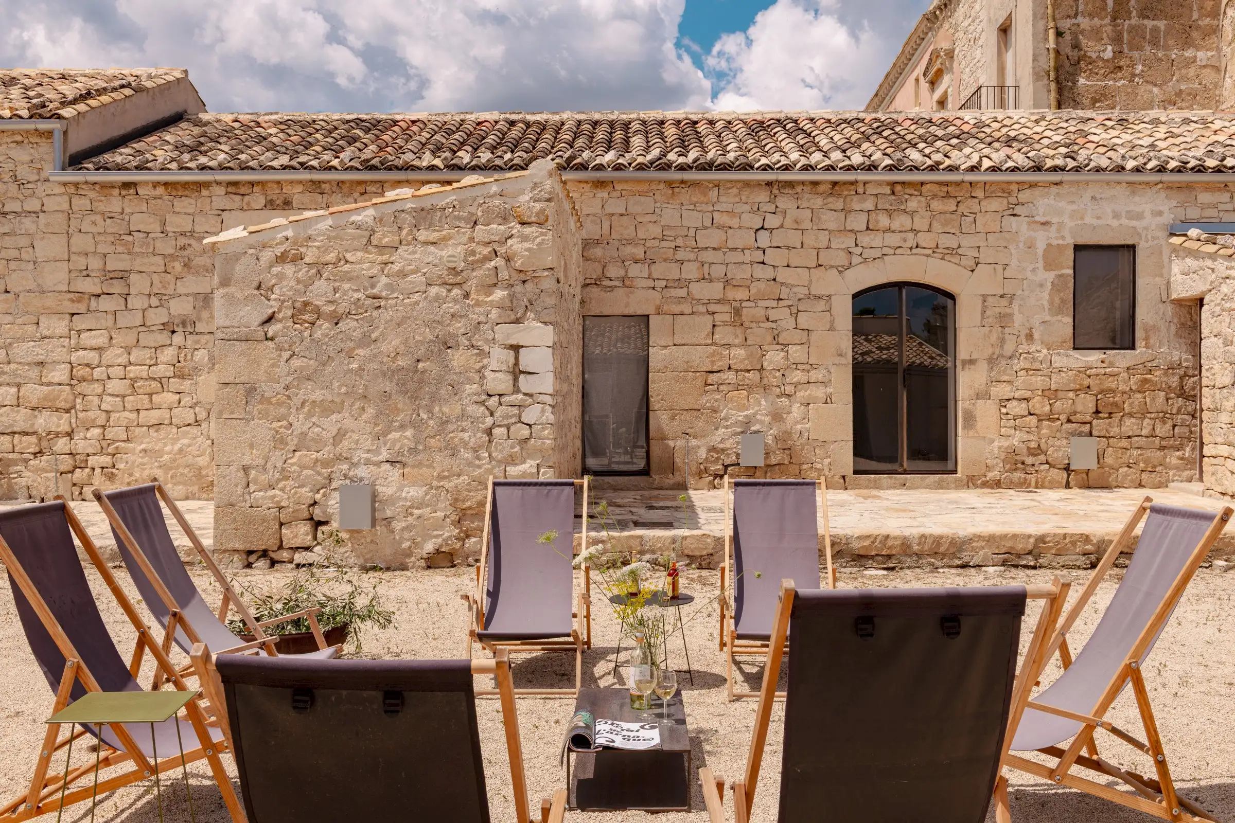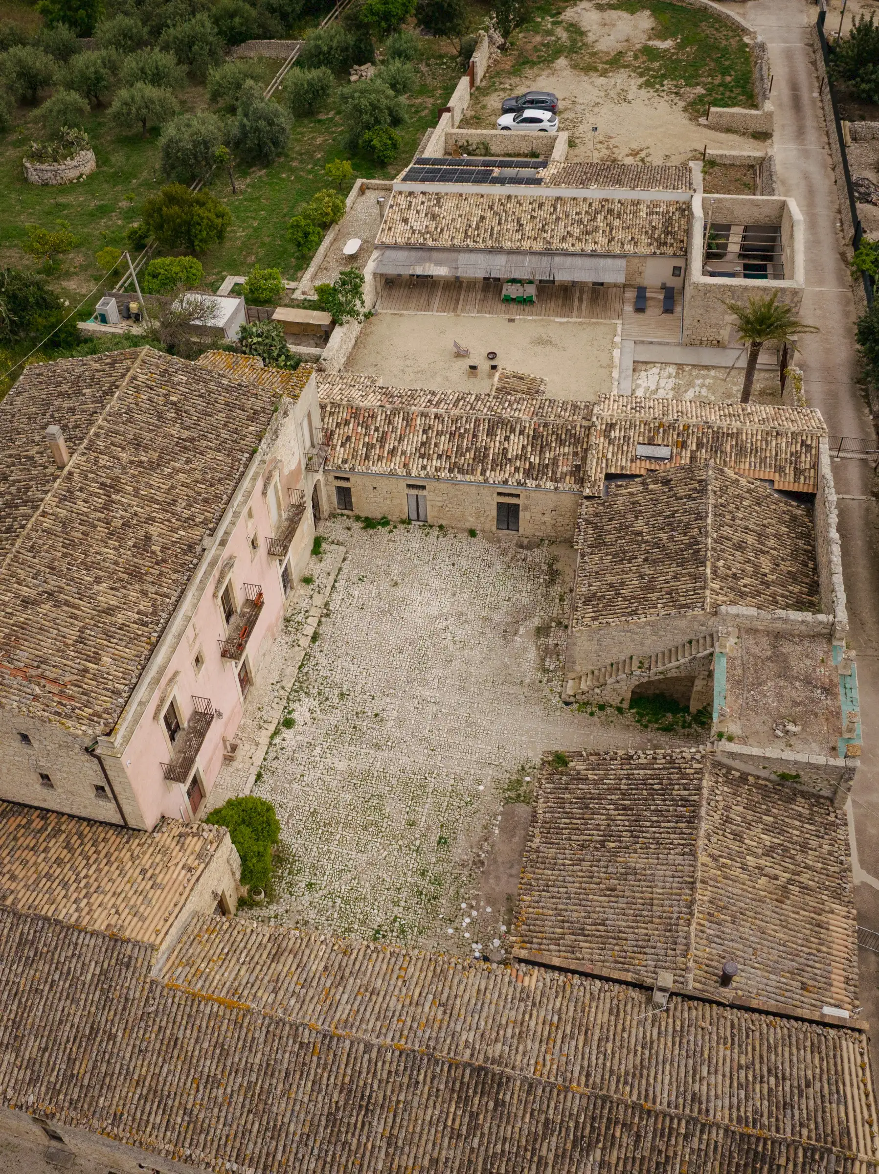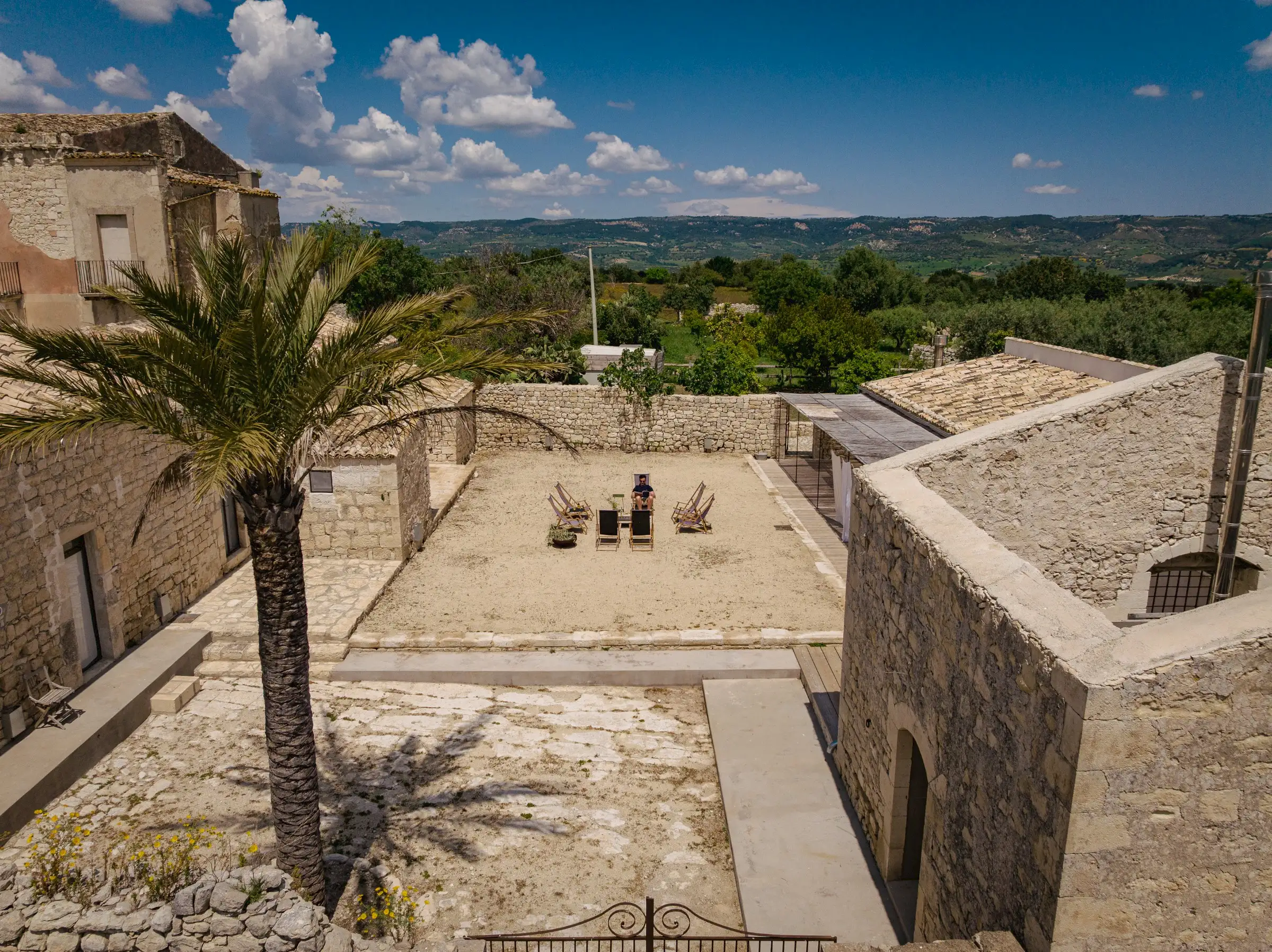 Set in the hills between Noto and Modica, the property stretches over three buildings. The main building, formerly the stables, houses the living room and a separate dining room, which open onto the decked veranda in the courtyard. Two of the en-suite double bedrooms, and the kitchen are also in this part of the property.