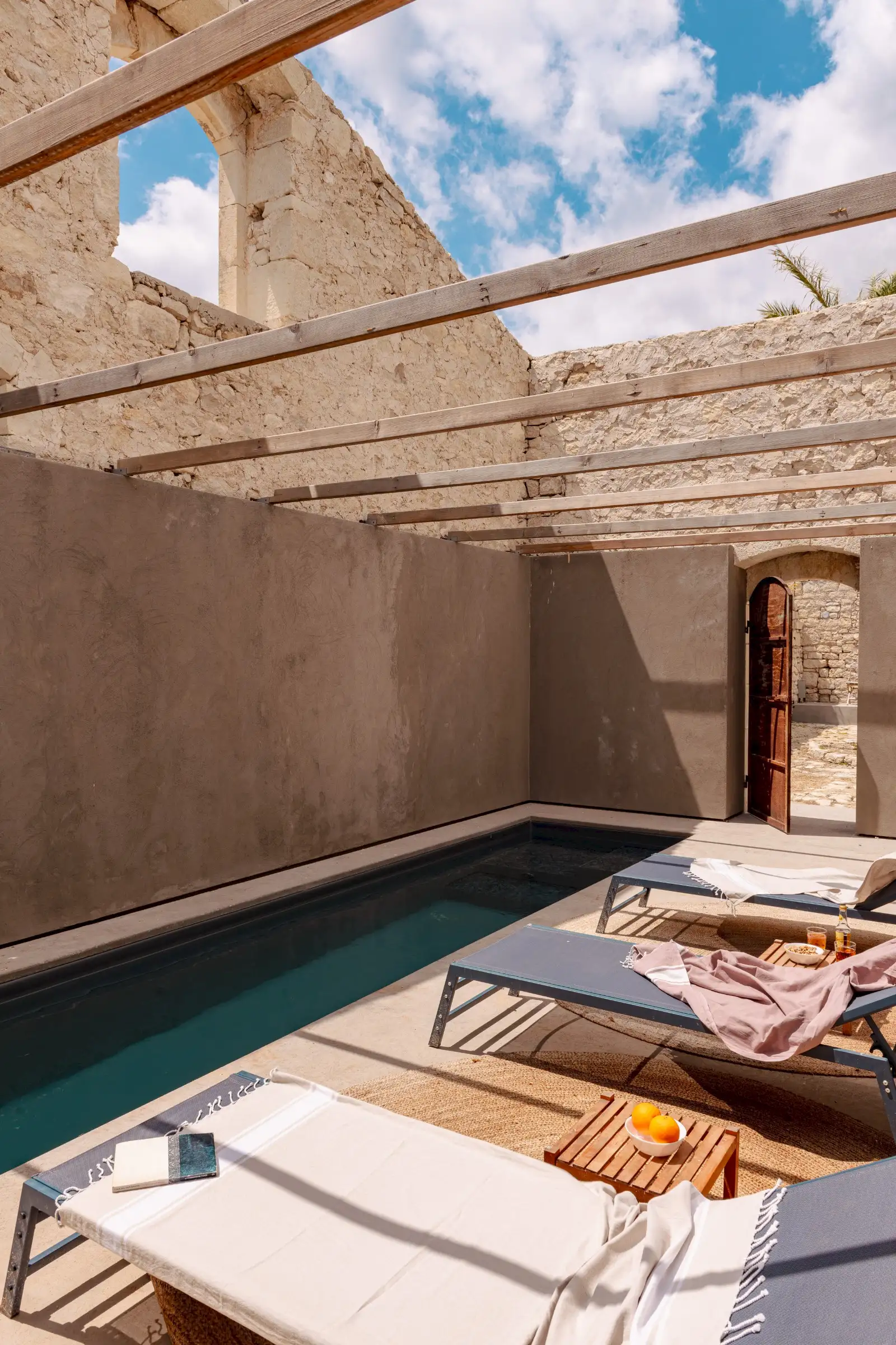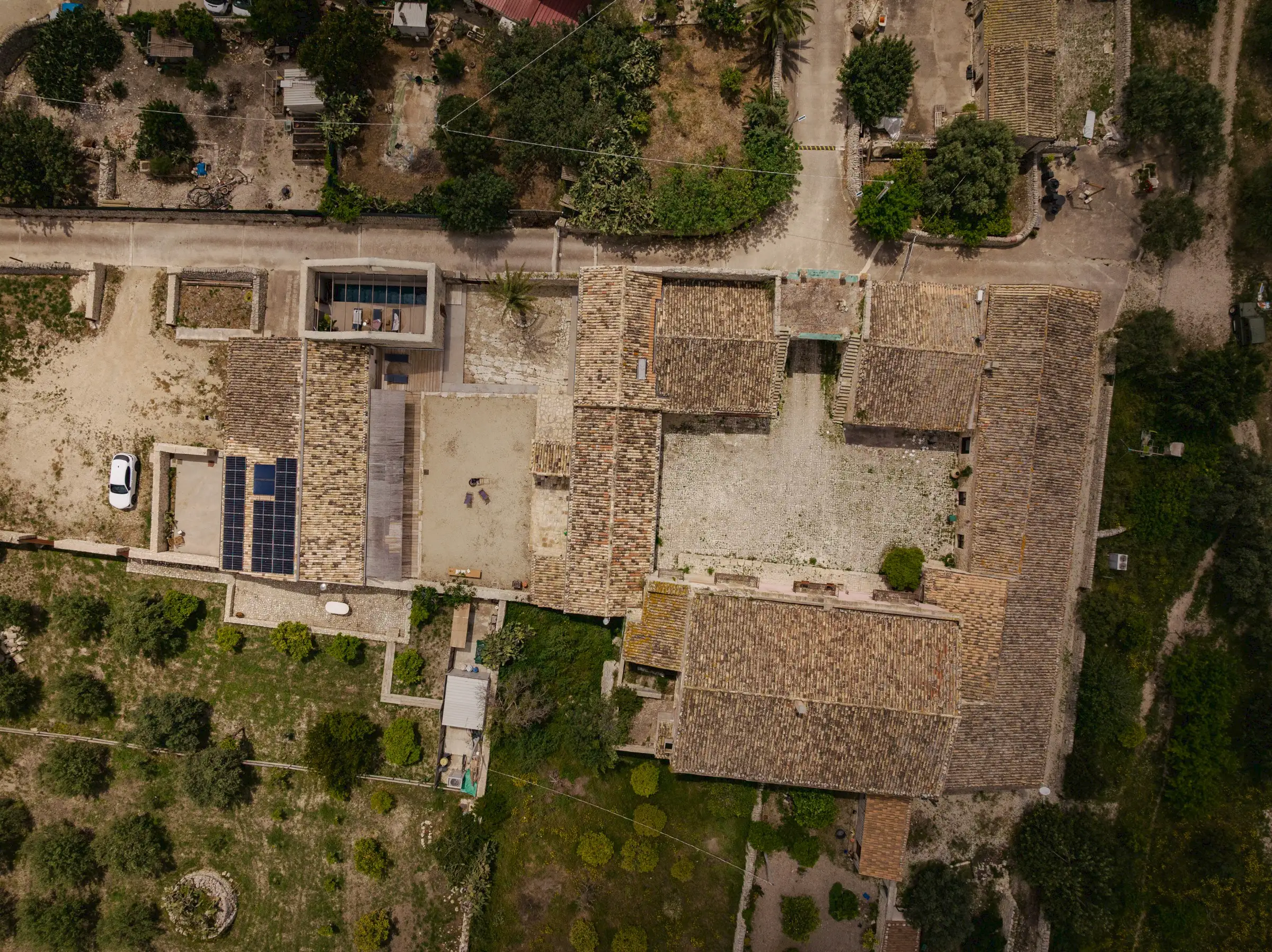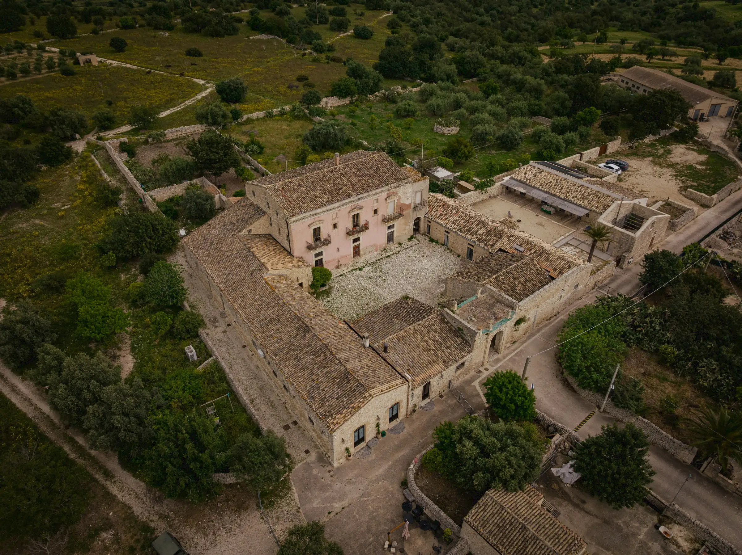 Set in the hills between Noto and Modica, the property stretches over three buildings. The main building, formerly the stables, houses the living room and a separate dining room, which open onto the decked veranda in the courtyard. Two of the en-suite double bedrooms, and the kitchen are also in this part of the property.