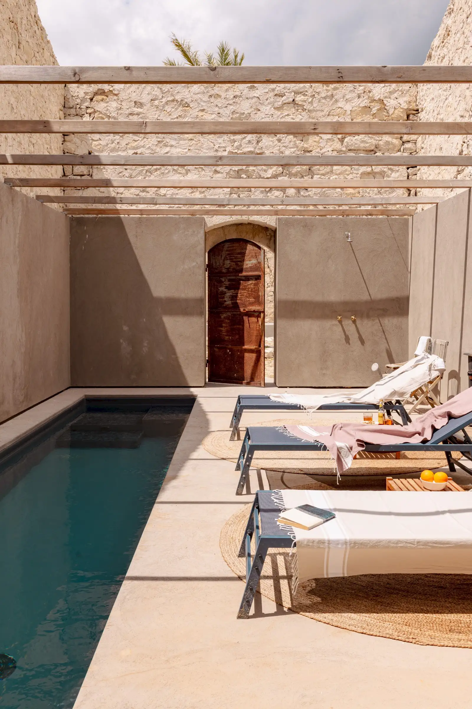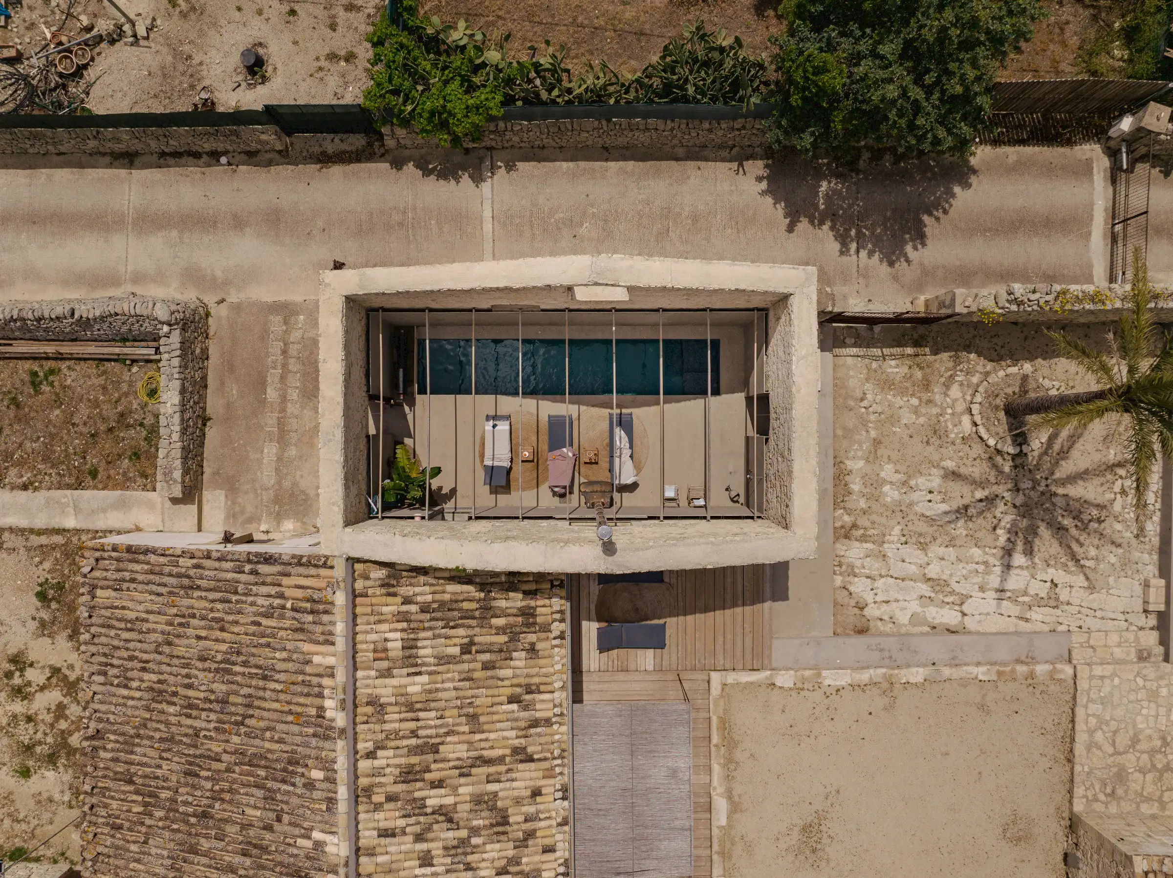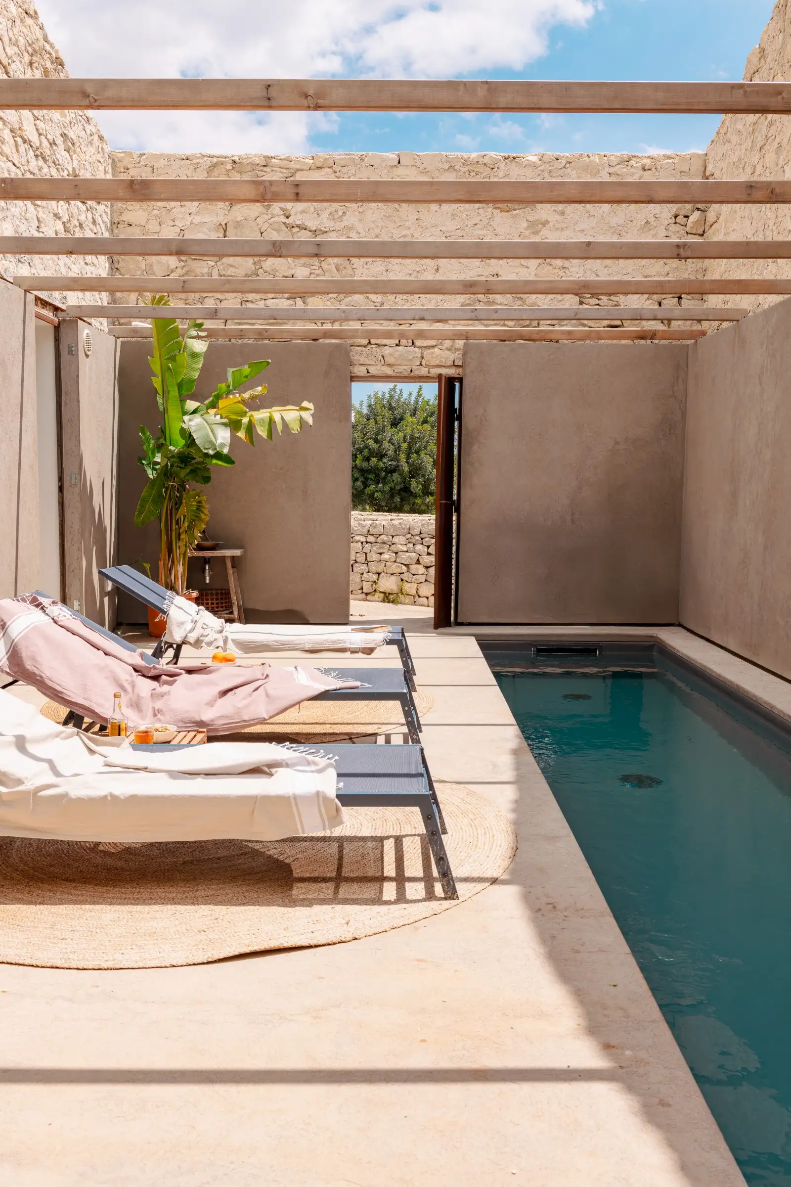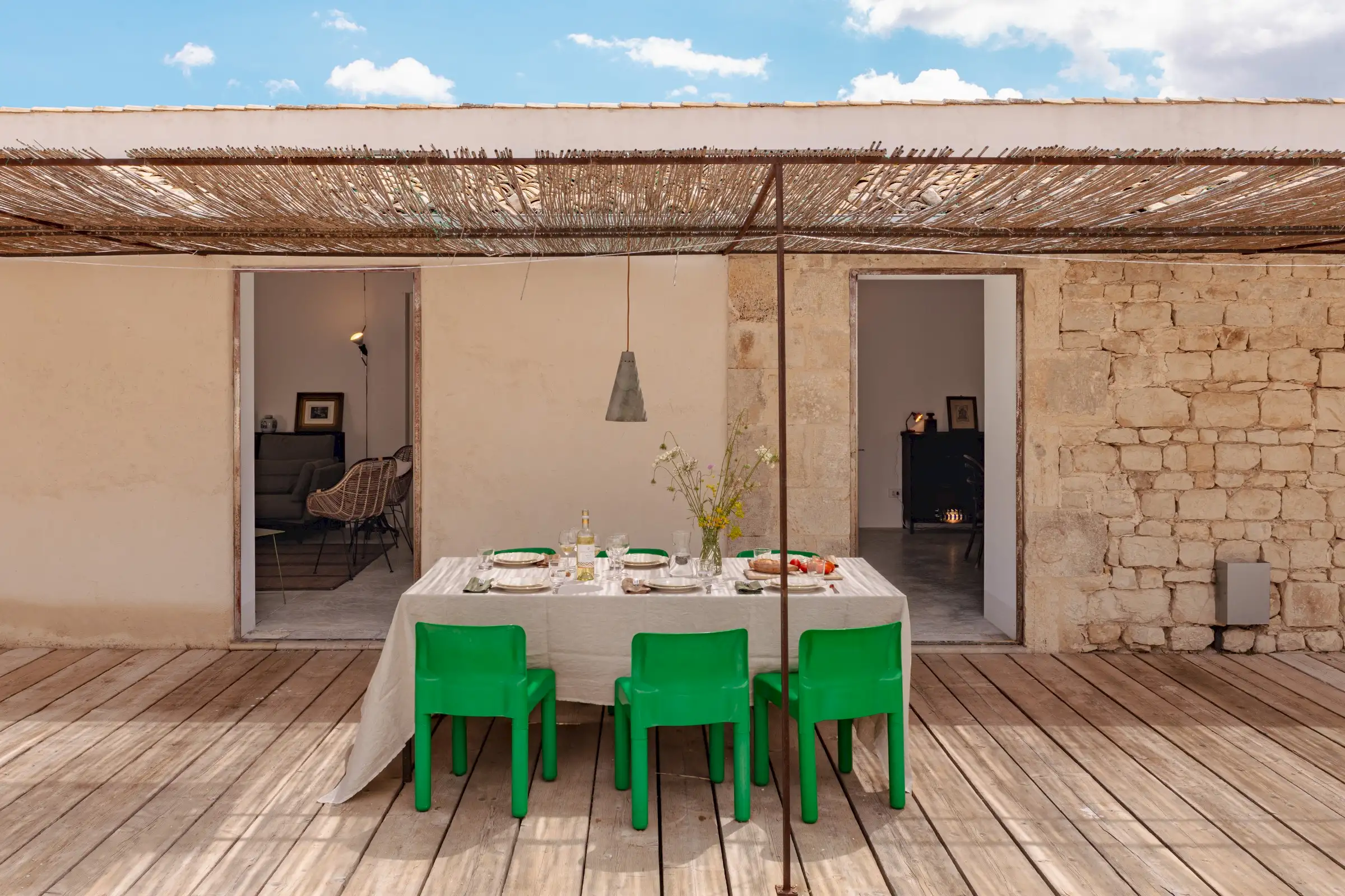 Set in the hills between Noto and Modica, the property stretches over three buildings. The main building, formerly the stables, houses the living room and a separate dining room, which open onto the decked veranda in the courtyard. Two of the en-suite double bedrooms, and the kitchen are also in this part of the property.