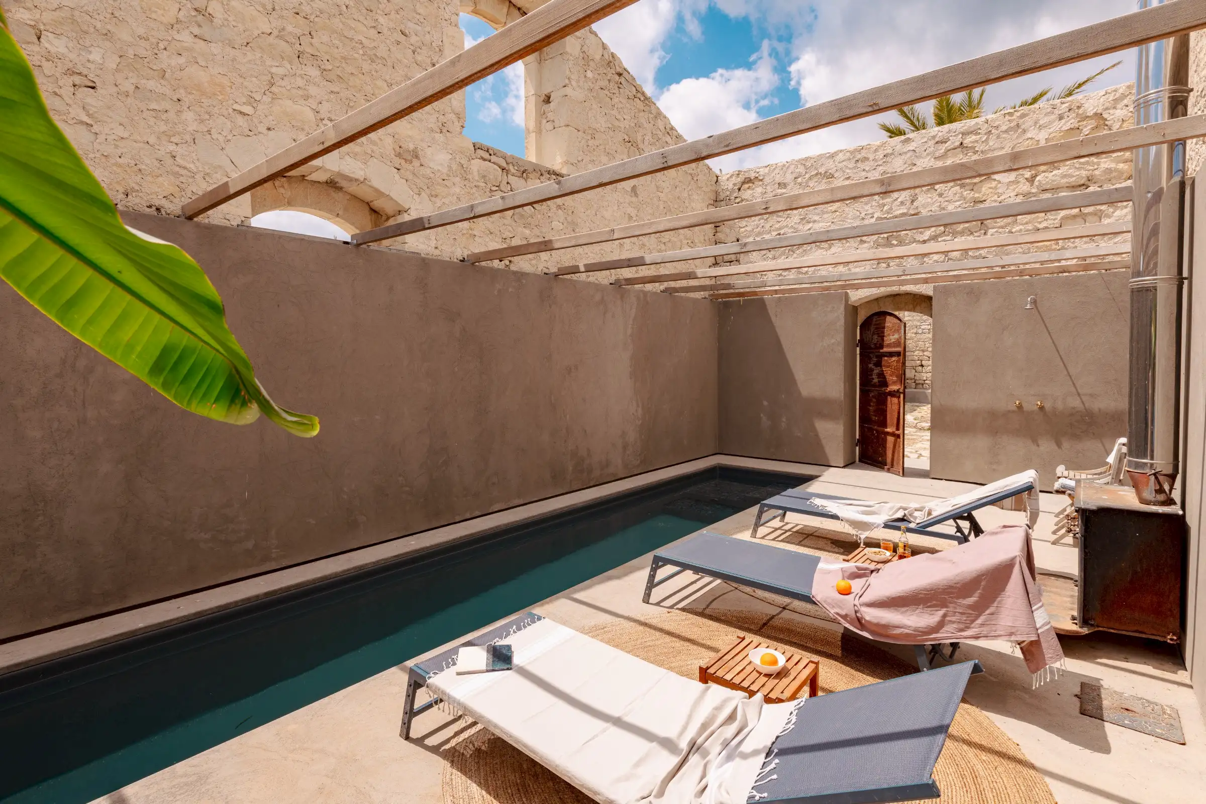 Step through the kitchen door and you will find yourself in the shell of another building. Open to the elements, but with a woodburning stove, this roofless cottage houses the lap pool which can be heated to a toasty 35*.