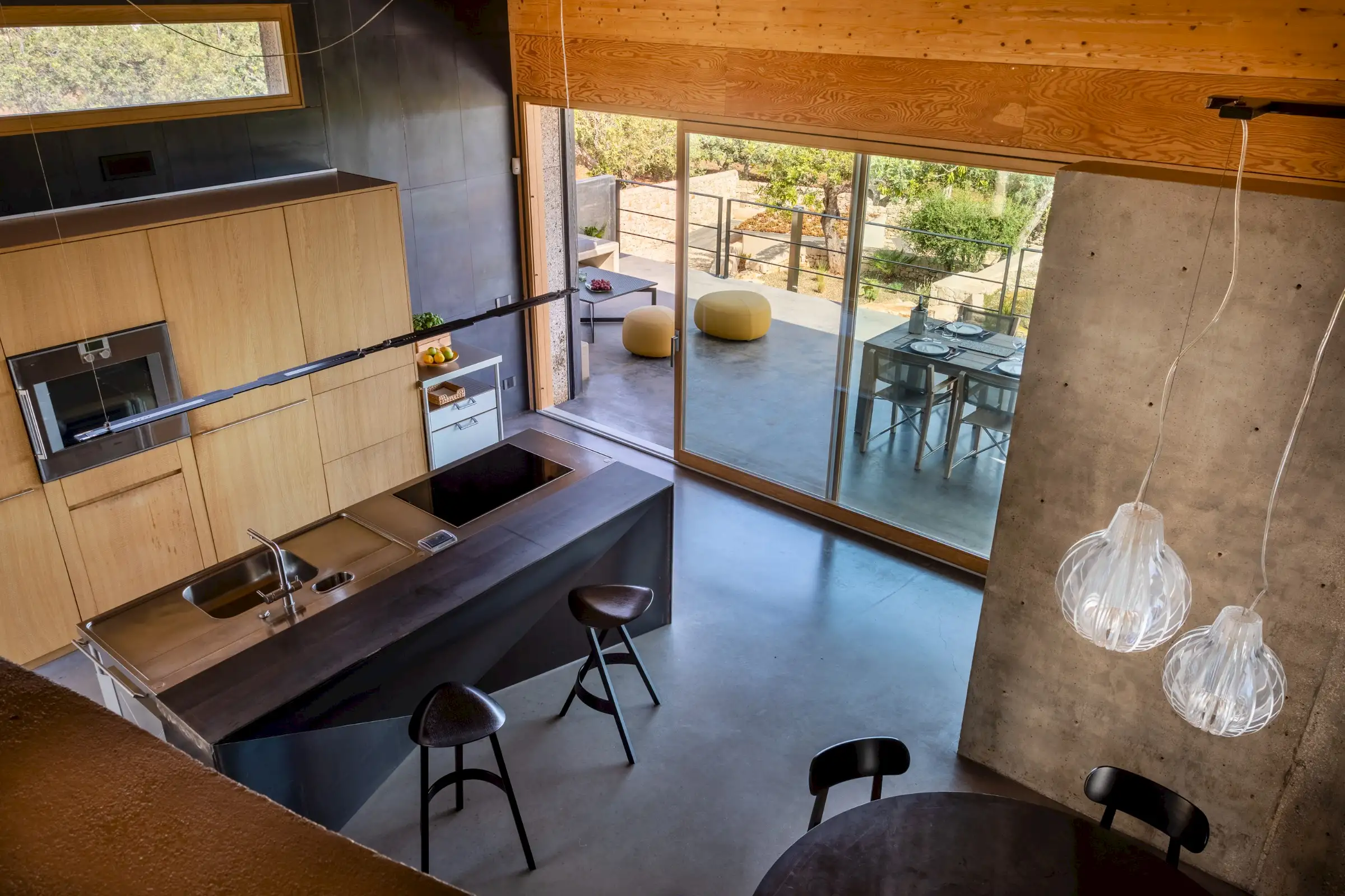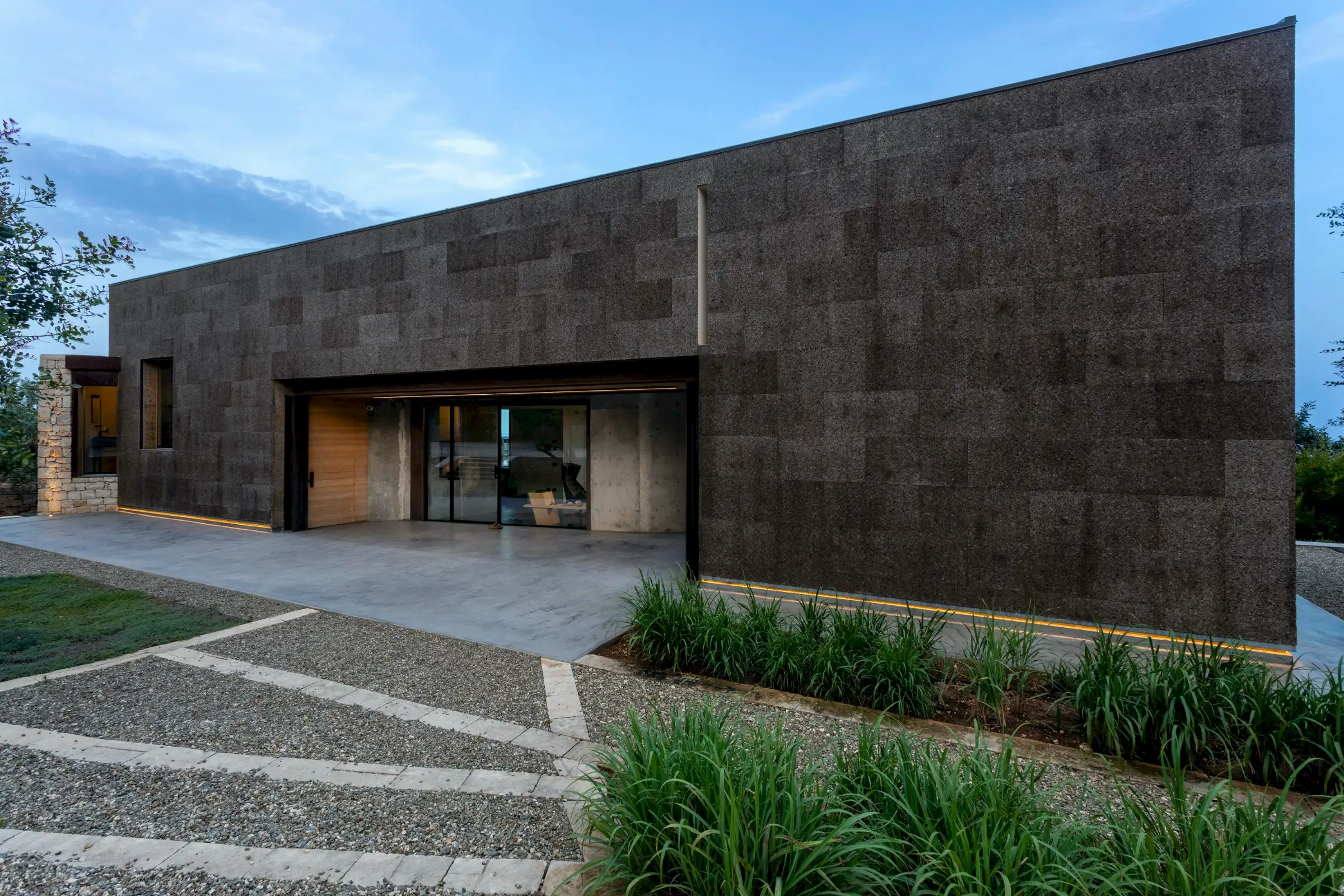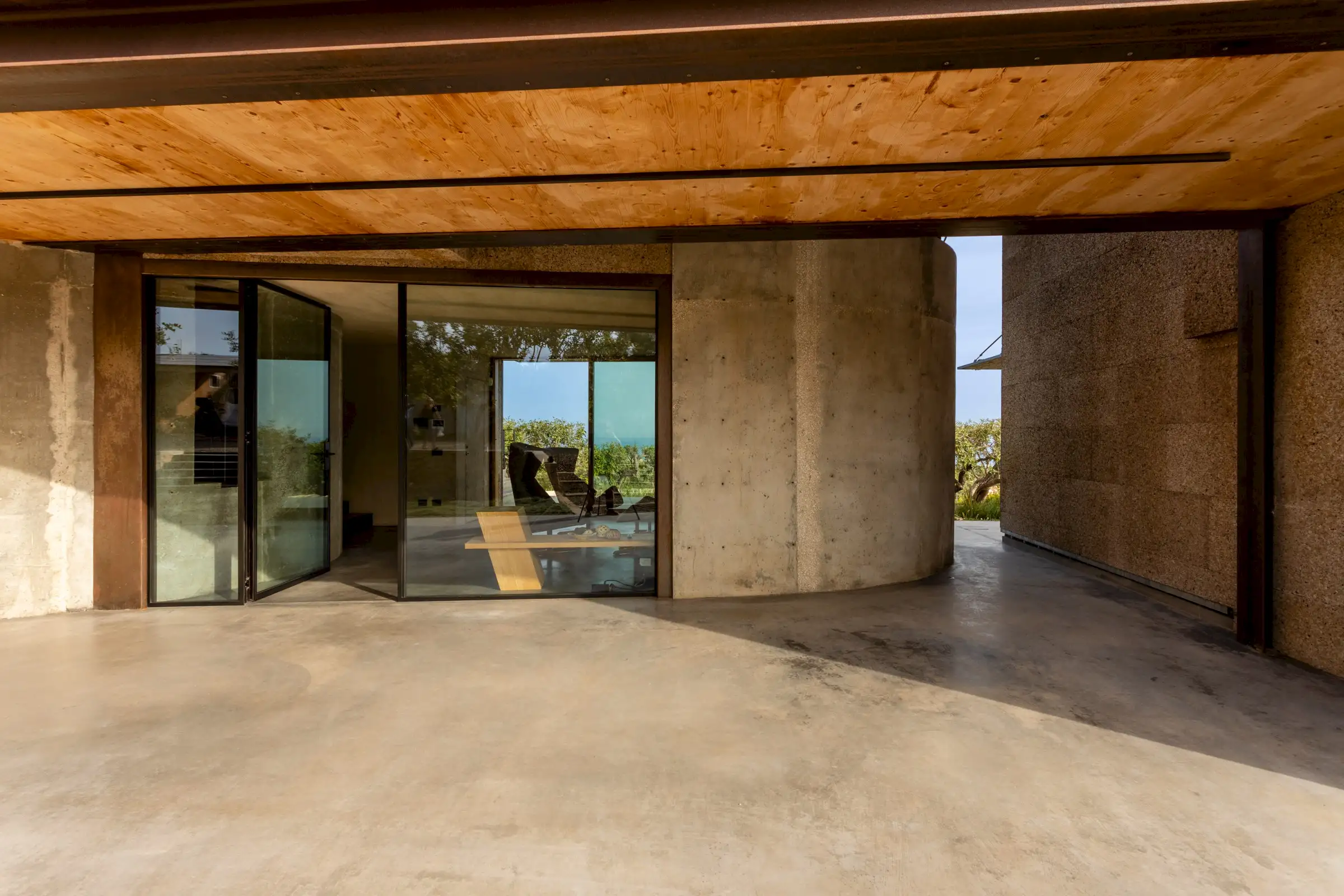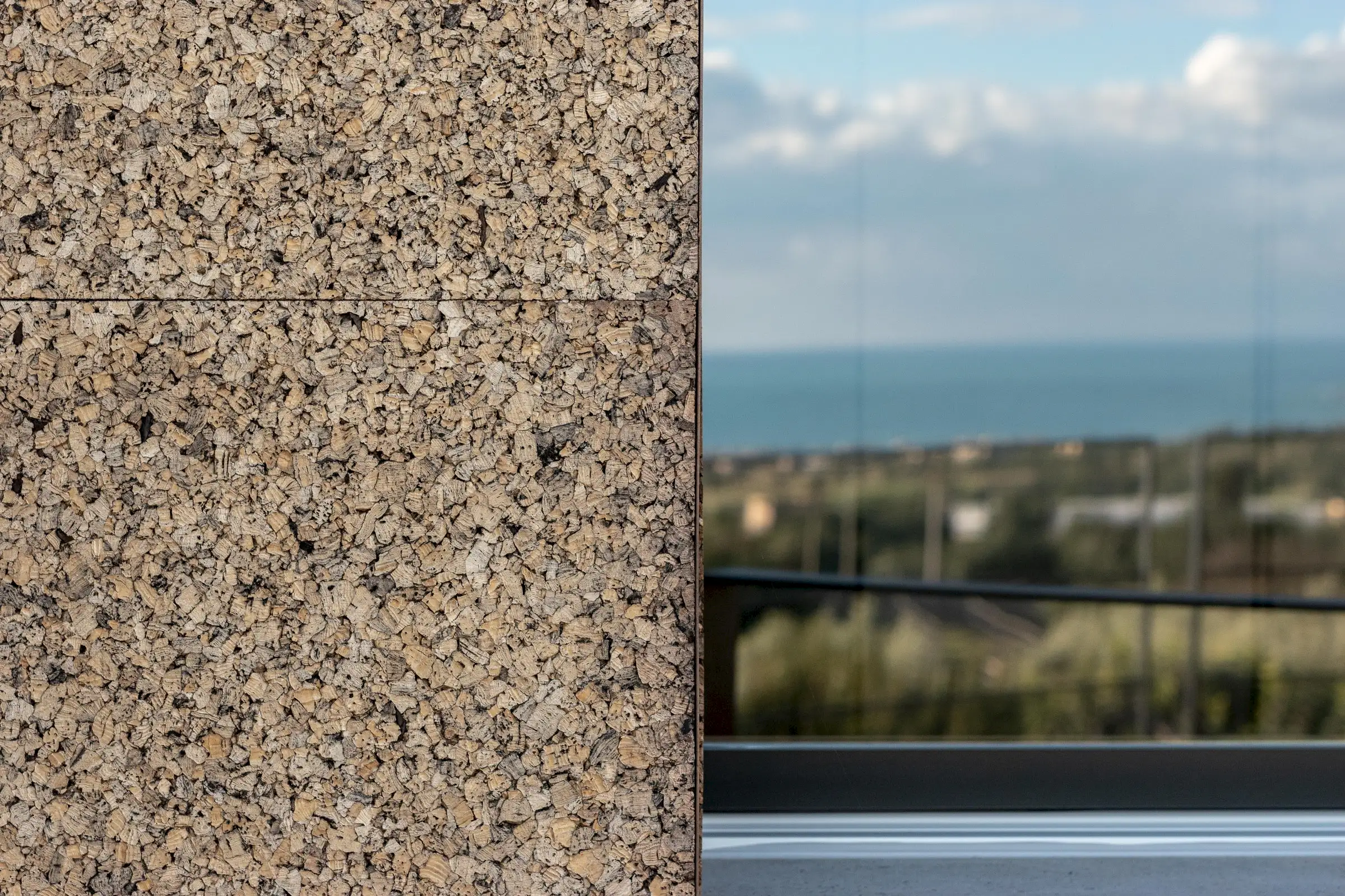Built on three different levels, the minimalist design leads you from room to room and floor to floor, merging a core blend of materials, including wood, cement, stone and metal. Taking inspiration from nature, the house is covered in cork and was conceived as an oasis of high design based on sustainable principles with a view to being a house in which to relax and reset.