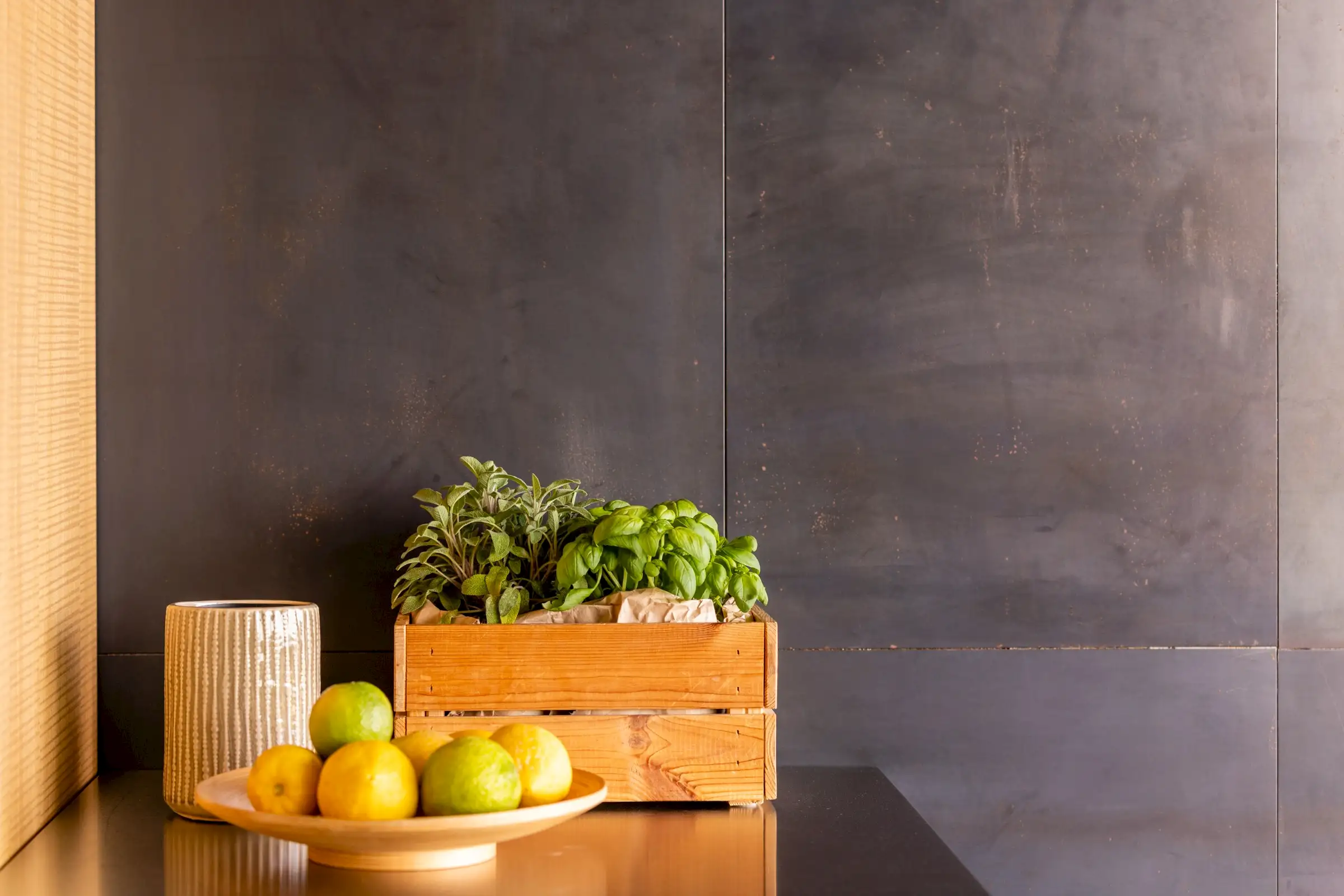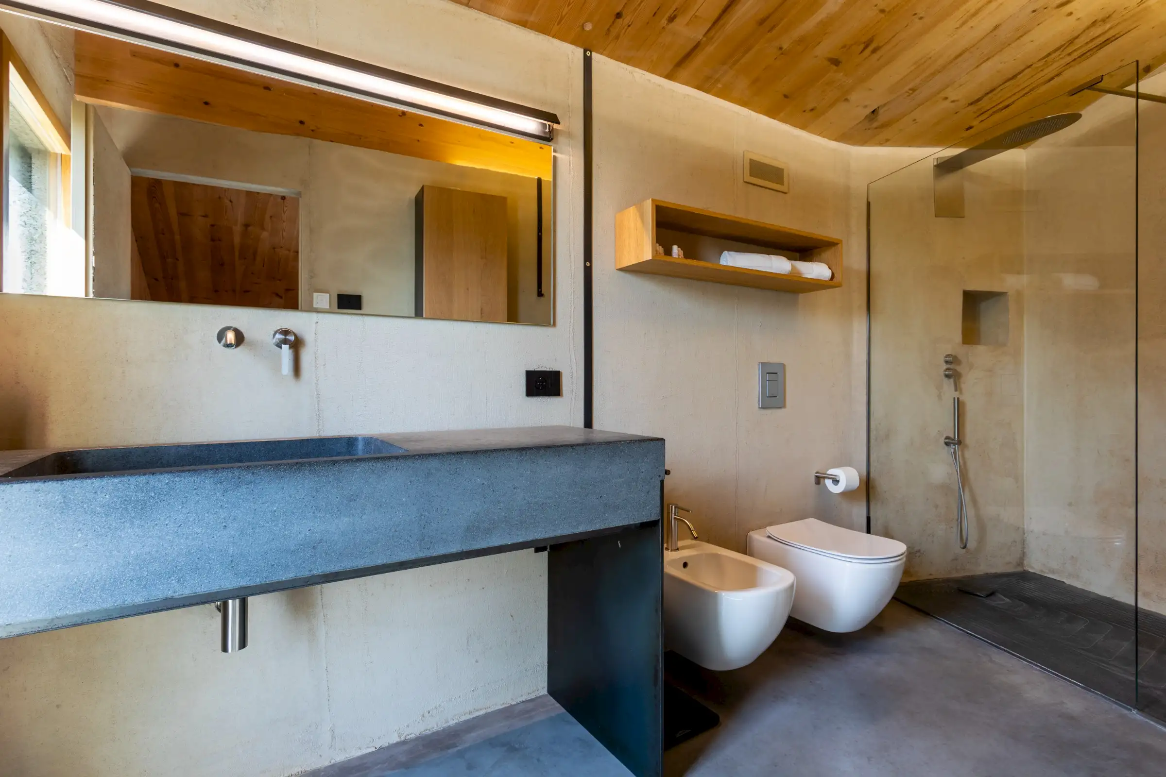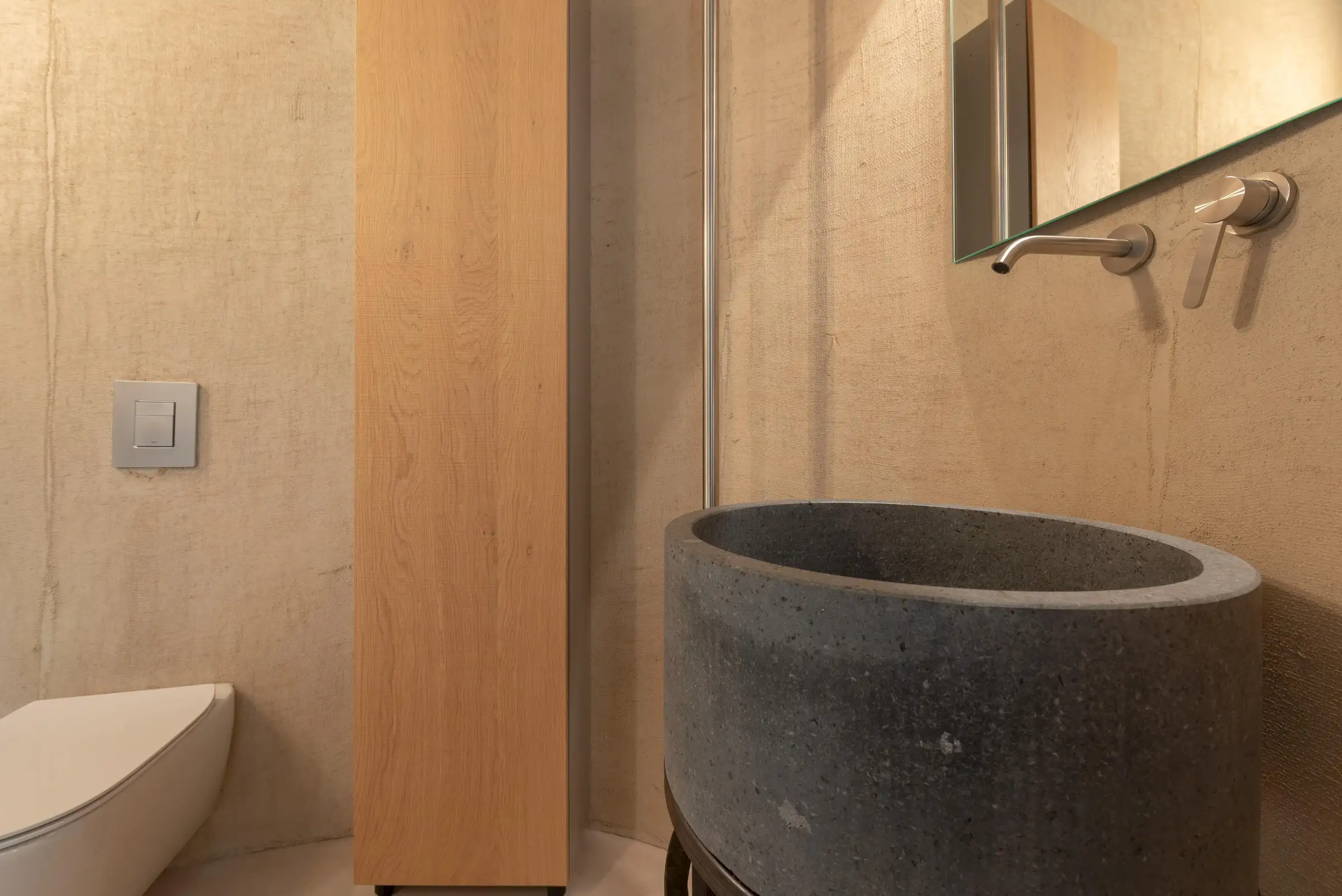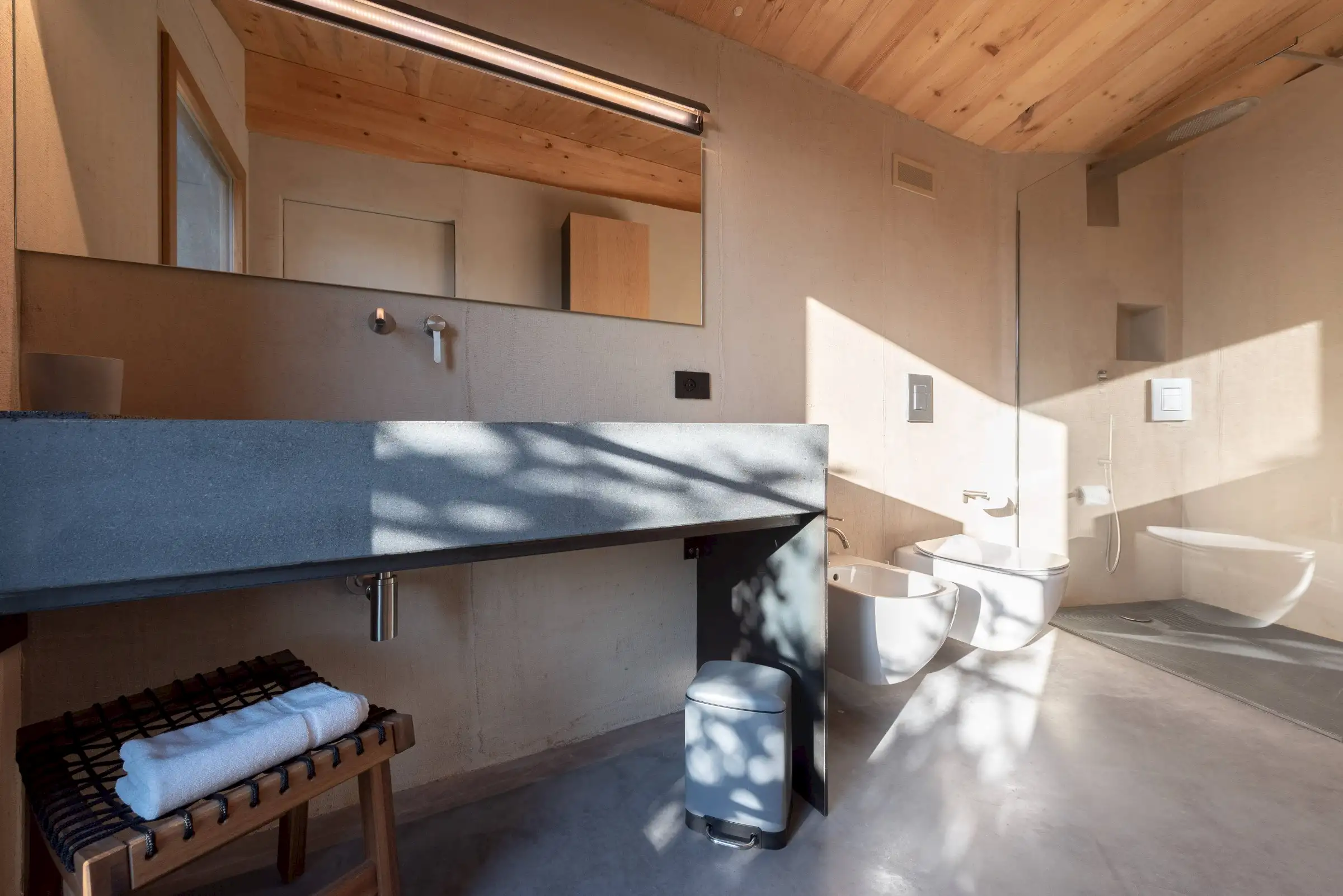 Built on three different levels, the minimalist design leads you from room to room and floor to floor, merging a core blend of materials, including wood, cement, stone and metal. Taking inspiration from nature, the house is covered in cork and was conceived as an oasis of high design based on sustainable principles with a view to being a house in which to relax and reset.