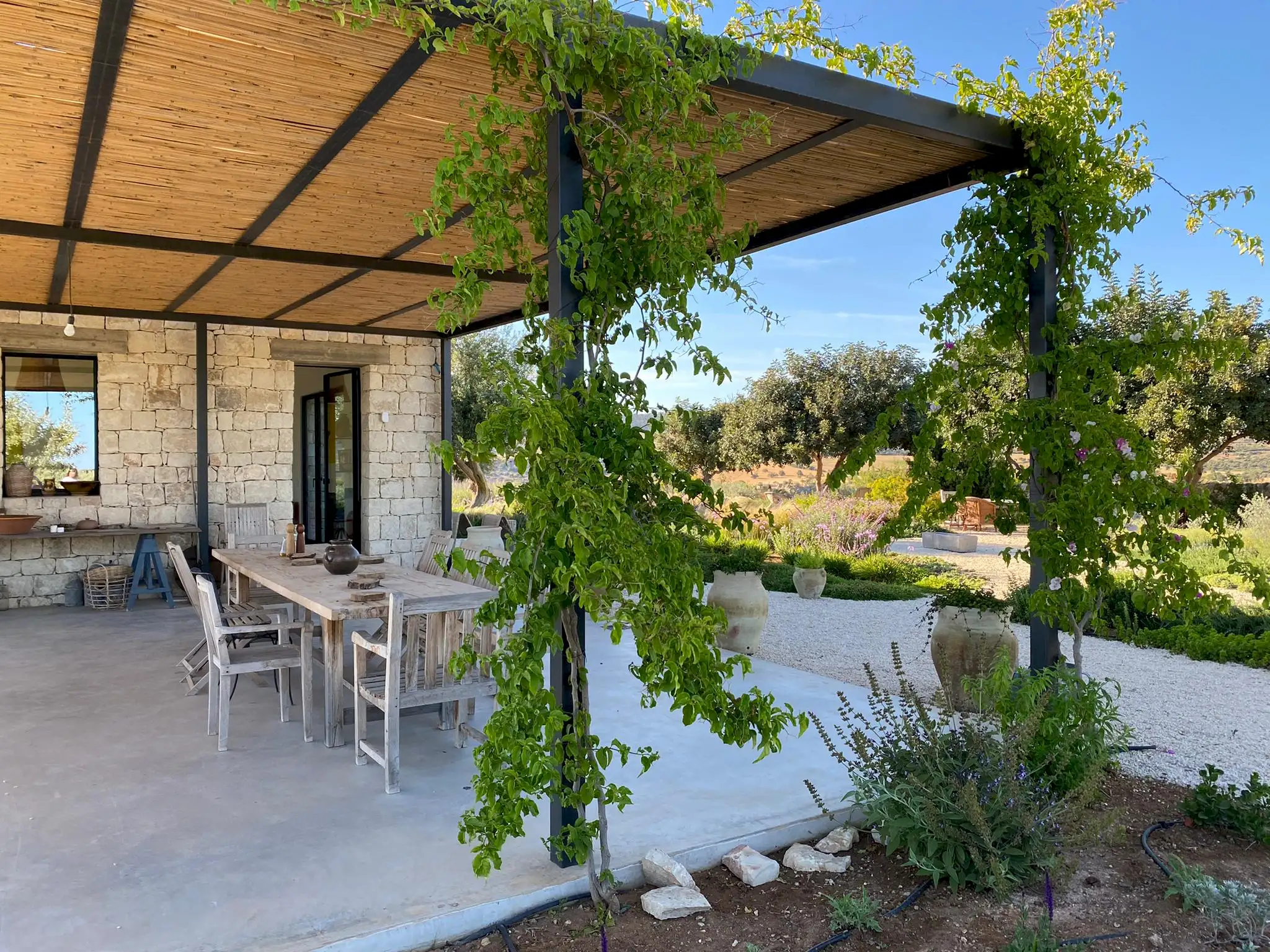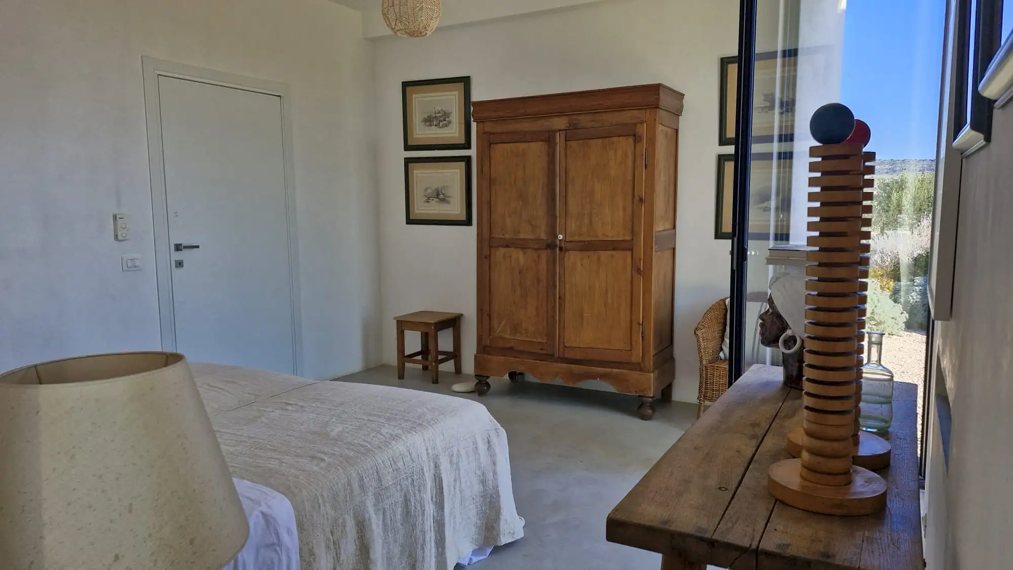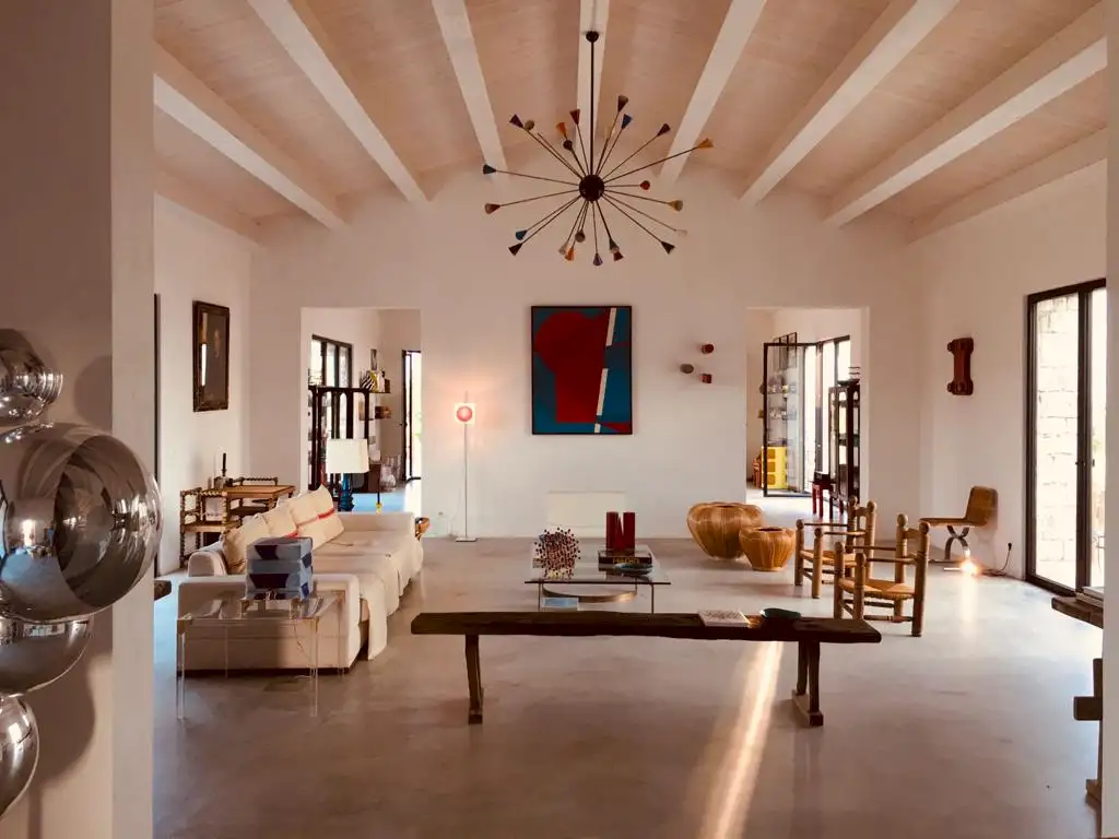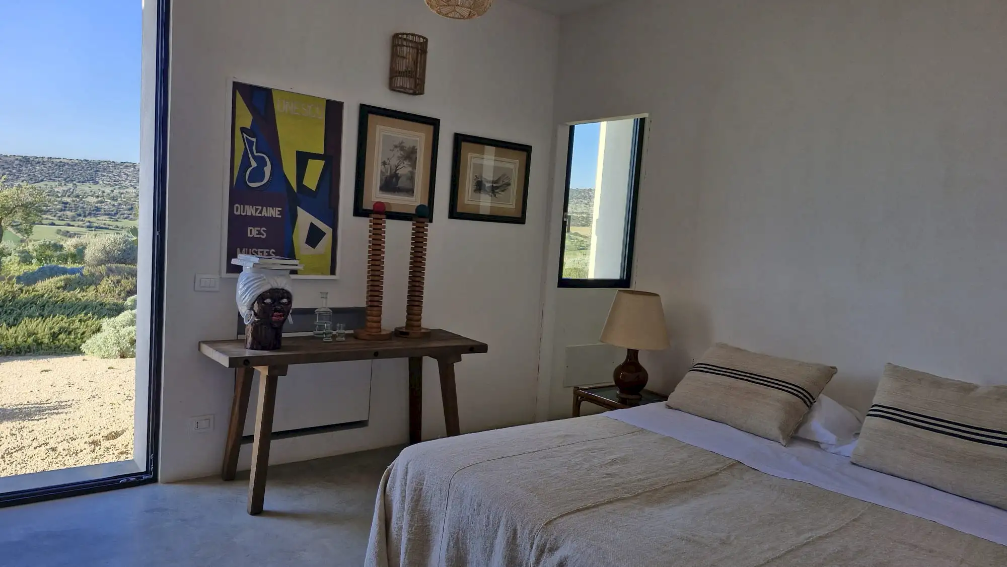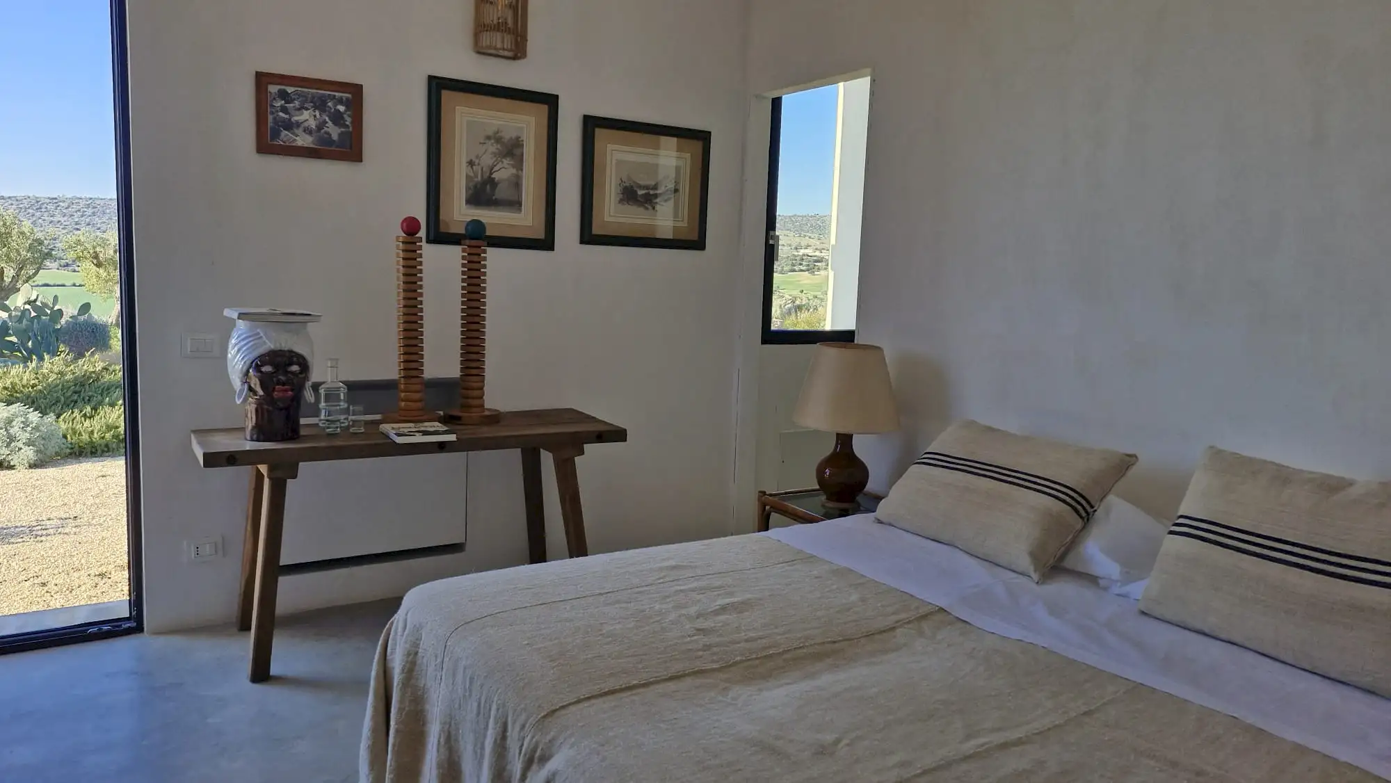 The design has been as carefully balanced inside as out, and the six en-suite doubles are individually decorated with original art, lighting and furniture, both modern and antique, much of it championing local makers. Smooth floors, a well-equipped kitchen and a vast living room all have doors to outside that can be kept open to create a breeze, even in the heat of summer.