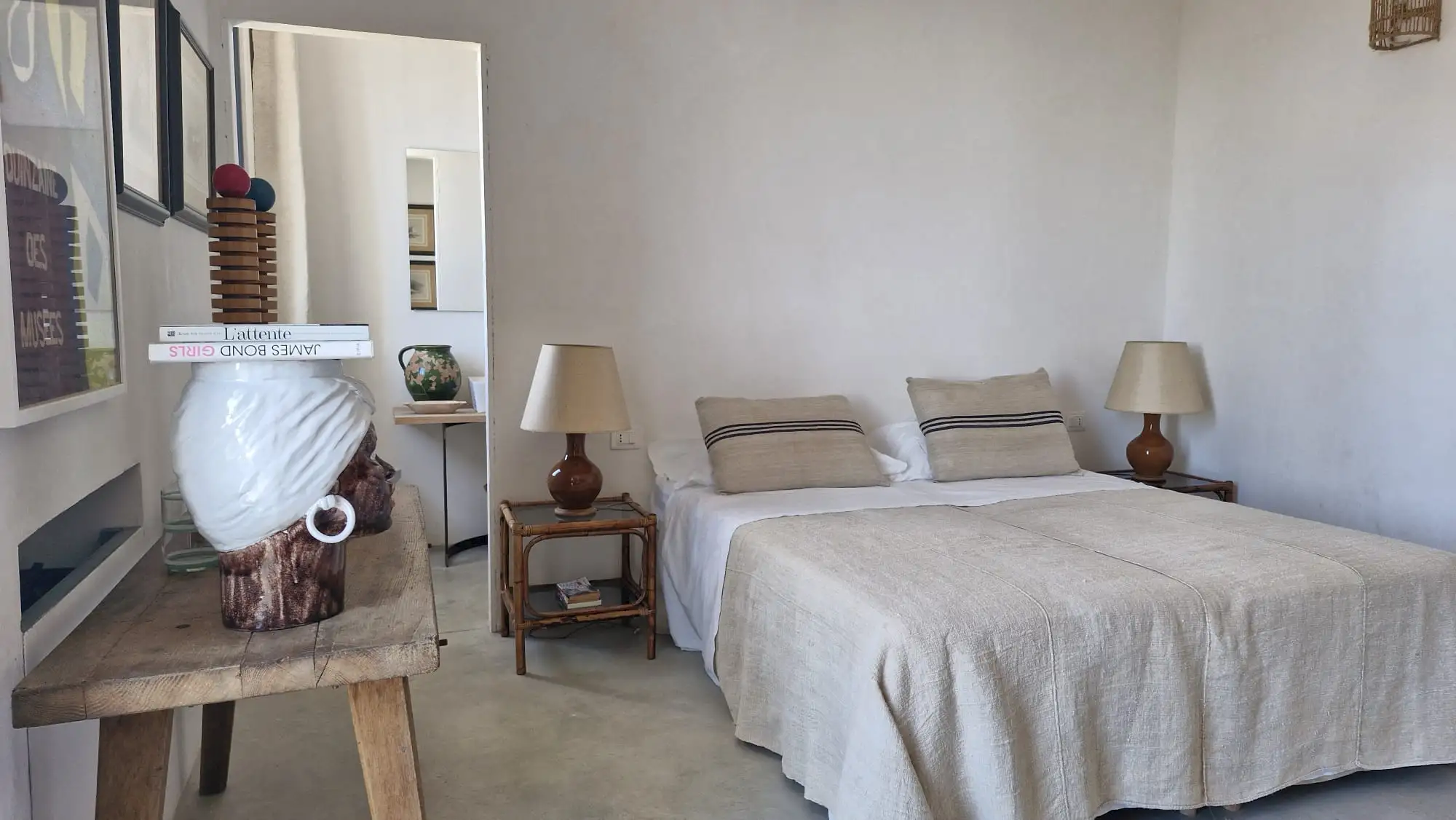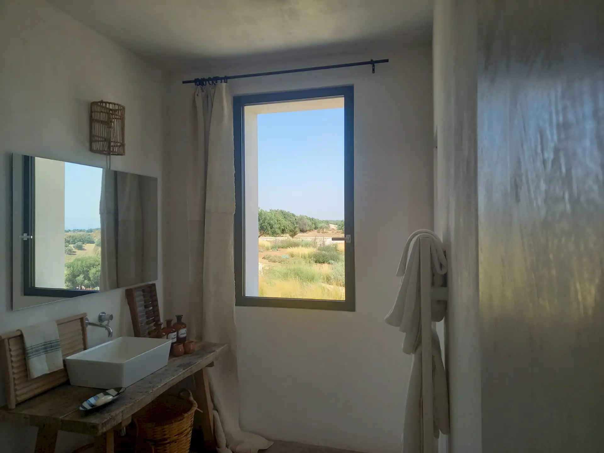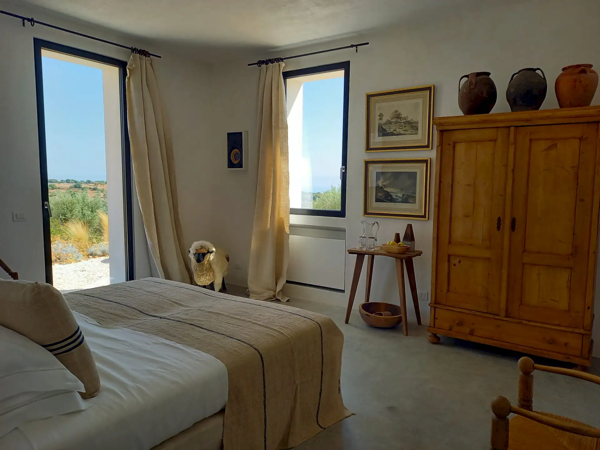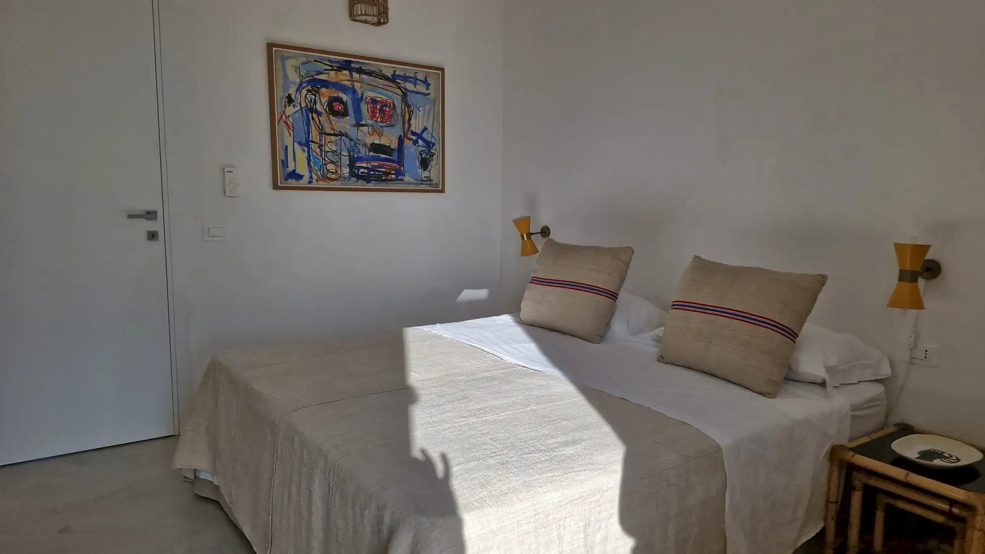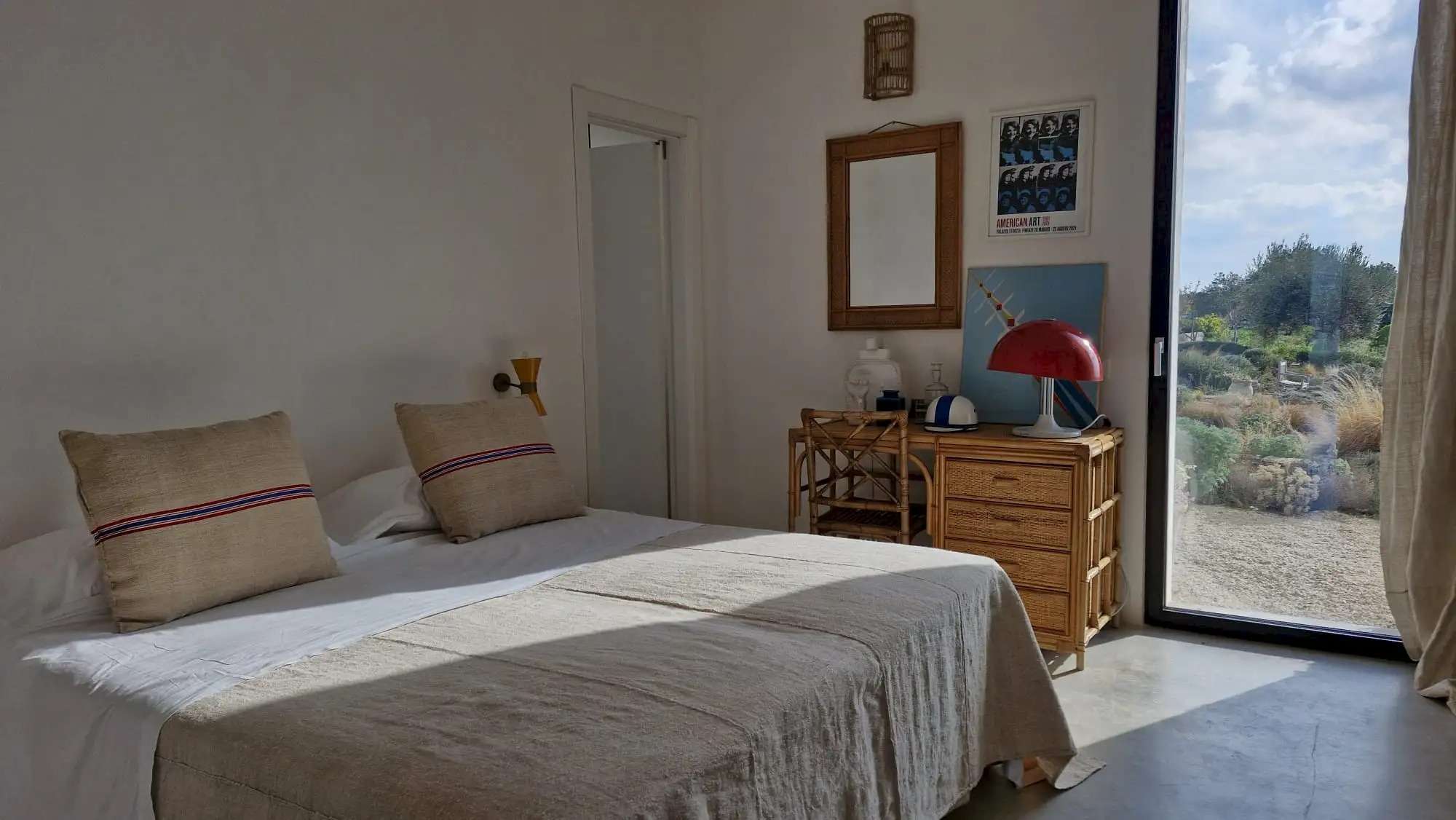 The design has been as carefully balanced inside as out, and the six en-suite doubles are individually decorated with original art, lighting and furniture, both modern and antique, much of it championing local makers. Smooth floors, a well-equipped kitchen and a vast living room all have doors to outside that can be kept open to create a breeze, even in the heat of summer.