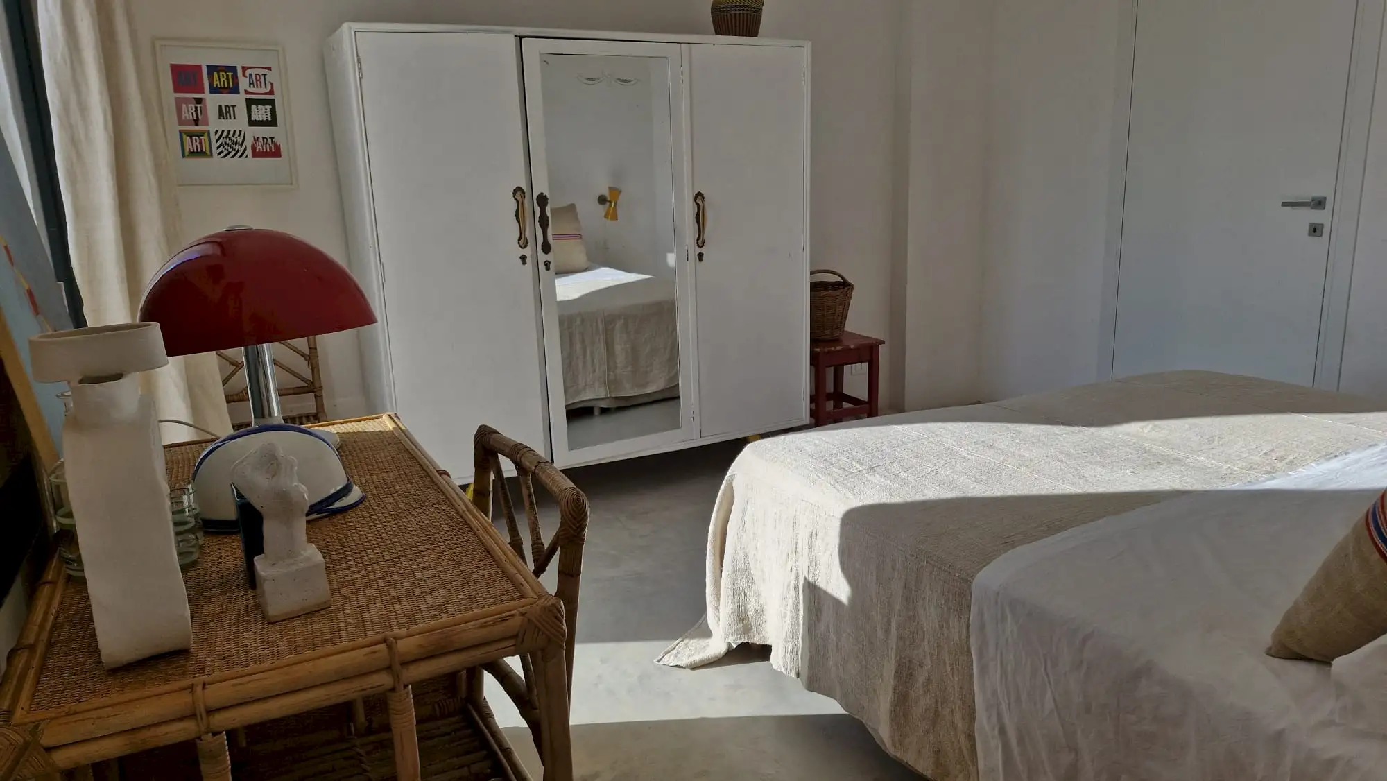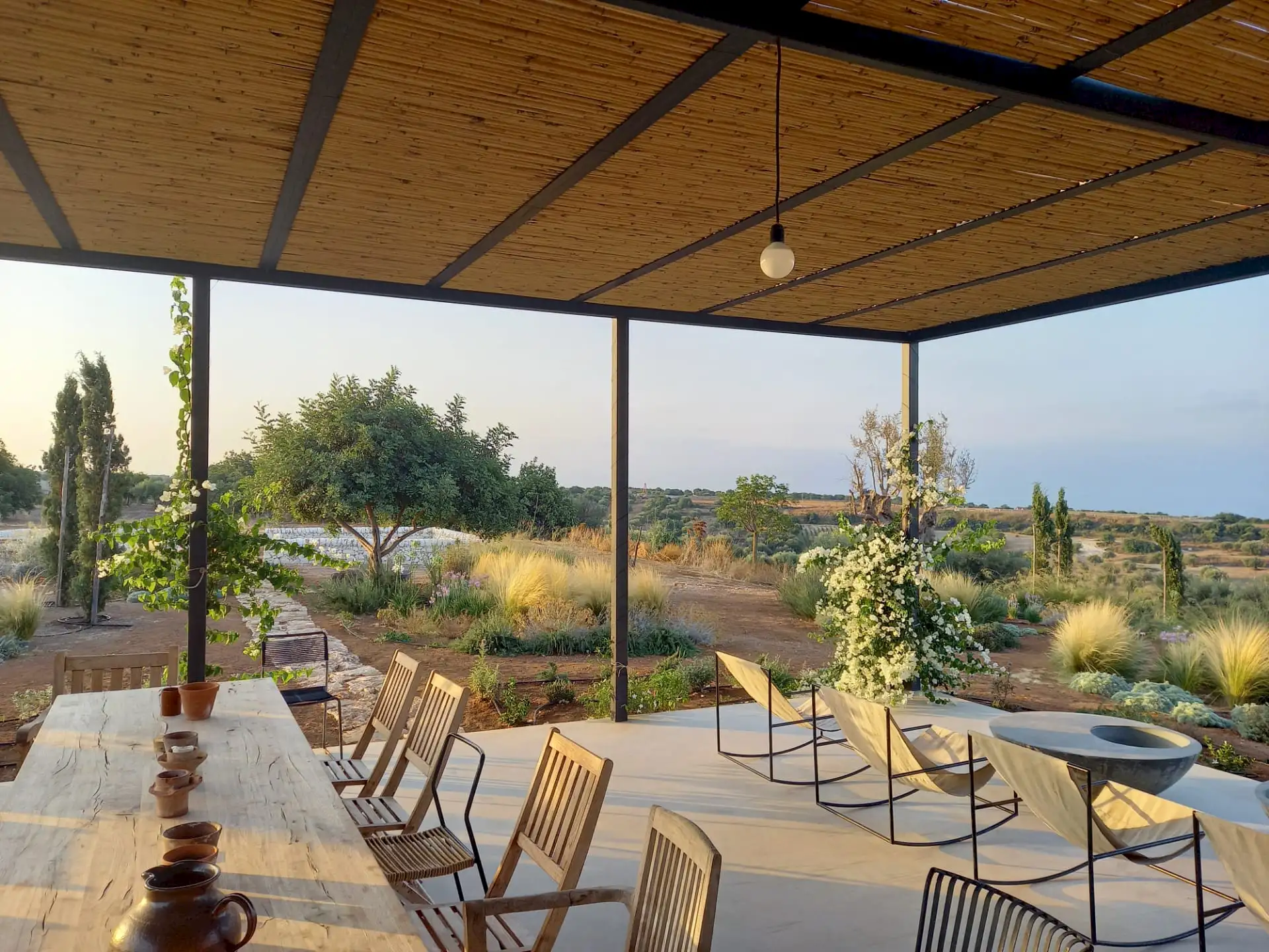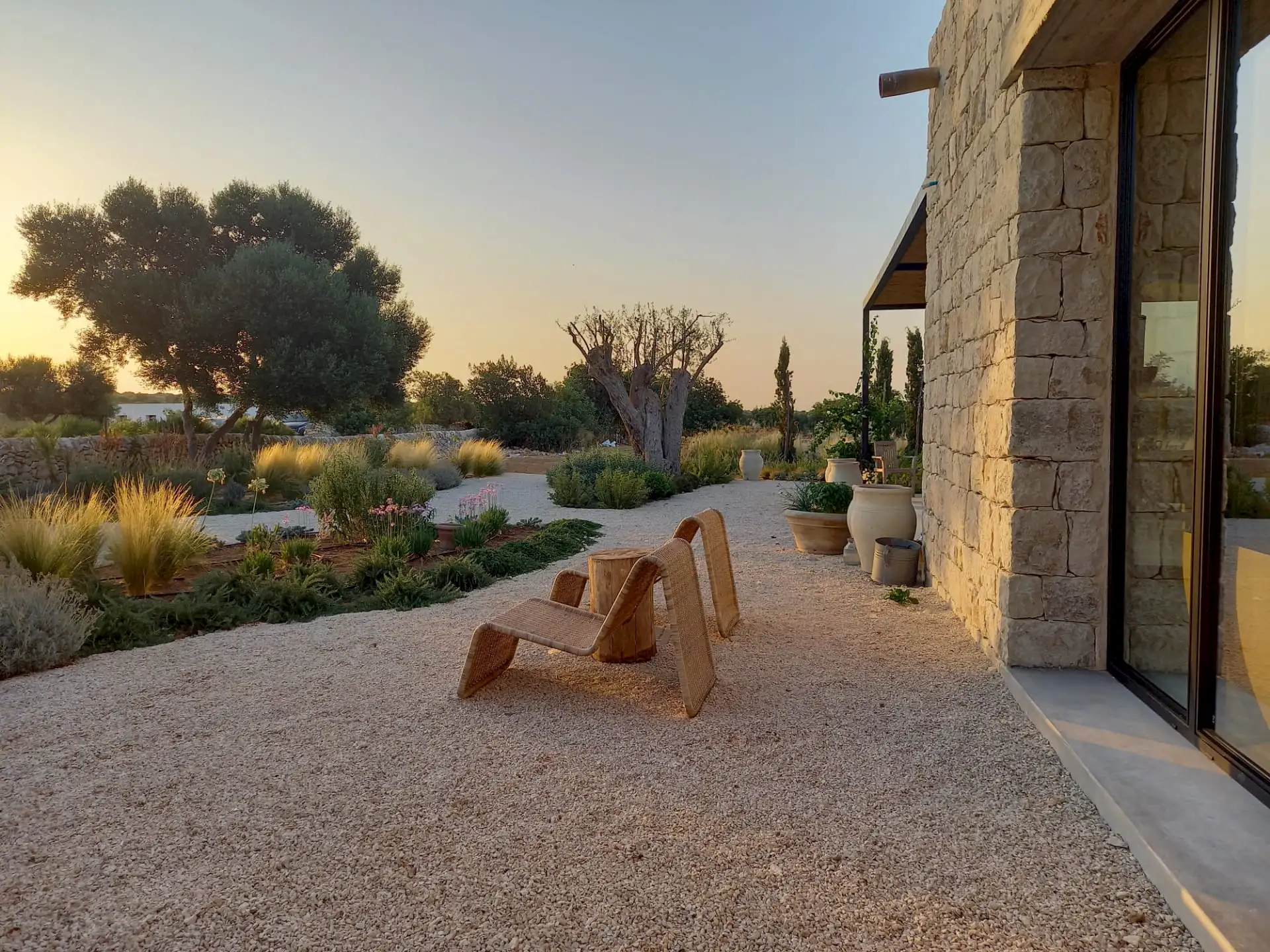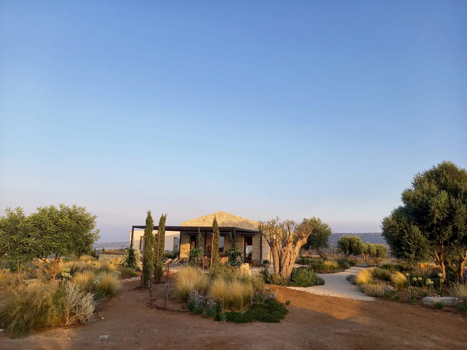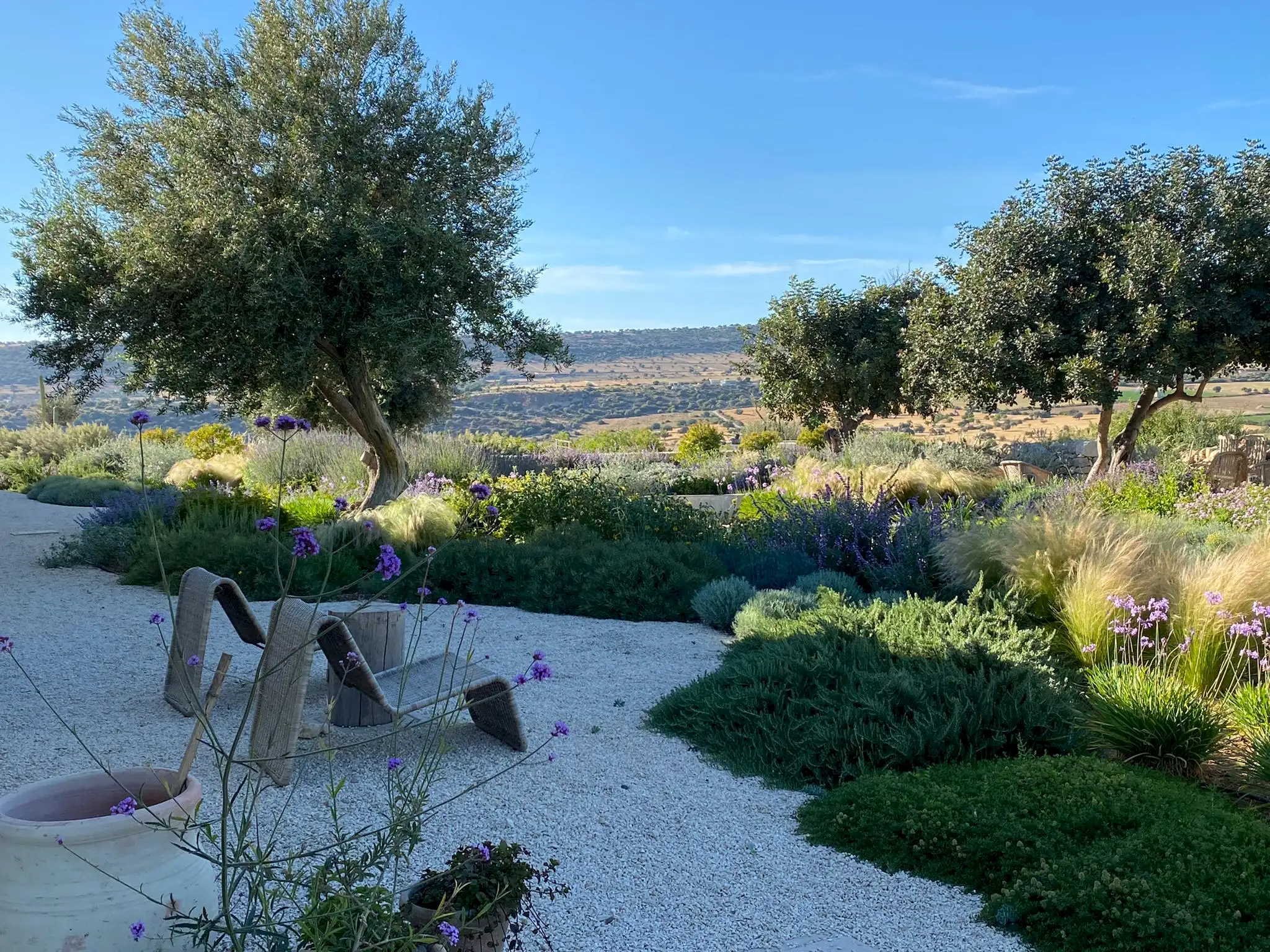 The design has been as carefully balanced inside as out, and the six en-suite doubles are individually decorated with original art, lighting and furniture, both modern and antique, much of it championing local makers. Smooth floors, a well-equipped kitchen and a vast living room all have doors to outside that can be kept open to create a breeze, even in the heat of summer.