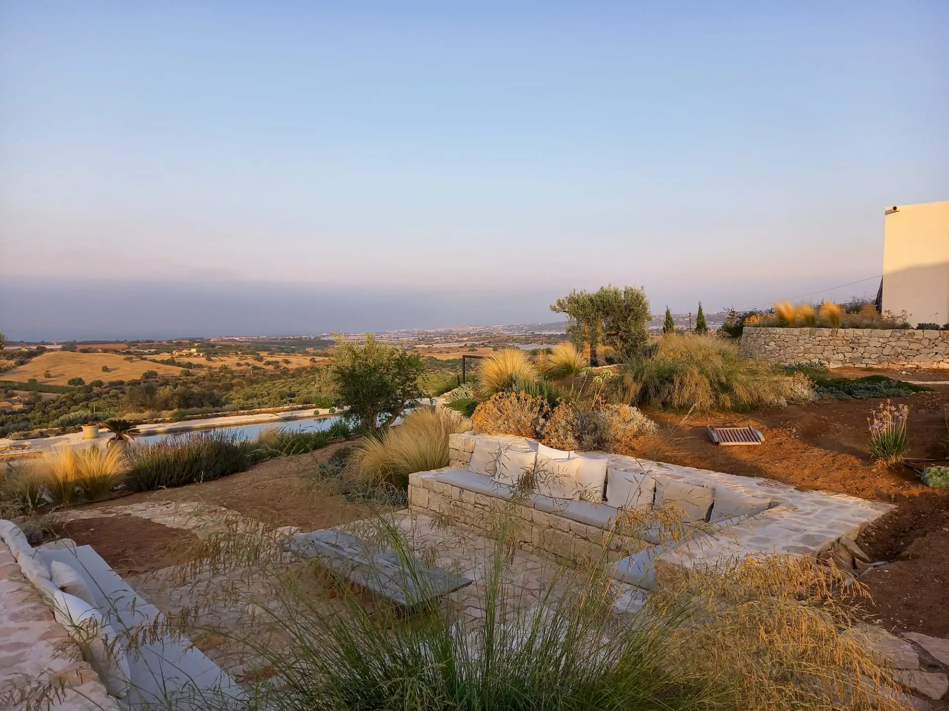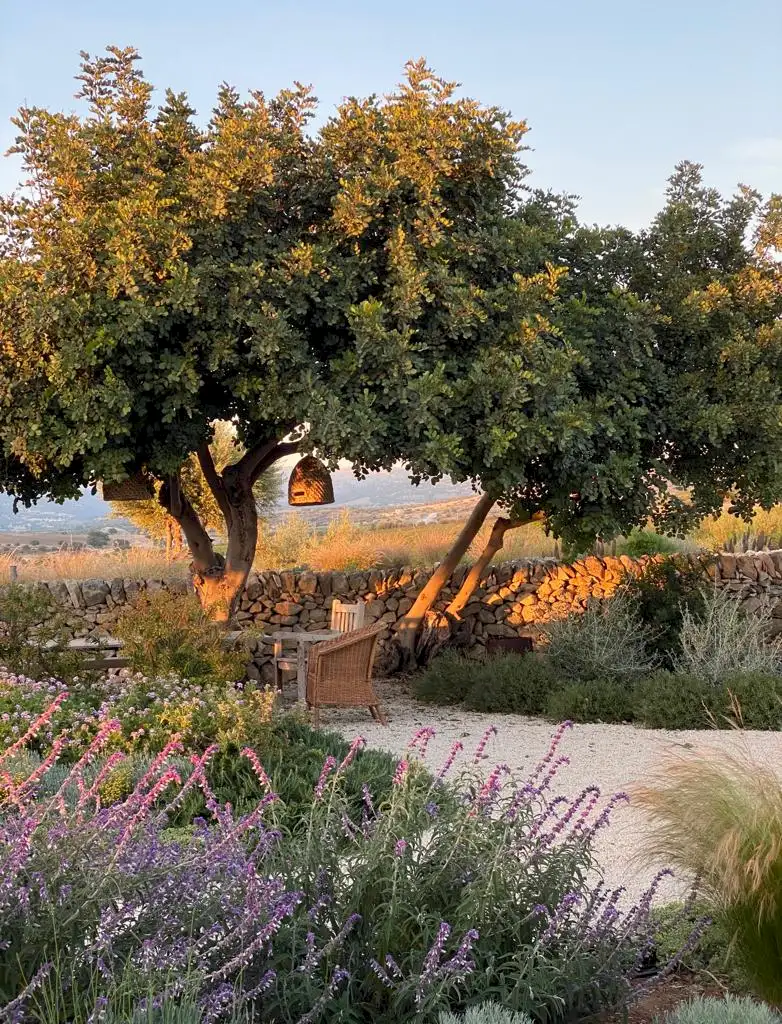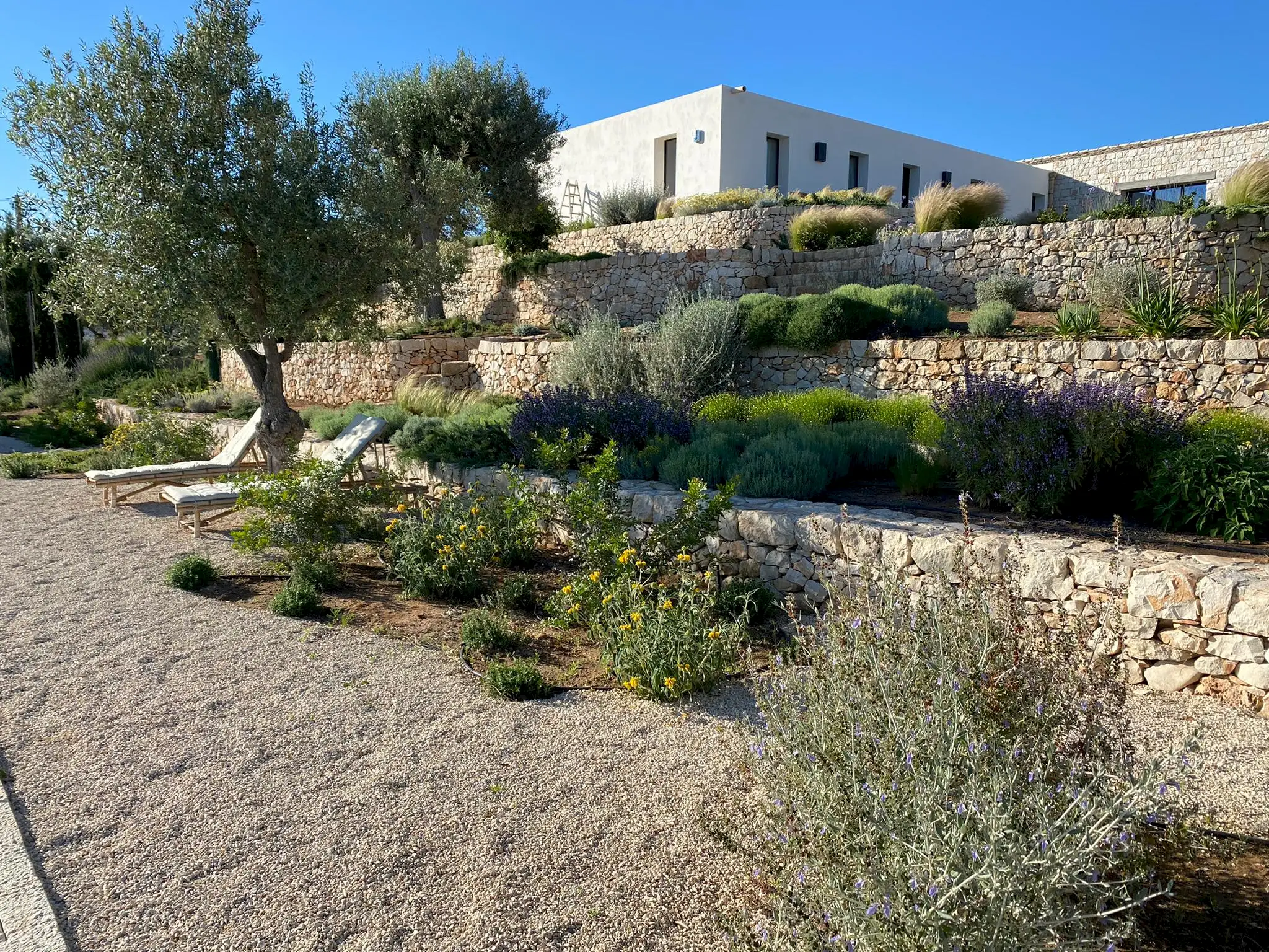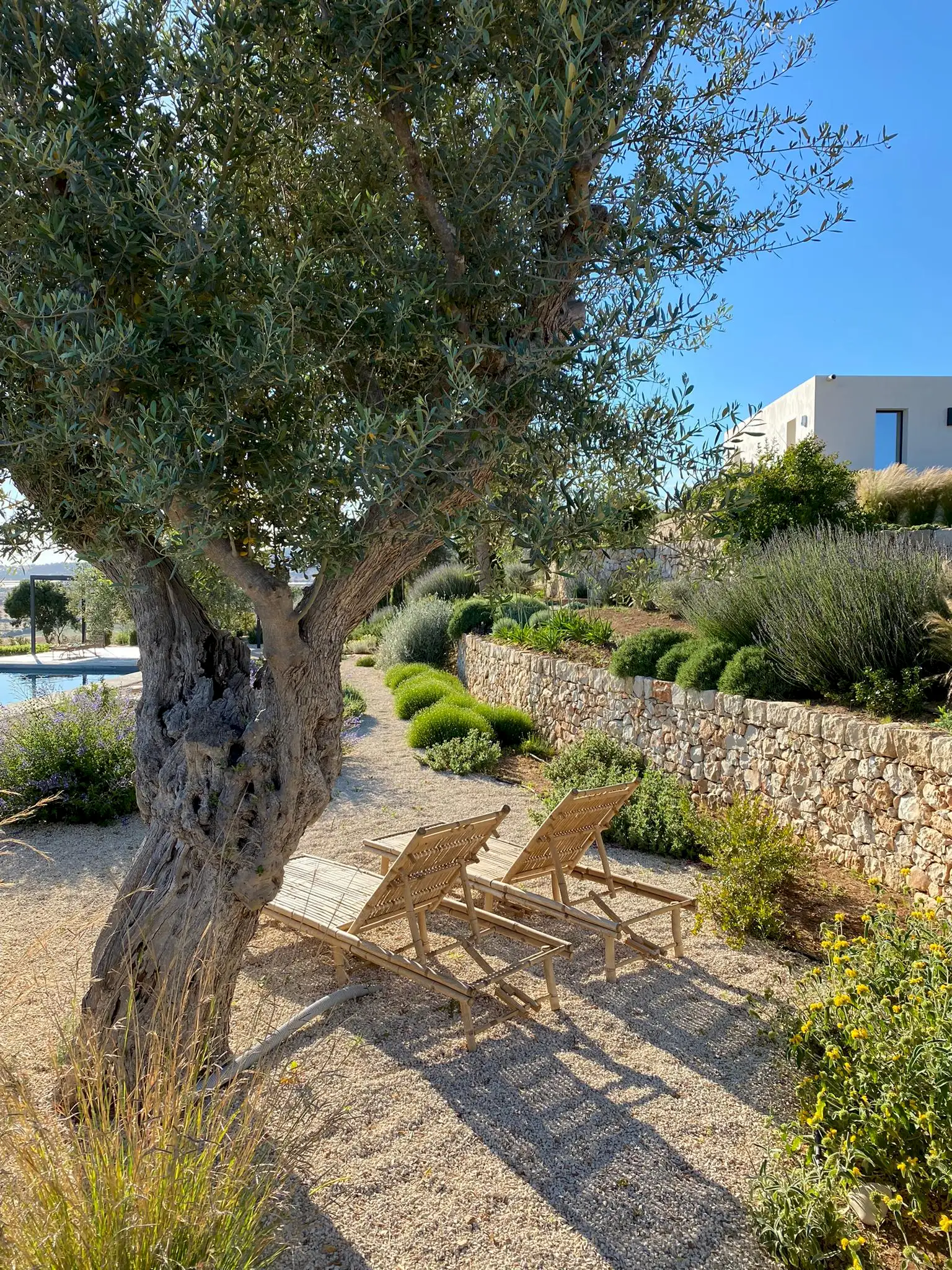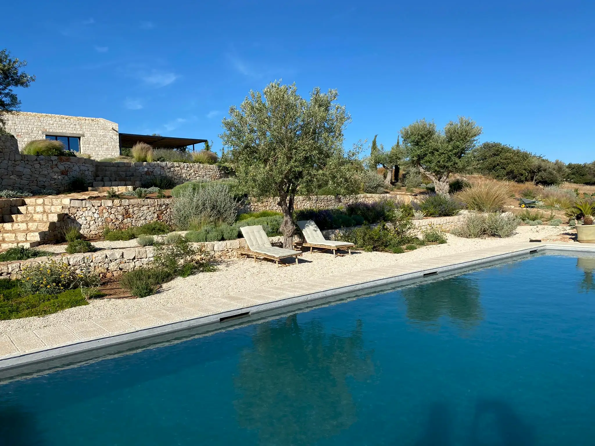 Set on a 50-hectare private estate in the island’s south-eastern corner, the modernist villa is surrounded by olive and almond groves, a fruit orchard and a vegetable patch. The carefully landscaped garden cascades down a series of dry-stone wall terraces to the large pool.