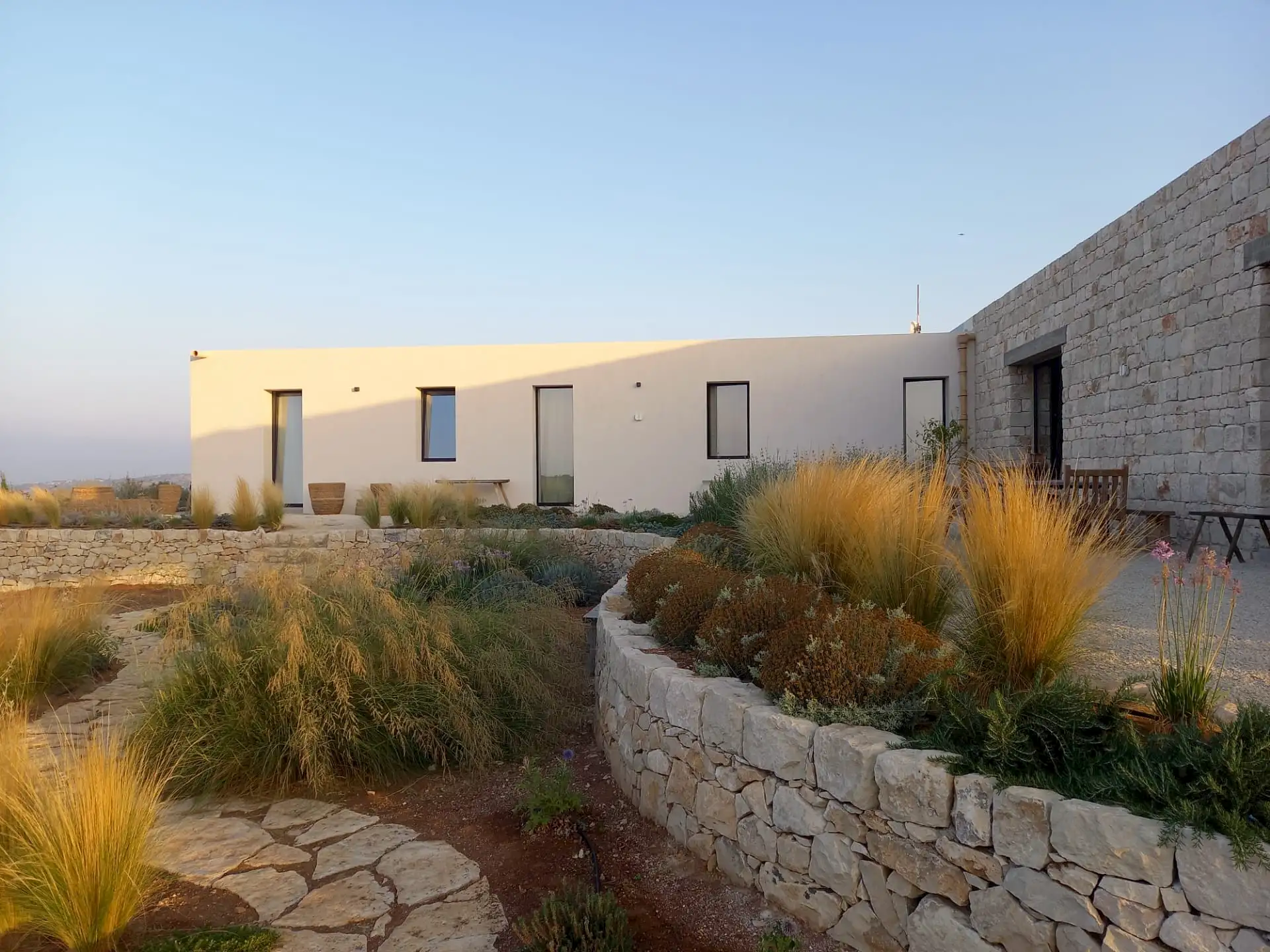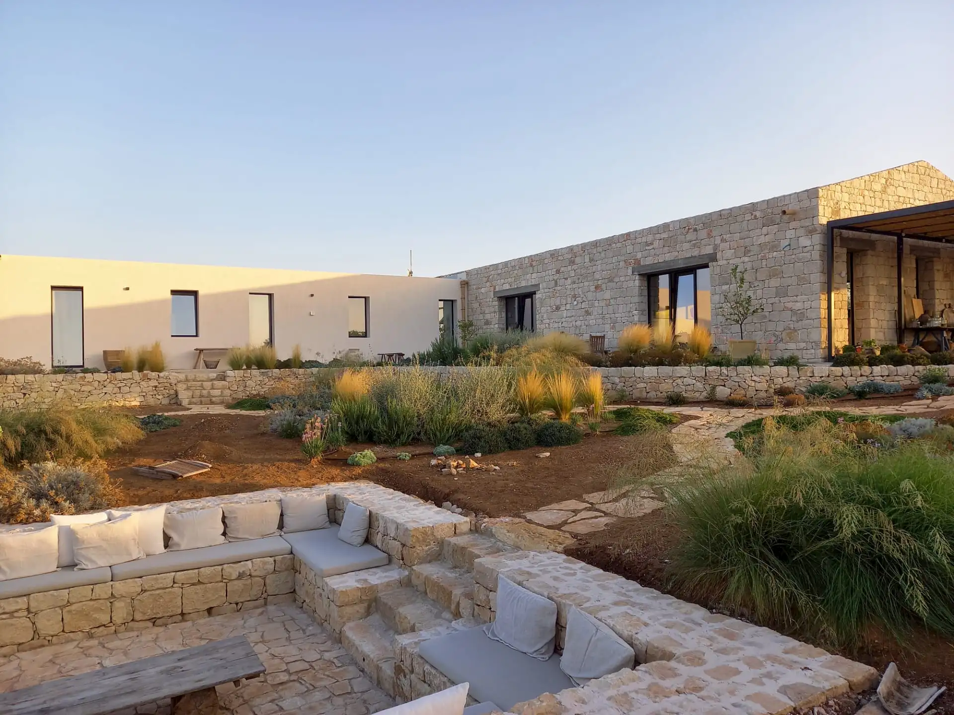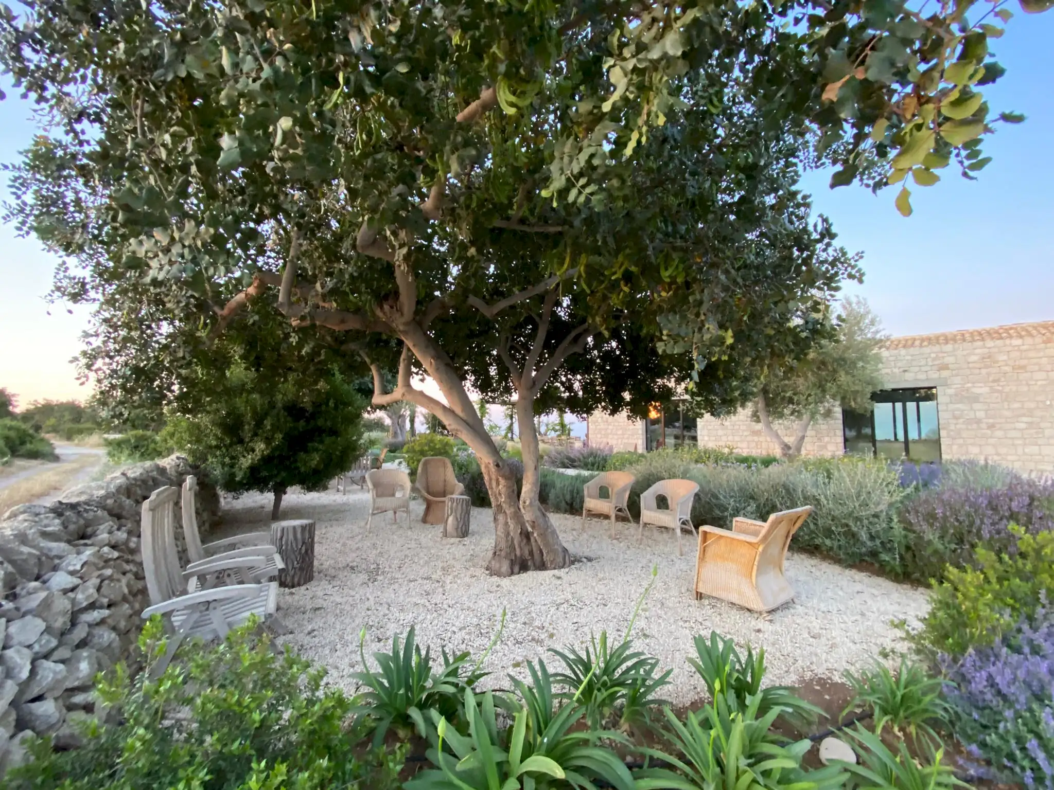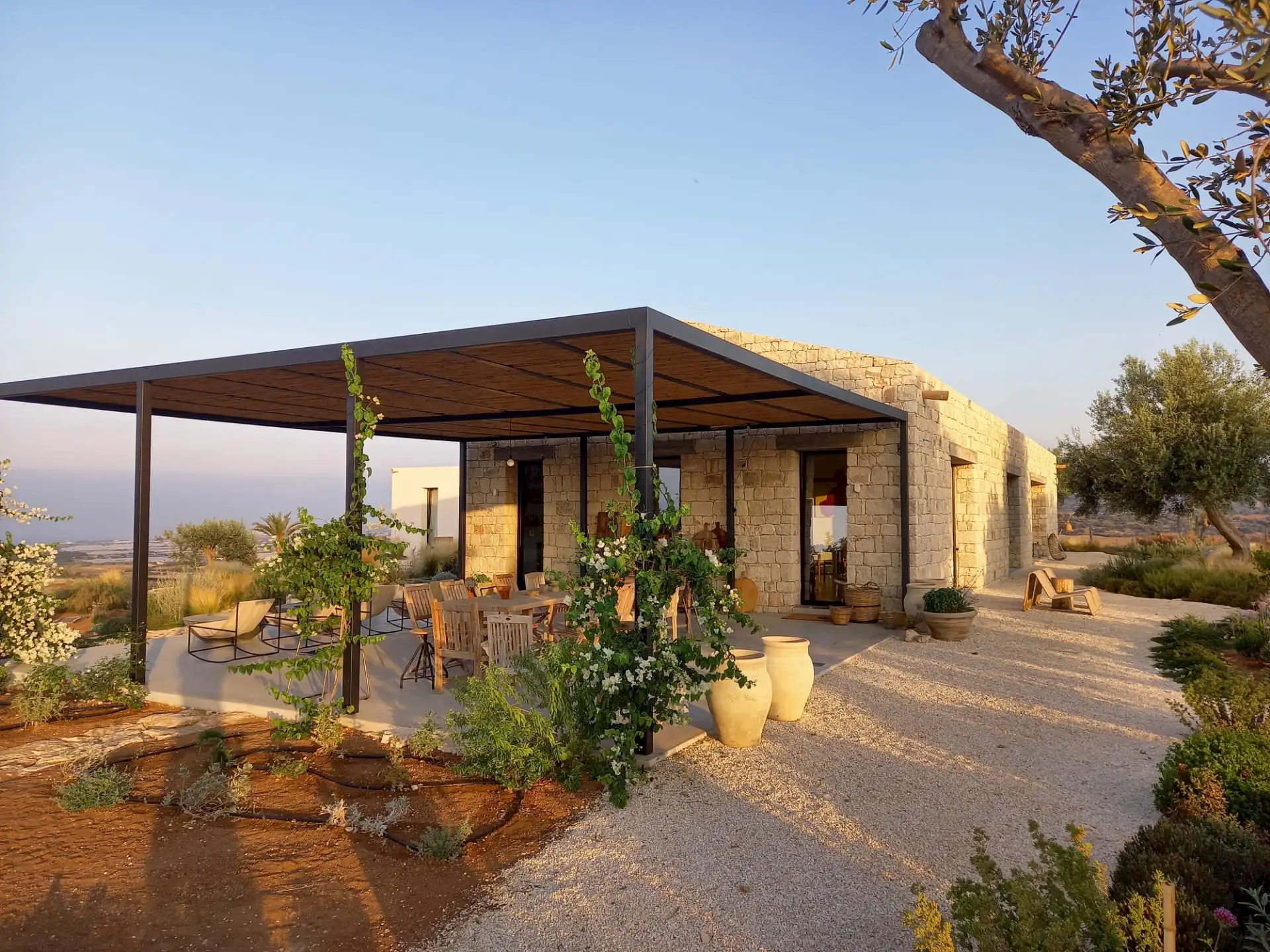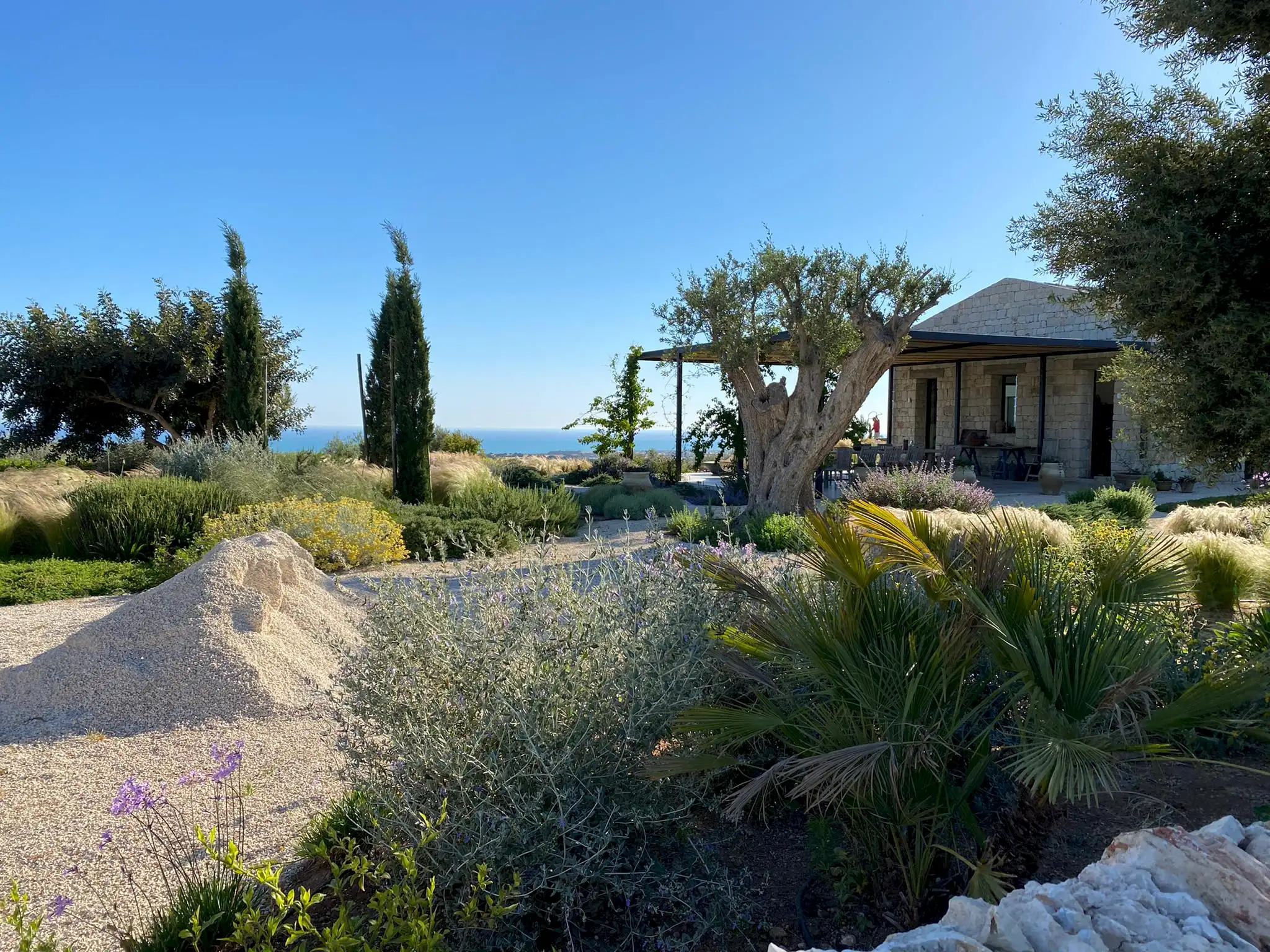 Set on a 50-hectare private estate in the island’s south-eastern corner, the modernist villa is surrounded by olive and almond groves, a fruit orchard and a vegetable patch. The carefully landscaped garden cascades down a series of dry-stone wall terraces to the large pool.