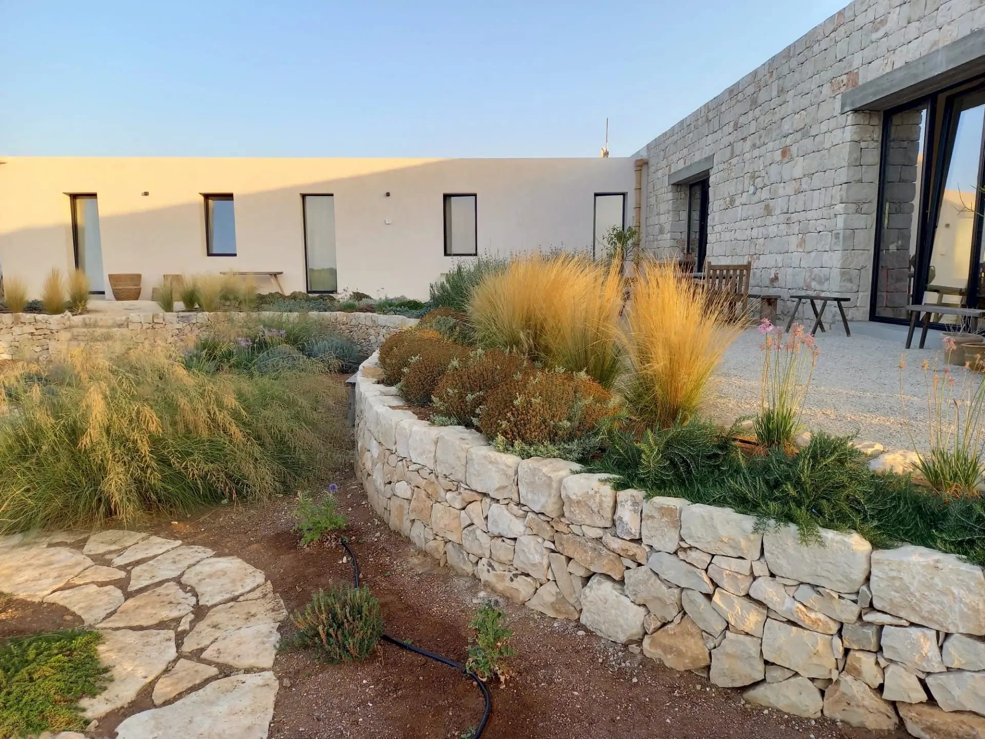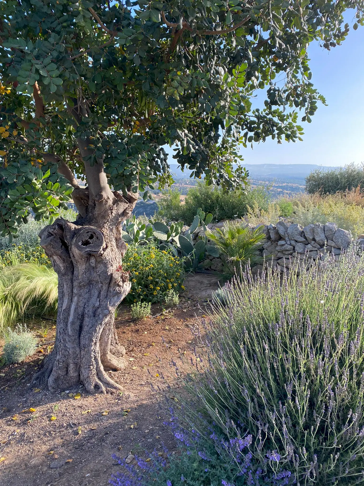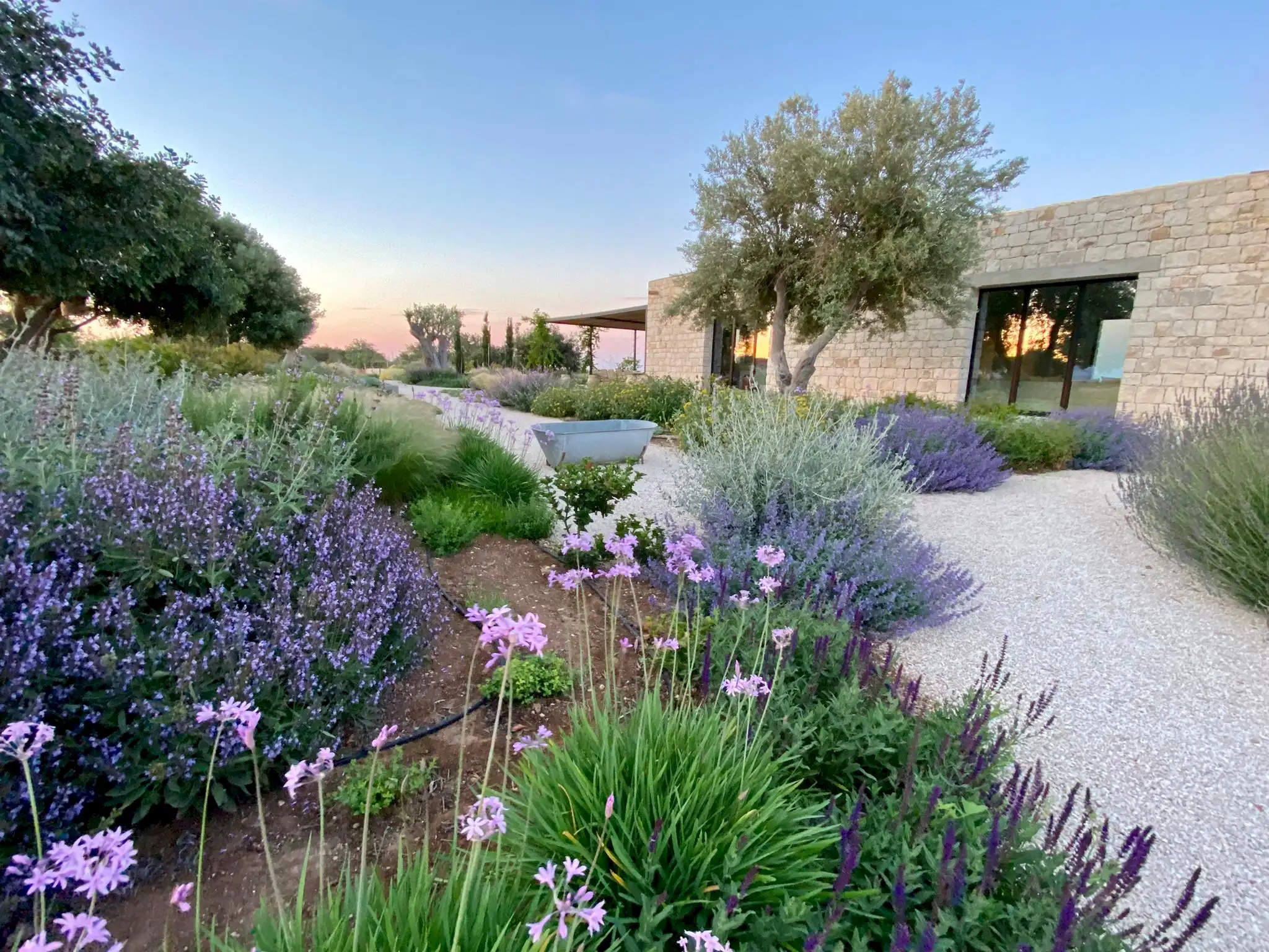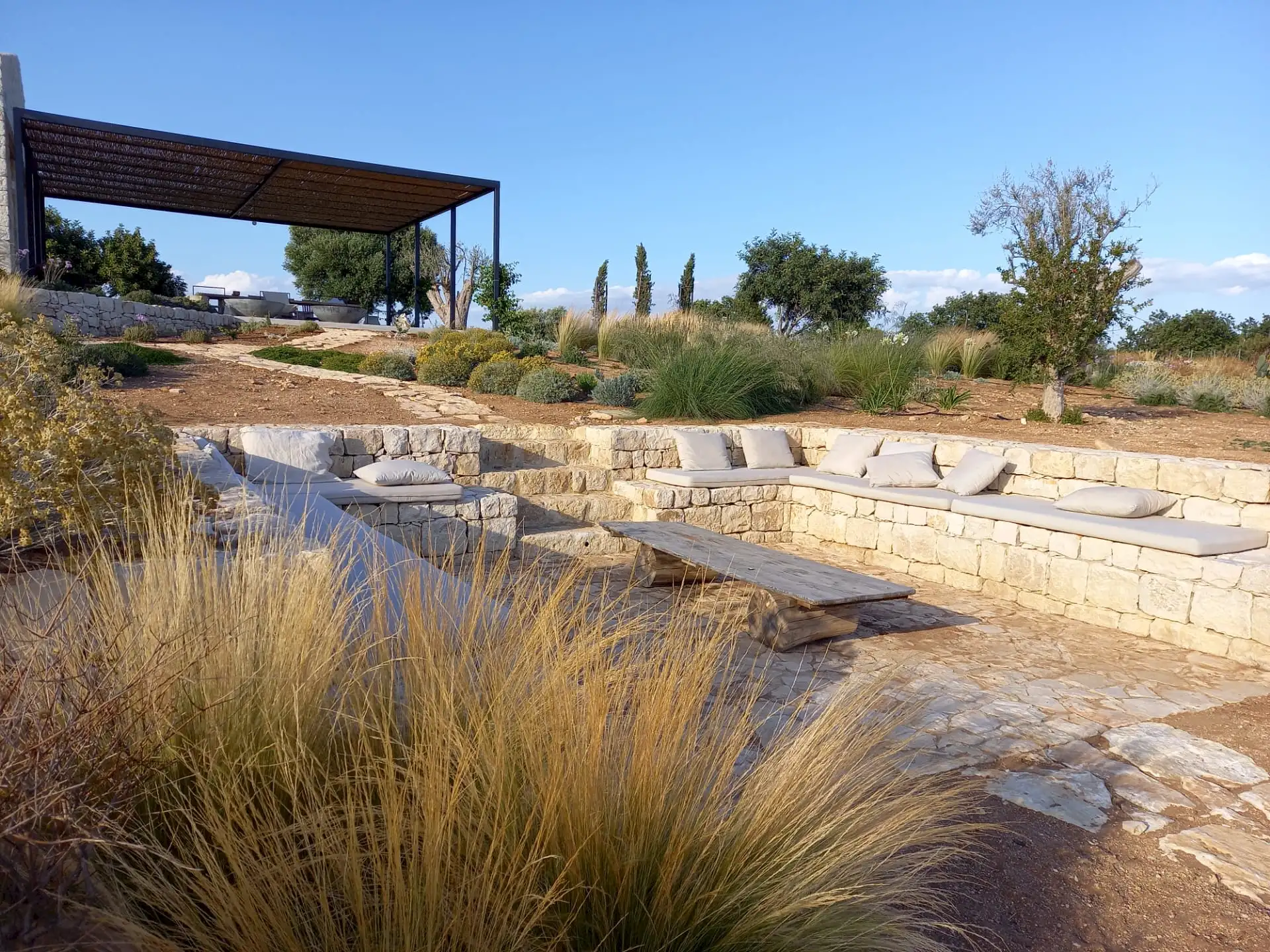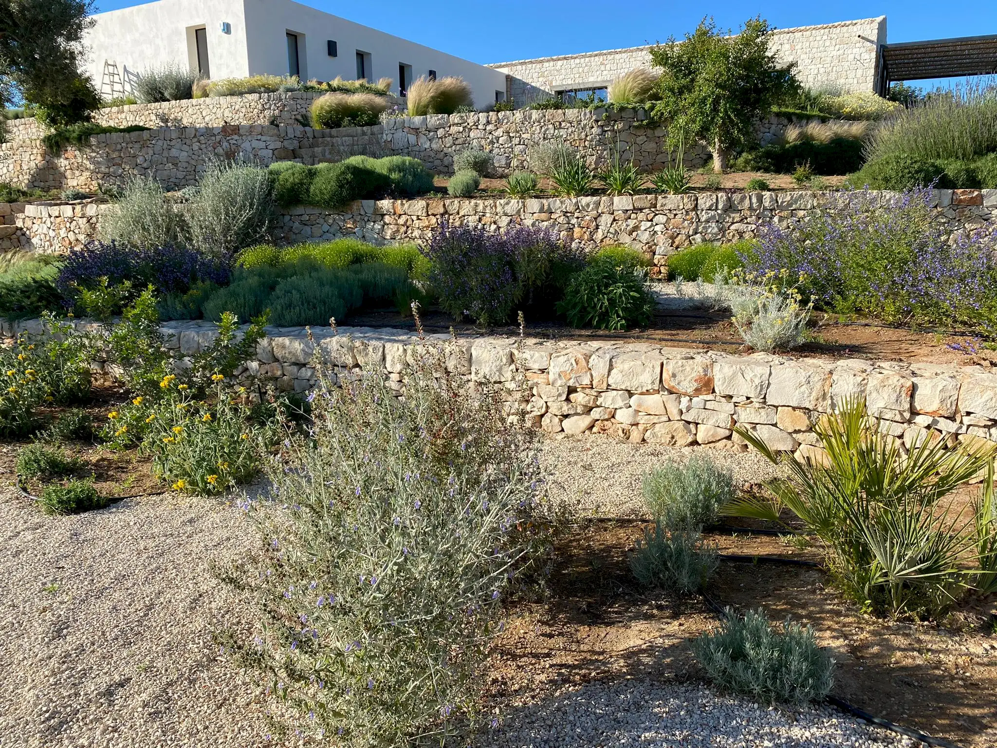 Set on a 50-hectare private estate in the island’s south-eastern corner, the modernist villa is surrounded by olive and almond groves, a fruit orchard and a vegetable patch. The carefully landscaped garden cascades down a series of dry-stone wall terraces to the large pool.