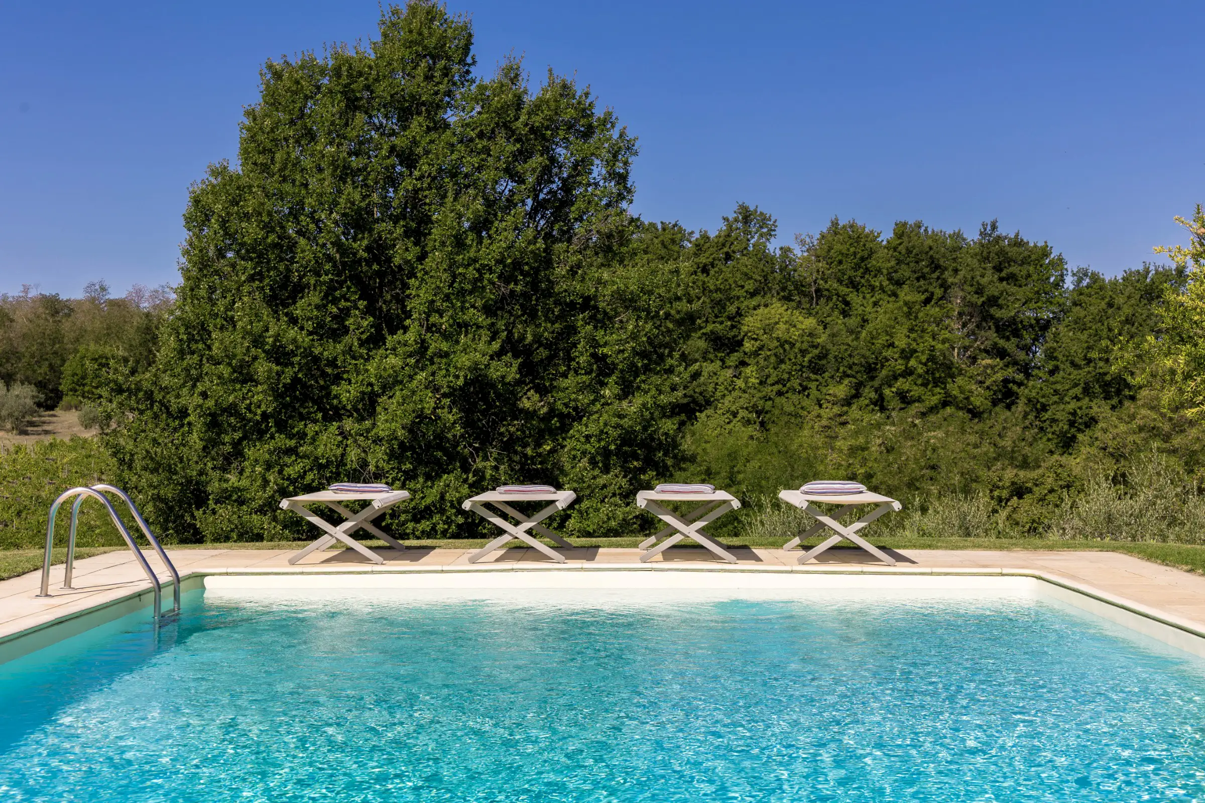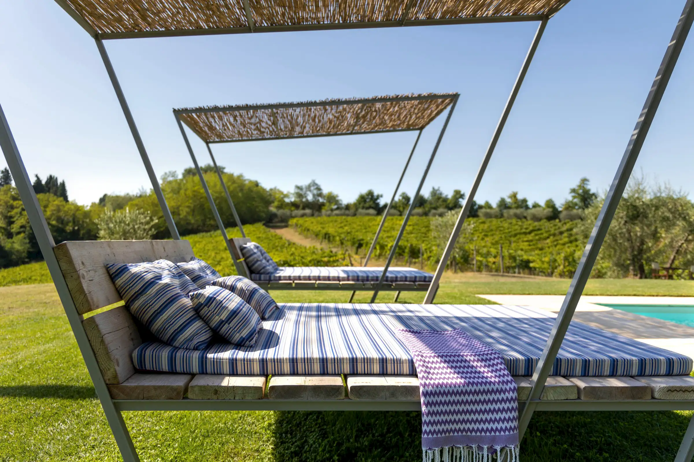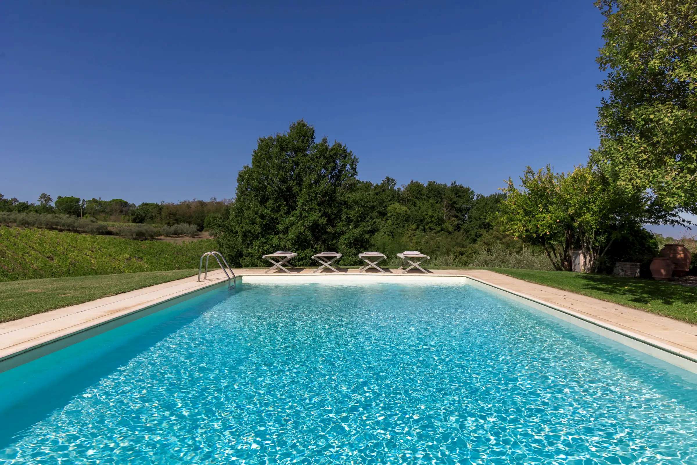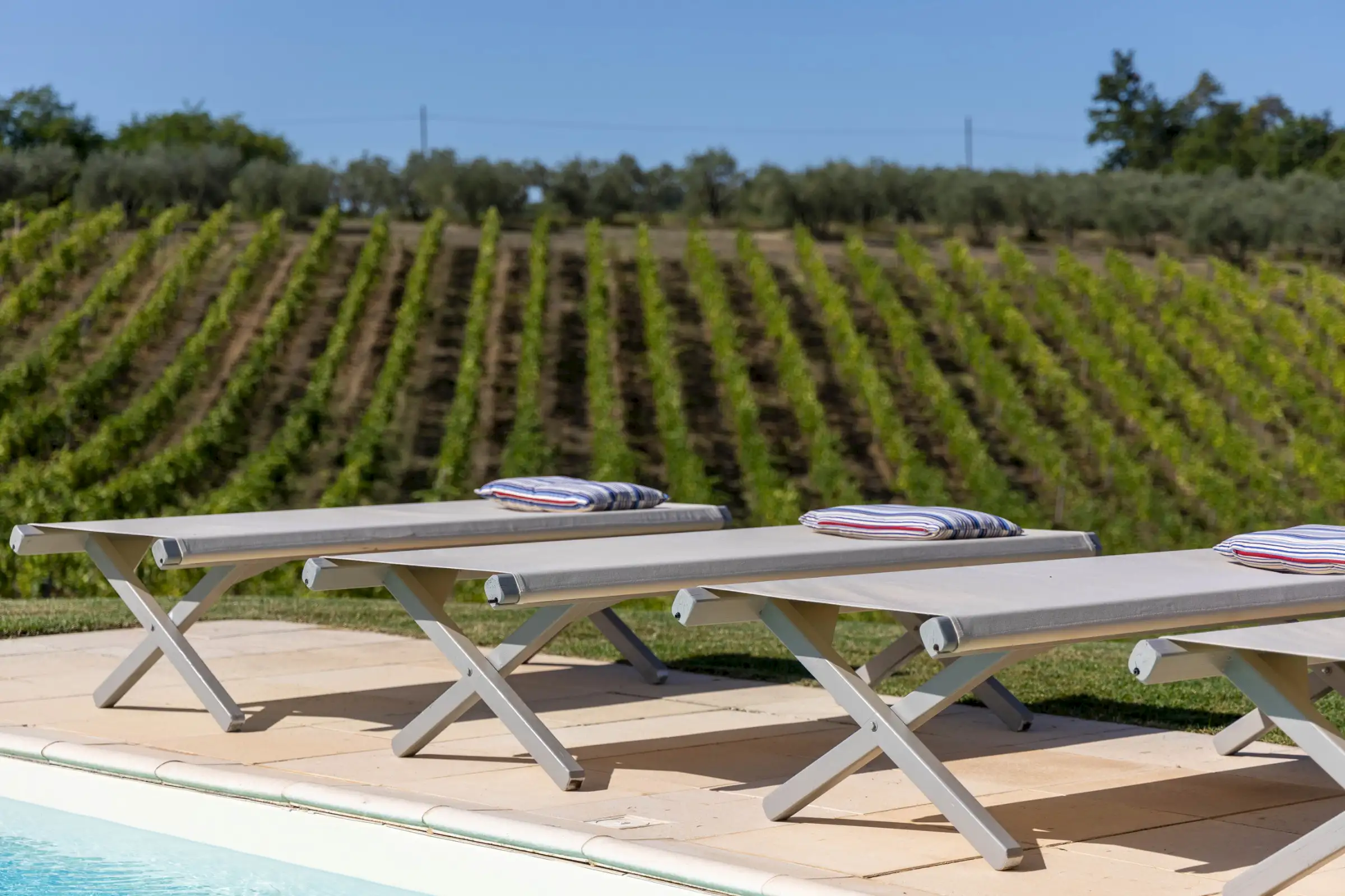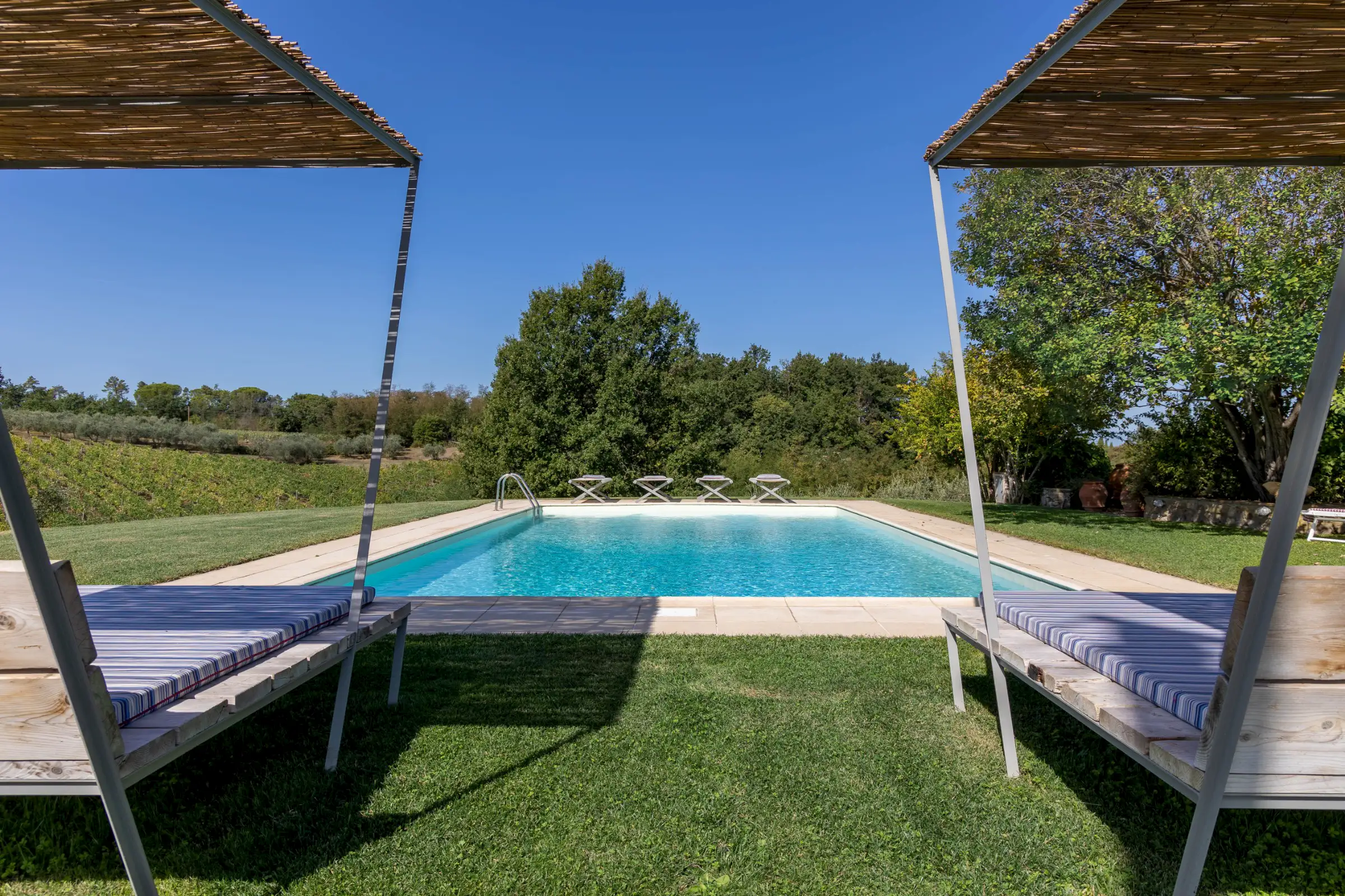 The main villa for 6 guest is divided over two floors. The ground floor has a well-equipped white modern kitchen with Gaggenau appliances, a dining room, a sitting room with comfortable sofas and armchairs, bookshelves on the wall, an old fireplace and ambient lighting. On the second floor, there are three bedrooms and two bathrooms. Outside under the pergola a large wooden table is the perfect spot for a large family lunch or dinner or to sit down with your morning coffee. Relax in the attractive lounge area or settle down in the sun loungers near the private pool, surrounded by green lawns and incredible views over the neighboring vineyards and Tuscan hills.