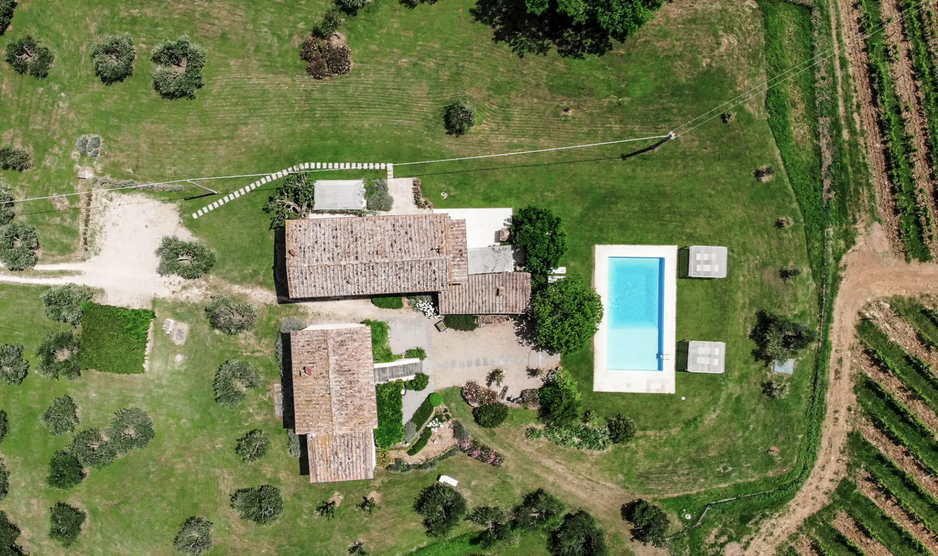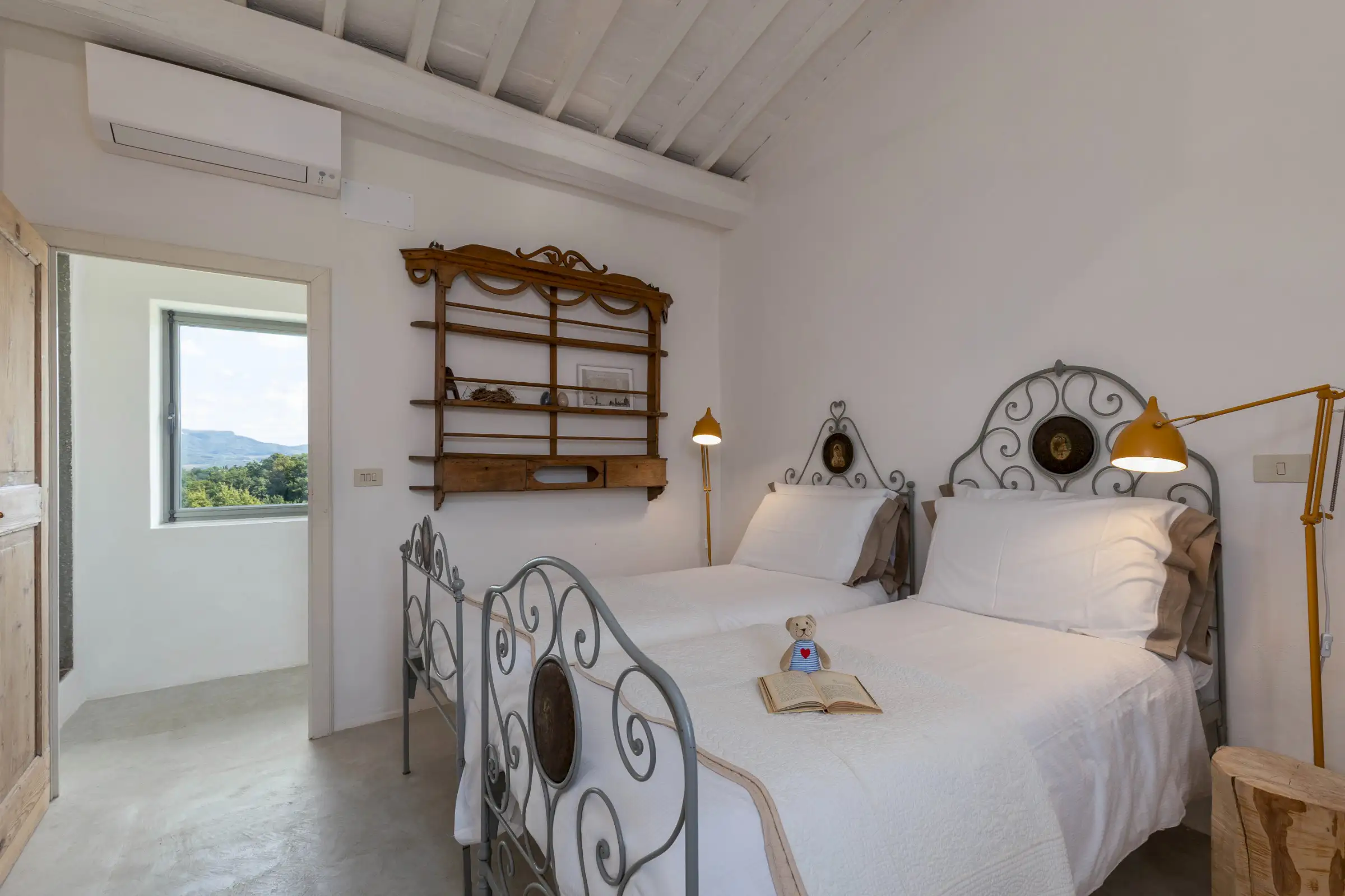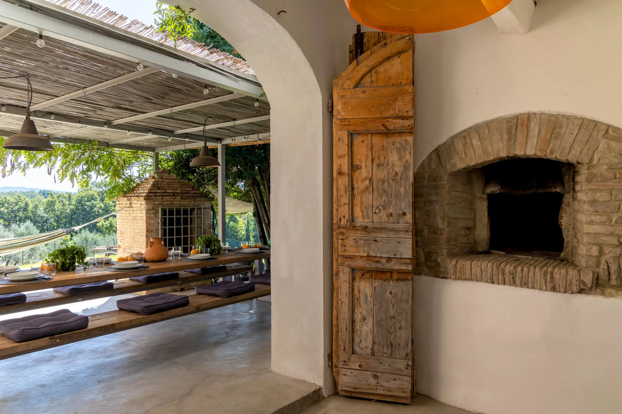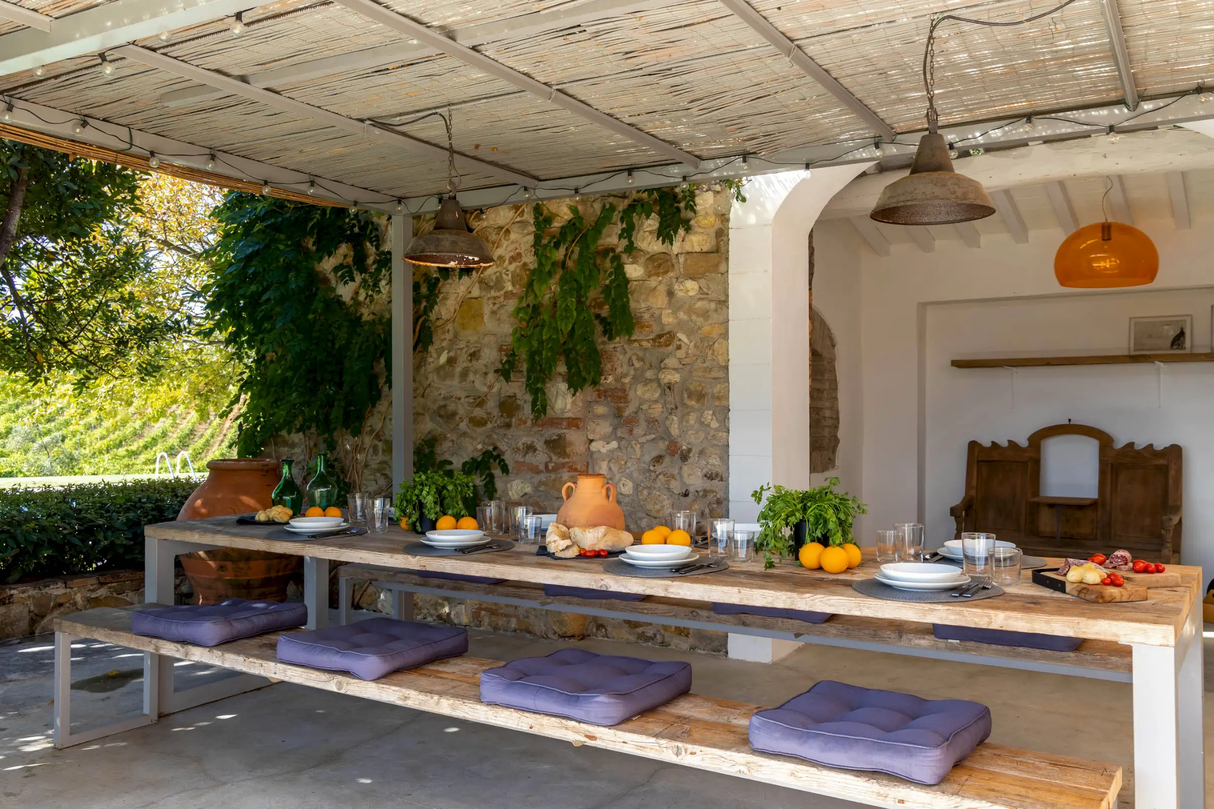 The main villa for 6 guest is divided over two floors. The ground floor has a well-equipped white modern kitchen with Gaggenau appliances, a dining room, a sitting room with comfortable sofas and armchairs, bookshelves on the wall, an old fireplace and ambient lighting. On the second floor, there are three bedrooms and two bathrooms. Outside under the pergola a large wooden table is the perfect spot for a large family lunch or dinner or to sit down with your morning coffee. Relax in the attractive lounge area or settle down in the sun loungers near the private pool, surrounded by green lawns and incredible views over the neighboring vineyards and Tuscan hills.