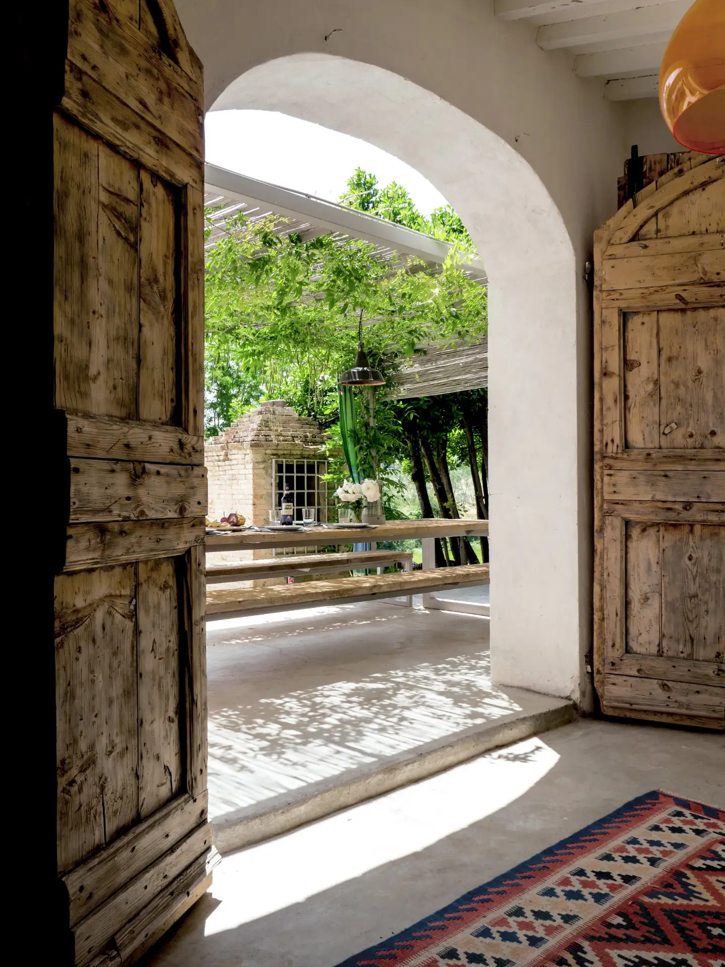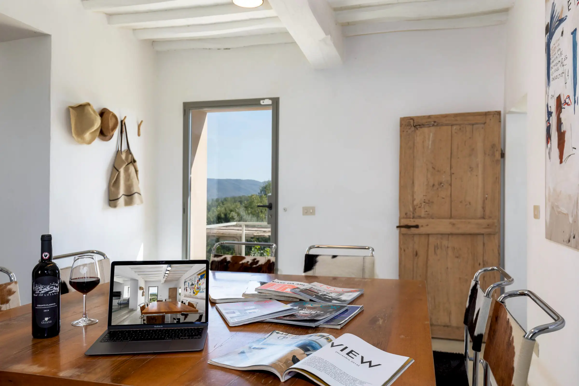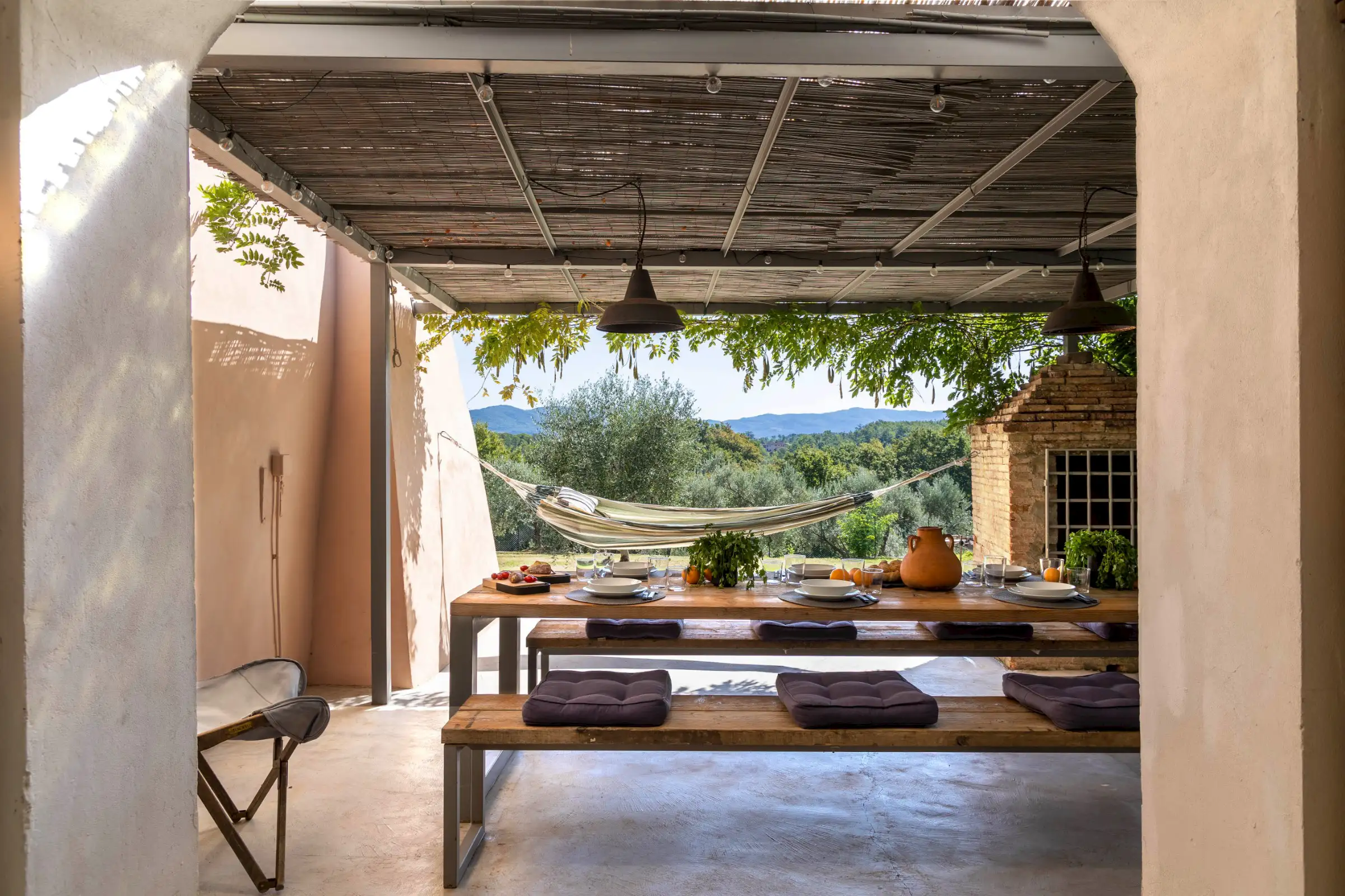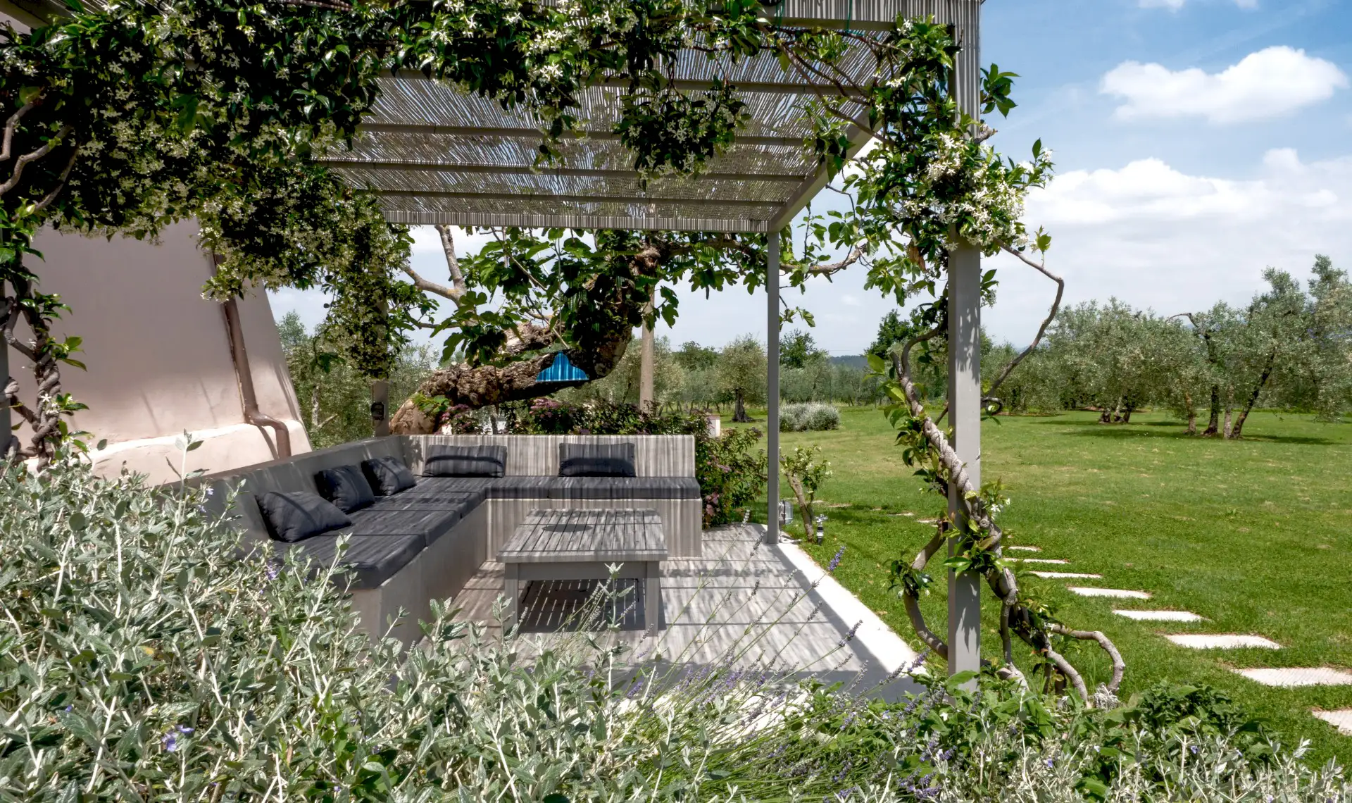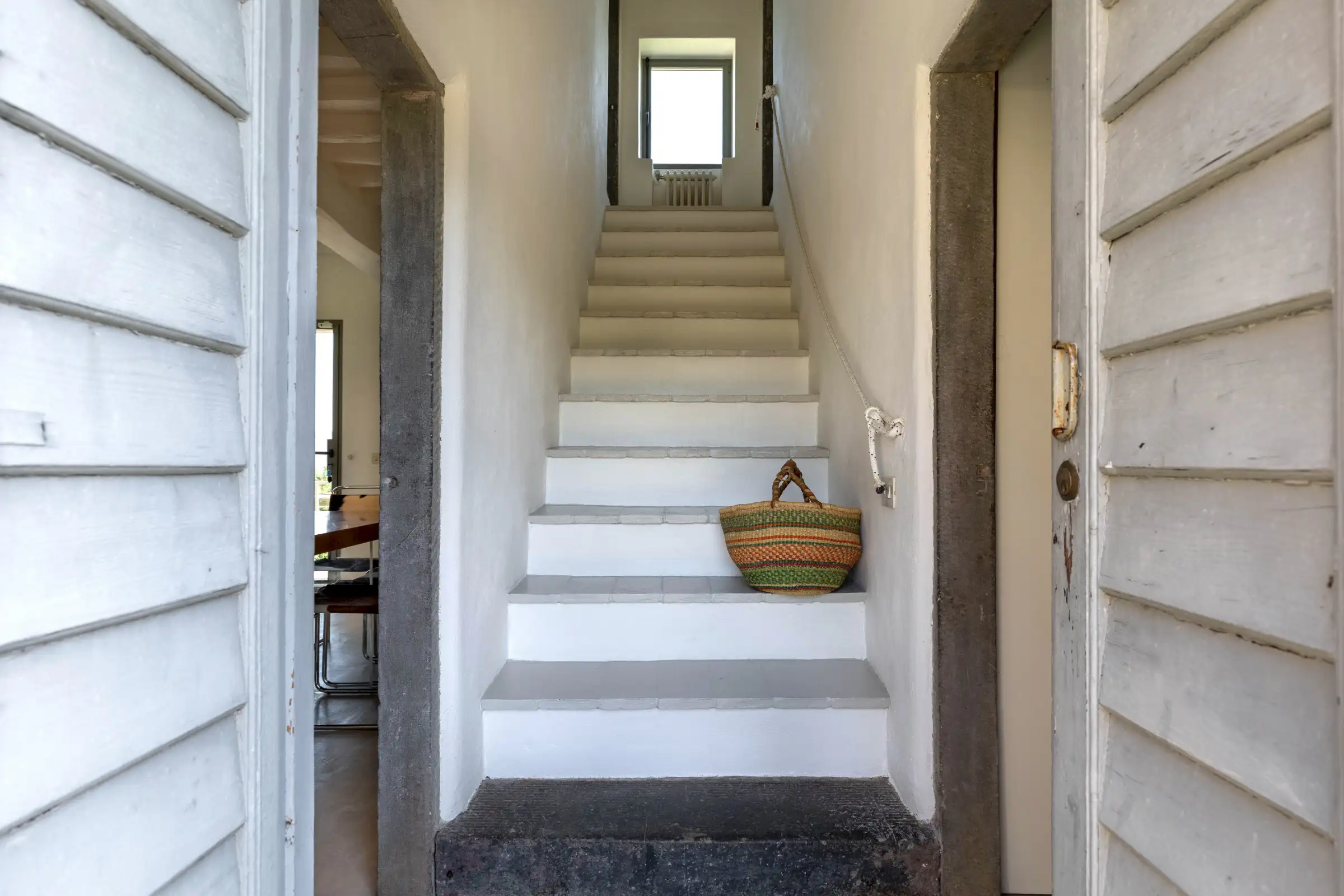 The main villa for 6 guest is divided over two floors. The ground floor has a well-equipped white modern kitchen with Gaggenau appliances, a dining room, a sitting room with comfortable sofas and armchairs, bookshelves on the wall, an old fireplace and ambient lighting. On the second floor, there are three bedrooms and two bathrooms. Outside under the pergola a large wooden table is the perfect spot for a large family lunch or dinner or to sit down with your morning coffee. Relax in the attractive lounge area or settle down in the sun loungers near the private pool, surrounded by green lawns and incredible views over the neighboring vineyards and Tuscan hills.