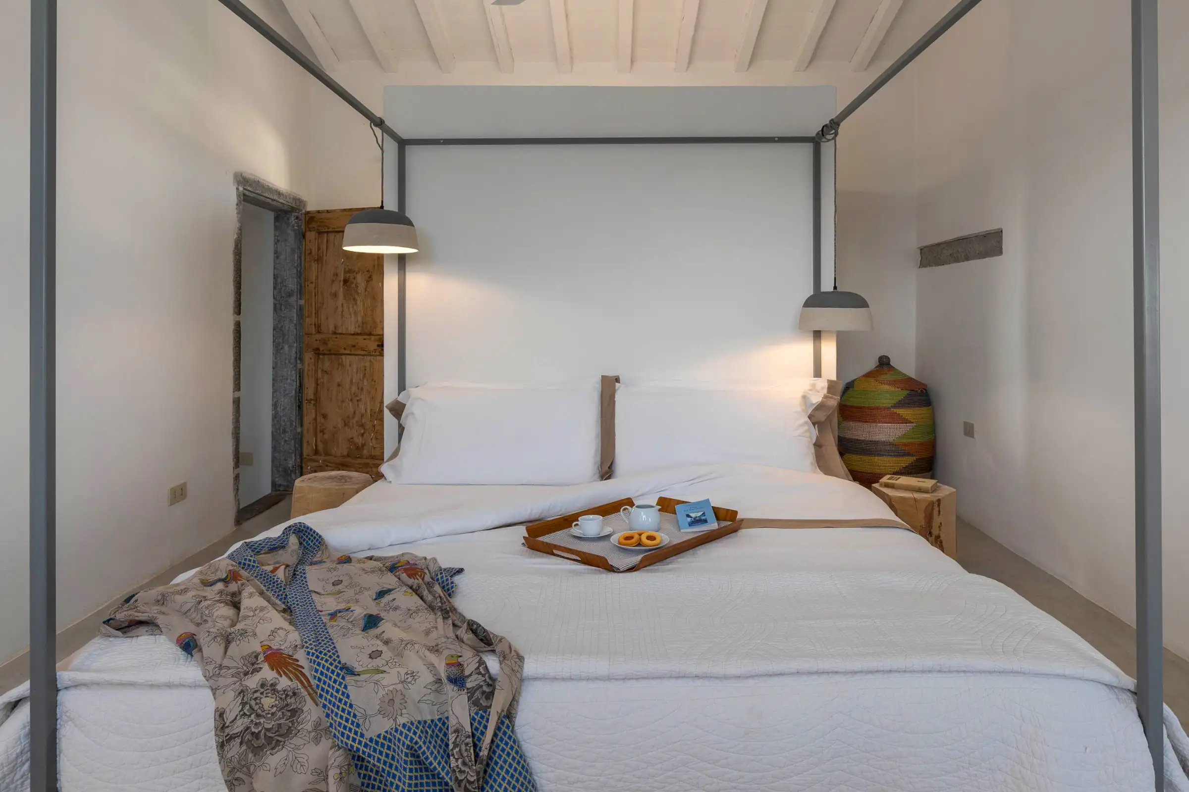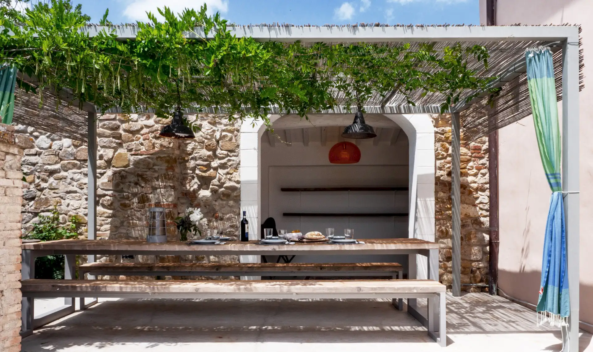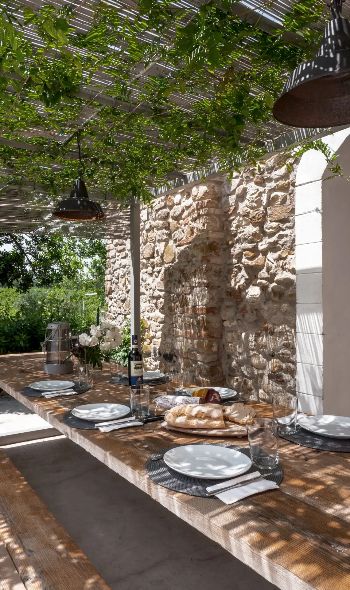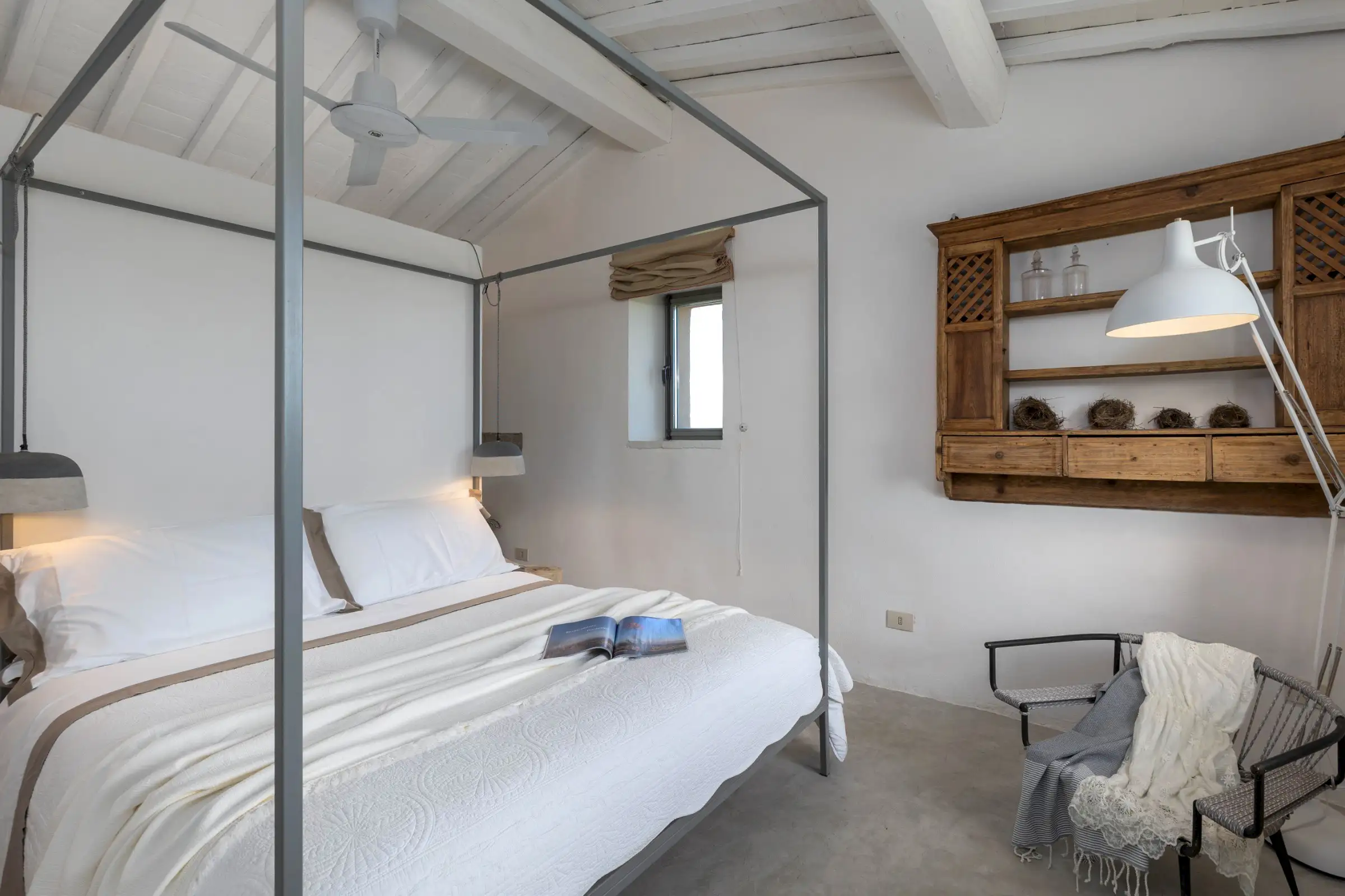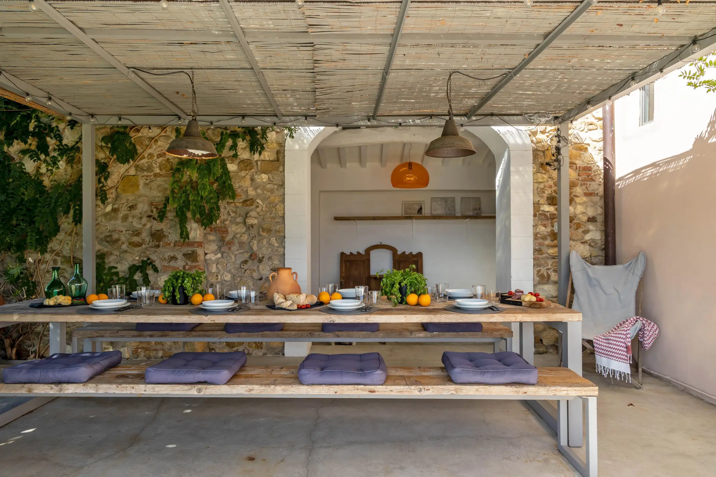 The main villa for 6 guest is divided over two floors. The ground floor has a well-equipped white modern kitchen with Gaggenau appliances, a dining room, a sitting room with comfortable sofas and armchairs, bookshelves on the wall, an old fireplace and ambient lighting. On the second floor, there are three bedrooms and two bathrooms. Outside under the pergola a large wooden table is the perfect spot for a large family lunch or dinner or to sit down with your morning coffee. Relax in the attractive lounge area or settle down in the sun loungers near the private pool, surrounded by green lawns and incredible views over the neighboring vineyards and Tuscan hills.