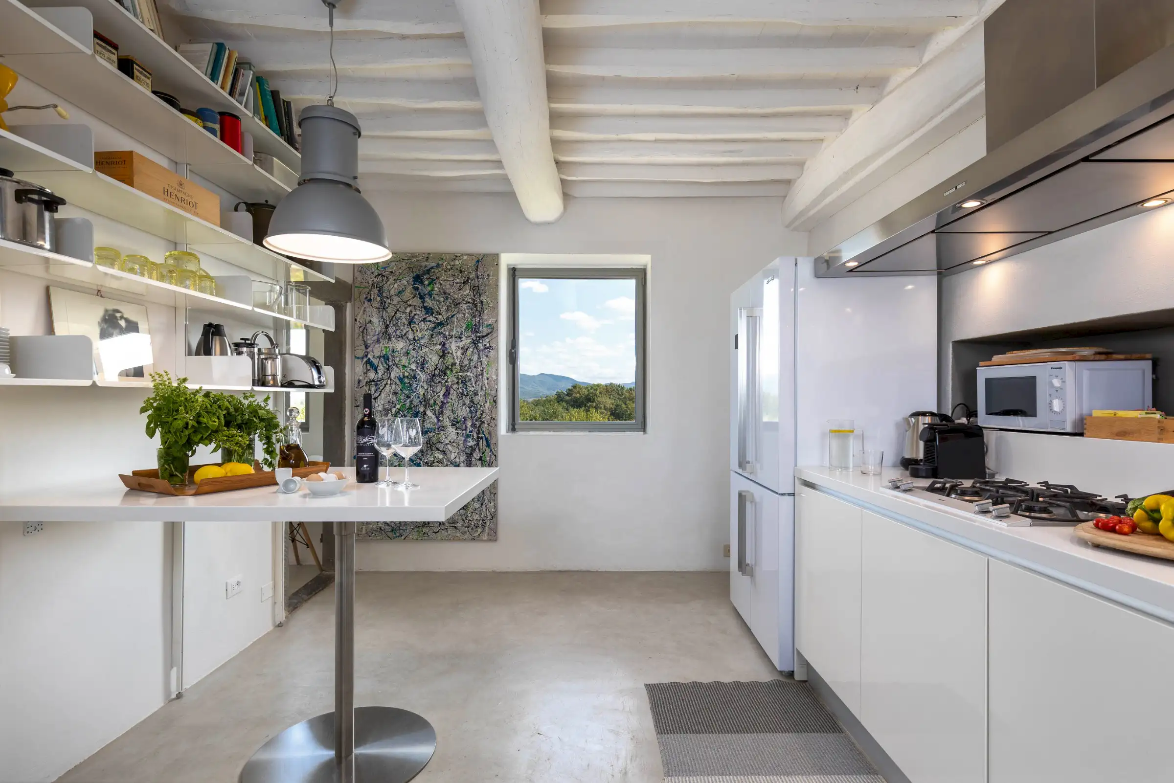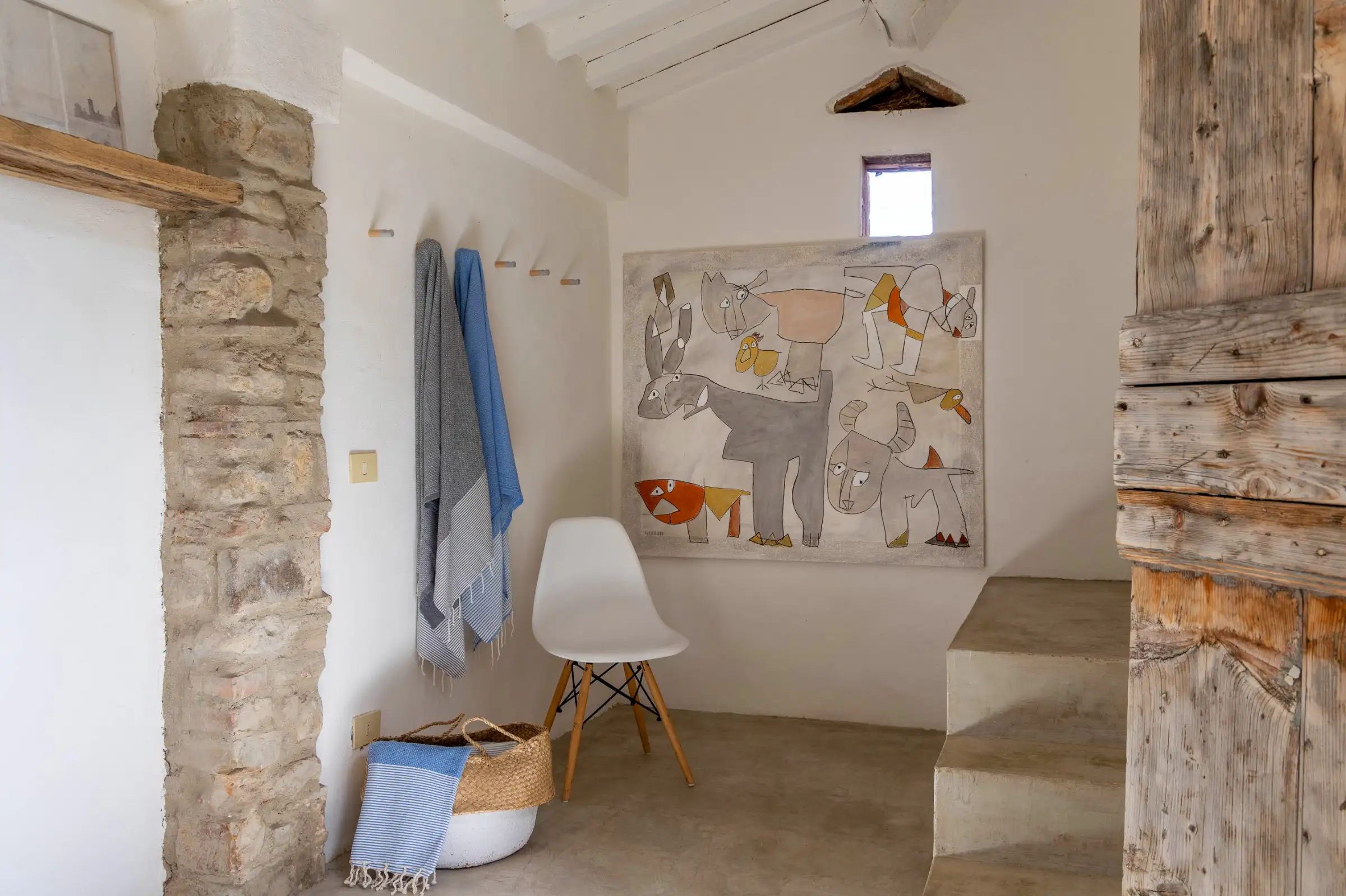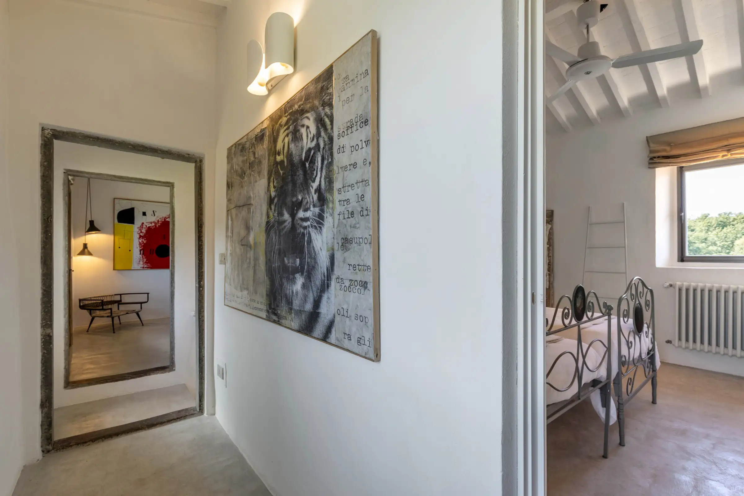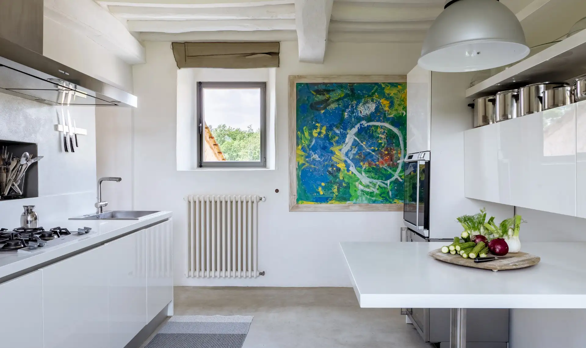 Chiantosa is finished with light gray concrete floors, old ceilings decorated with white washed ol wooden beams, and restored original doors. The large iron windows make the house bright and friendly and offer a stunning view over the countryside. A warm, bright, modern and comfortable atmosphere is what this villa offers their guests. Everywhere in the house striking pieces of art are filling the walls, made by the mother of the owner, a well known artist.