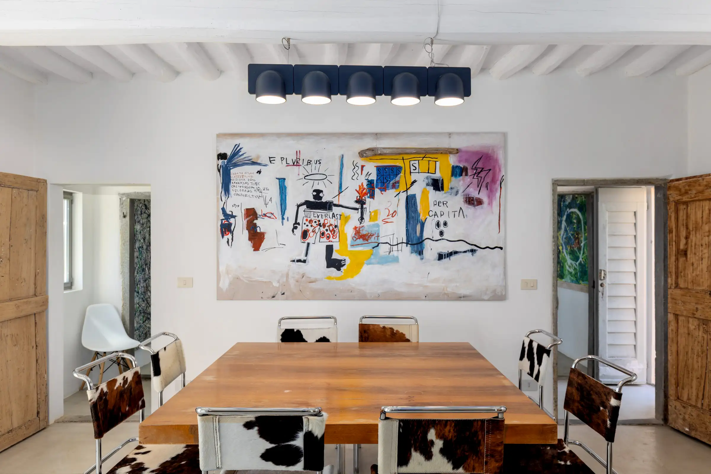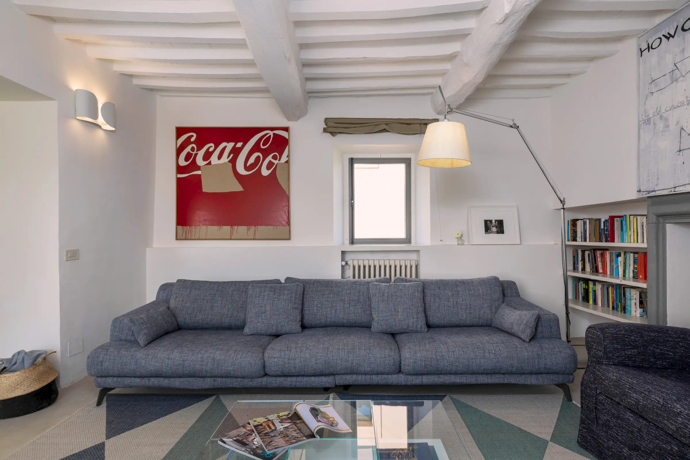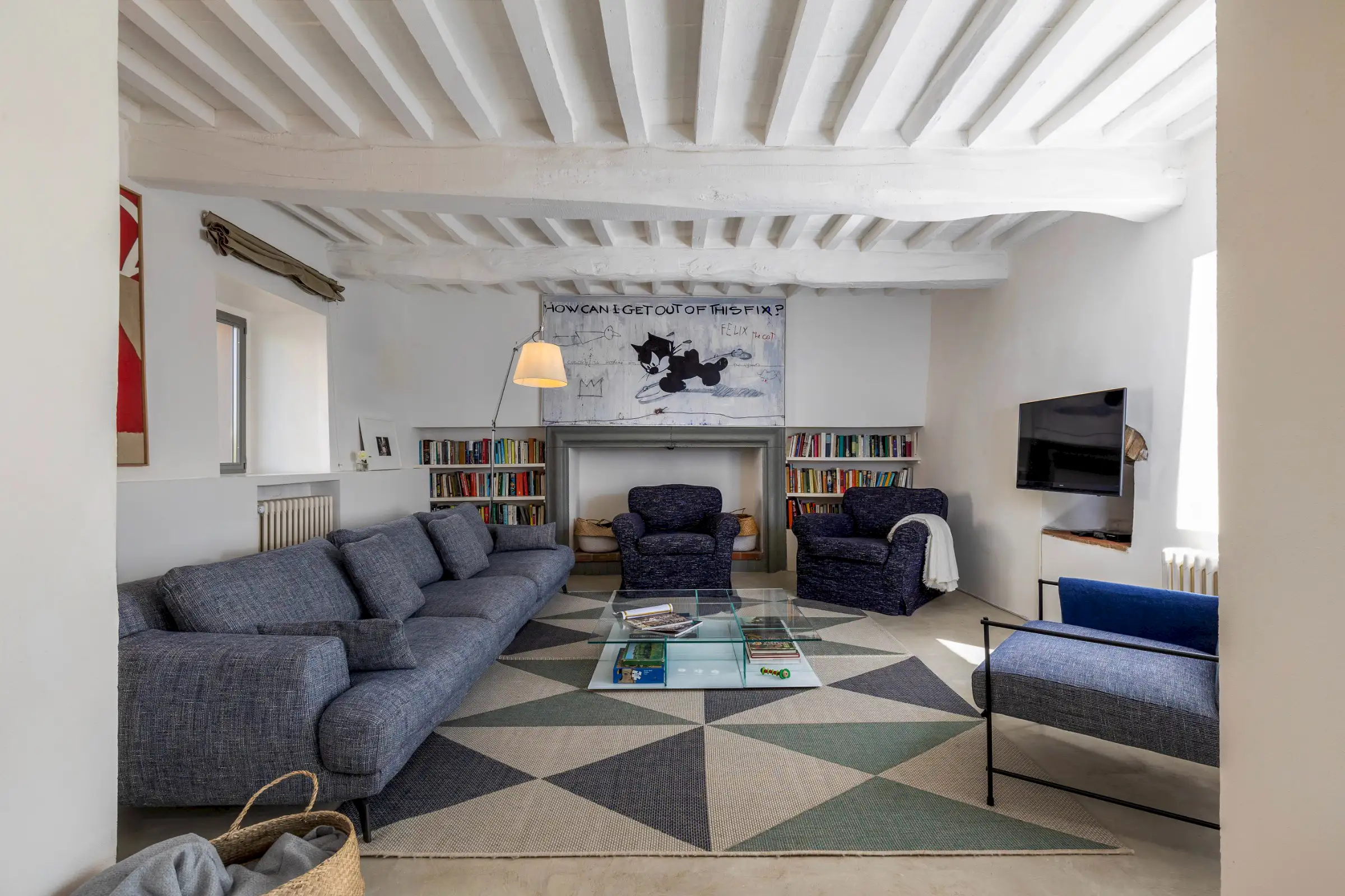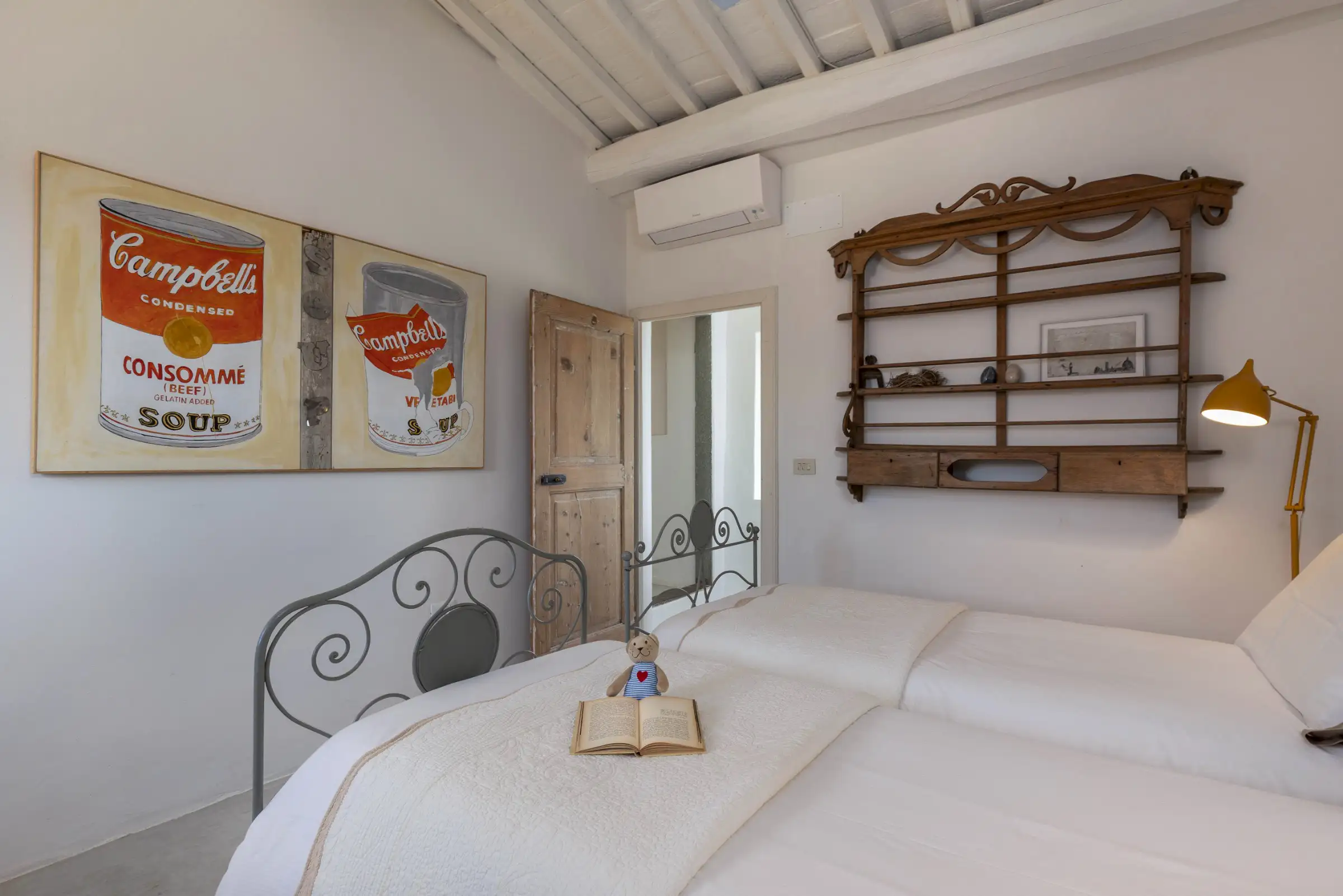 Chiantosa is finished with light gray concrete floors, old ceilings decorated with white washed ol wooden beams, and restored original doors. The large iron windows make the house bright and friendly and offer a stunning view over the countryside. A warm, bright, modern and comfortable atmosphere is what this villa offers their guests. Everywhere in the house striking pieces of art are filling the walls, made by the mother of the owner, a well known artist.