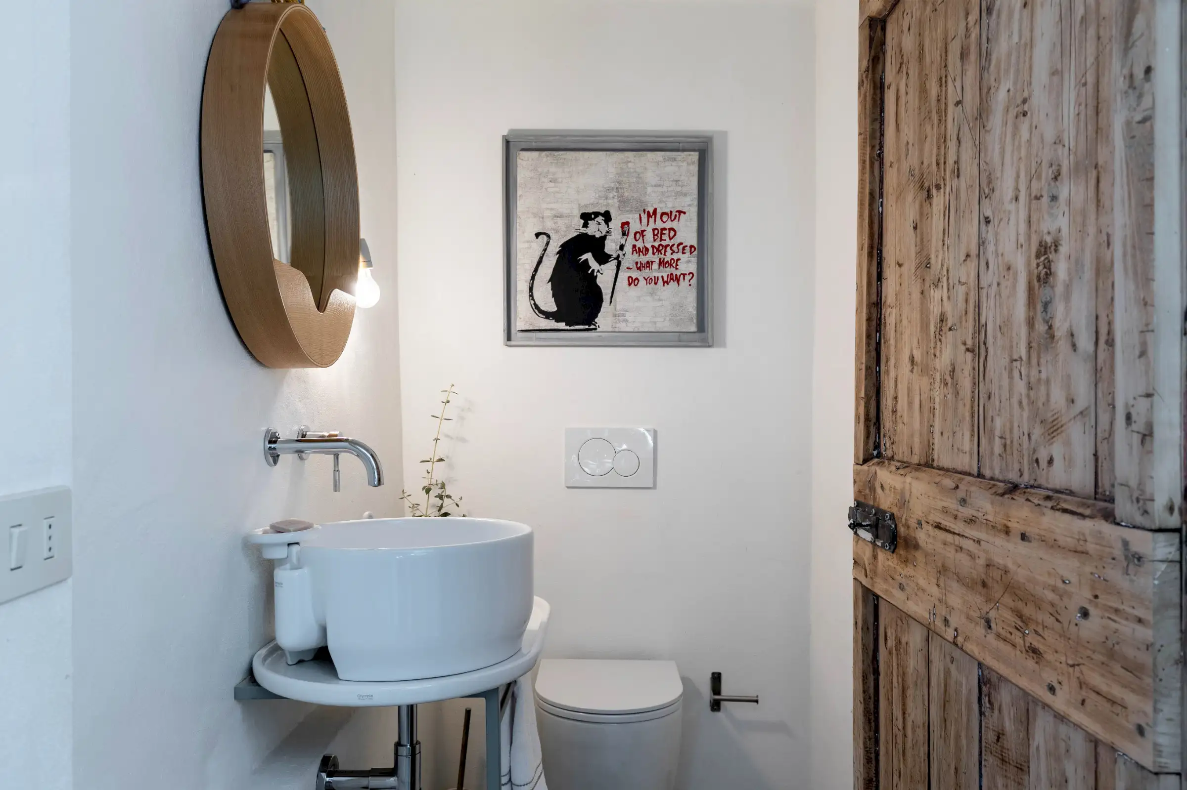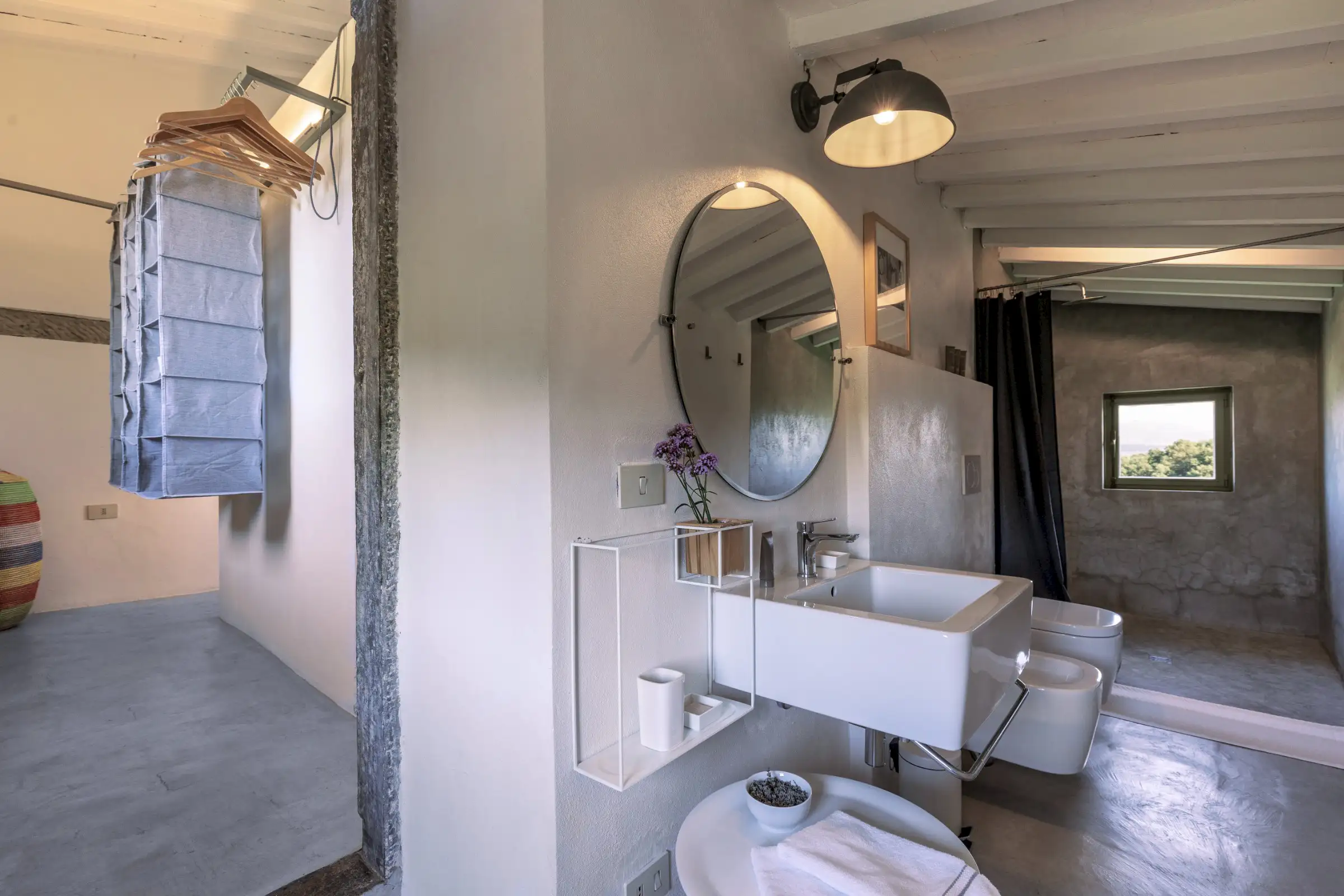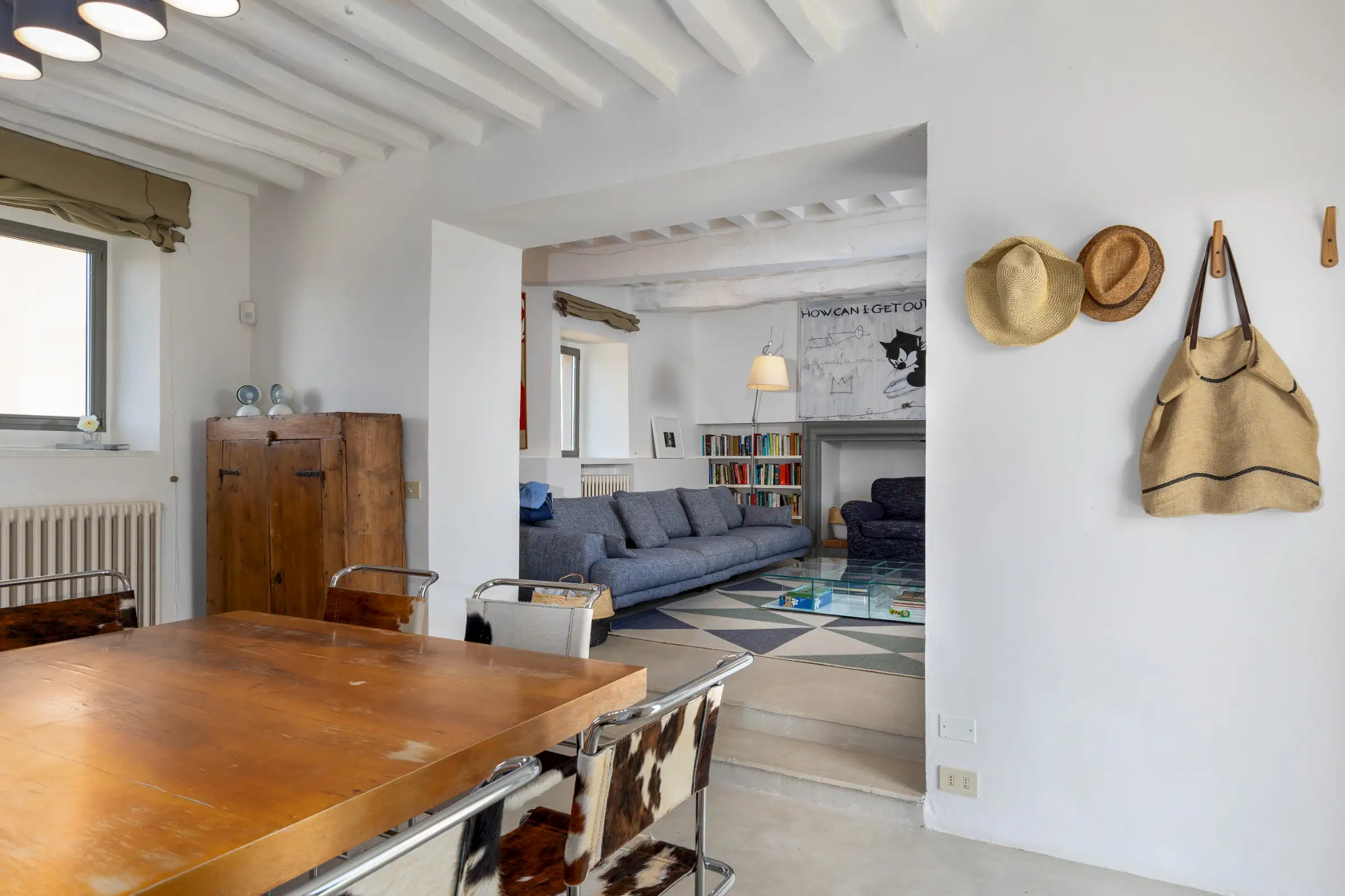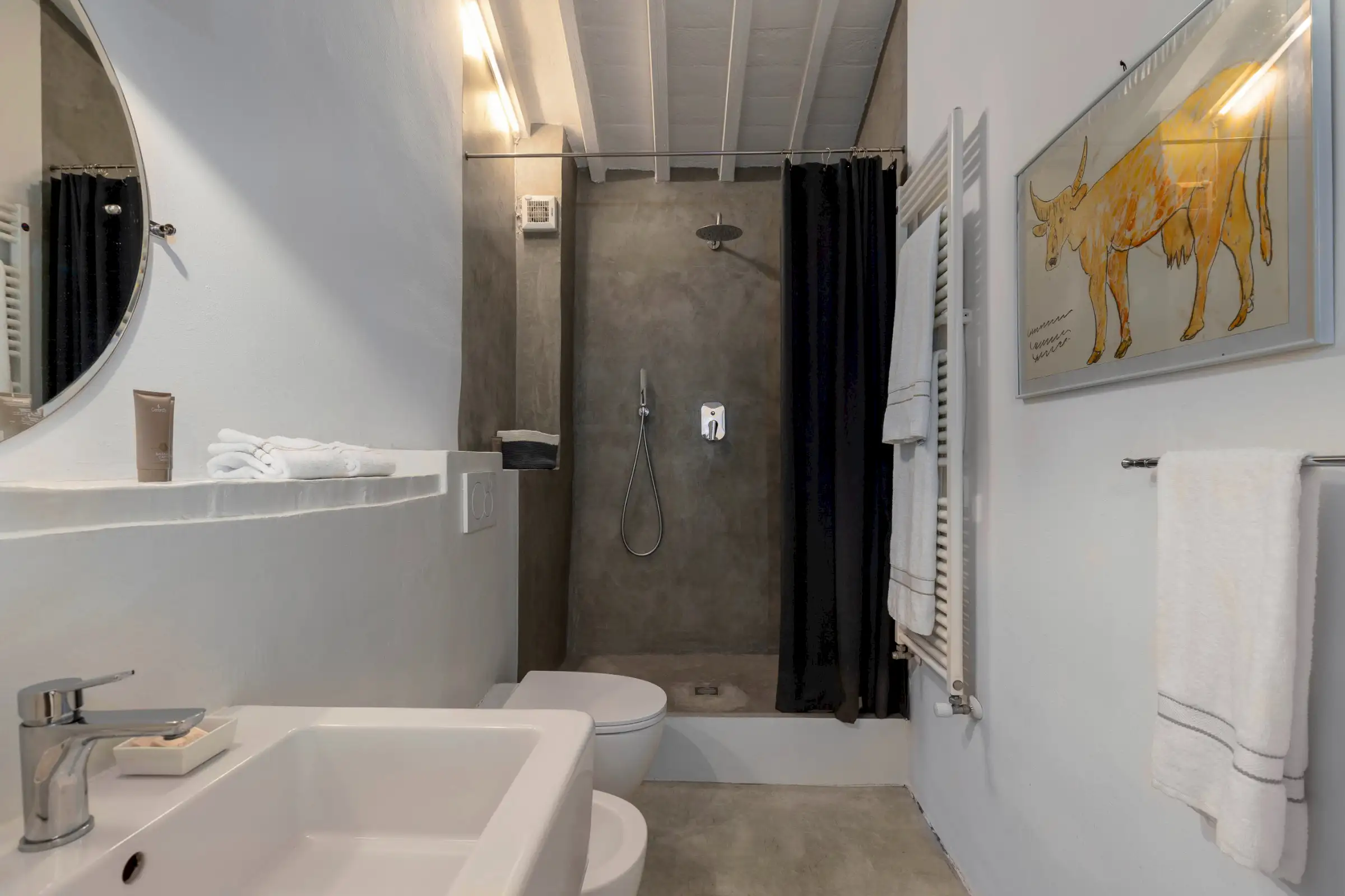 Chiantosa is finished with light gray concrete floors, old ceilings decorated with white washed ol wooden beams, and restored original doors. The large iron windows make the house bright and friendly and offer a stunning view over the countryside. A warm, bright, modern and comfortable atmosphere is what this villa offers their guests. Everywhere in the house striking pieces of art are filling the walls, made by the mother of the owner, a well known artist.