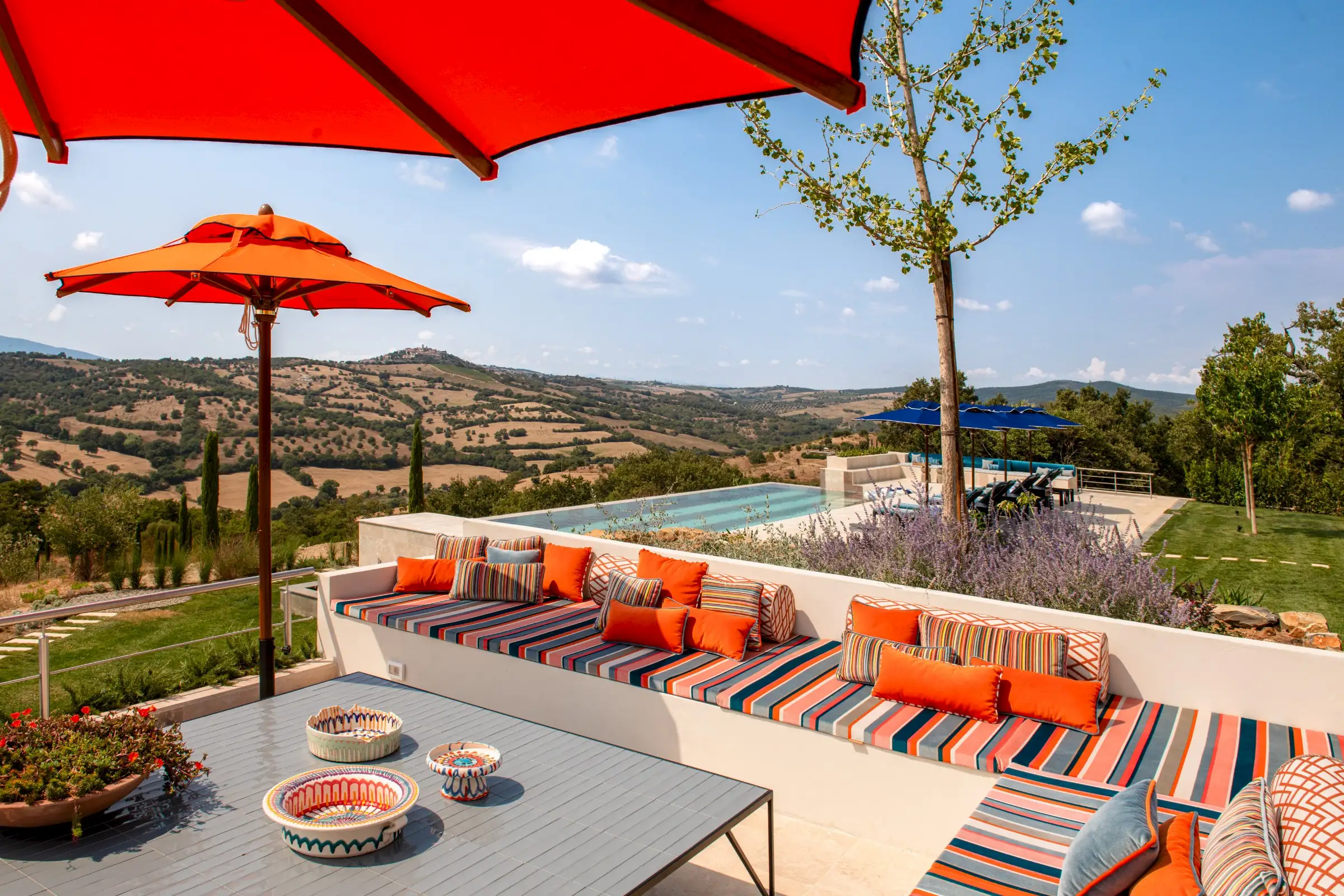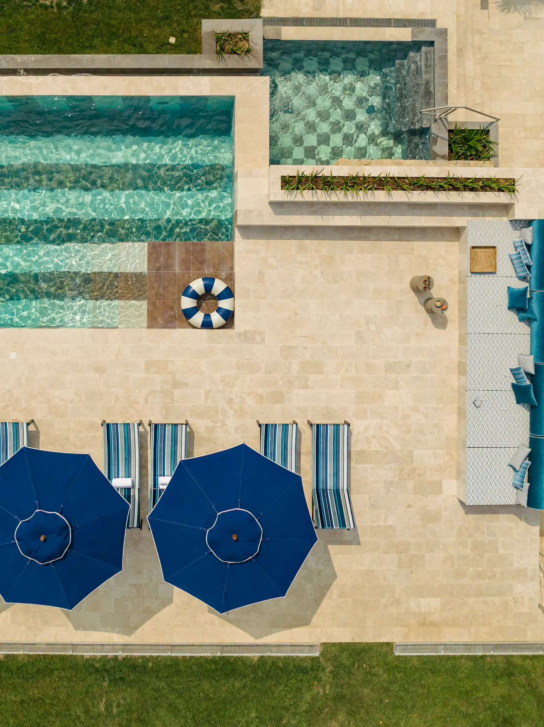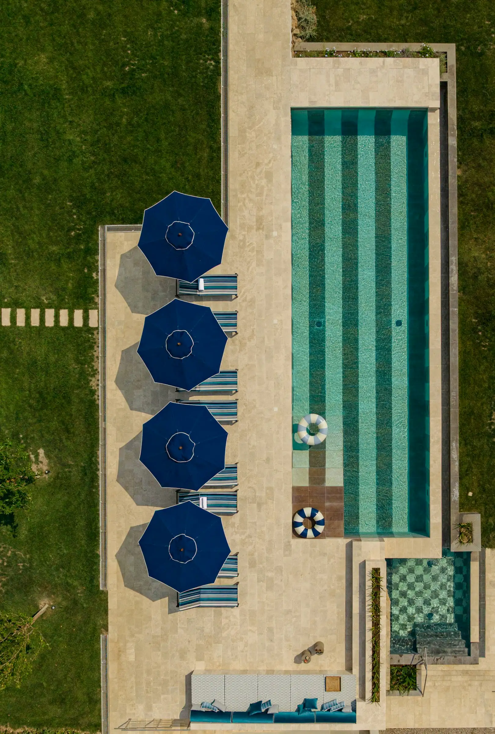 Outside, the design is led by the landscape, with an ancient Mediterranean oak offering shade to the dining table and the new 15 meters heated infinity pool and smaller Jacuzzi pool angled perfectly to take in the views towards the island of Giglio and the Monte Argentario peninsula. The pools' unique designs are marked out in marble - stripes for the larger one and checks for the smaller one - and together with the accompanying blue- and white-striped sunbeds and parasols, lend a modern Sixties look.