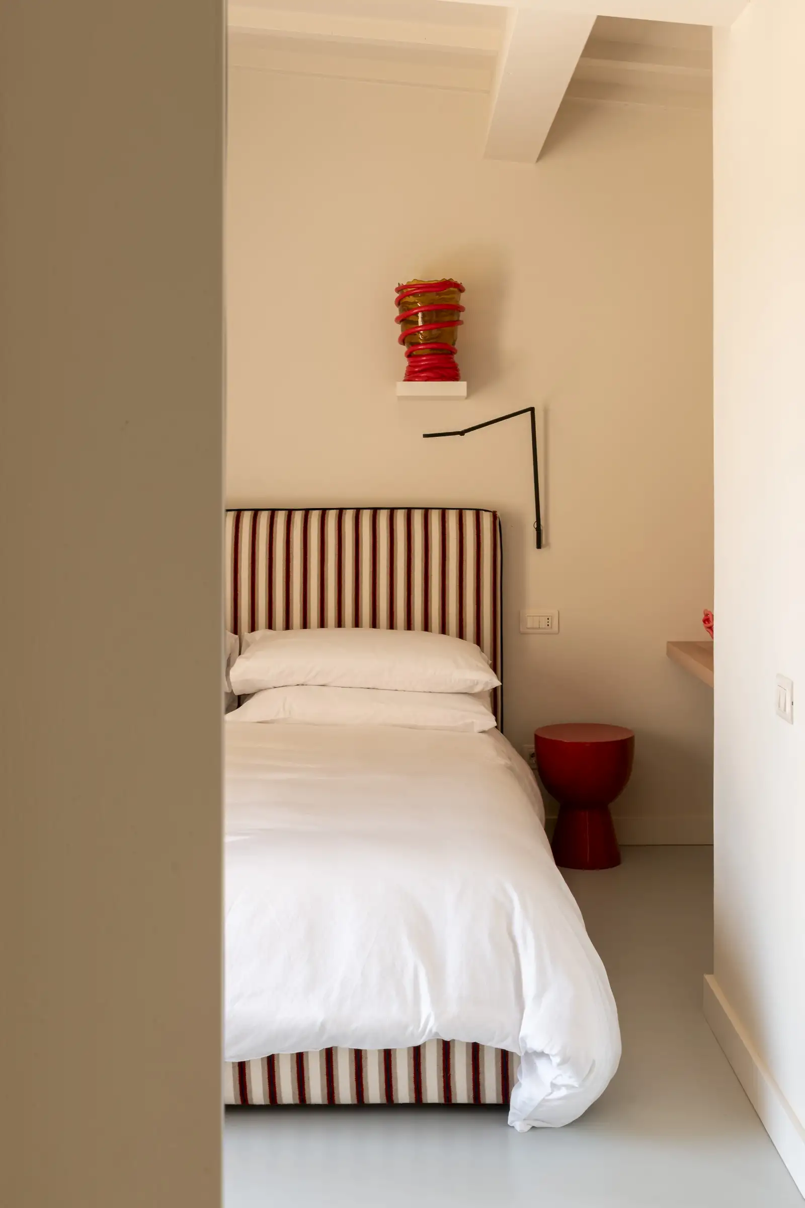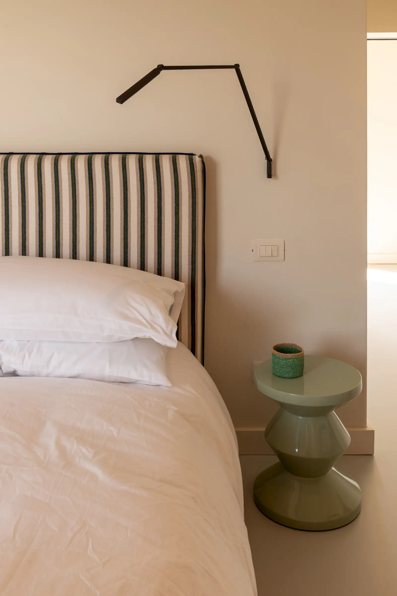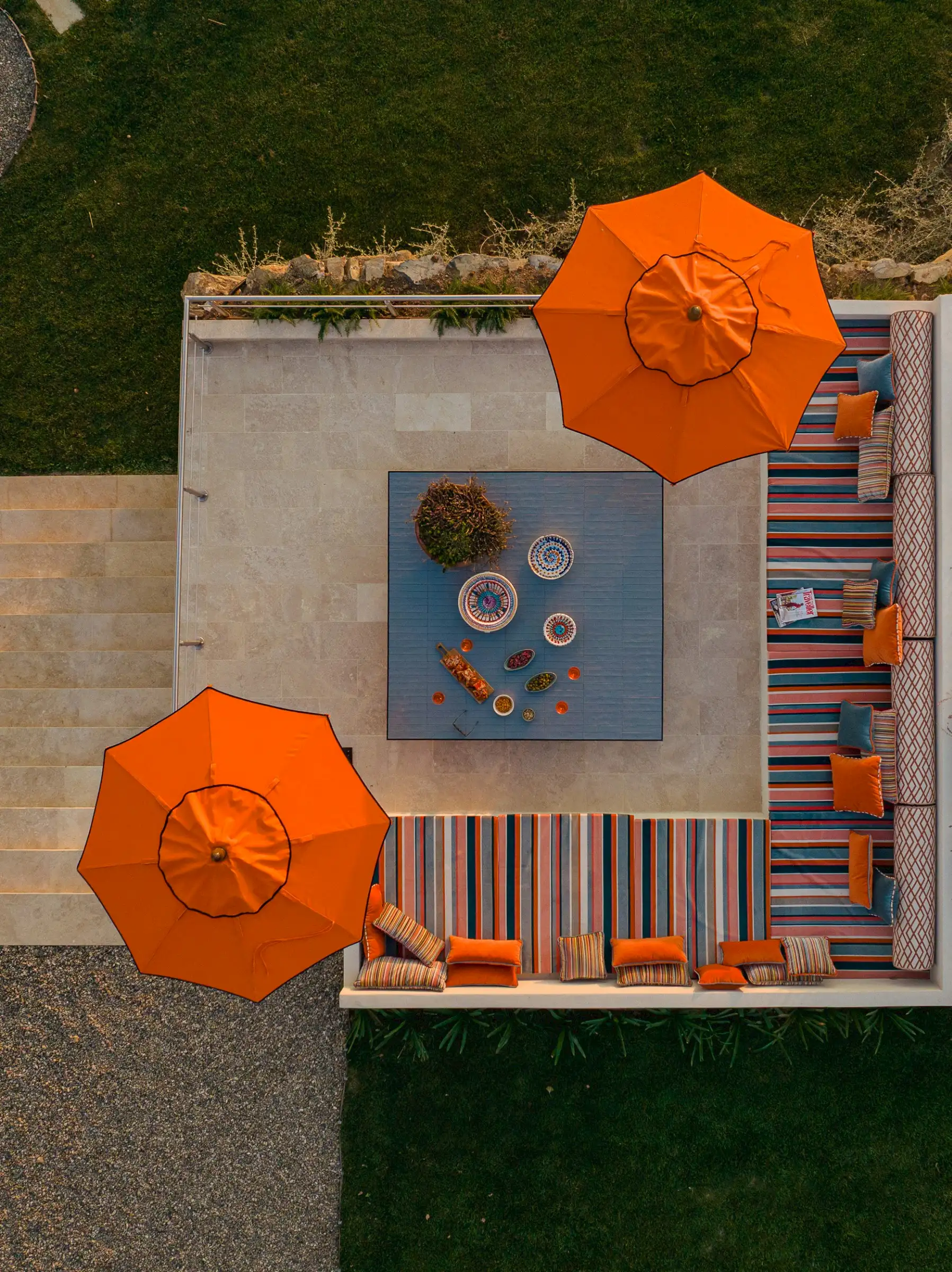 Outside, the design is led by the landscape, with an ancient Mediterranean oak offering shade to the dining table and the new 15 meters heated infinity pool and smaller Jacuzzi pool angled perfectly to take in the views towards the island of Giglio and the Monte Argentario peninsula. The pools' unique designs are marked out in marble - stripes for the larger one and checks for the smaller one - and together with the accompanying blue- and white-striped sunbeds and parasols, lend a modern Sixties look.