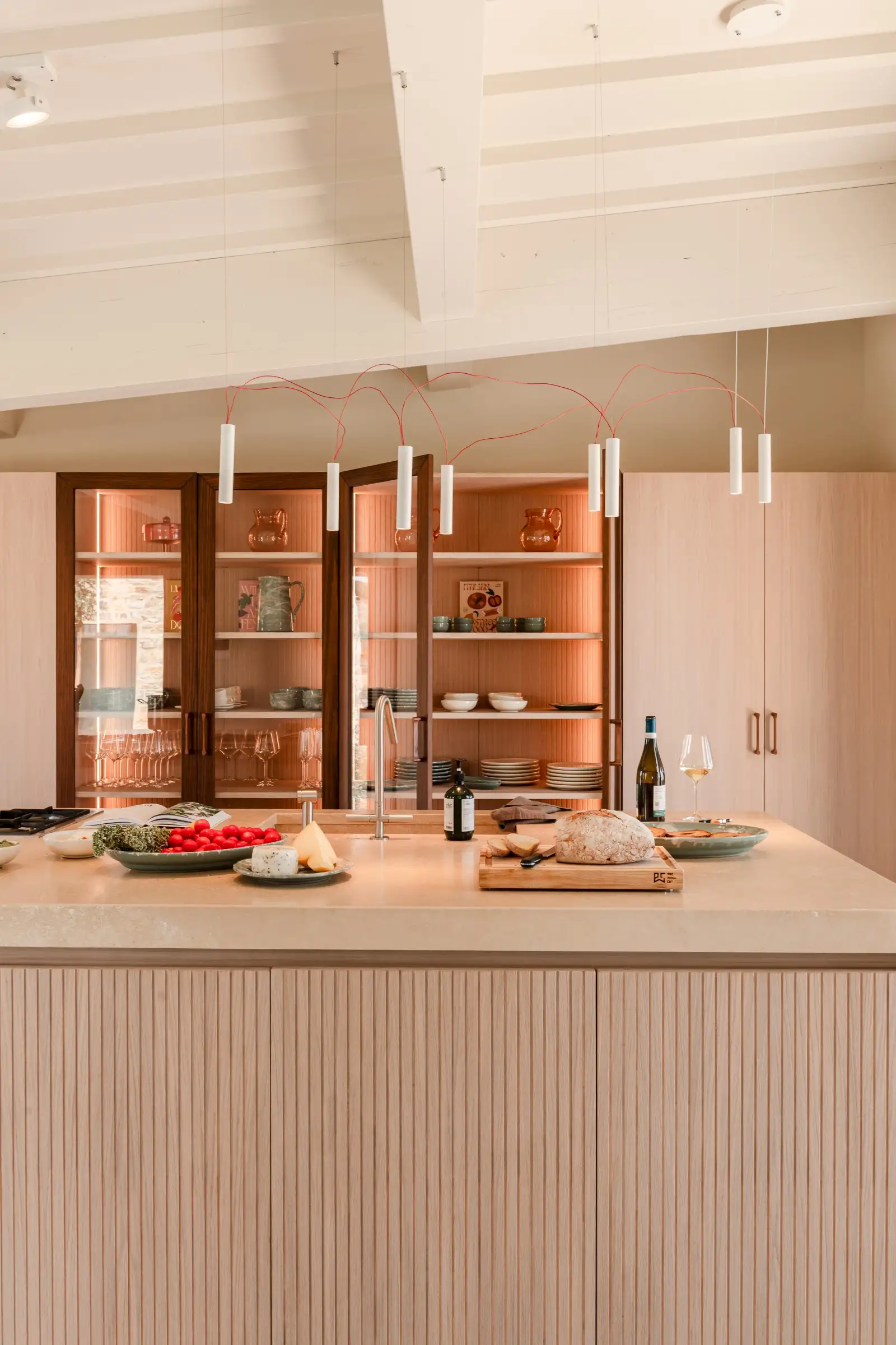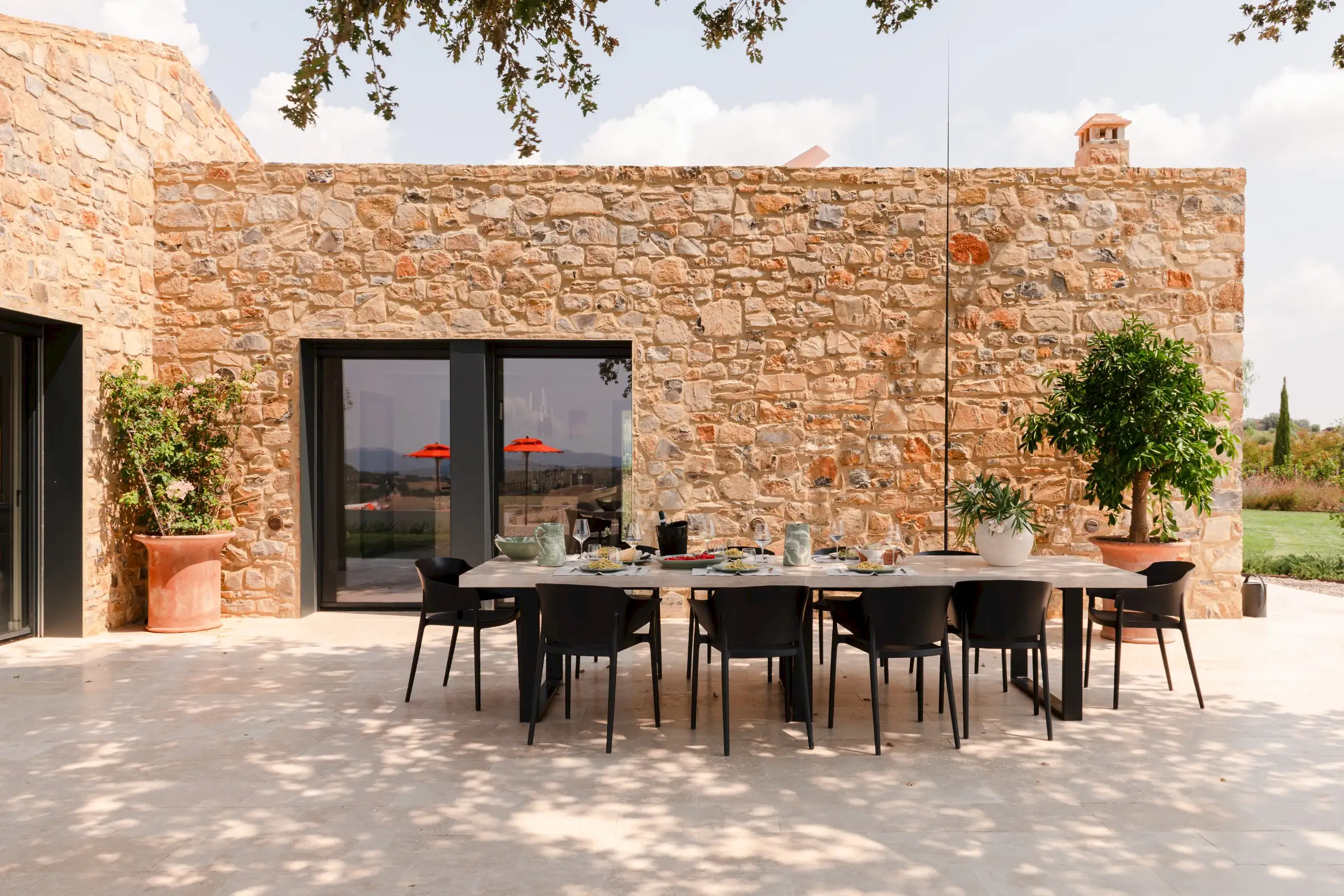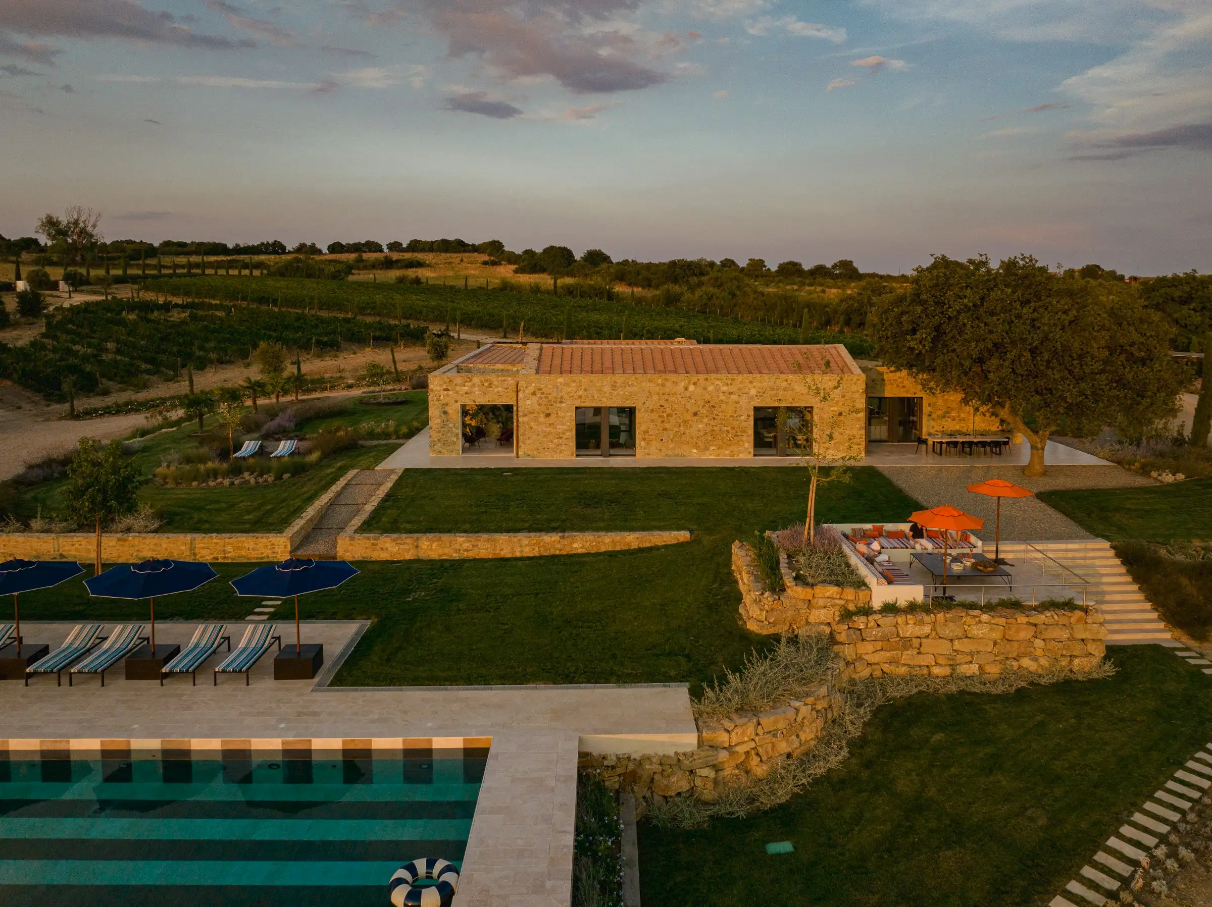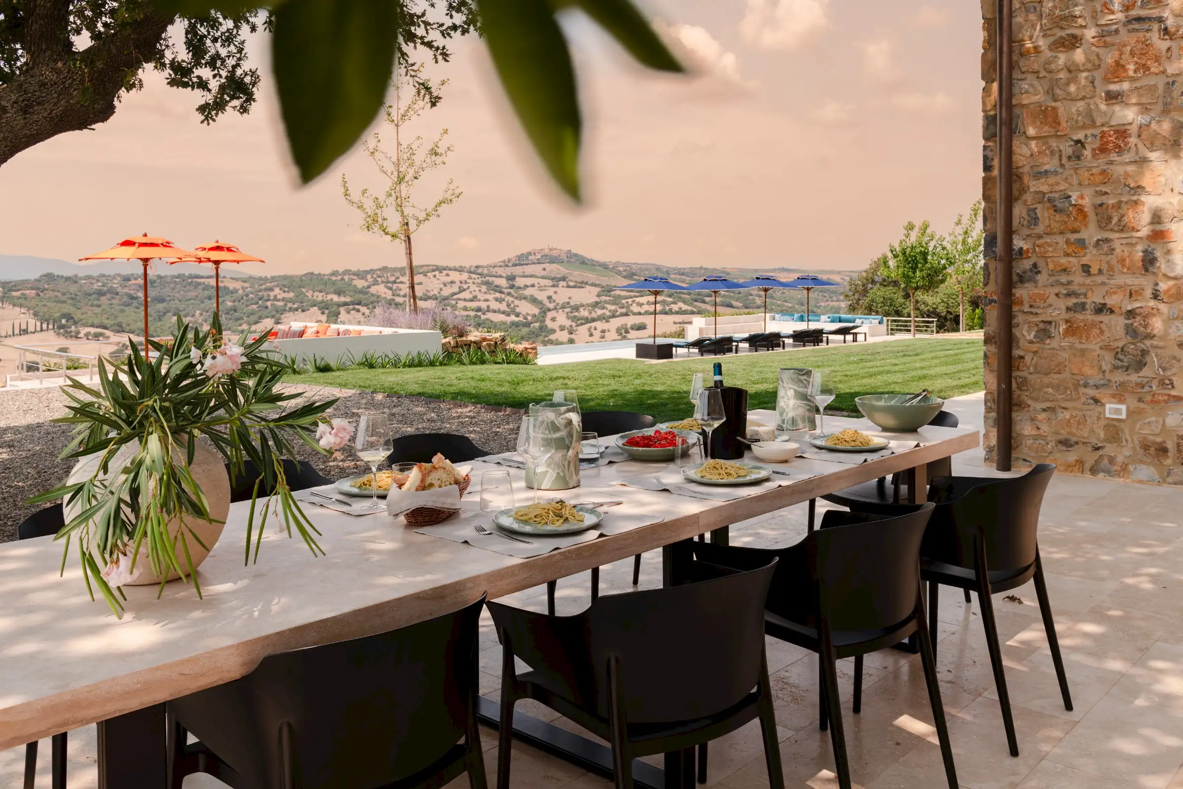 Rebuilt and renovated by the SpecialItaly team, the villa was ready to welcome their first guests in July 2025. The large, single-storey stone building combines handcrafted, made-to-measure furniture in local, natural, tactile materials such as travertine, oak and walnut, with high-end design pieces by Molteni and Fritz Hansen, as well as lighting by Davide Groppi and Vibia. The result is a deeply comfortable, sophisticated, sleek interior that expertly blends form with function. Every convenience has been thought of, including a prep kitchen and separate pantry.