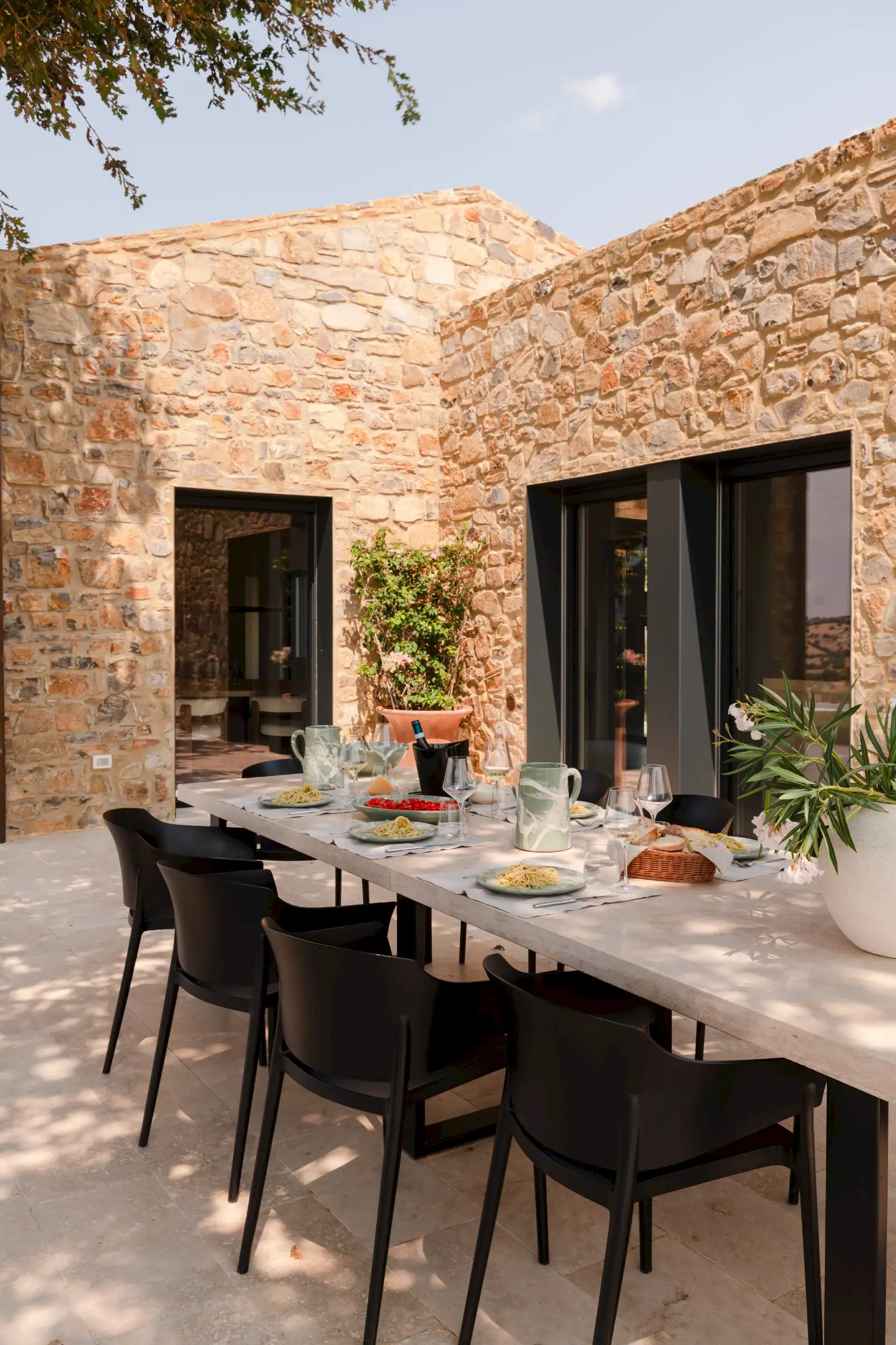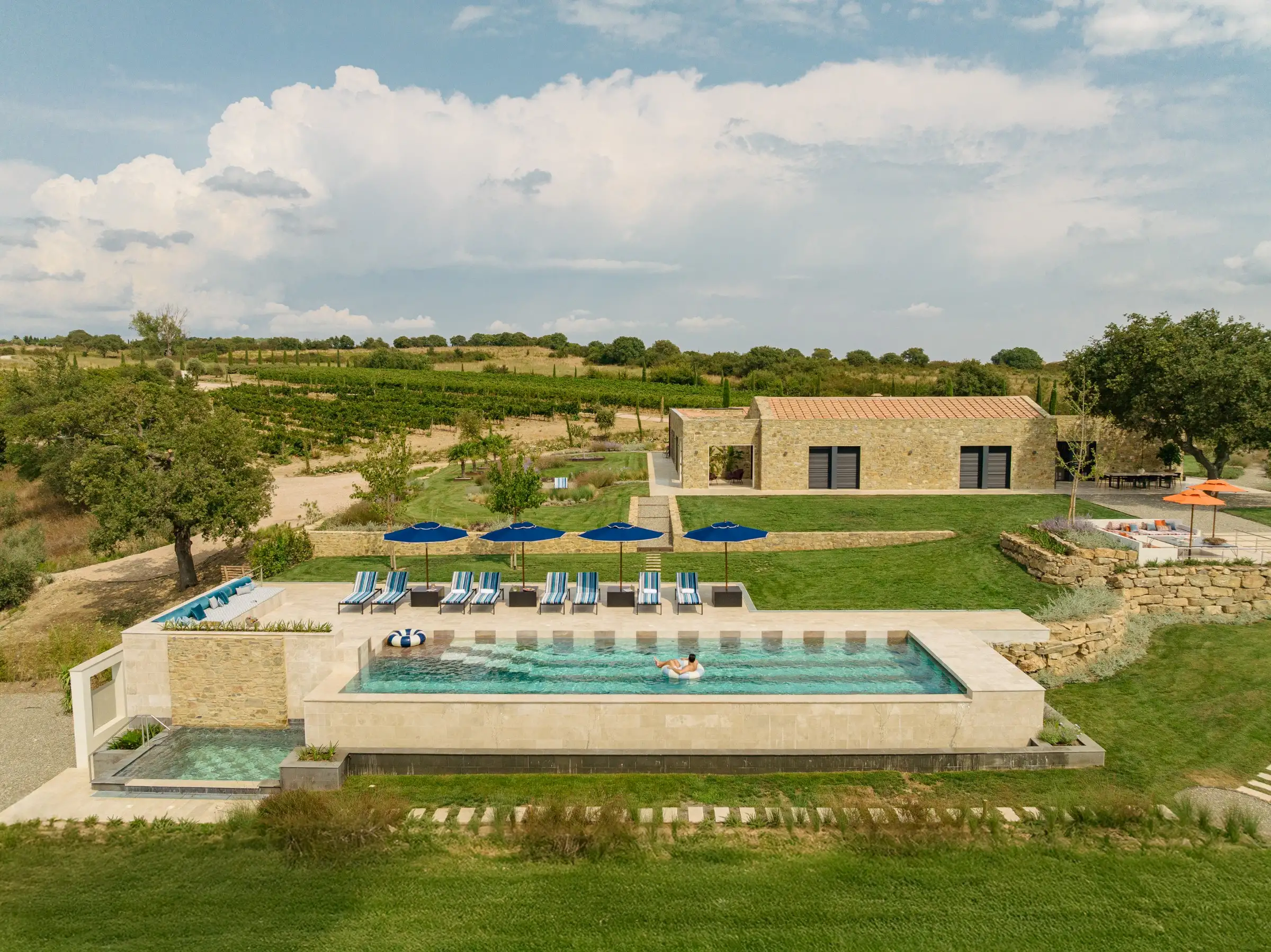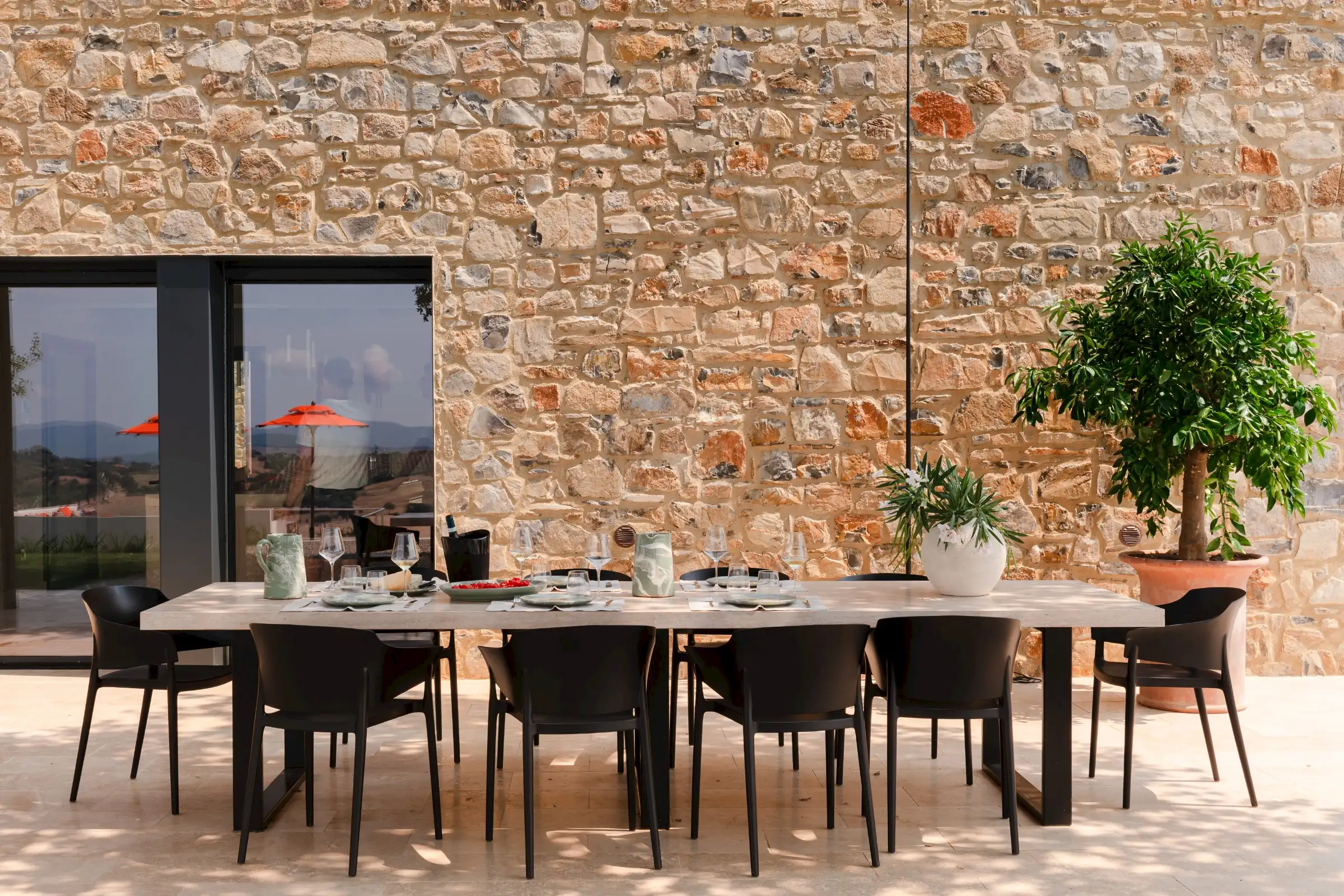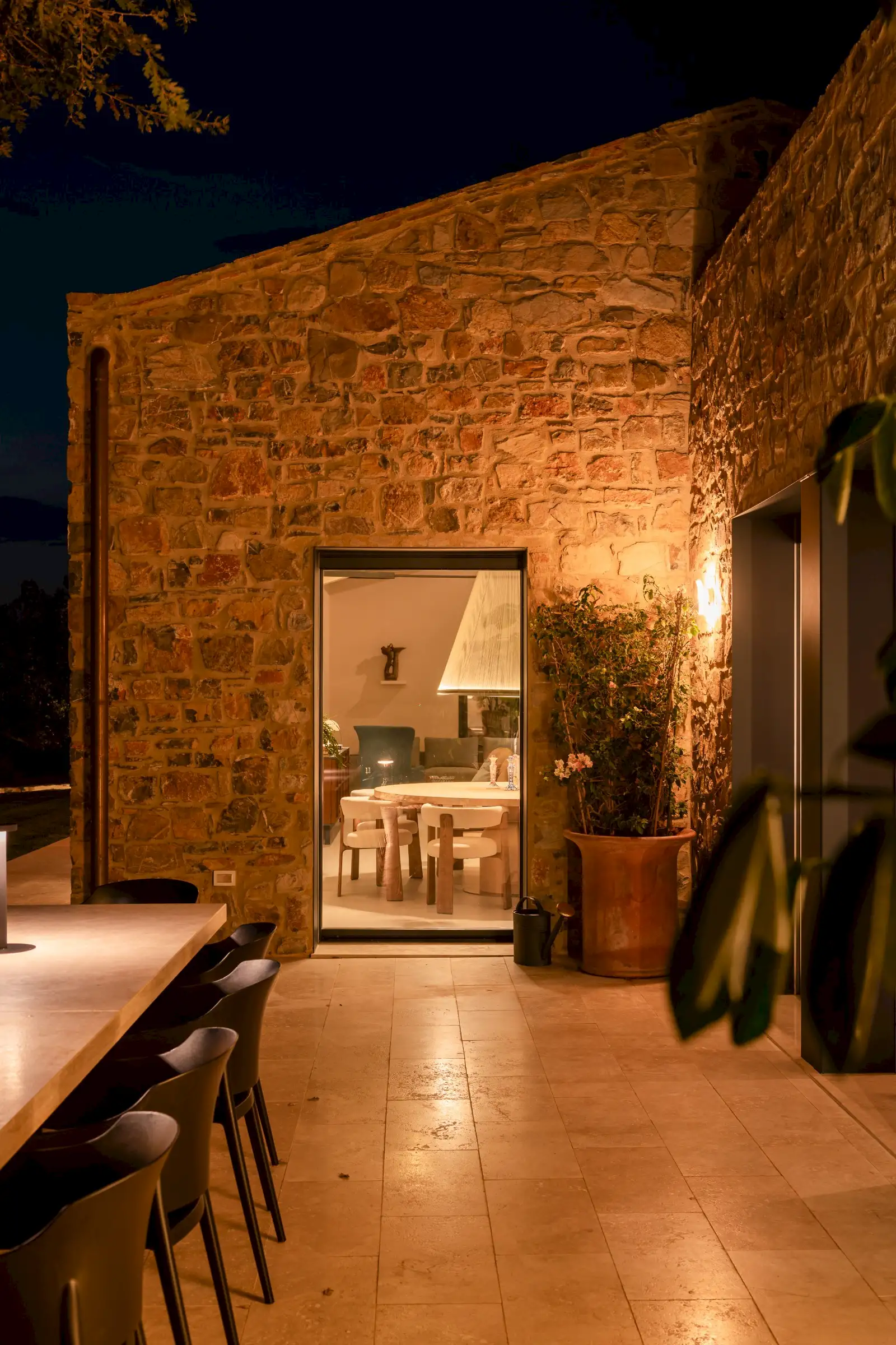 Rebuilt and renovated by the SpecialItaly team, the villa was ready to welcome their first guests in July 2025. The large, single-storey stone building combines handcrafted, made-to-measure furniture in local, natural, tactile materials such as travertine, oak and walnut, with high-end design pieces by Molteni and Fritz Hansen, as well as lighting by Davide Groppi and Vibia. The result is a deeply comfortable, sophisticated, sleek interior that expertly blends form with function. Every convenience has been thought of, including a prep kitchen and separate pantry.