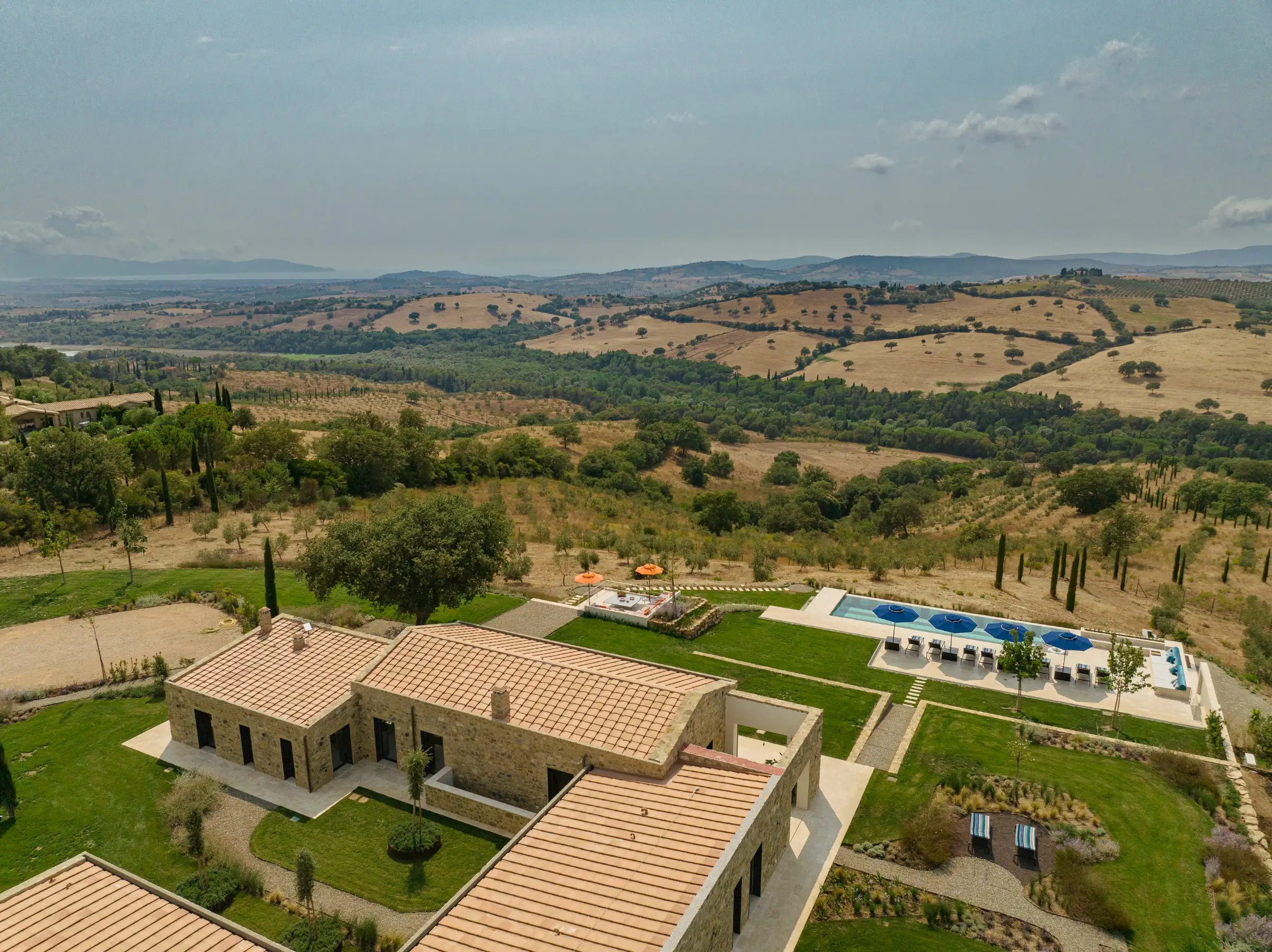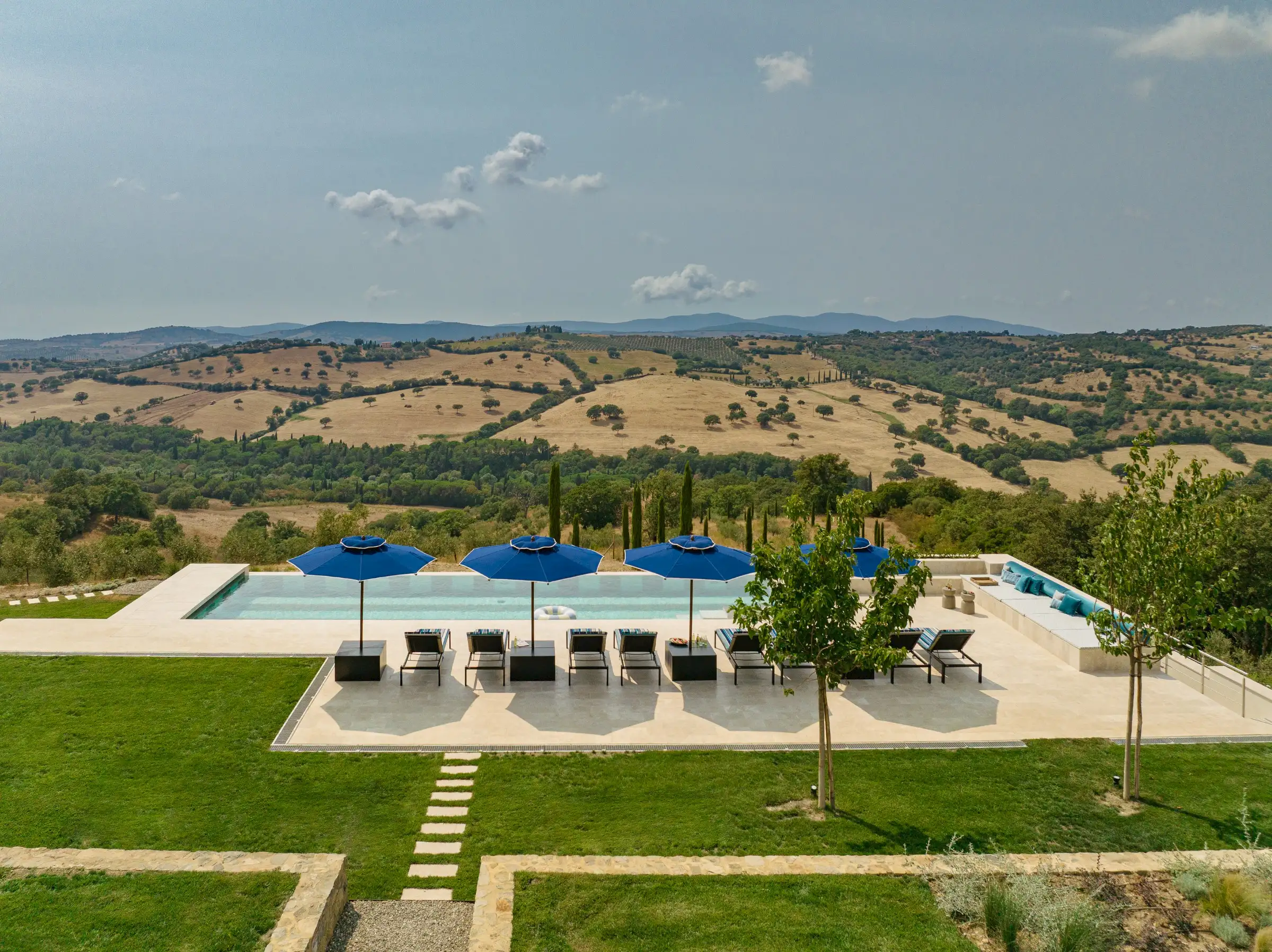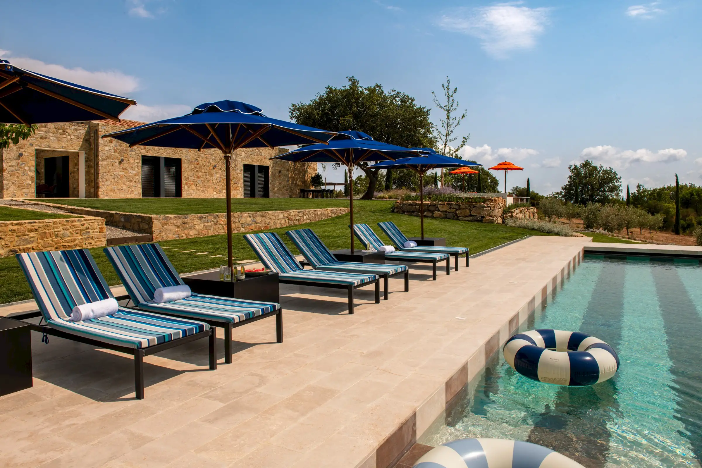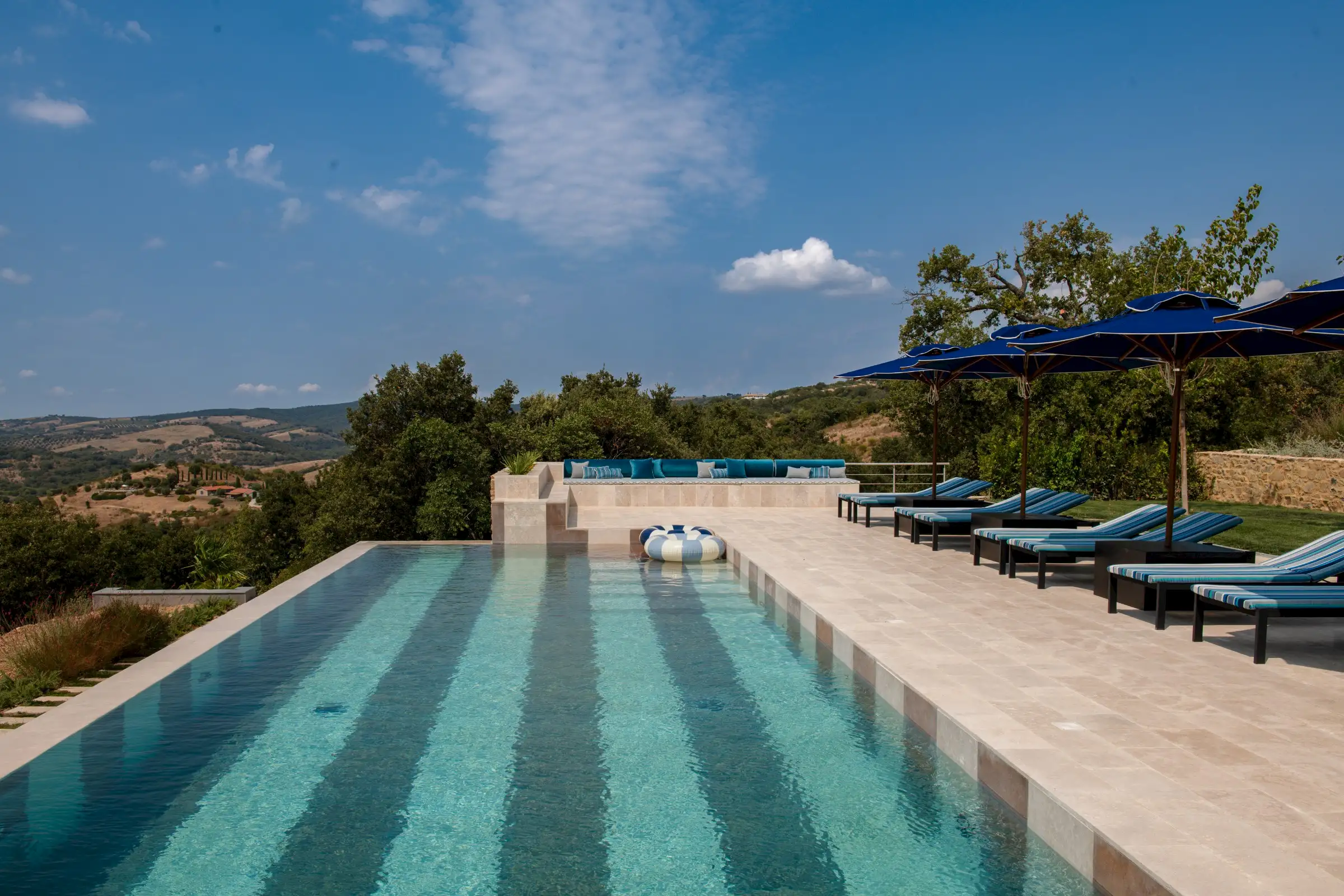 The large garden has been carefully designed by a Sicilian garden architect with lawns, flower beds, mature trees and terraces that all enhance the magnificent views across the vine-covered hills towards the coast, the island of Giglio and the Monte Argentario peninsula. Next to the kitchen is a lovely dining terrace with a beautiful bespoke travertine-topped table – just like the kitchen island inside - that sits in the shade of a centuries-old Mediterranean oak. Guests can sit comfortably on a built-in corner sofa on the terrace or on a different one next to the pool. Meanwhile, the heated infinity pool (15mx5m) itself is new and if you aren’t admiring its fabulous coloured marble stripes, it’s because you can’t take your eyes off the view. This you can also admire from the blue-and-white striped sunbeds. There’s a second, smaller, Jacuzzi-style pool that echoes the same design, on a terrace below the main pool, with an inside shower area. The garden is fenced, there are automatic entrance gates and plenty of parking.
