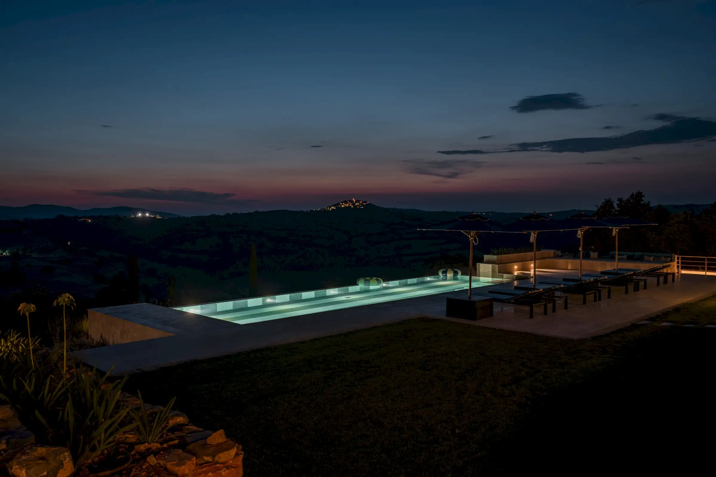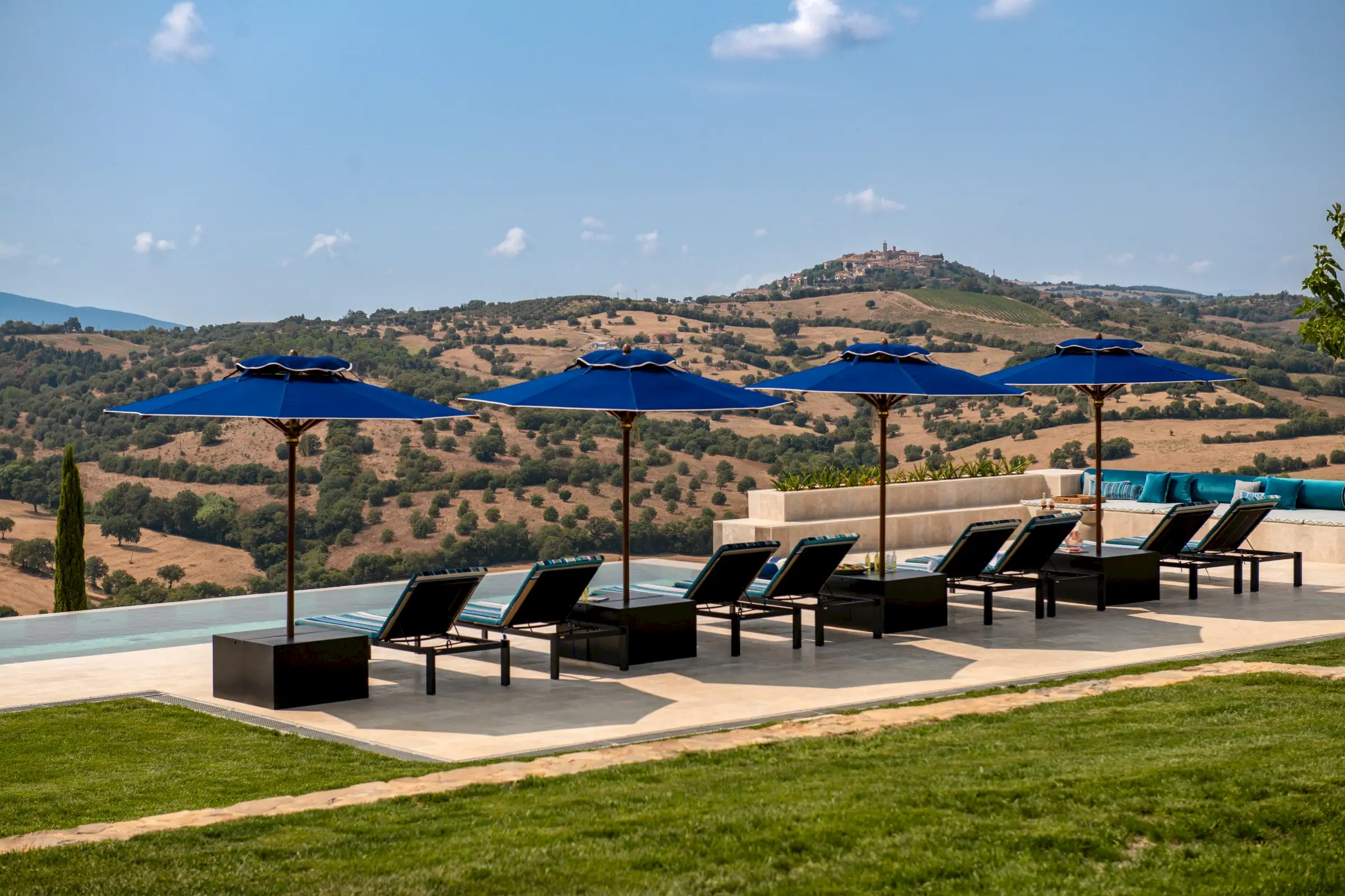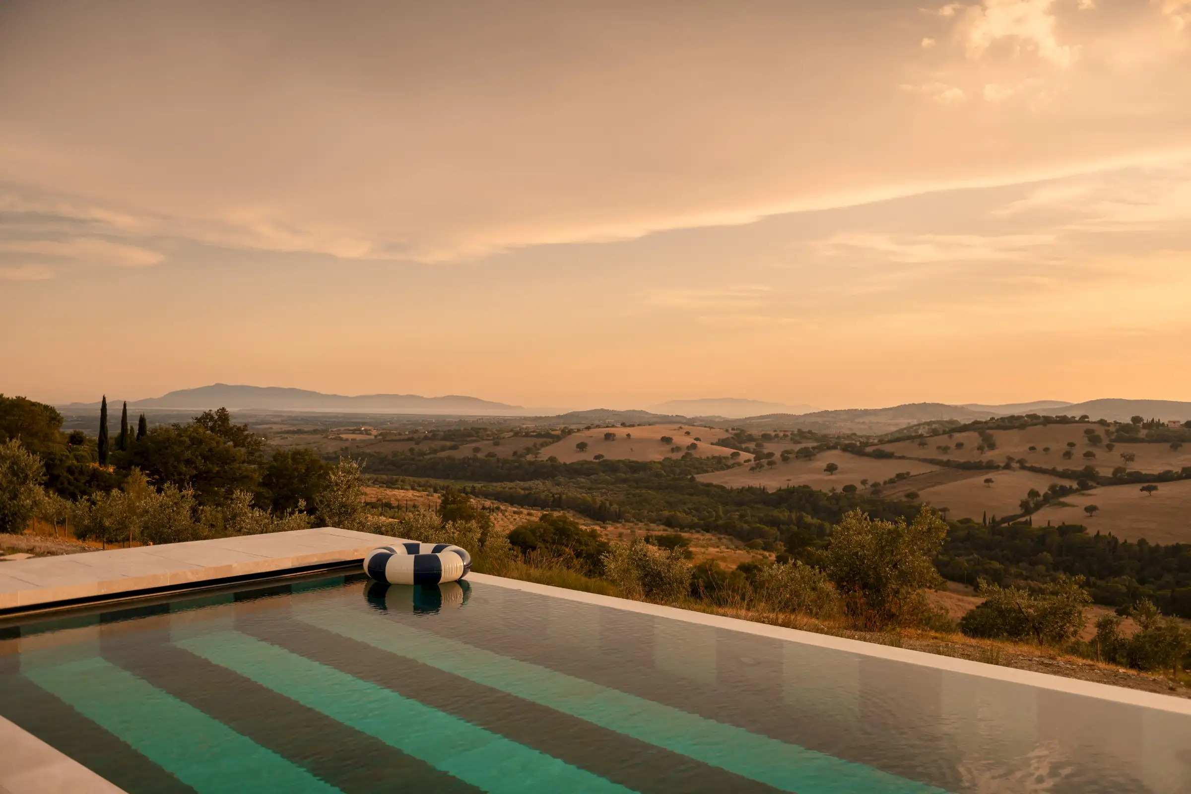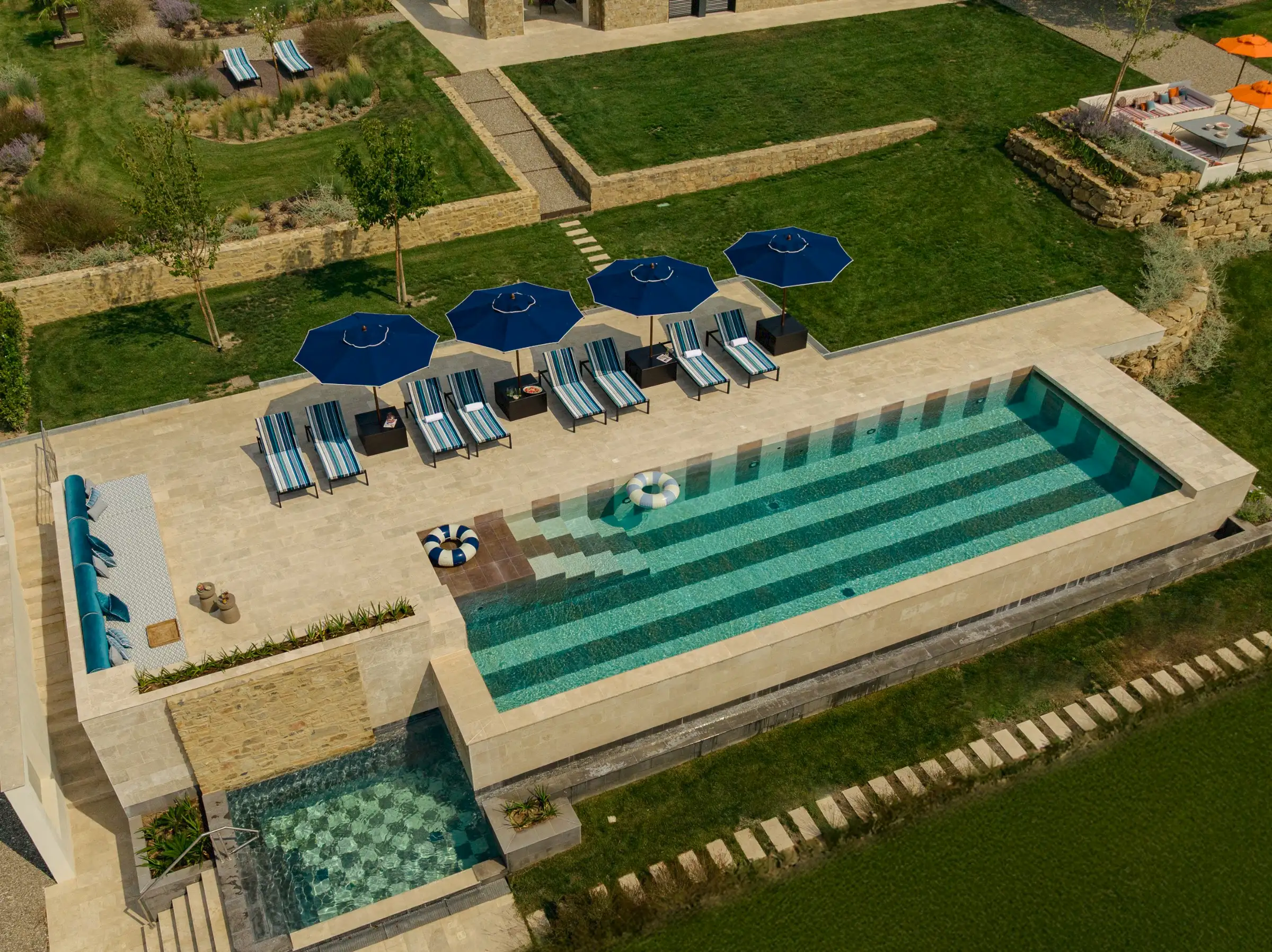 The large garden has been carefully designed by a Sicilian garden architect with lawns, flower beds, mature trees and terraces that all enhance the magnificent views across the vine-covered hills towards the coast, the island of Giglio and the Monte Argentario peninsula. Next to the kitchen is a lovely dining terrace with a beautiful bespoke travertine-topped table – just like the kitchen island inside - that sits in the shade of a centuries-old Mediterranean oak. Guests can sit comfortably on a built-in corner sofa on the terrace or on a different one next to the pool. Meanwhile, the heated infinity pool (15mx5m) itself is new and if you aren’t admiring its fabulous coloured marble stripes, it’s because you can’t take your eyes off the view. This you can also admire from the blue-and-white striped sunbeds. There’s a second, smaller, Jacuzzi-style pool that echoes the same design, on a terrace below the main pool, with an inside shower area. The garden is fenced, there are automatic entrance gates and plenty of parking.