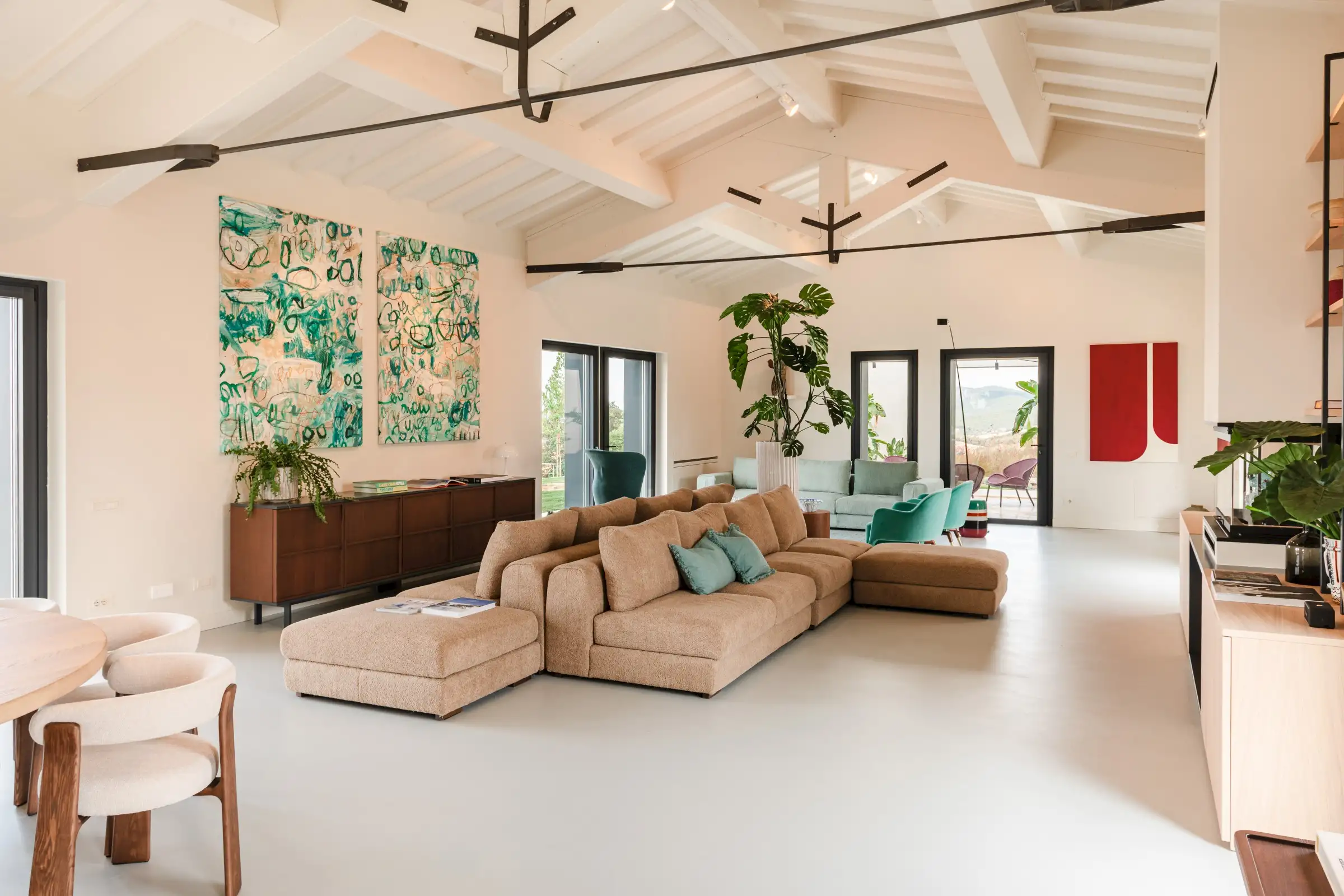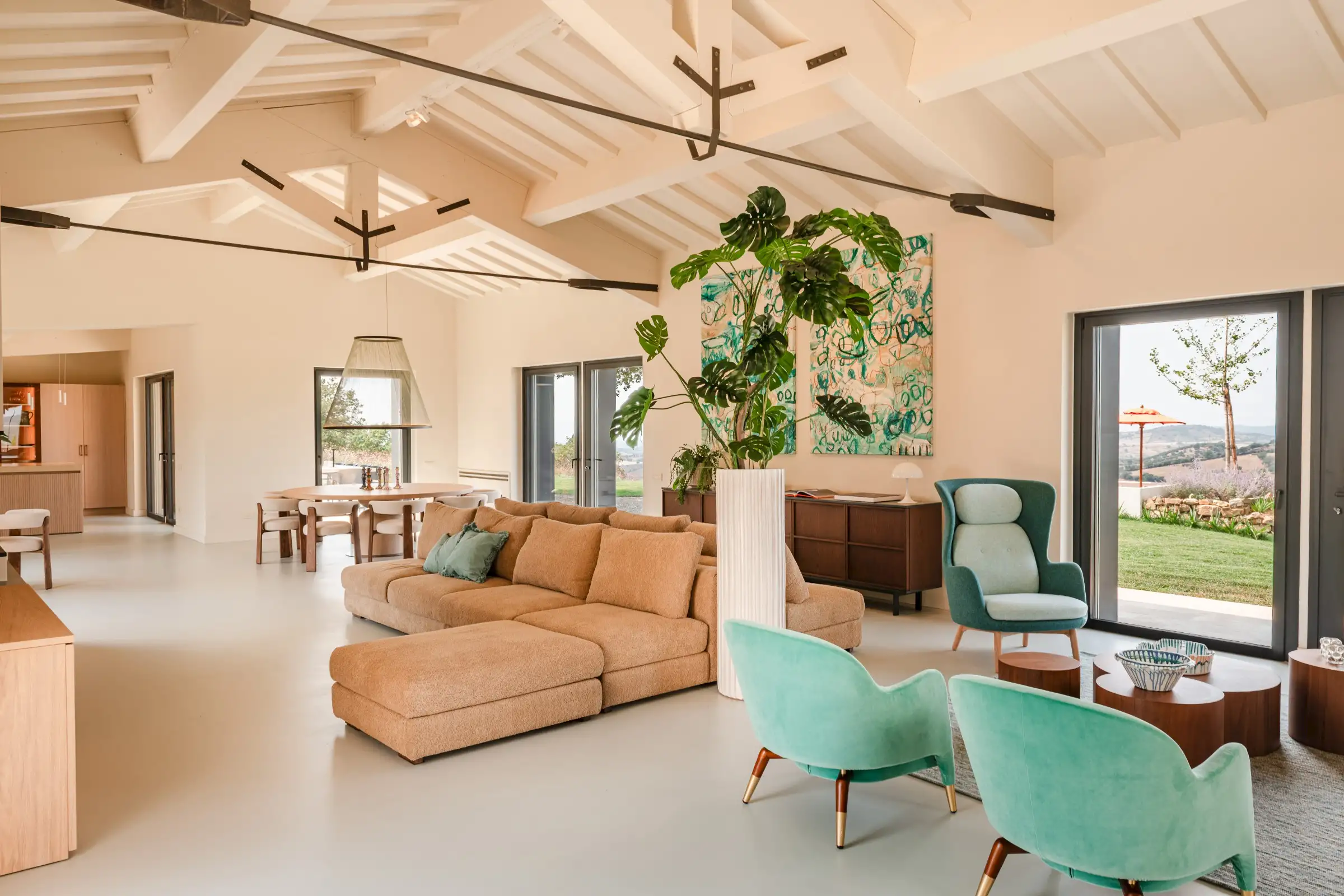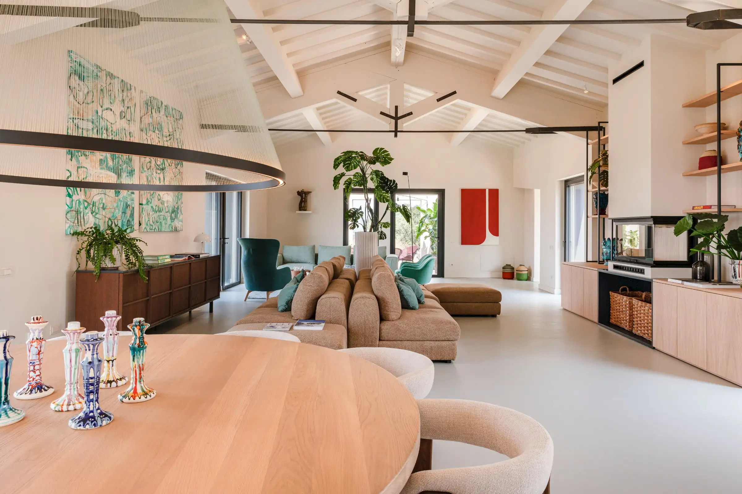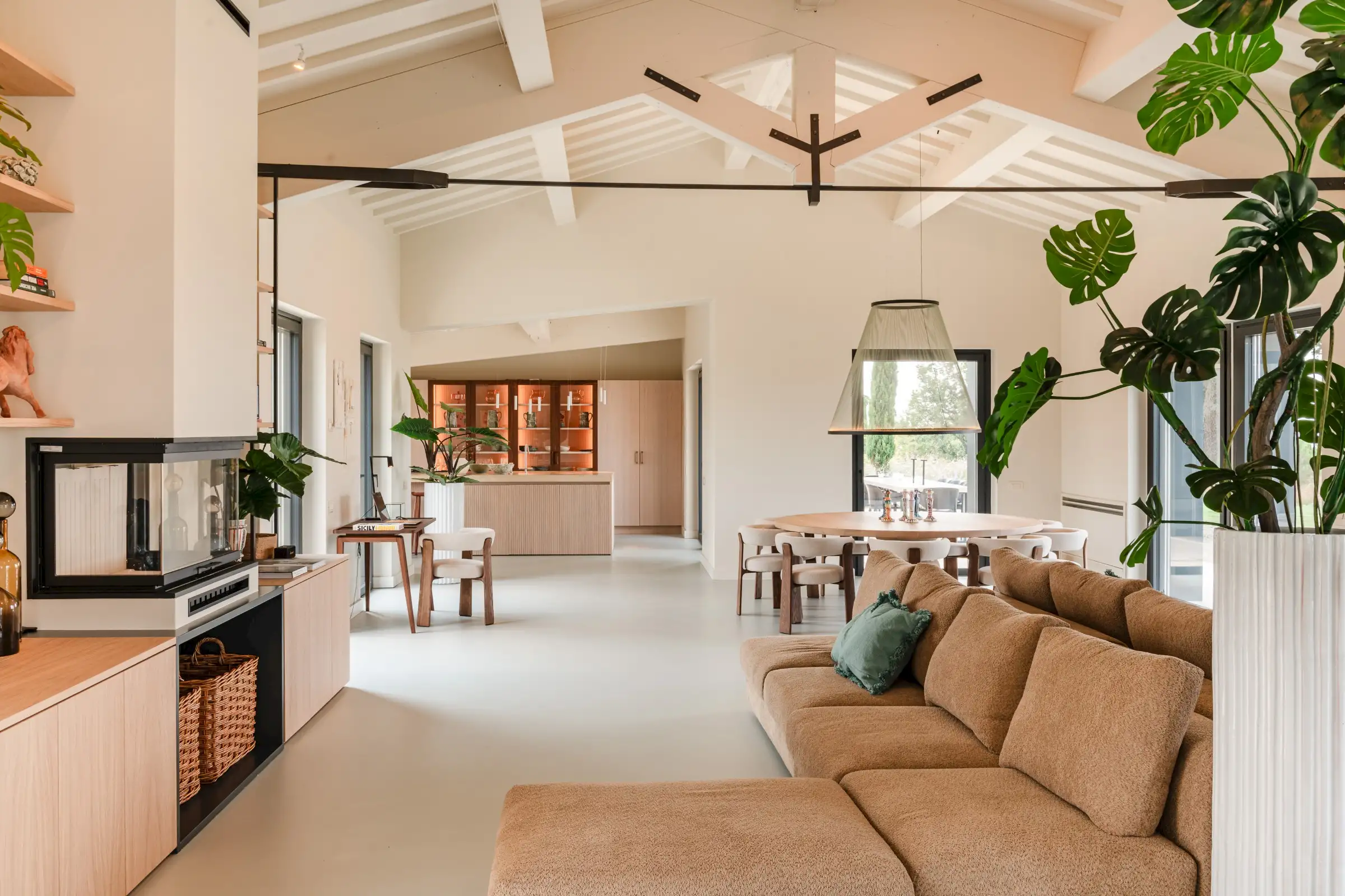 The living space takes the lead on the design notes that are replicated throughout the property and its huge size gives the feel of a modern baronial hall. A sophisticated mix of design pieces by Molteni and Fritz Hansen and lighting by Davide Groppi are given prominence, thanks to the soft neutral walls, smooth floor and vaulted lime-washed wood beamed ceiling. Built-in shelves house a modern fireplace and the three large sofas are very much for lounging on. The room is a glorious space, big yet intimate, it accommodates everyone. The same attention to high-level comfort and design can be found outside where guests can spread out on the built-in sofas or sunloungers.