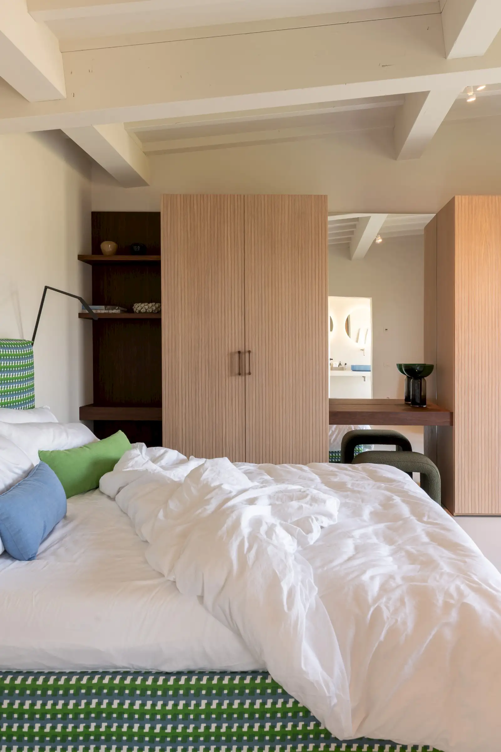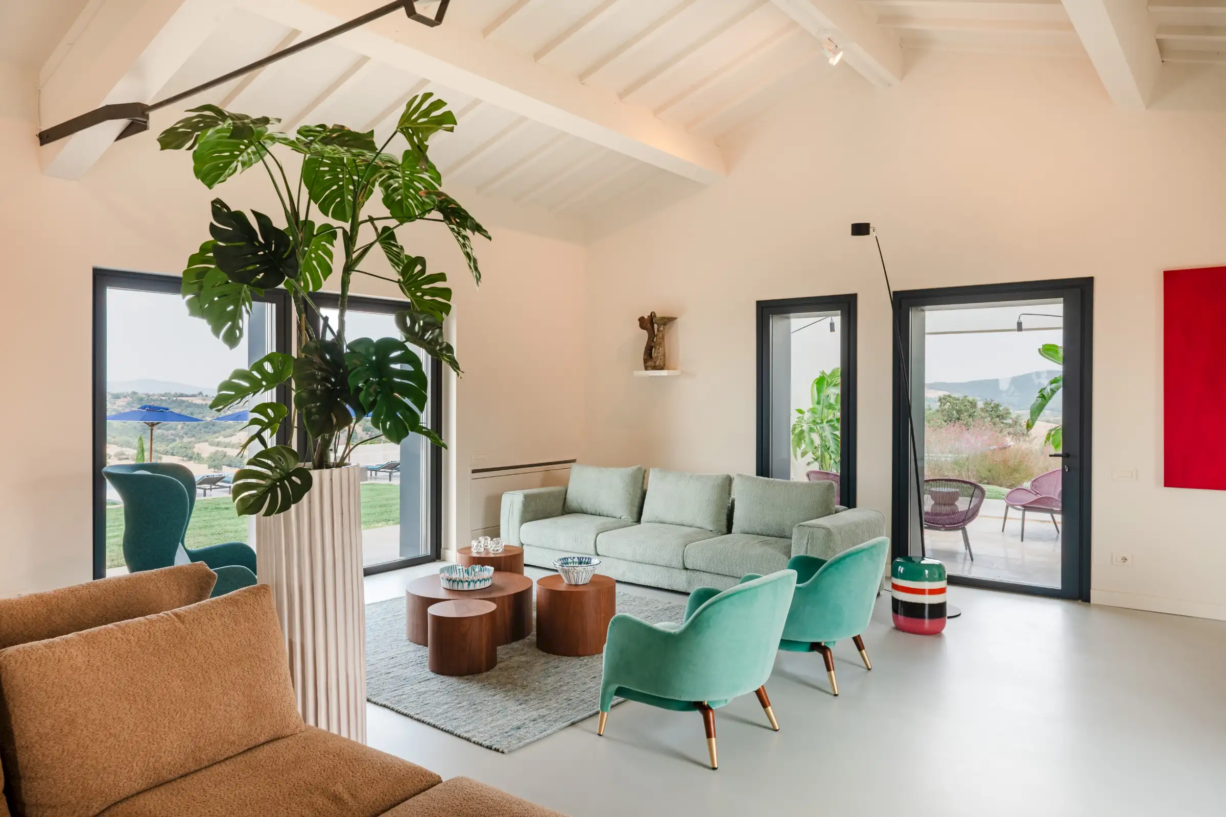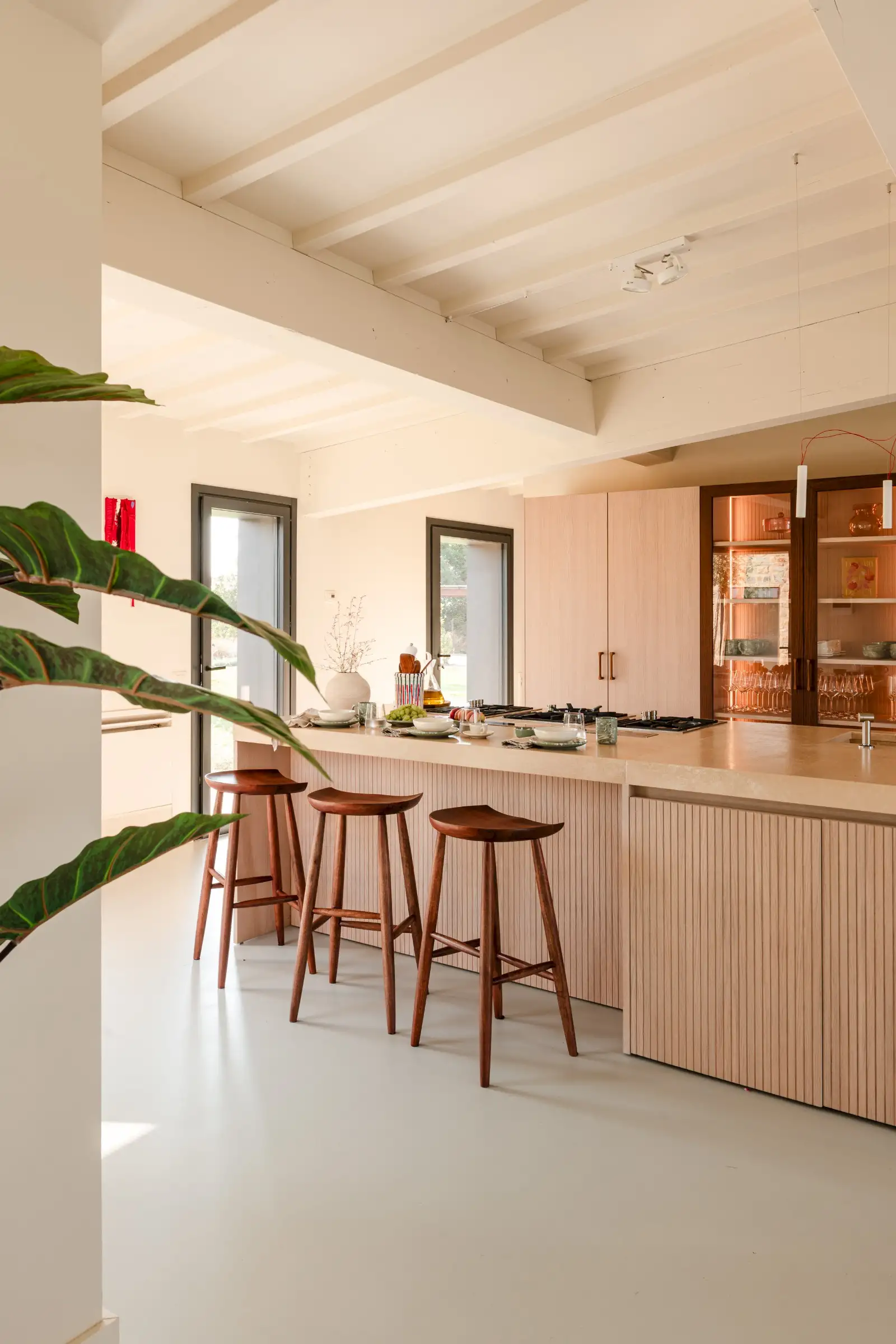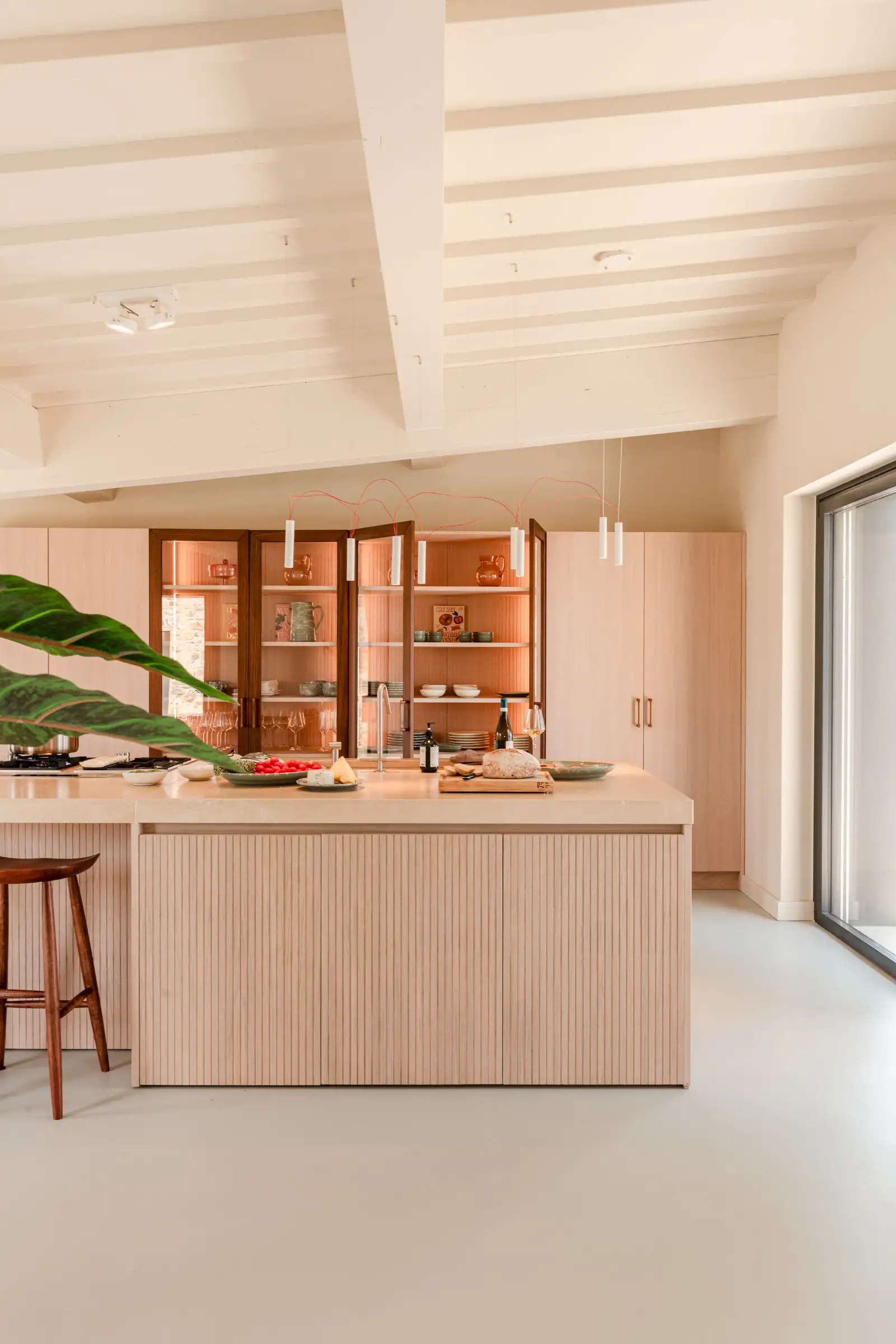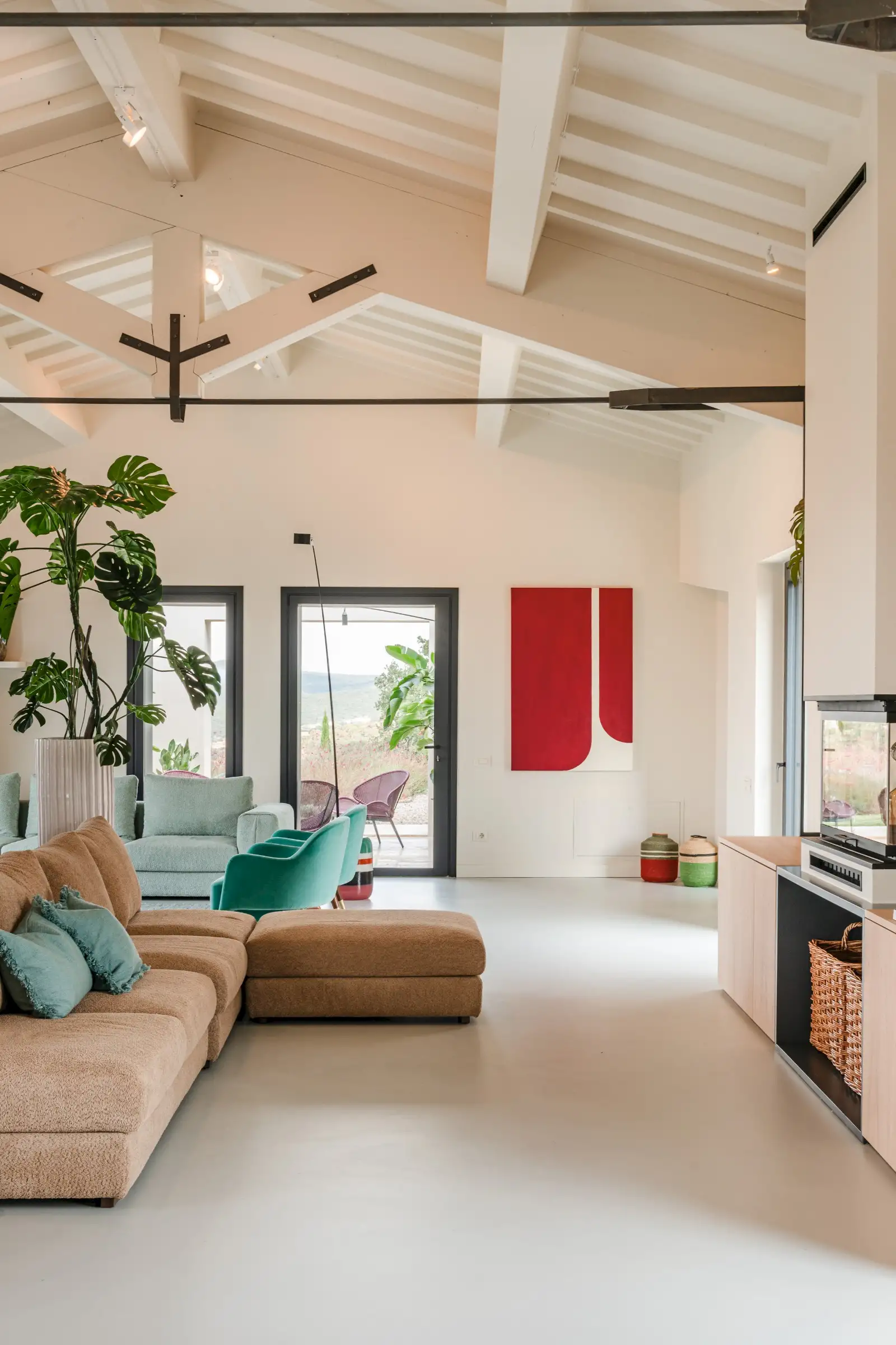 The living space takes the lead on the design notes that are replicated throughout the property and its huge size gives the feel of a modern baronial hall. A sophisticated mix of design pieces by Molteni and Fritz Hansen and lighting by Davide Groppi are given prominence, thanks to the soft neutral walls, smooth floor and vaulted lime-washed wood beamed ceiling. Built-in shelves house a modern fireplace and the three large sofas are very much for lounging on. The room is a glorious space, big yet intimate, it accommodates everyone. The same attention to high-level comfort and design can be found outside where guests can spread out on the built-in sofas or sunloungers.