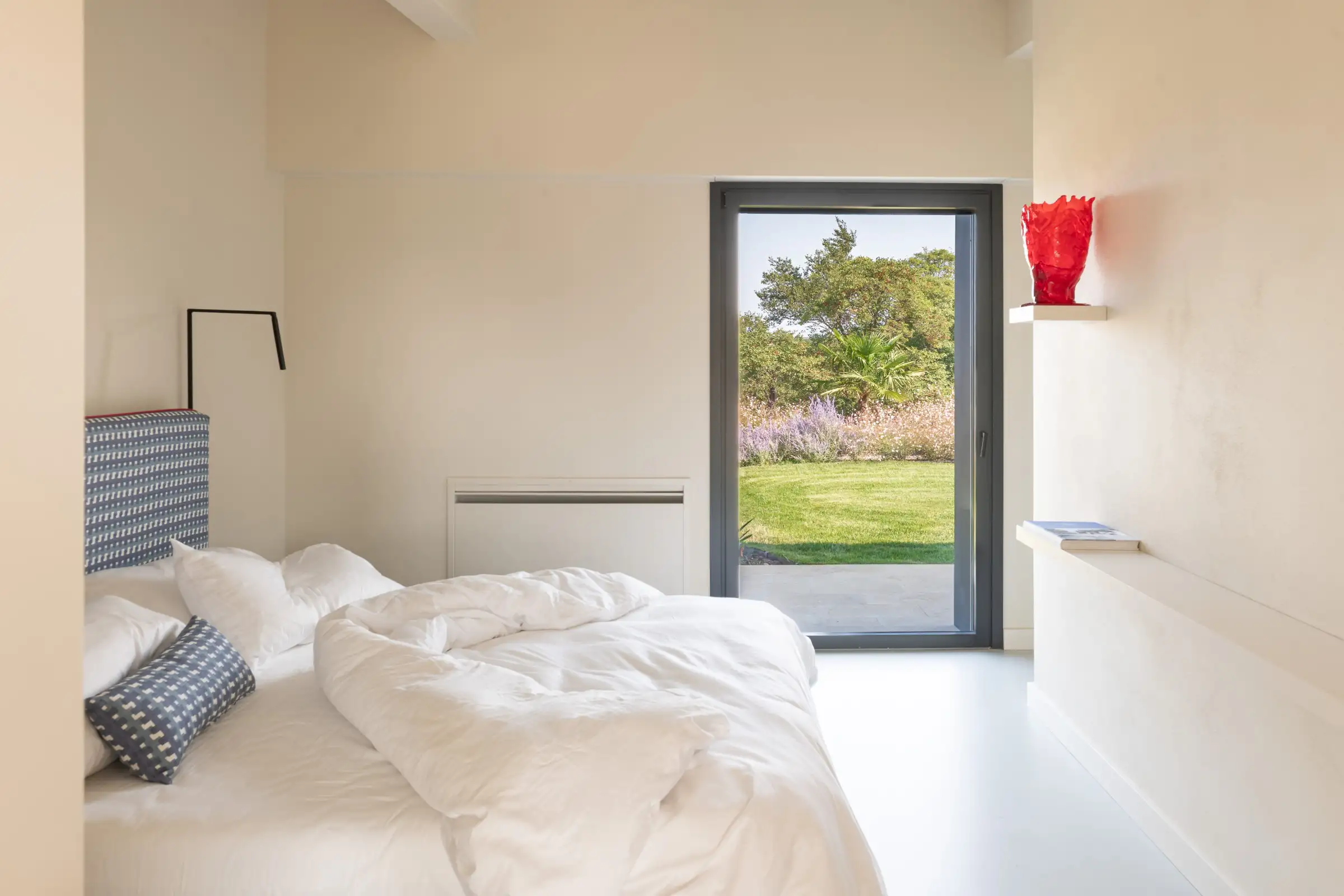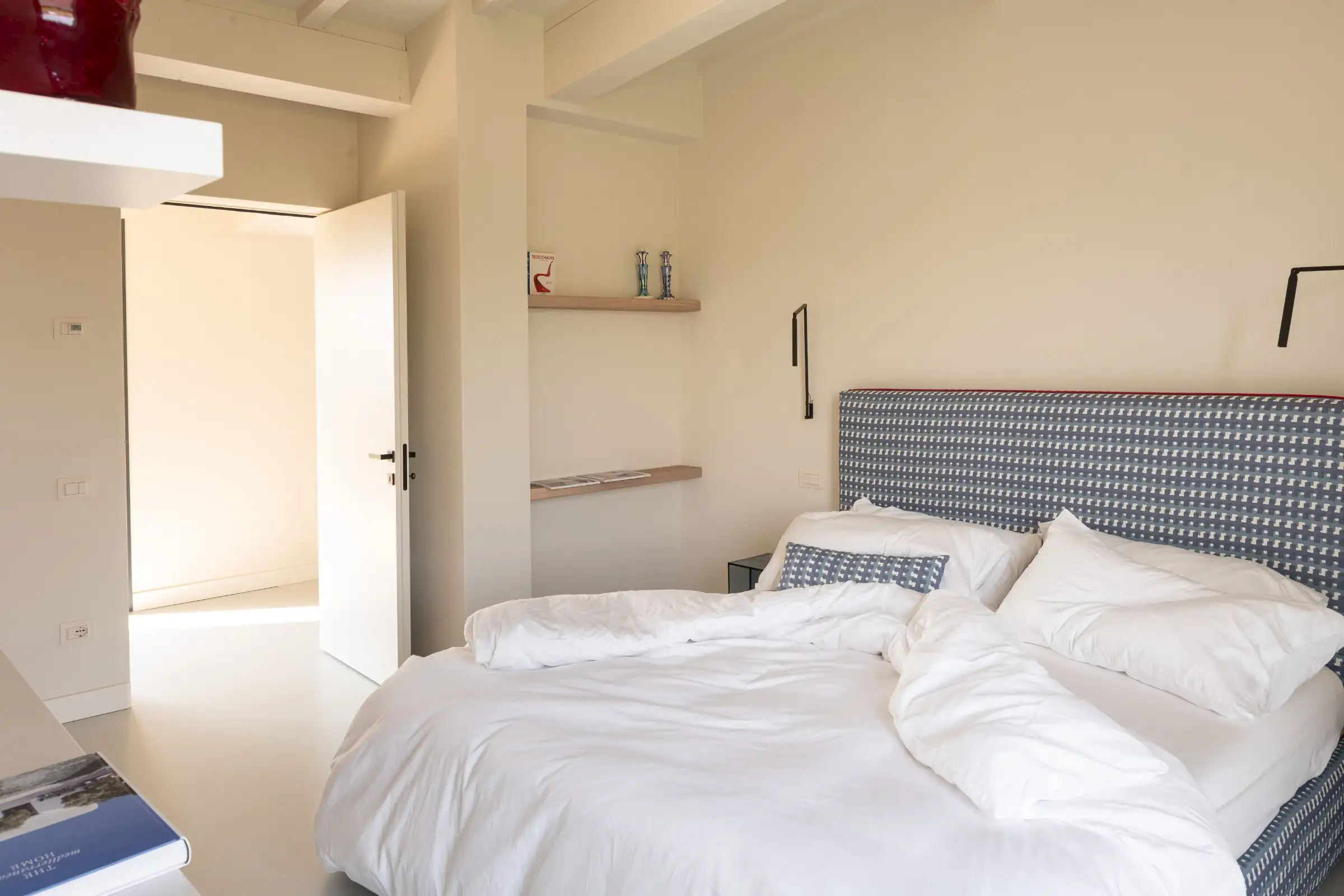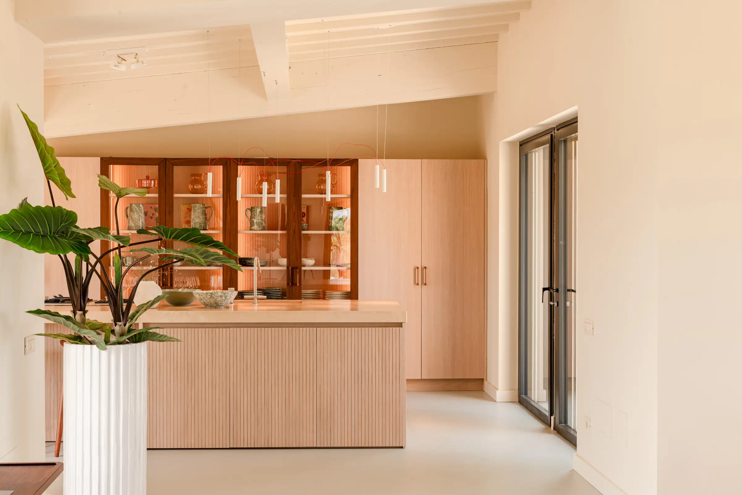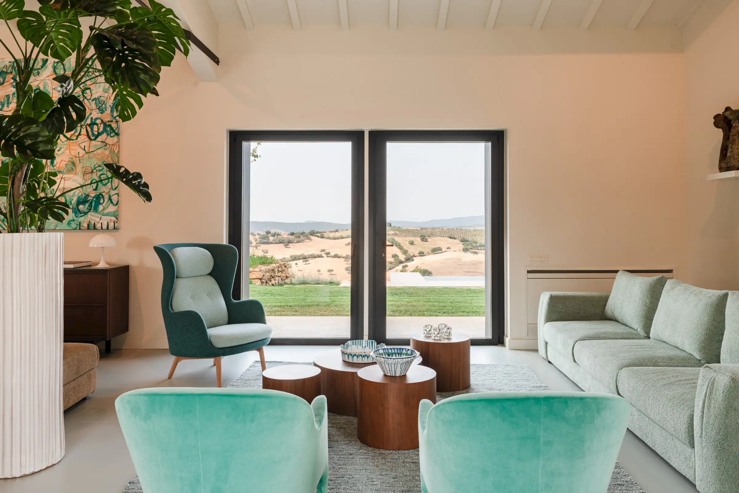 The living space takes the lead on the design notes that are replicated throughout the property and its huge size gives the feel of a modern baronial hall. A sophisticated mix of design pieces by Molteni and Fritz Hansen and lighting by Davide Groppi are given prominence, thanks to the soft neutral walls, smooth floor and vaulted lime-washed wood beamed ceiling. Built-in shelves house a modern fireplace and the three large sofas are very much for lounging on. The room is a glorious space, big yet intimate, it accommodates everyone. The same attention to high-level comfort and design can be found outside where guests can spread out on the built-in sofas or sunloungers.