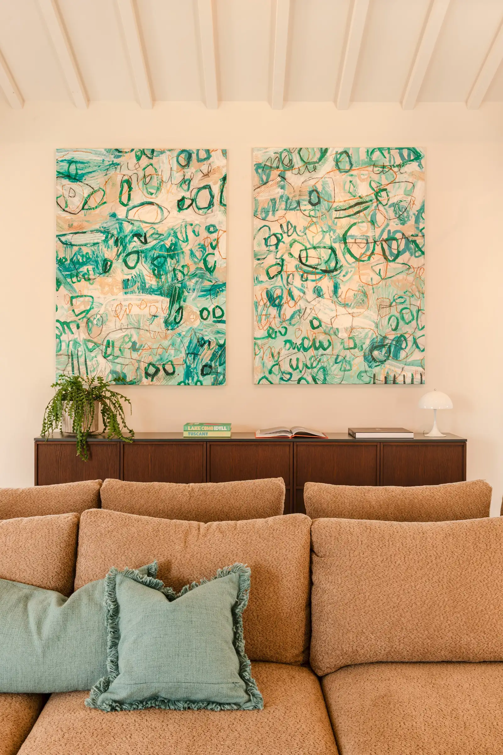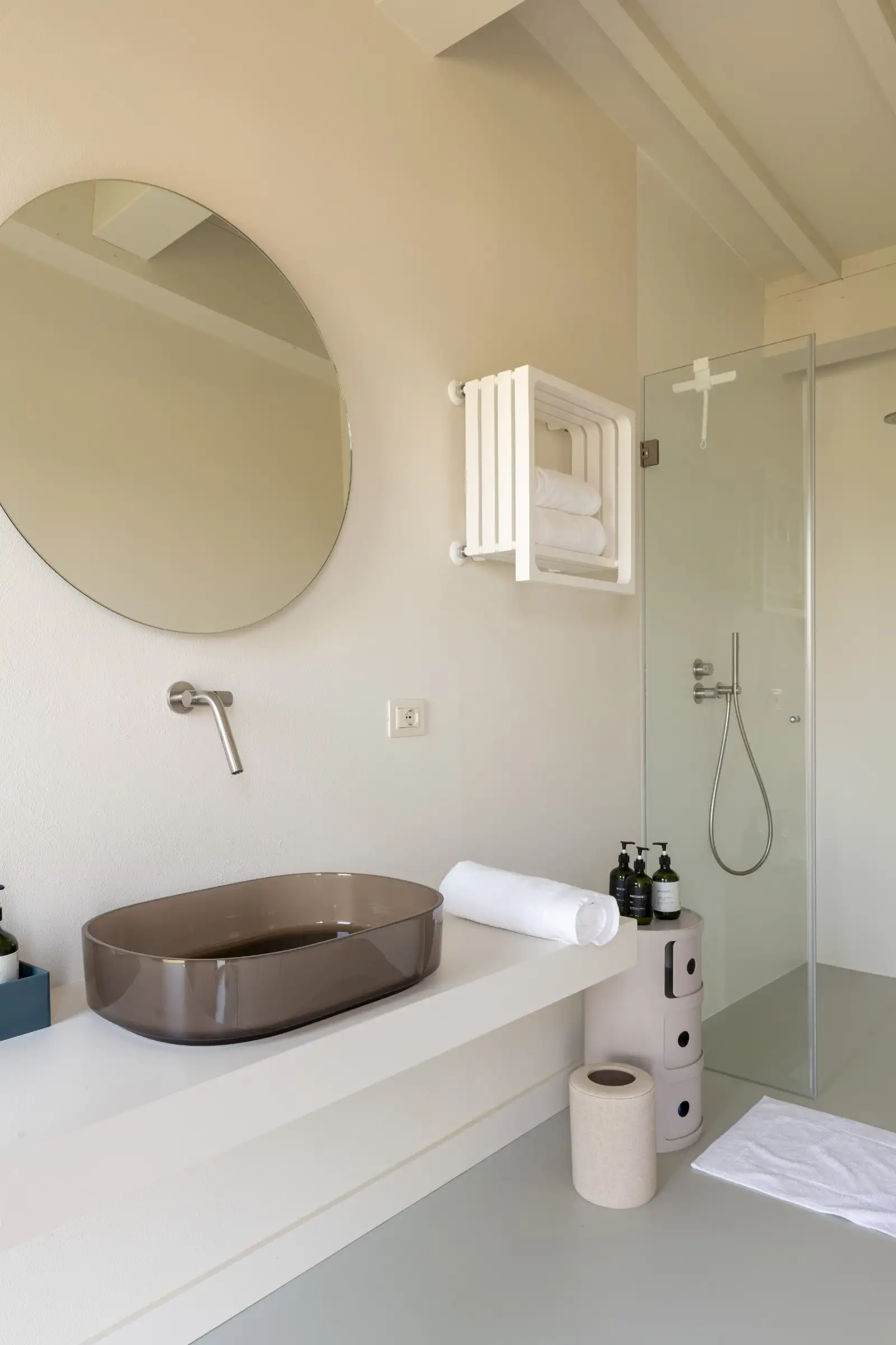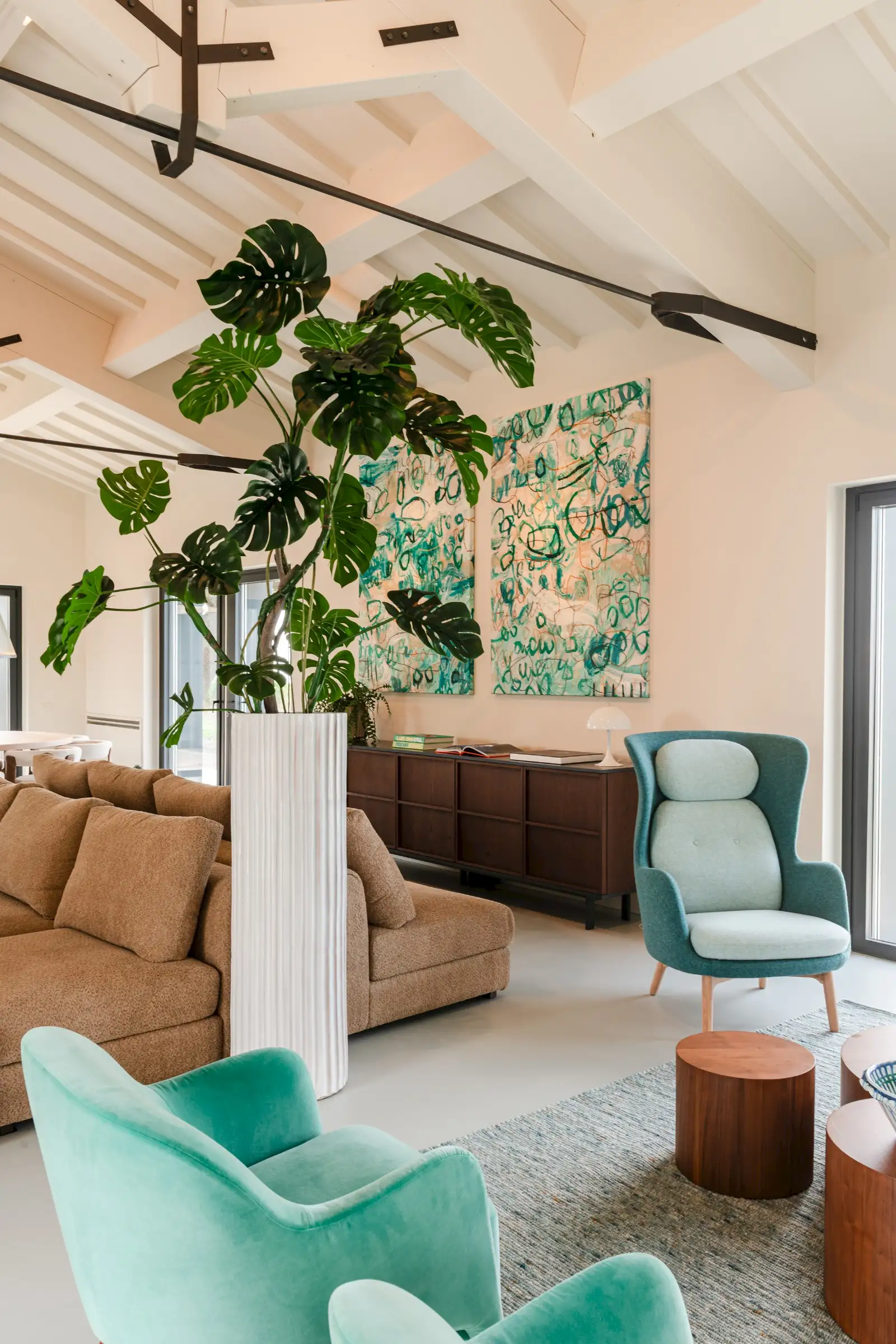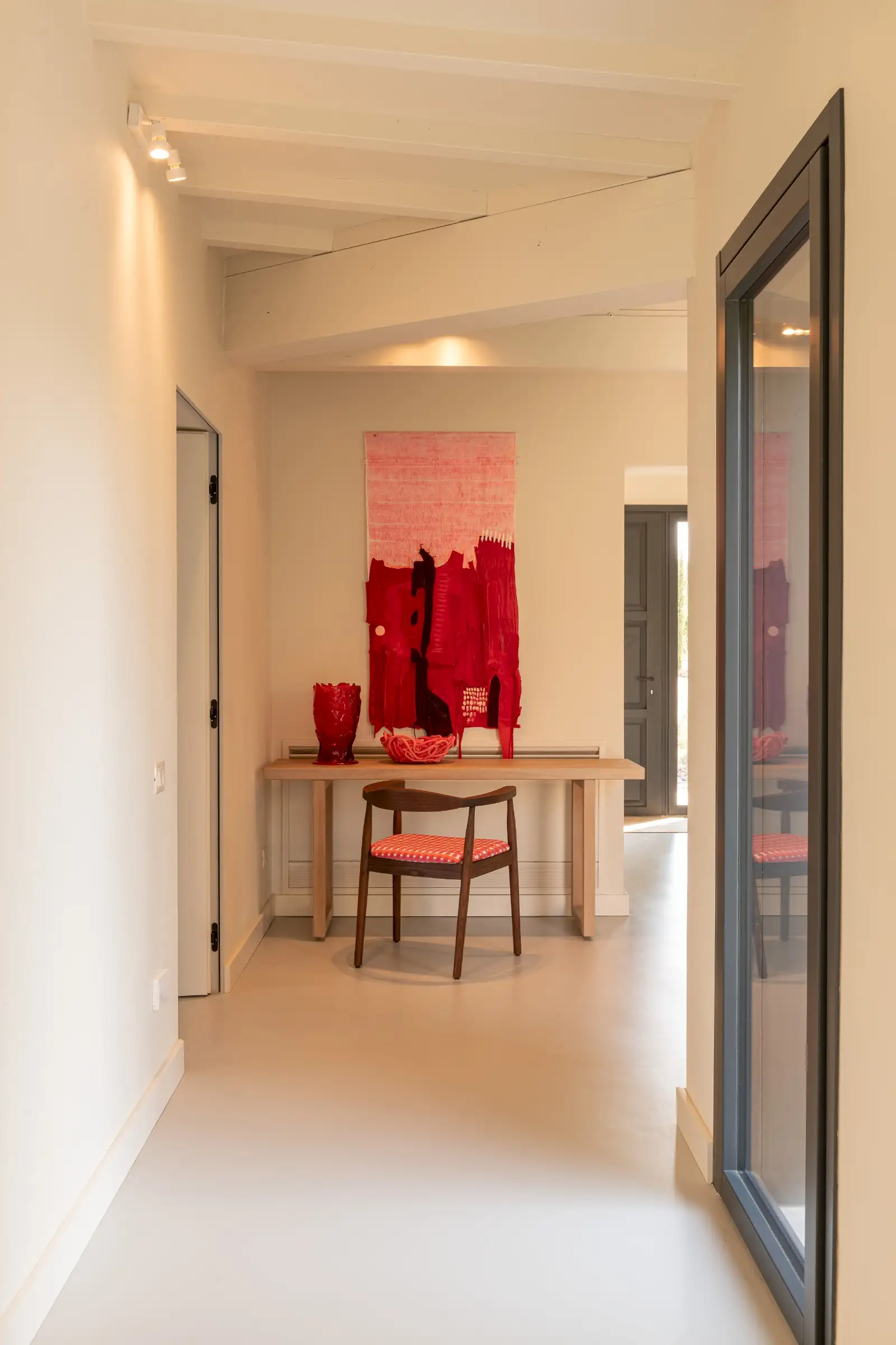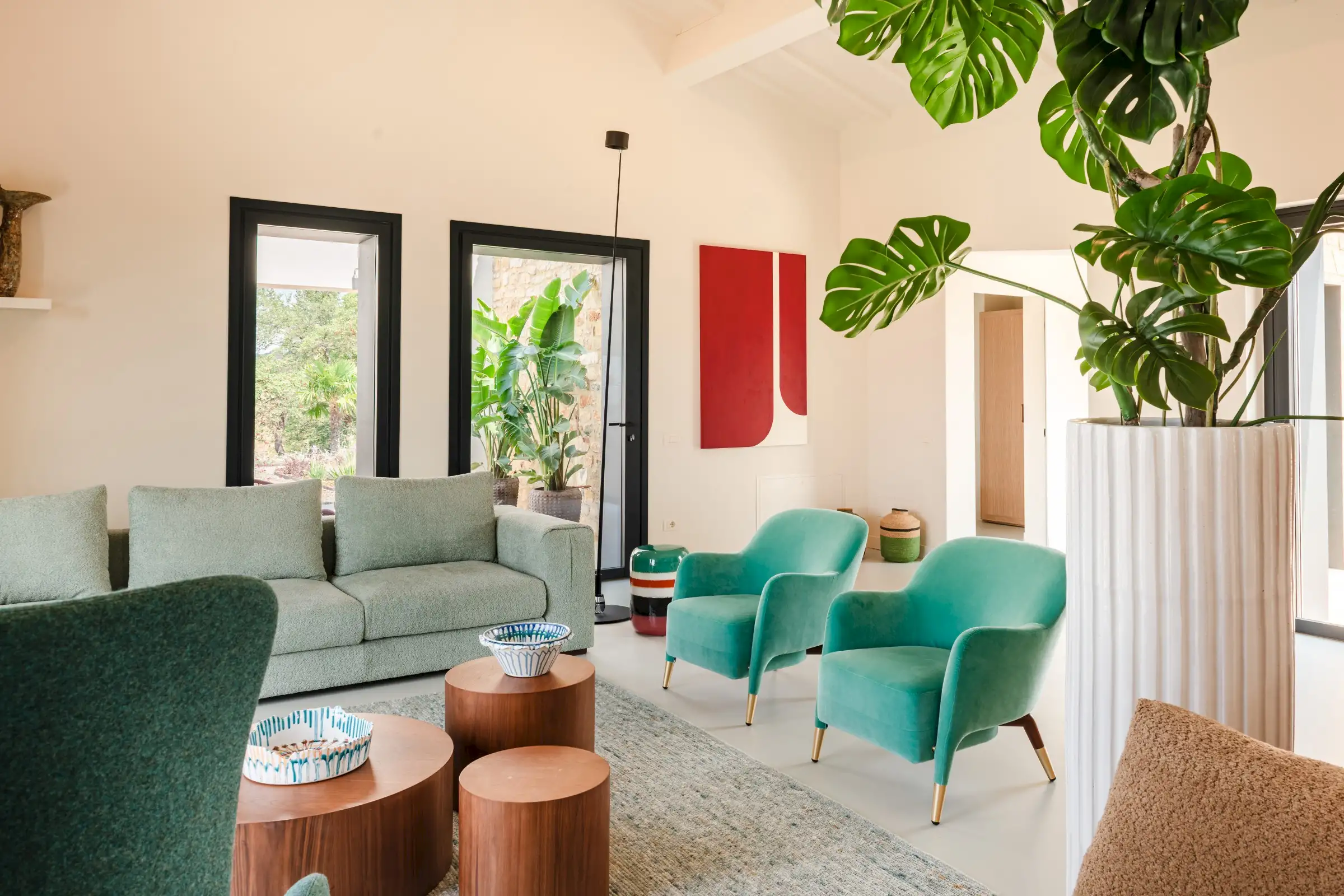 The living space takes the lead on the design notes that are replicated throughout the property and its huge size gives the feel of a modern baronial hall. A sophisticated mix of design pieces by Molteni and Fritz Hansen and lighting by Davide Groppi are given prominence, thanks to the soft neutral walls, smooth floor and vaulted lime-washed wood beamed ceiling. Built-in shelves house a modern fireplace and the three large sofas are very much for lounging on. The room is a glorious space, big yet intimate, it accommodates everyone. The same attention to high-level comfort and design can be found outside where guests can spread out on the built-in sofas or sunloungers.