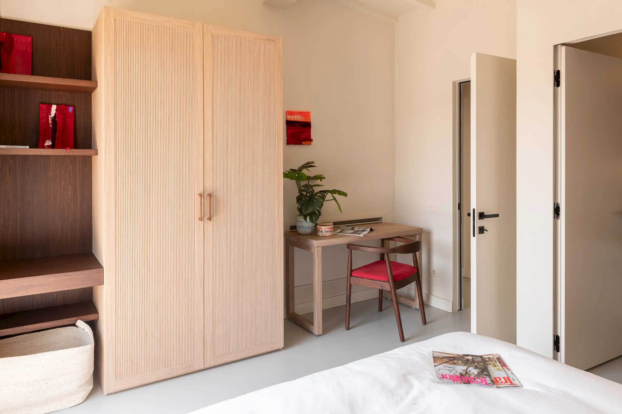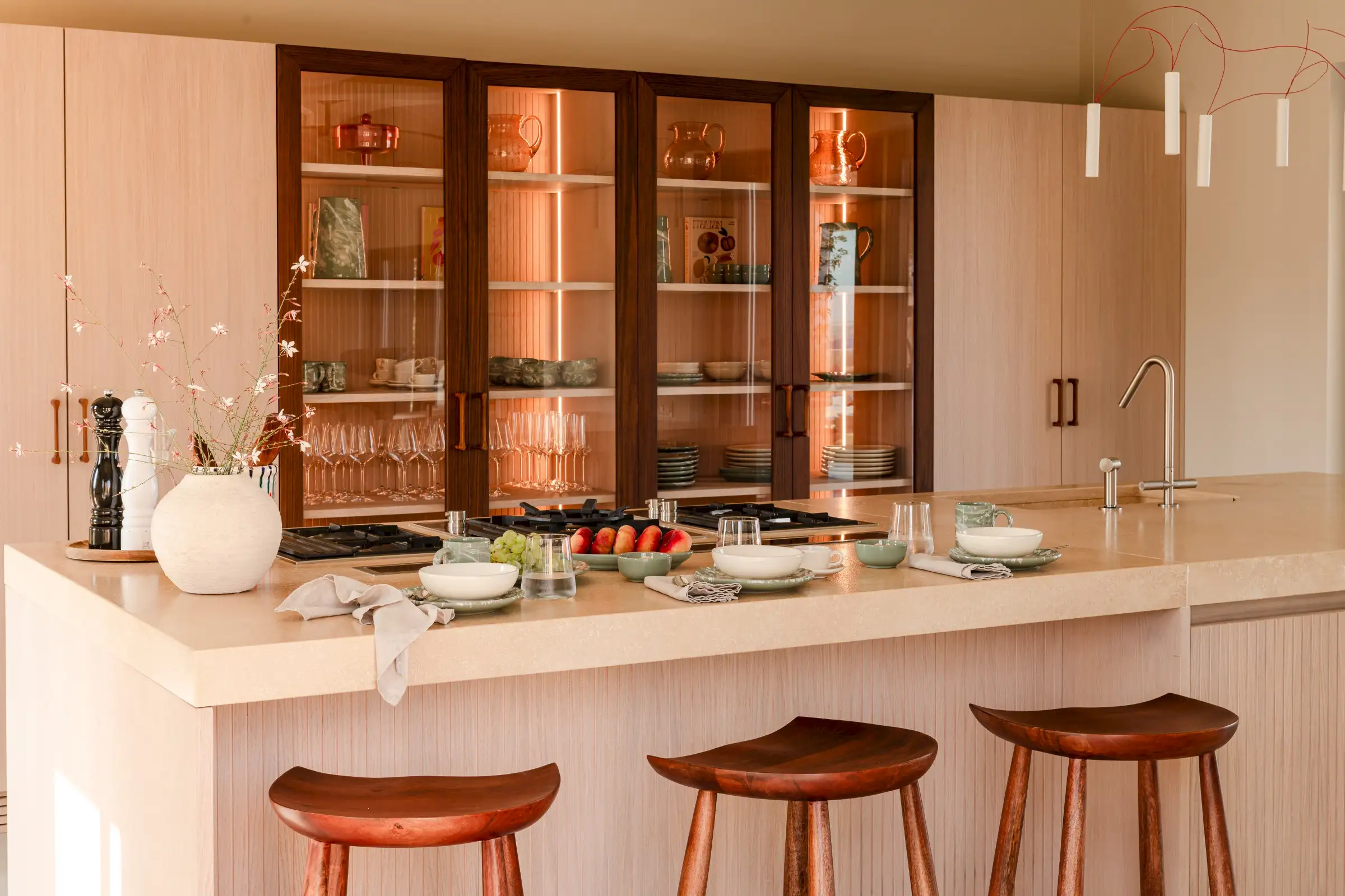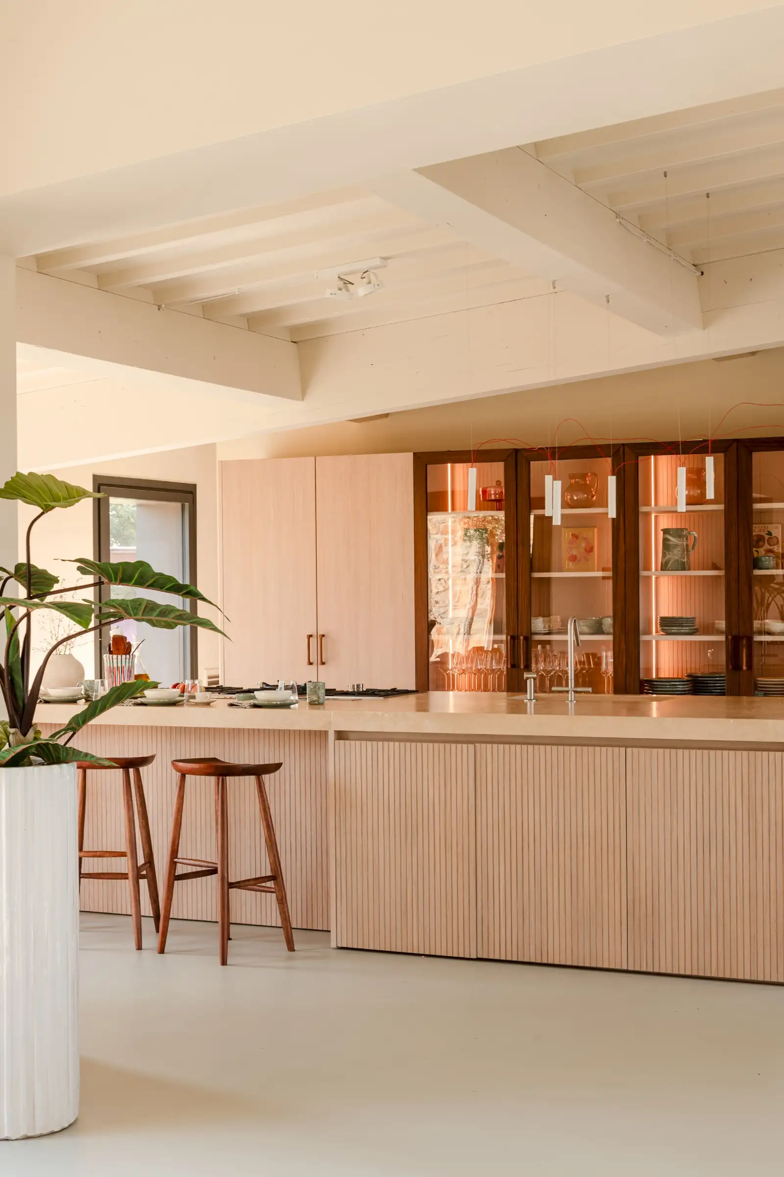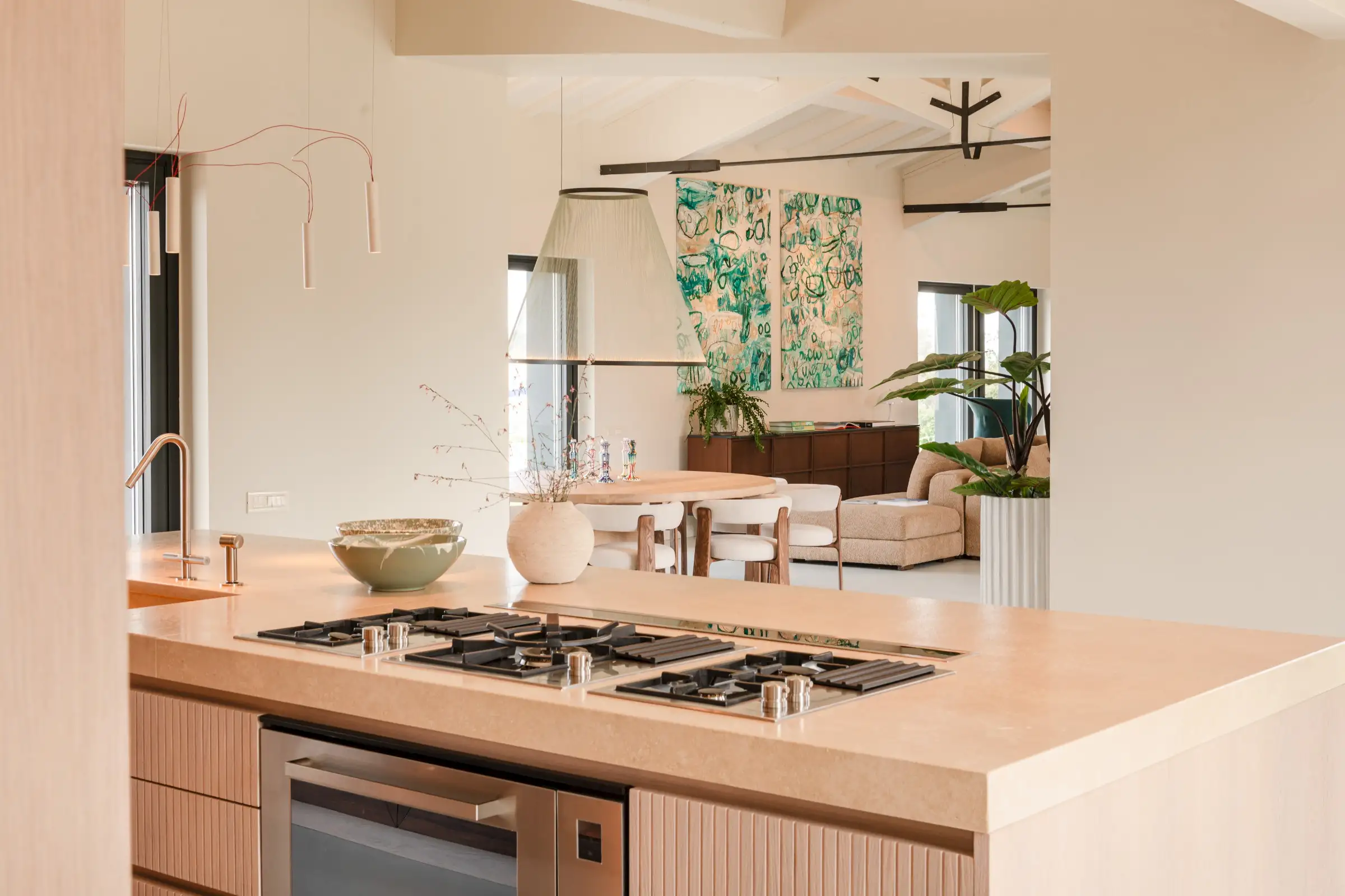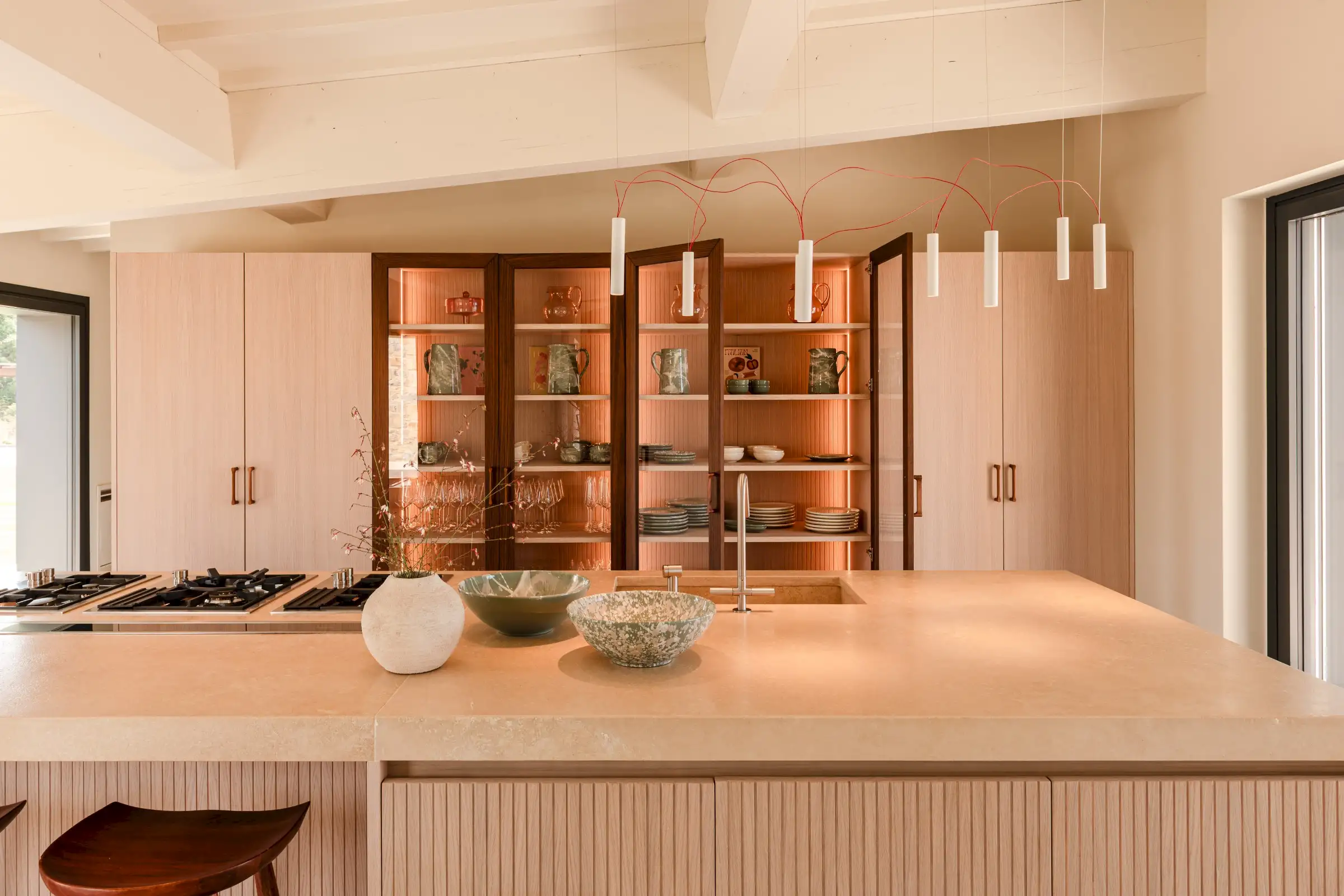 The main kitchen sits at one end of the open-plan living space. The magnificent made-to-measure island handcrafted in fluted oak is topped by beautiful travertine and houses the hob, sink and oven. Lit by Davide Groppi pendants, the kitchen’s flawless, thoughtful design makes this as much a space for chefs as for aesthetes. The only other piece of furniture is a large handbuilt oak, walnut and fluted glass wall cabinet. To make life fabulously easy, there is a hidden prep kitchen behind and a separate pantry which includes an ice cube maker, the laundry as well as a second dishwasher.