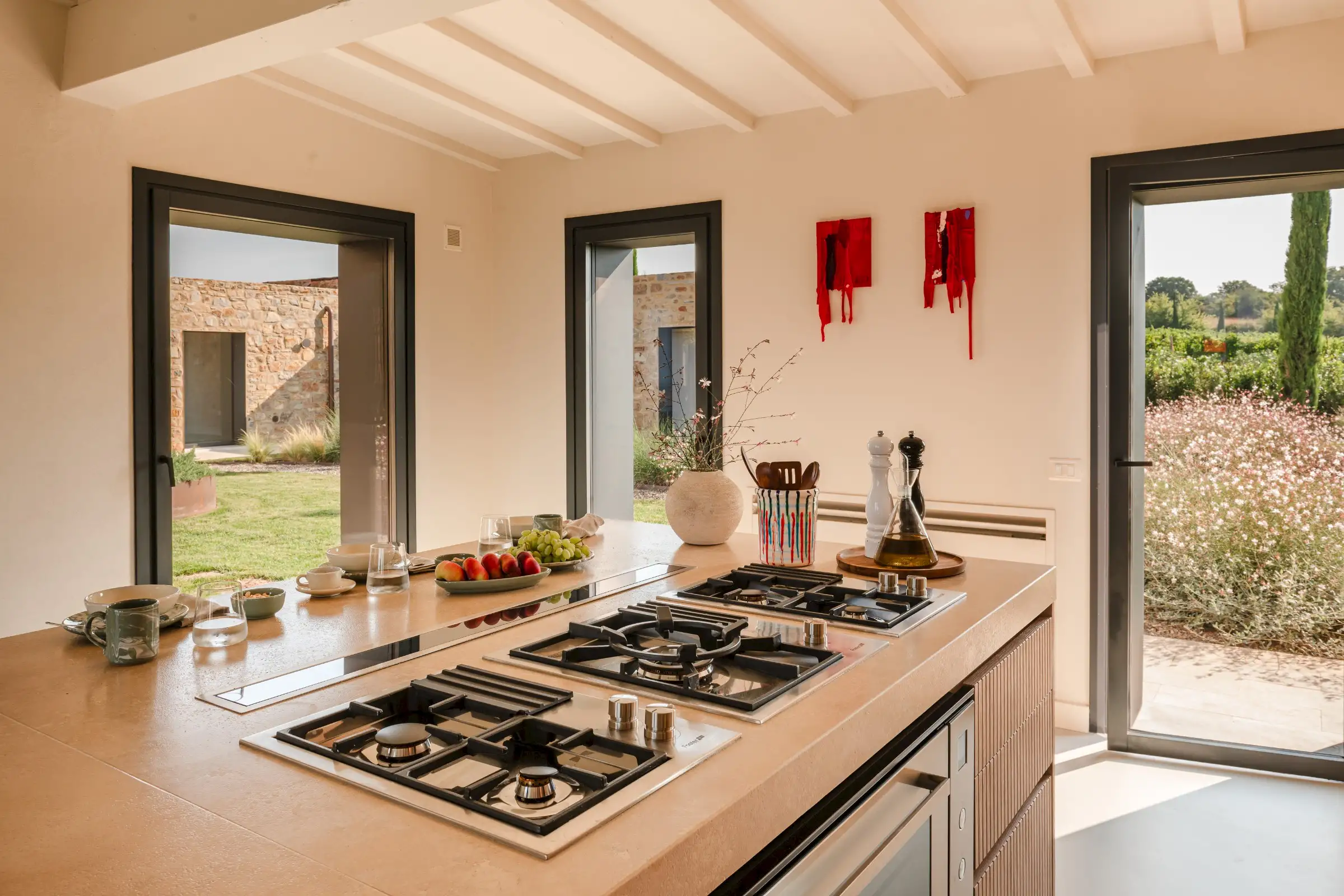 La Marea is a stunning contemporary property for ten overlooking the coast in the Maremma region of Tuscany. The magnificent views in every direction include the Tuscan archipelago and the rolling vine-clad hills that produce the region’s celebrated Vermentino whites and Morello di Scansano reds. In fact, the house sits on the Podere Poggi Bestiale wine estate and a tasting session is just a short walk away.