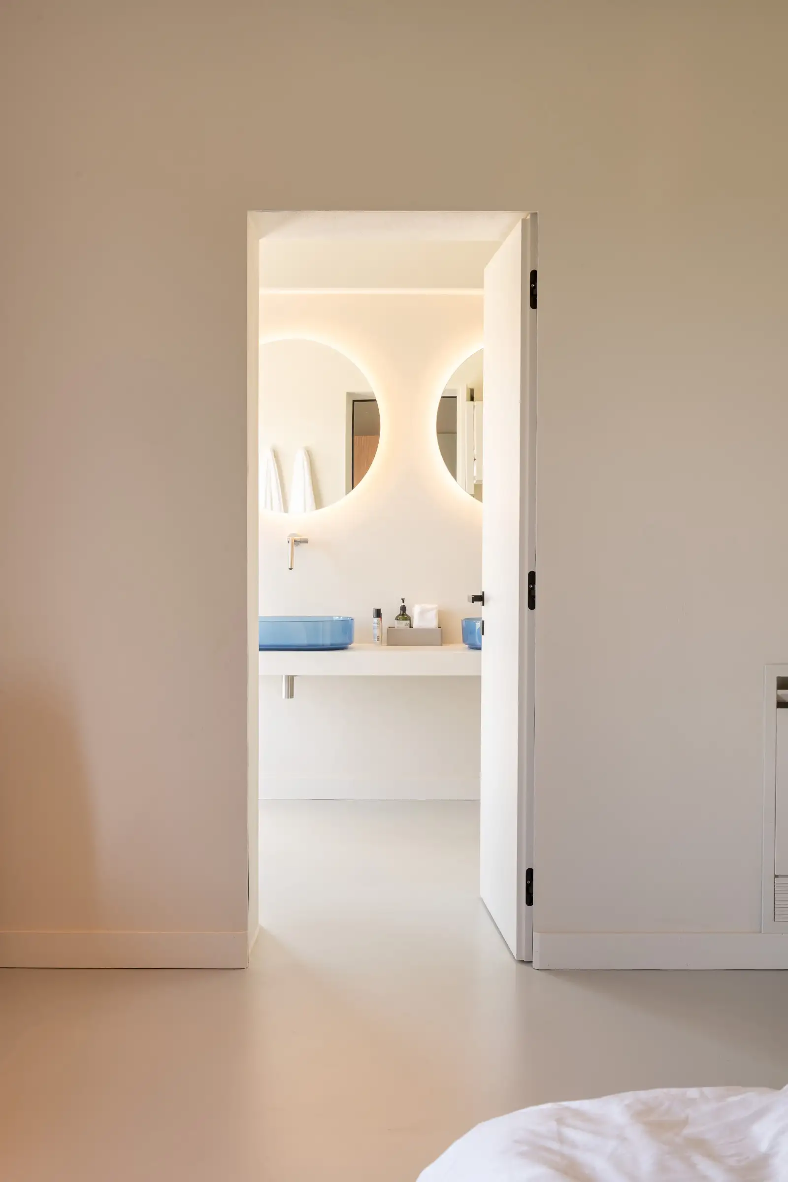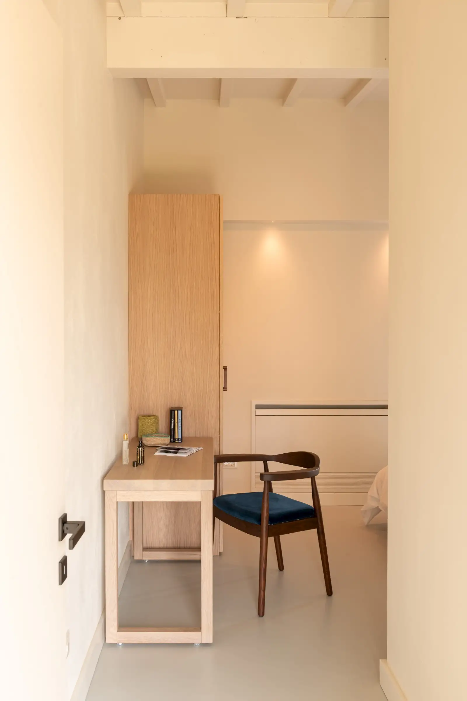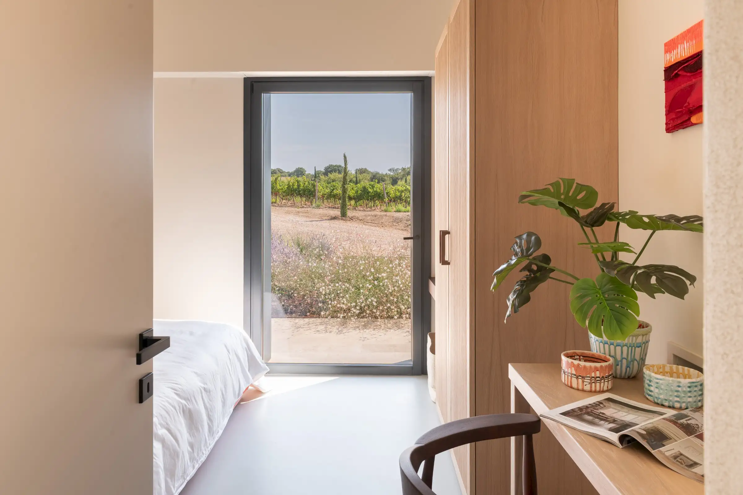 The property sleeps ten in five good size en-suite doubles with super-king-size beds made up with extra-large duvets and crisp white cotton sheets - all designed to enable you to sleep really well. Wardrobes, desks and floating bedside tables are in natural oak or walnut, and each room has doors to the terrace.