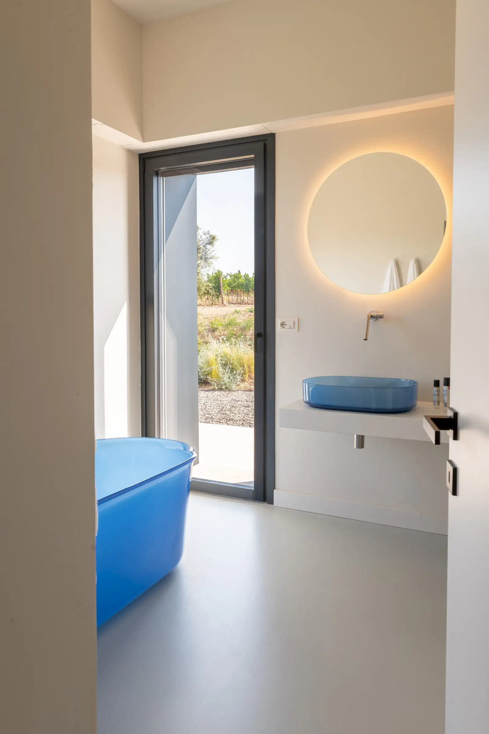 Each room has an en-suite. High-performance fixtures and fittings come as standard, while the basins are colourful transparent resin. The principal room also has a blue transparent resin bath.