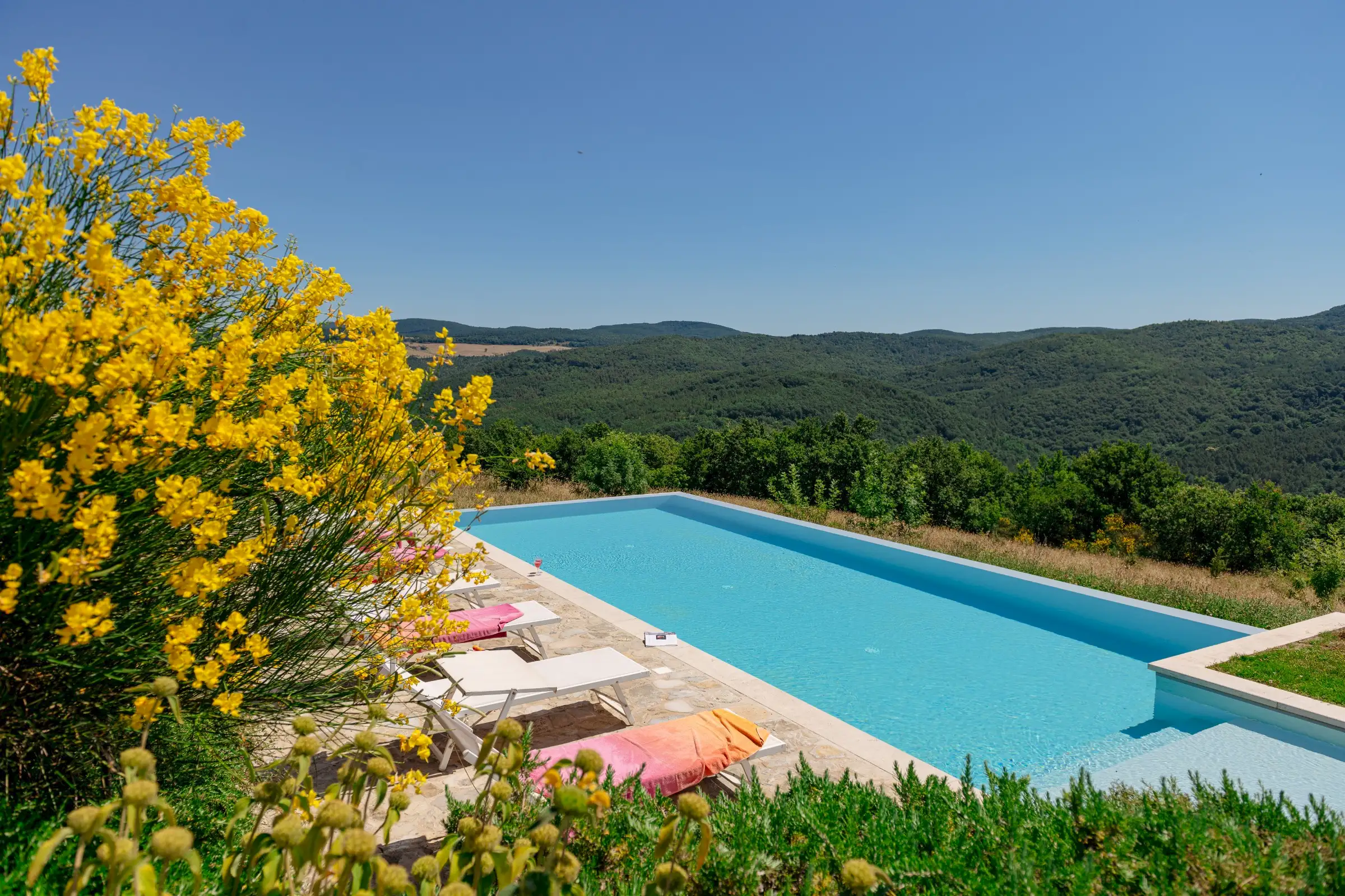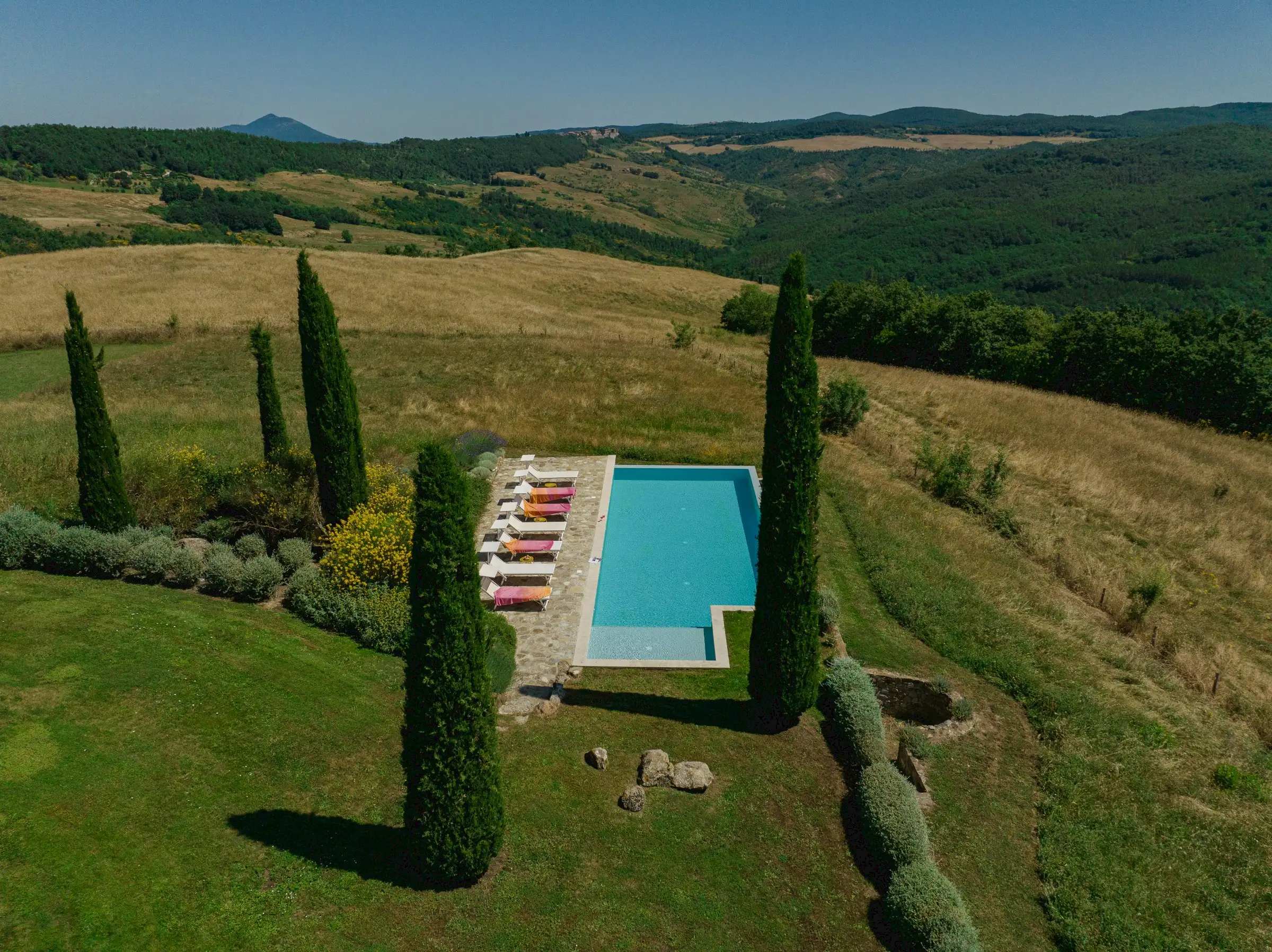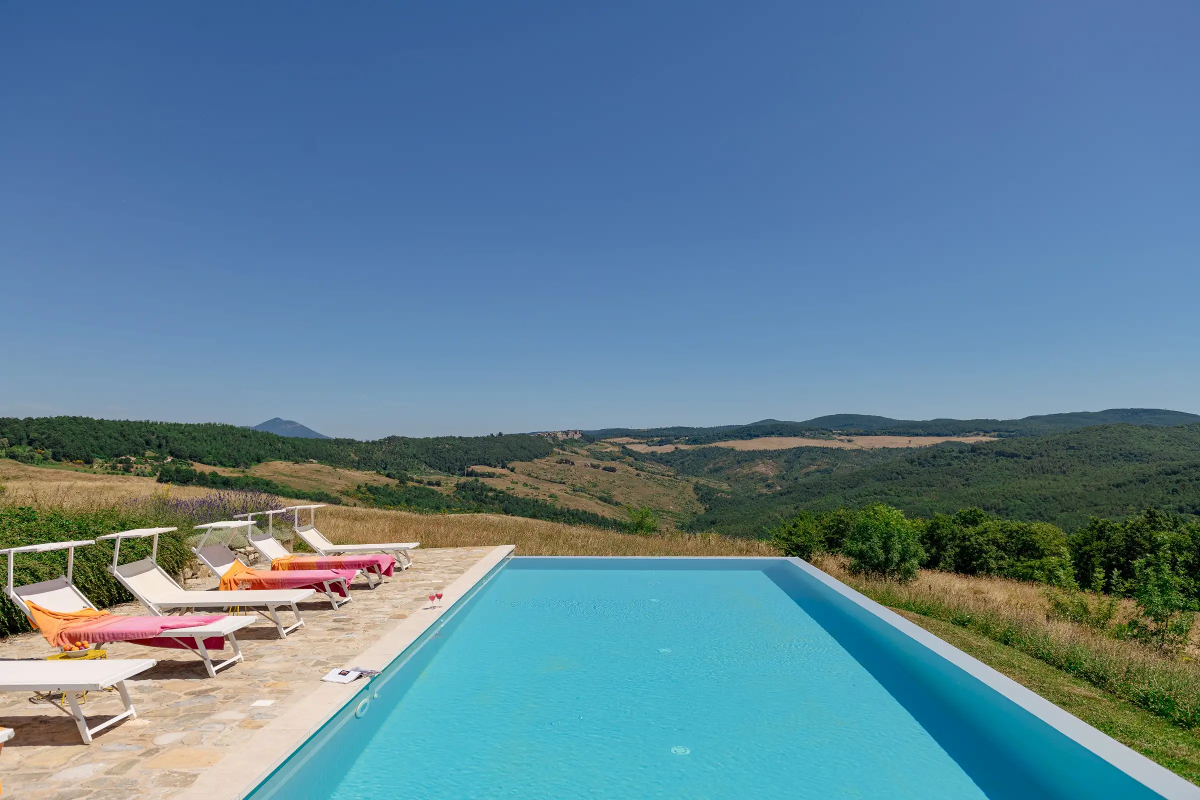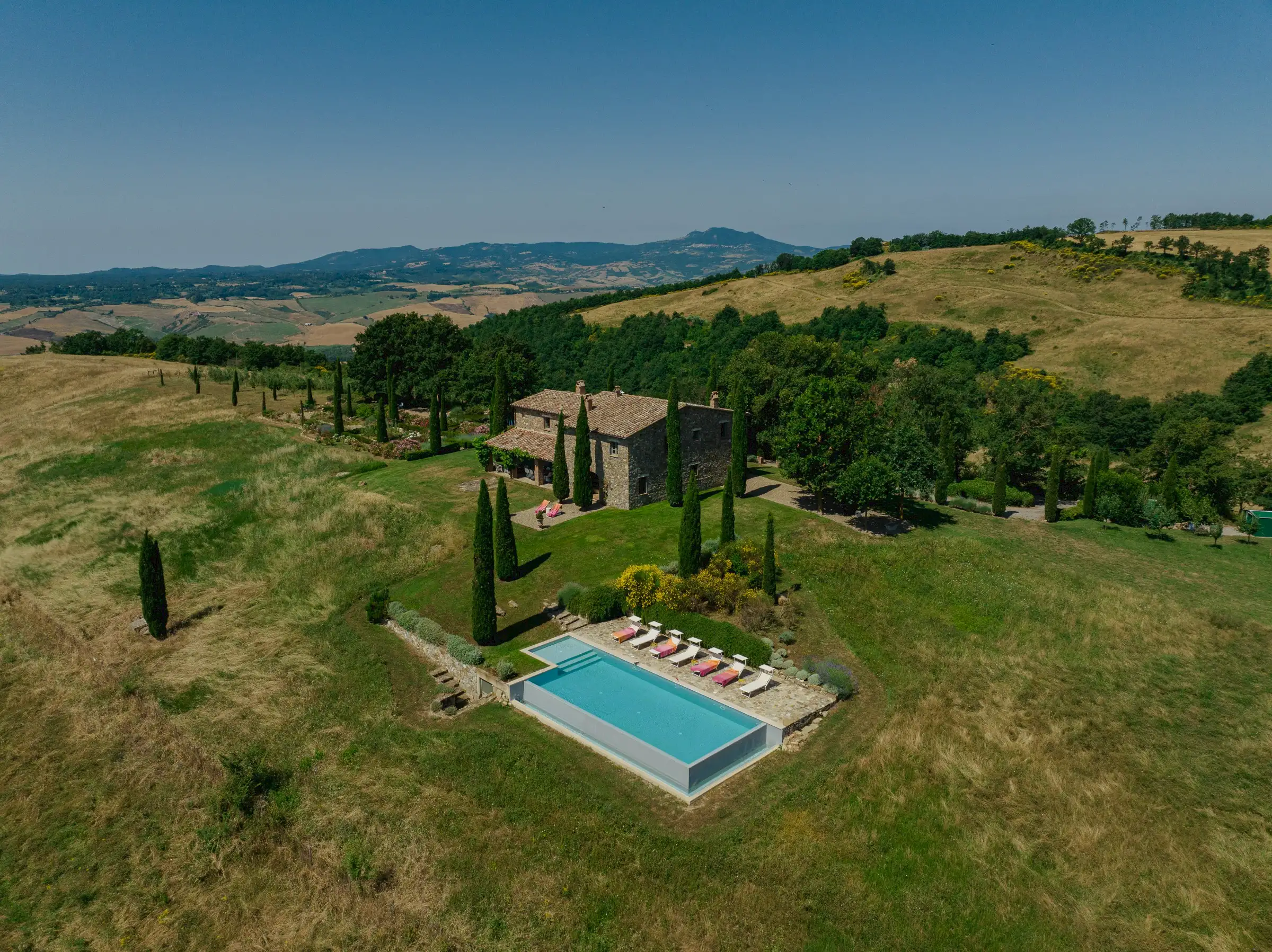 A special feature of the house is a 10 meter (30 foot) long outside portico with stunning views of Monte Rufeno and the valley of the Paglia River. The custom stone table which seats twelve is a great place for breakfast, lunch, or dinner. A wood-burning fireplace allows for outdoor cooking. There is also a comfortable seating area that is the perfect place for reading a book or sipping a glass of wine. The grounds encompass four acres carved out of several hundred acres of sheep pastures and woods. An old existing pond south of the house was restored to become an open air cistern fed by a deep well for the new irrigation system. By taking advantage of the century old oak trees around it and by creating a new gravel terrace overlooking the Paglia Valley below, the pond is now a restful and shady oasis with hammocks   for relaxing on hot summer days. A newly planted olive grove, with over 60 plants right beneath the pond, restores Podere Patrizio’s former agricultural glory and beauty. Cypress and elm, wild pear and apple trees, wild plum and rose bushes define the driveway from the main road. The pool is built with a double infinity edge to allow for the full enjoyment of the surrounding views. It measures a generous 5 x 13 meters [16 x43 feet] and has a comfortable shallow area for children and non-swimmers. It is flanked by a large stone patio with comfortable sun beds for tanning, reading, or napping. The pool is heated by solar panels, which cannot guarantee warm water in Spring and Autumn, as it all depends on sun presence.