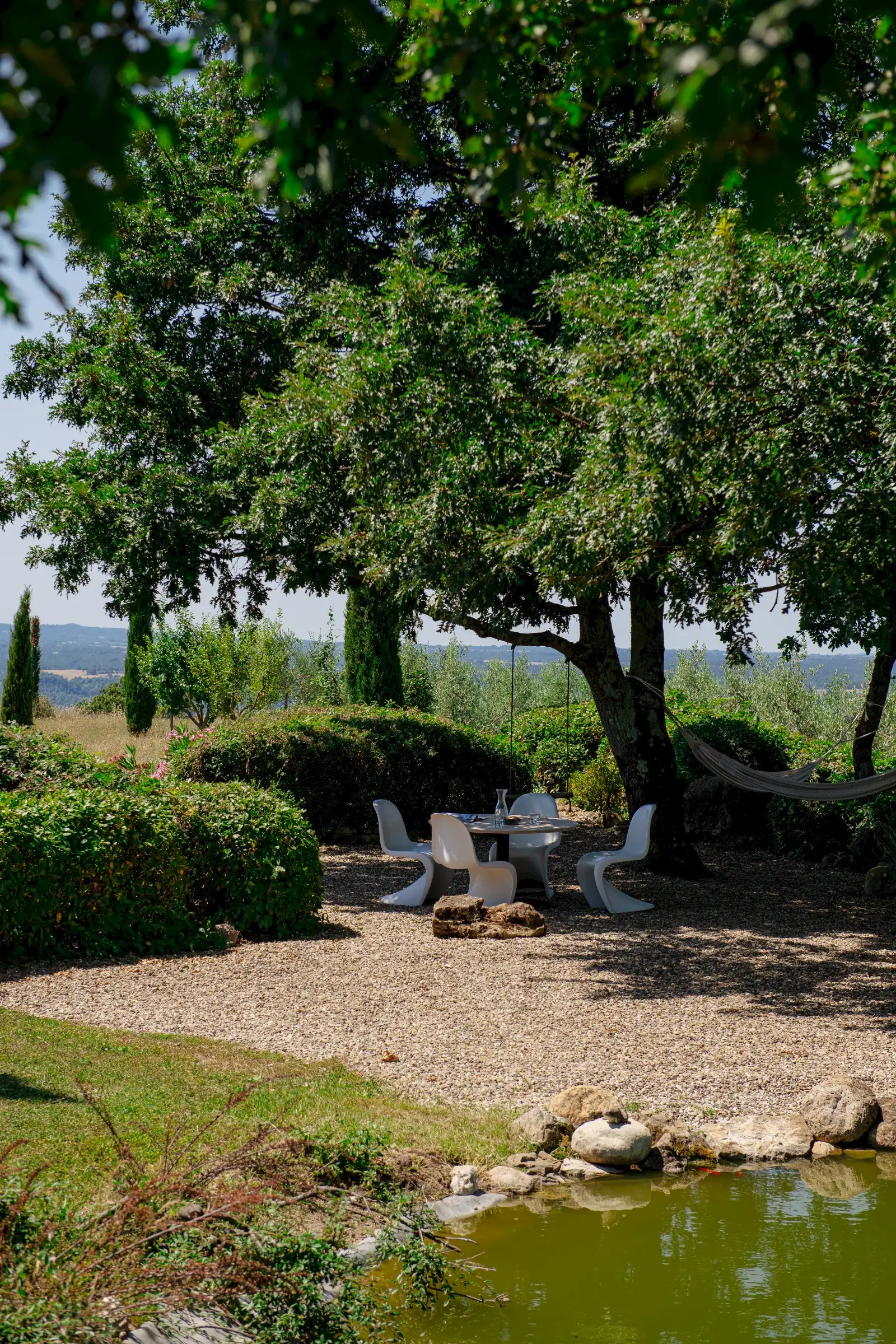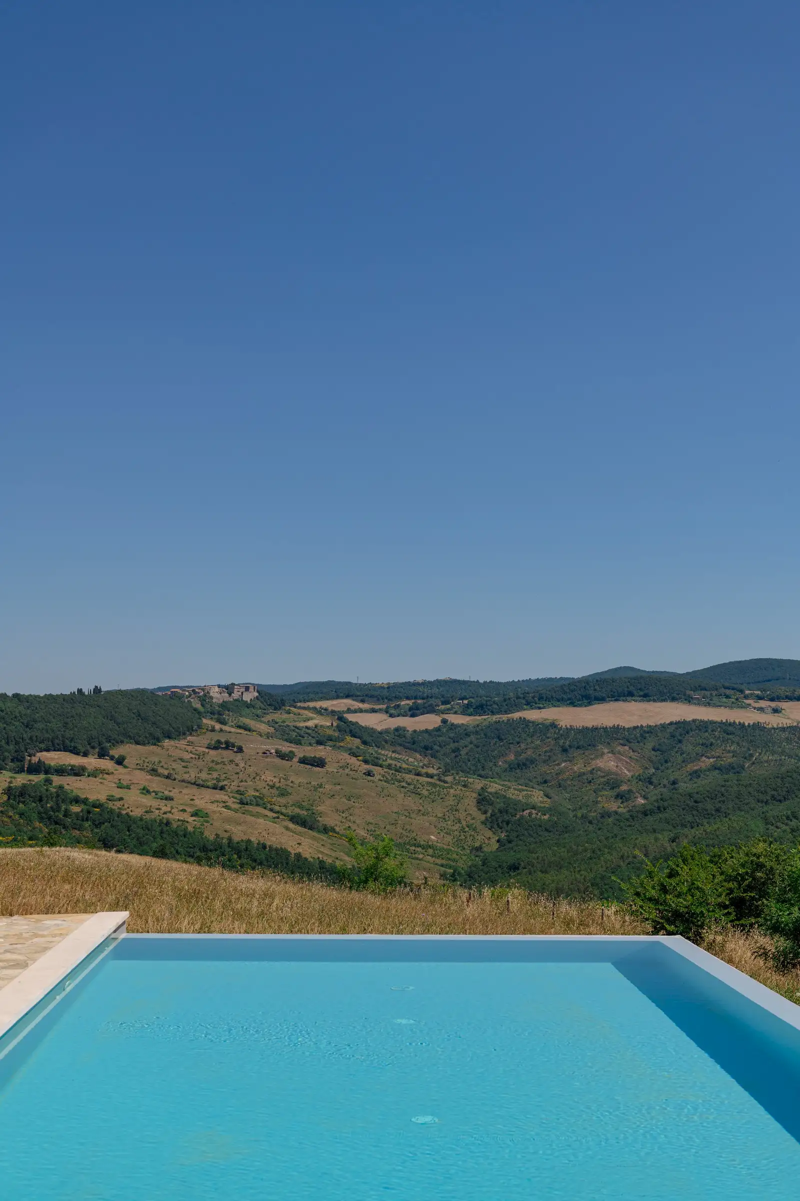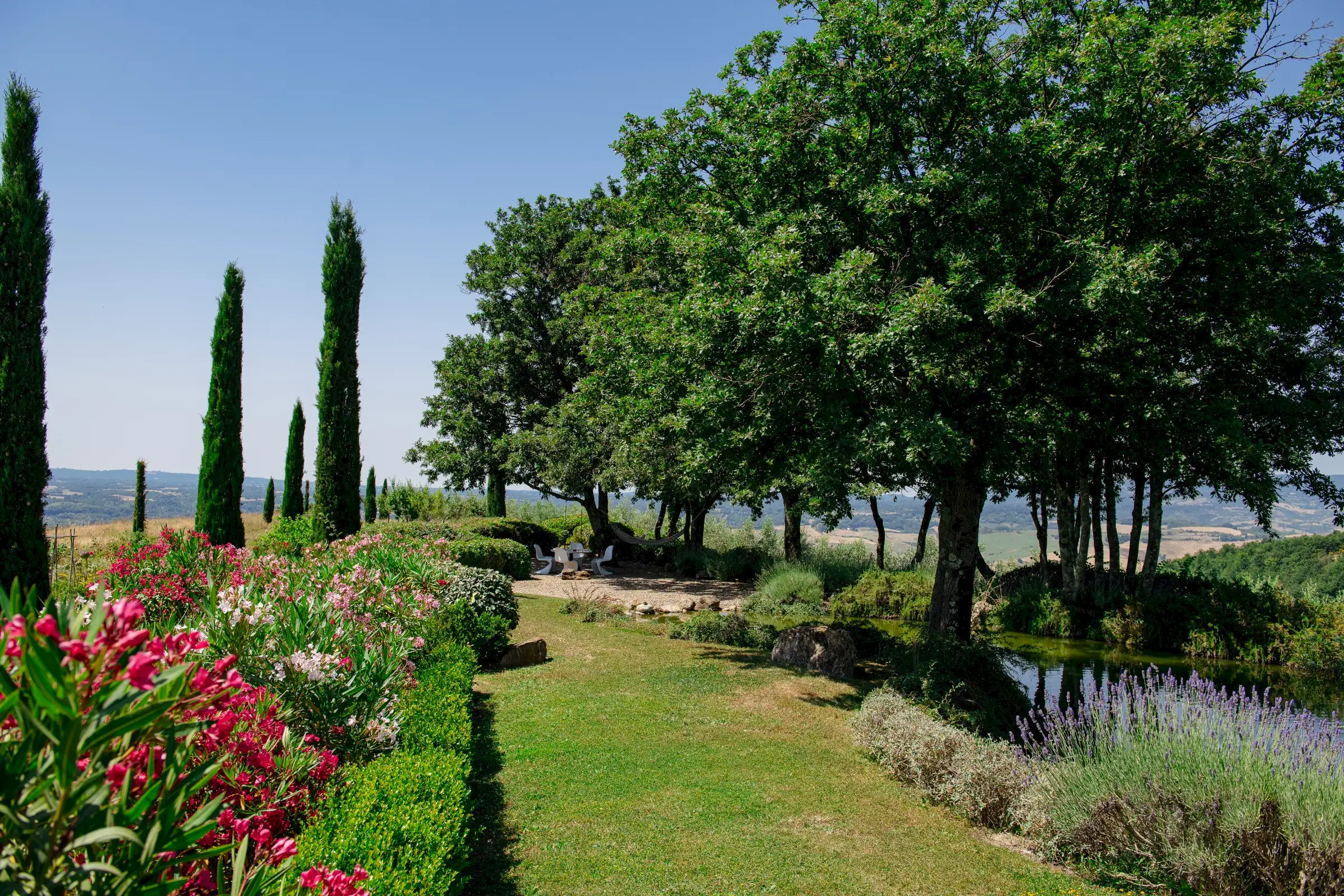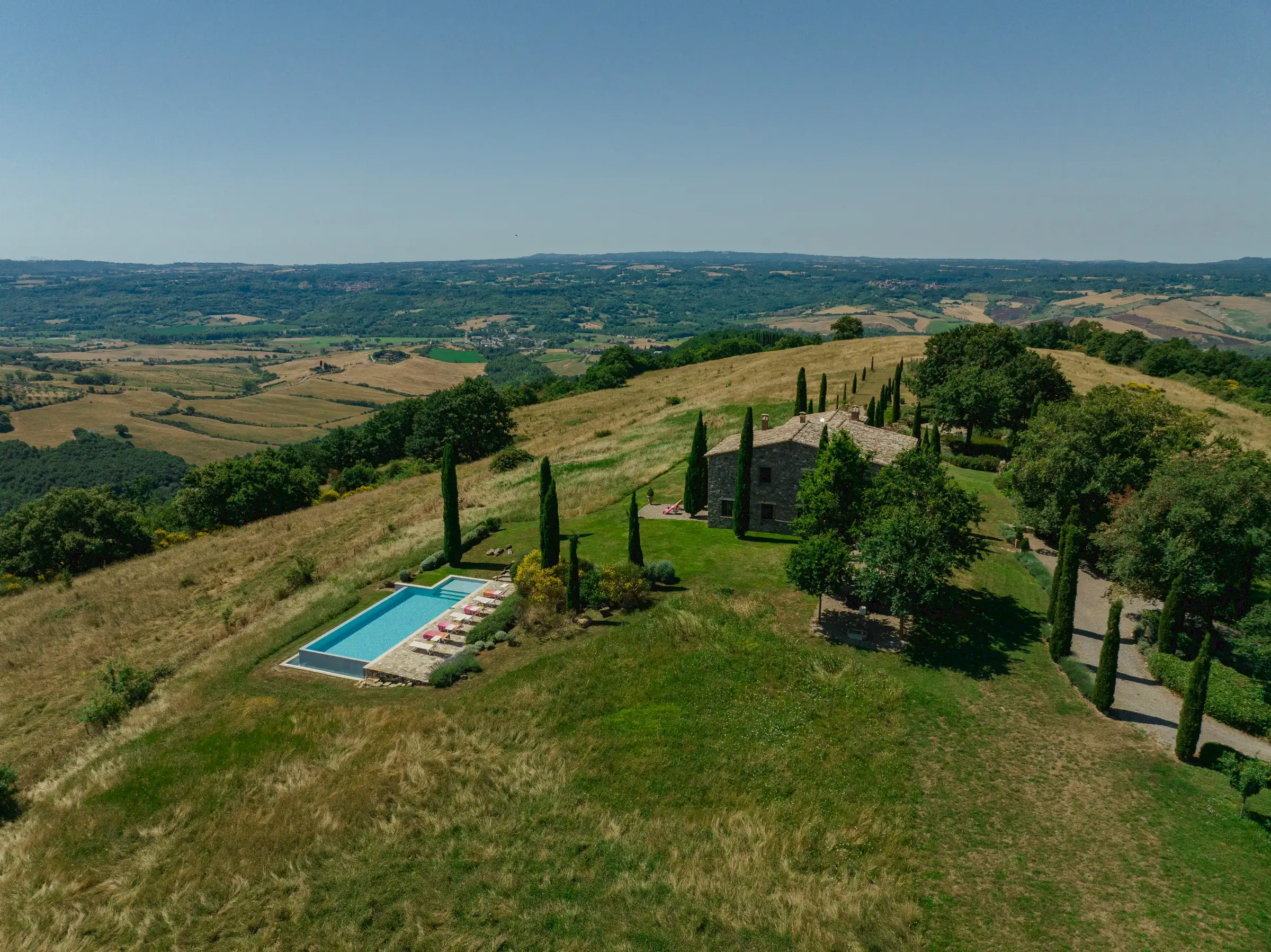 A special feature of the house is a 10 meter (30 foot) long outside portico with stunning views of Monte Rufeno and the valley of the Paglia River. The custom stone table which seats twelve is a great place for breakfast, lunch, or dinner. A wood-burning fireplace allows for outdoor cooking. There is also a comfortable seating area that is the perfect place for reading a book or sipping a glass of wine. The grounds encompass four acres carved out of several hundred acres of sheep pastures and woods. An old existing pond south of the house was restored to become an open air cistern fed by a deep well for the new irrigation system. By taking advantage of the century old oak trees around it and by creating a new gravel terrace overlooking the Paglia Valley below, the pond is now a restful and shady oasis with hammocks   for relaxing on hot summer days. A newly planted olive grove, with over 60 plants right beneath the pond, restores Podere Patrizio’s former agricultural glory and beauty. Cypress and elm, wild pear and apple trees, wild plum and rose bushes define the driveway from the main road. The pool is built with a double infinity edge to allow for the full enjoyment of the surrounding views. It measures a generous 5 x 13 meters [16 x43 feet] and has a comfortable shallow area for children and non-swimmers. It is flanked by a large stone patio with comfortable sun beds for tanning, reading, or napping. The pool is heated by solar panels, which cannot guarantee warm water in Spring and Autumn, as it all depends on sun presence.