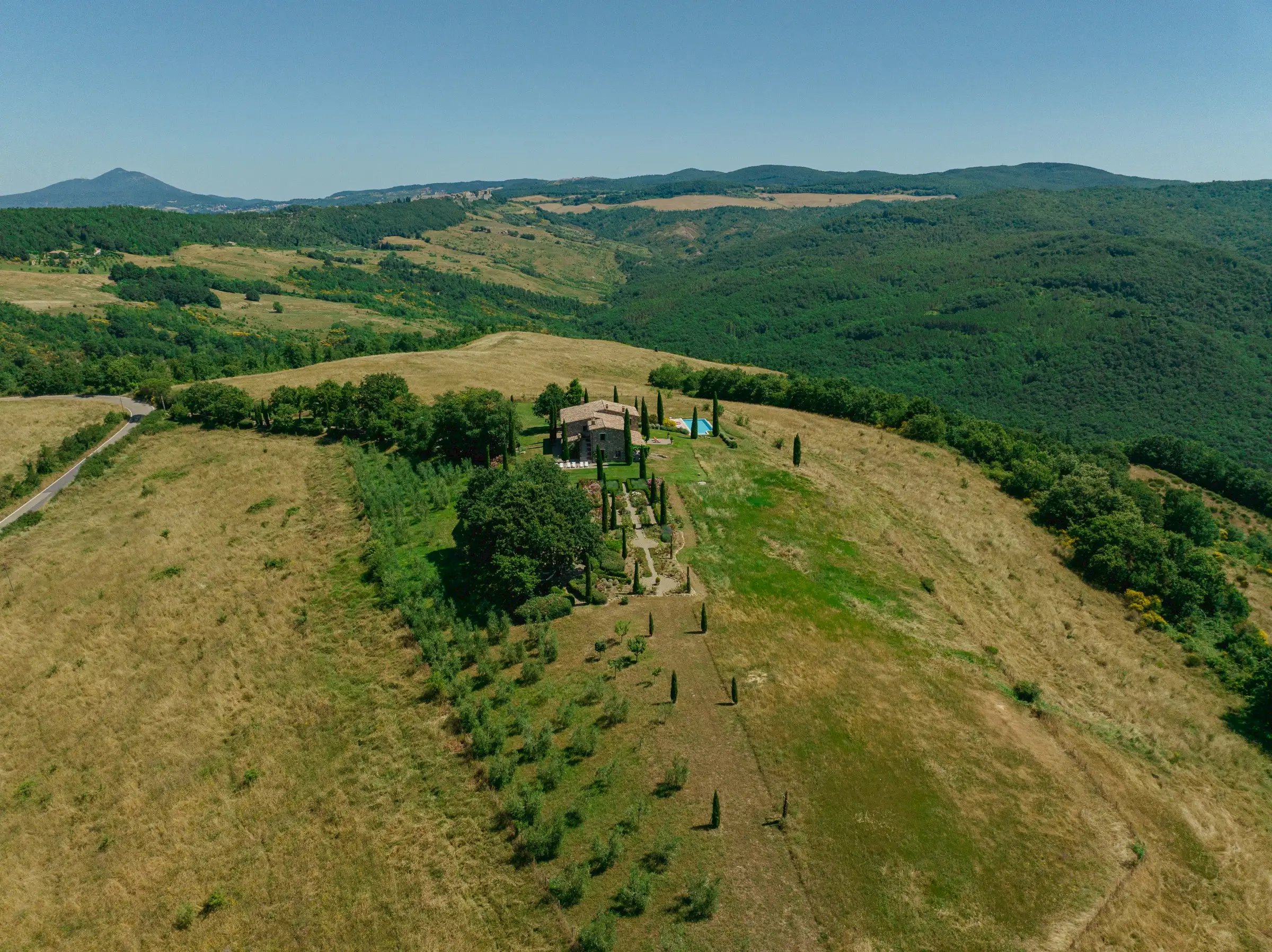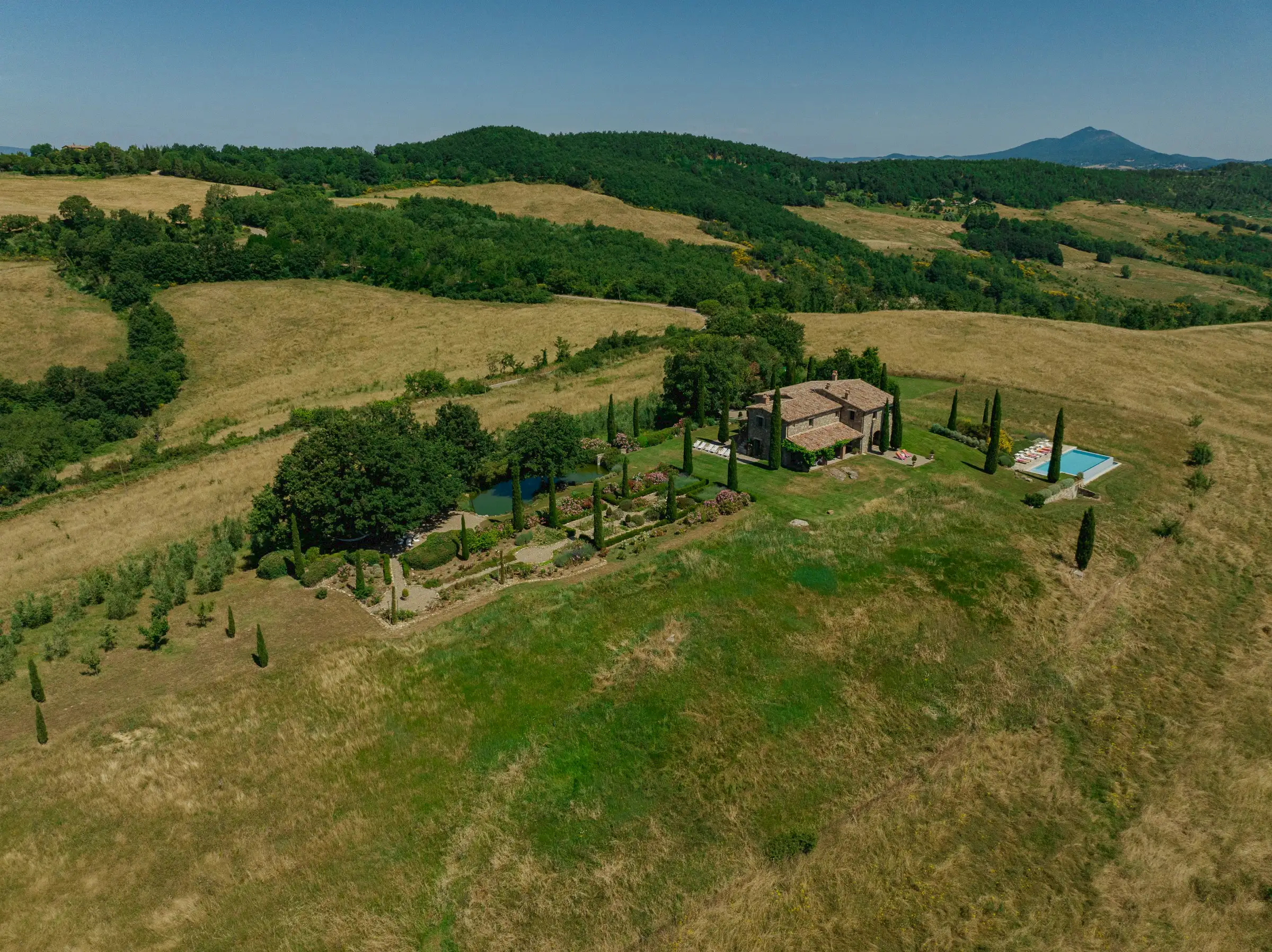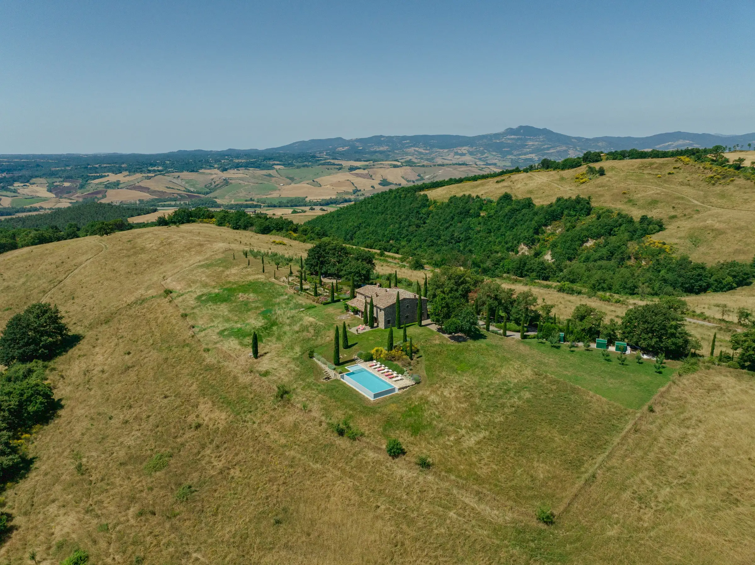 Situated on top of a hill with expansive views, this vacation home is surrounded by the unspoiled beauty of the rural Tuscan landscape with its magnificent oak woods, beautiful mountains, peaceful pastures, classic olive orchards and vineyards and delightful medieval towns.