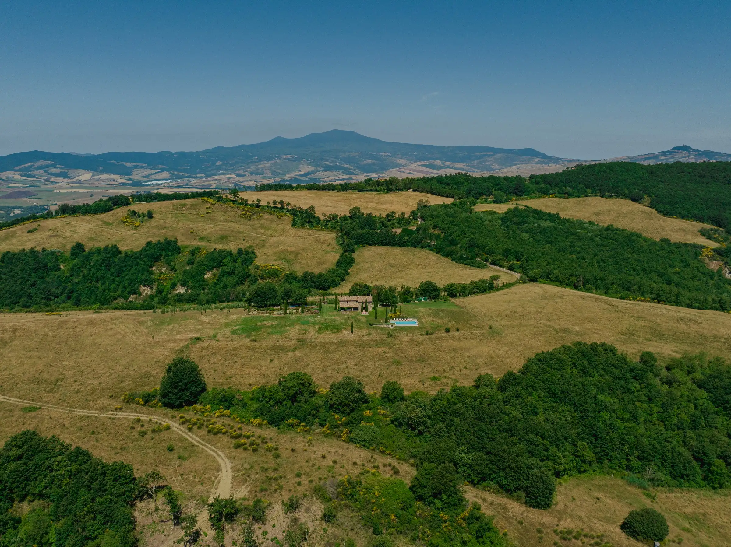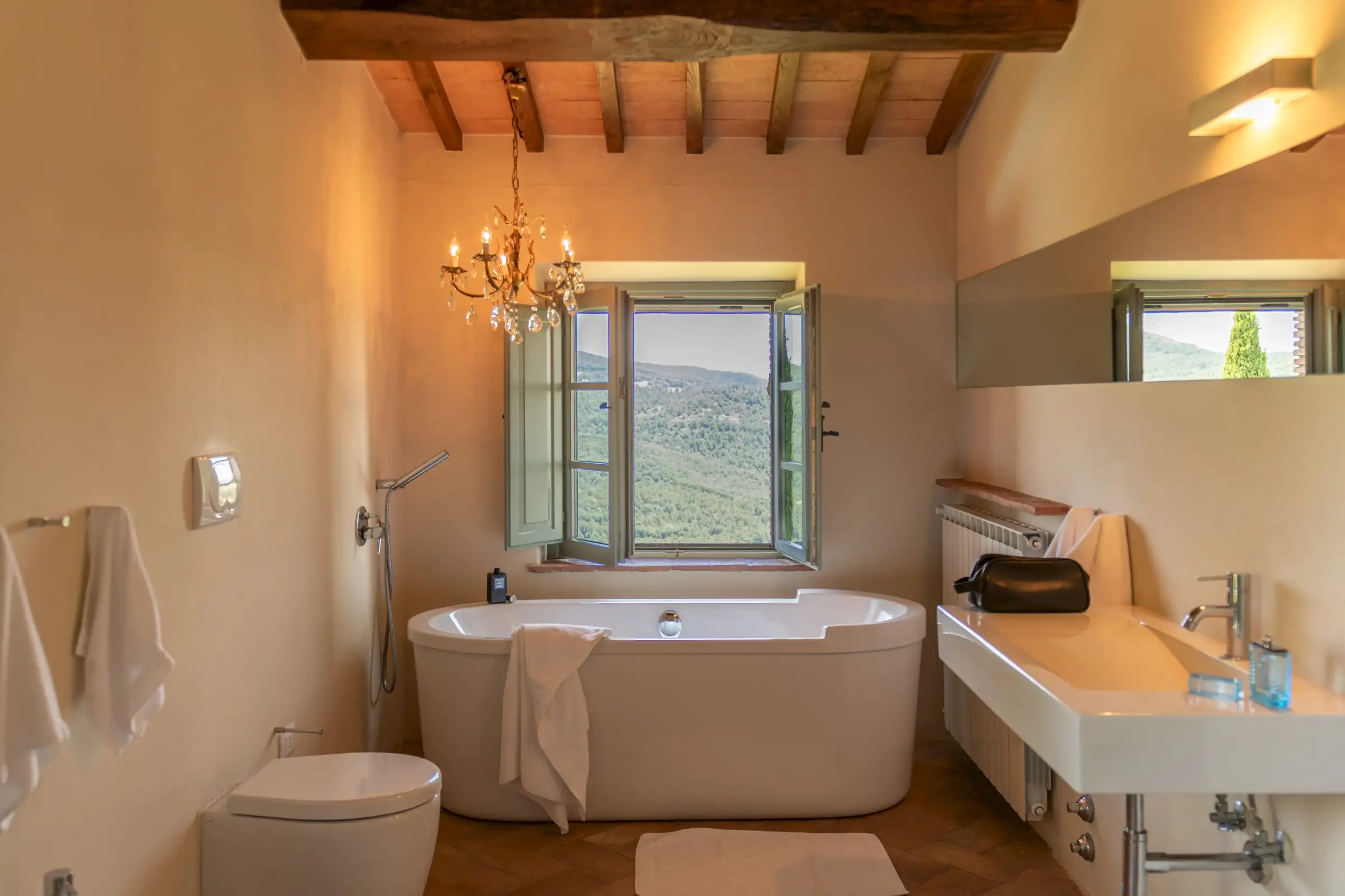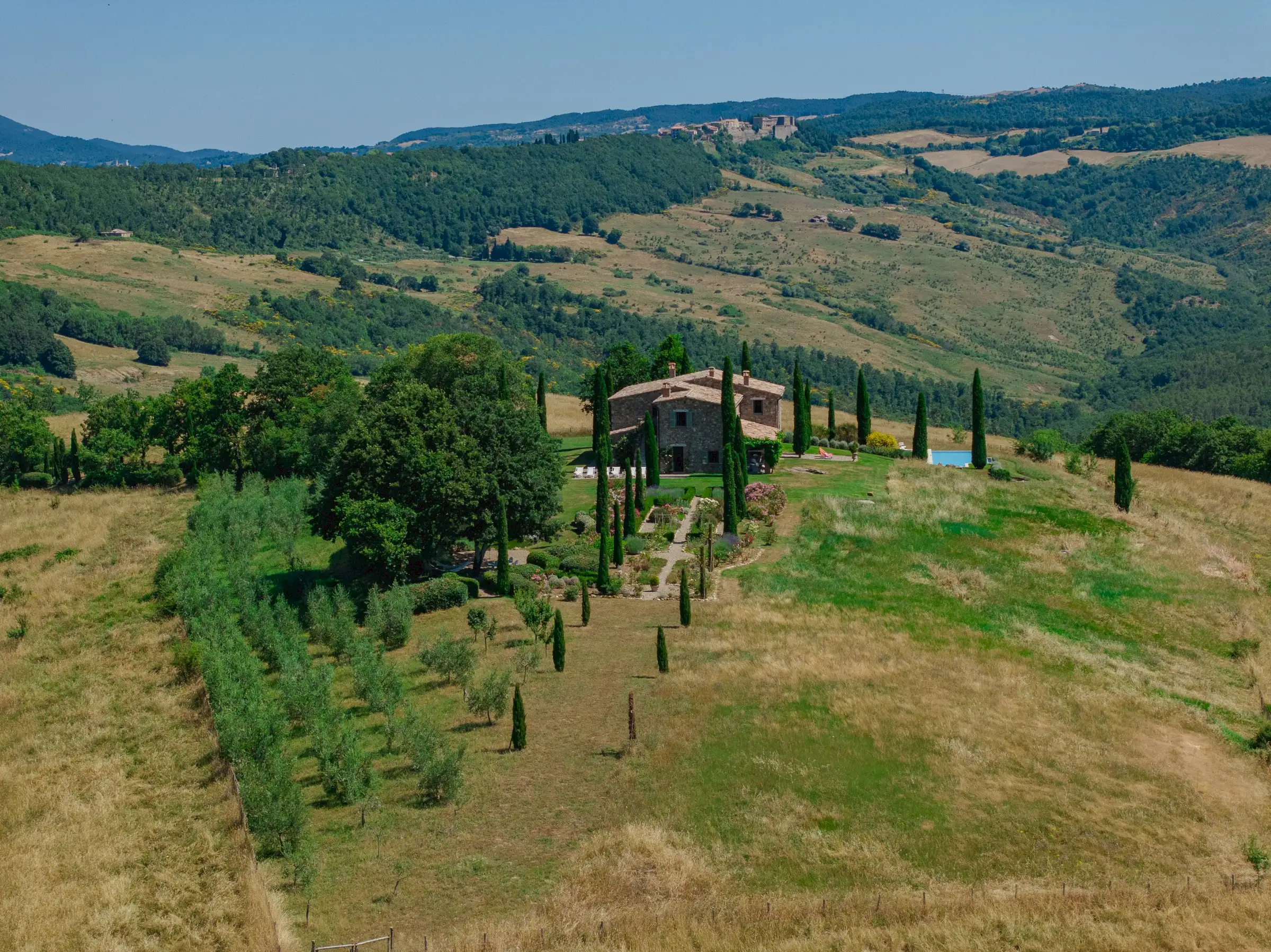 Situated on top of a hill with expansive views, this vacation home is surrounded by the unspoiled beauty of the rural Tuscan landscape with its magnificent oak woods, beautiful mountains, peaceful pastures, classic olive orchards and vineyards and delightful medieval towns.