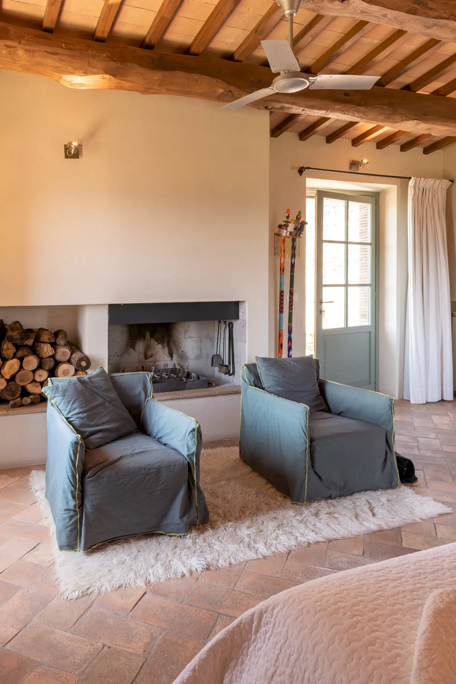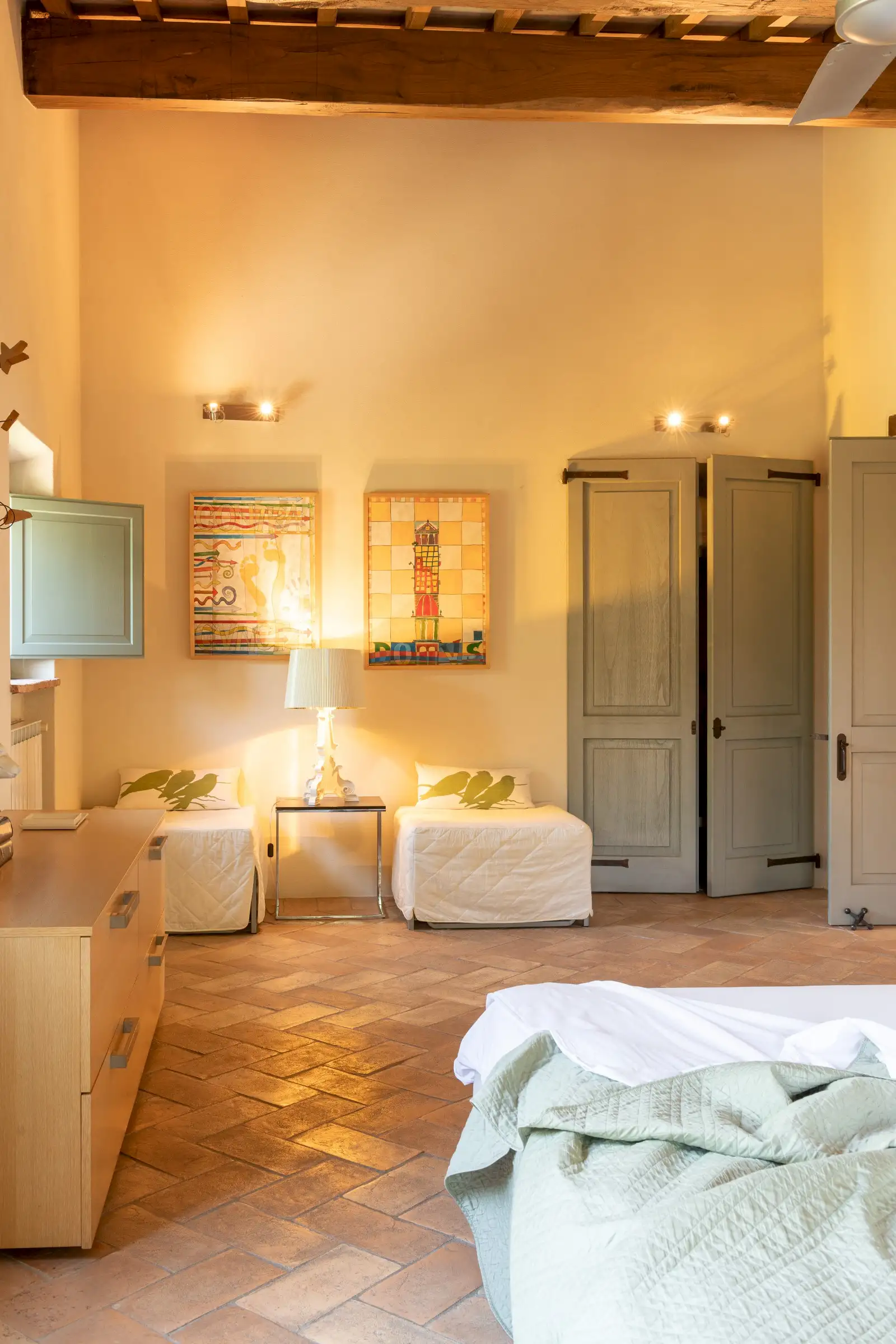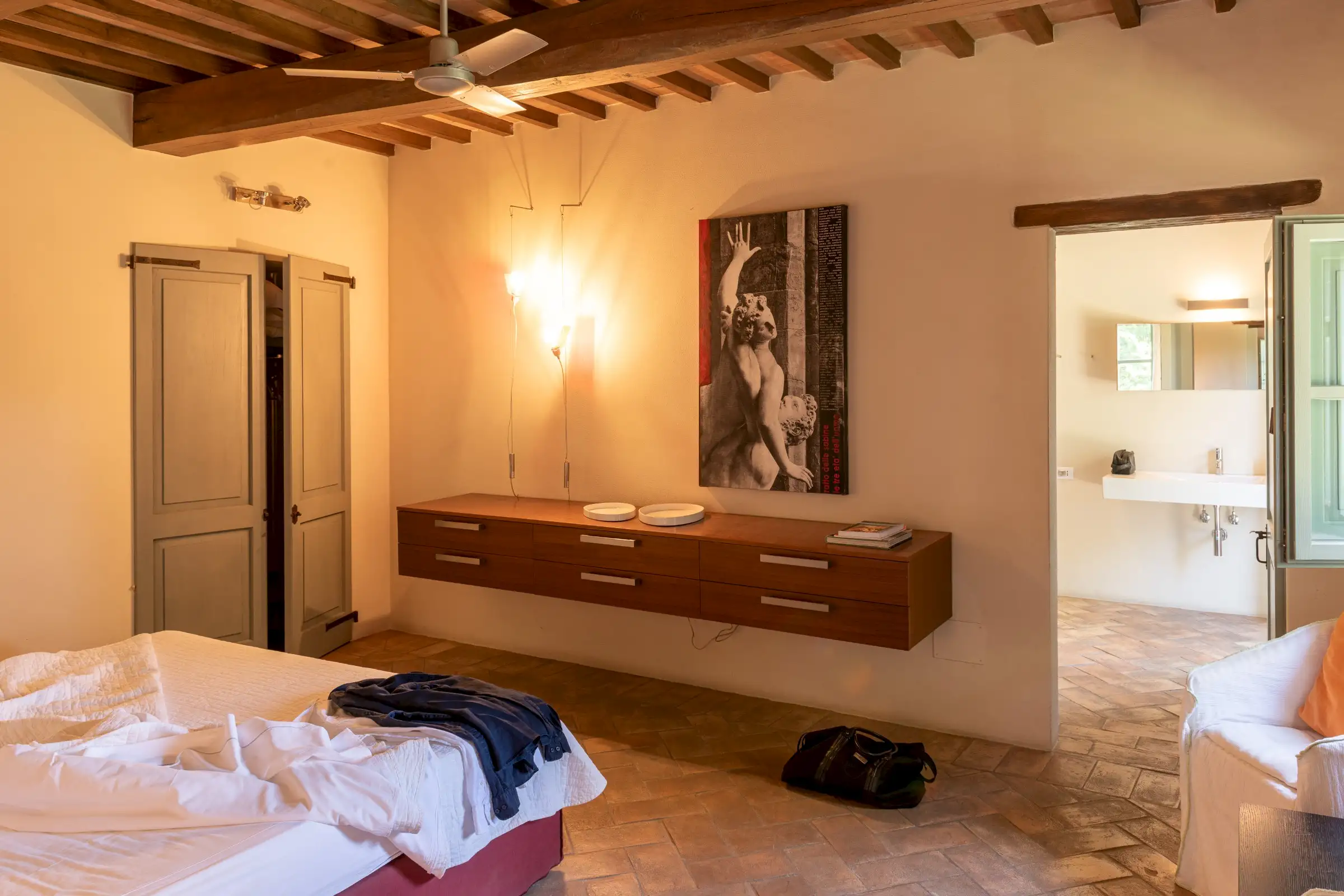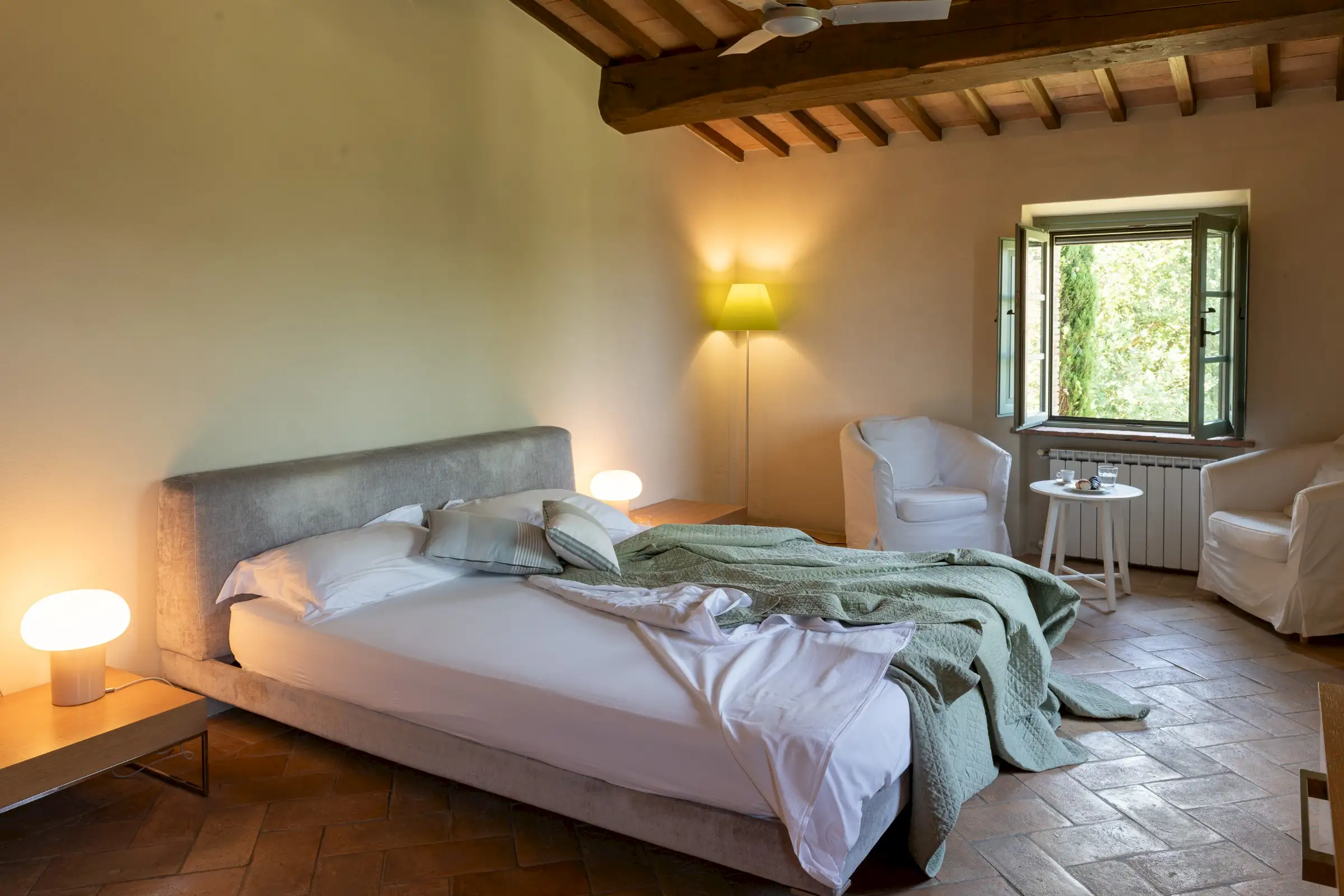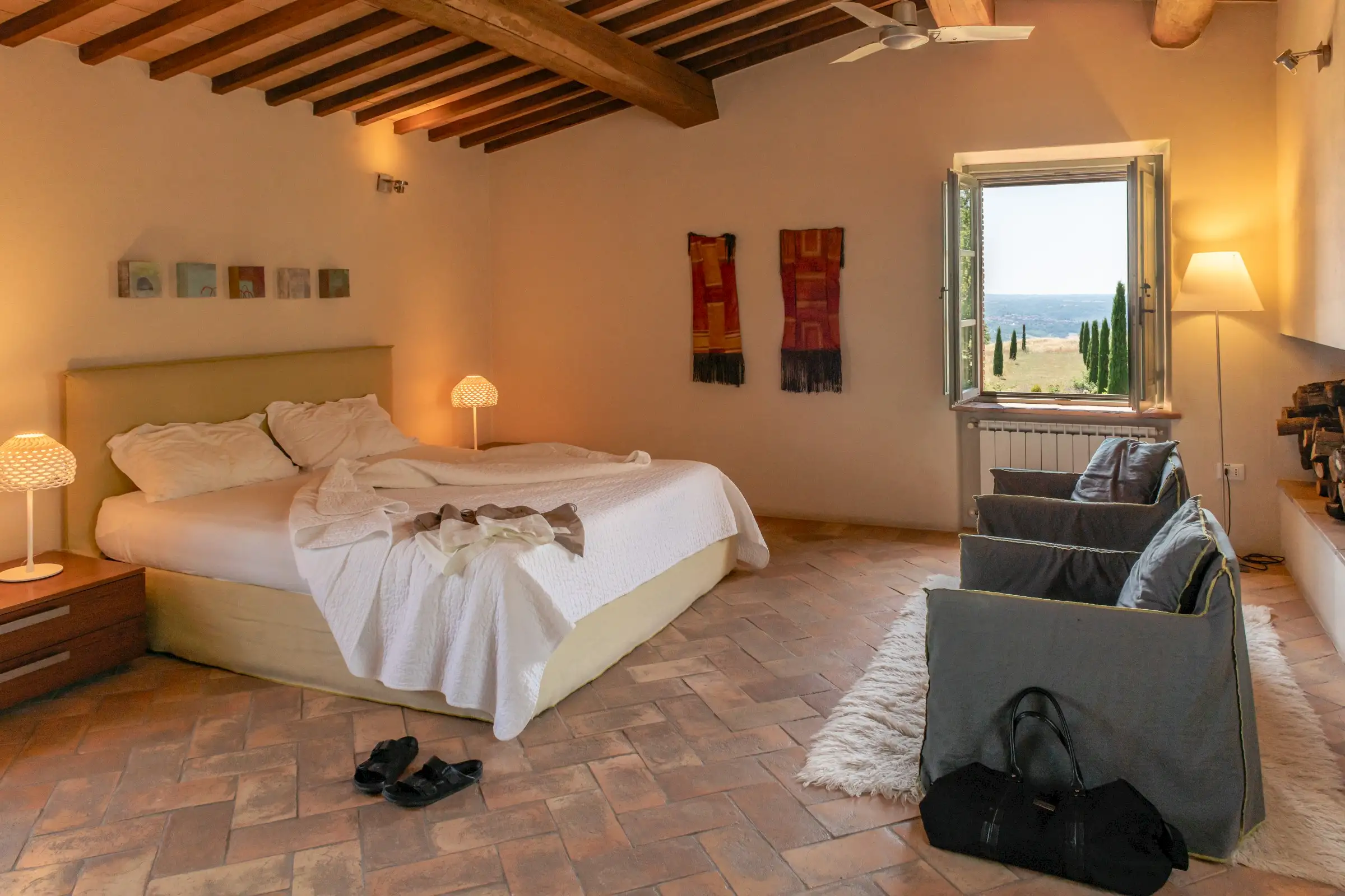 4 rooms with king size beds, 1 with a twin bed, 2 extra spear beds   All bedrooms have ceiling fans, built-in closets, and plenty of drawer space.  On the ground floor is the bedroom Amiata with a king size bed and a large en suite bathroom with wheelchair accessible shower. With windows facing pastures, ravines, and hills to the west, this bedroom is especially convenient for anyone who may have difficulty climbing stairs.  There are four bedrooms on the first floor. Bedroom Rufeno has a king size bed and luxurious private bath with a shower and a freestanding bathtub. It has exceptional views of Trevinano and the regional park across the valley.  Bedroom Proceno has a king size bed, a fireplace with sitting area, a private outdoor terrace and entrance. The bathroom has a spacious shower and two sinks. In addition to views of Monte Rufeno, it offers a spectacular panorama of the valley of the Paglia River, Acquapendente, Proceno, and in the distance the profile of the caldera of Lake Bolsena.  Bedroom Trevinano has a king size bed with sitting area and features unspoiled views of Trevinano looking up the valley as well as pastures, hills, and ravines below. Since the room is exceptionally large, an extra single bed can easily be added to accommodate an additional person. Adjacent is a large full bathroom with separate shower, bathtub, and two sinks which is shared with Bedroom Cetona.  Bedroom Cetona is a cozy room equipped with two twin beds. It has windows facing south and west and shares a bathroom with Bedroom Trevinano.